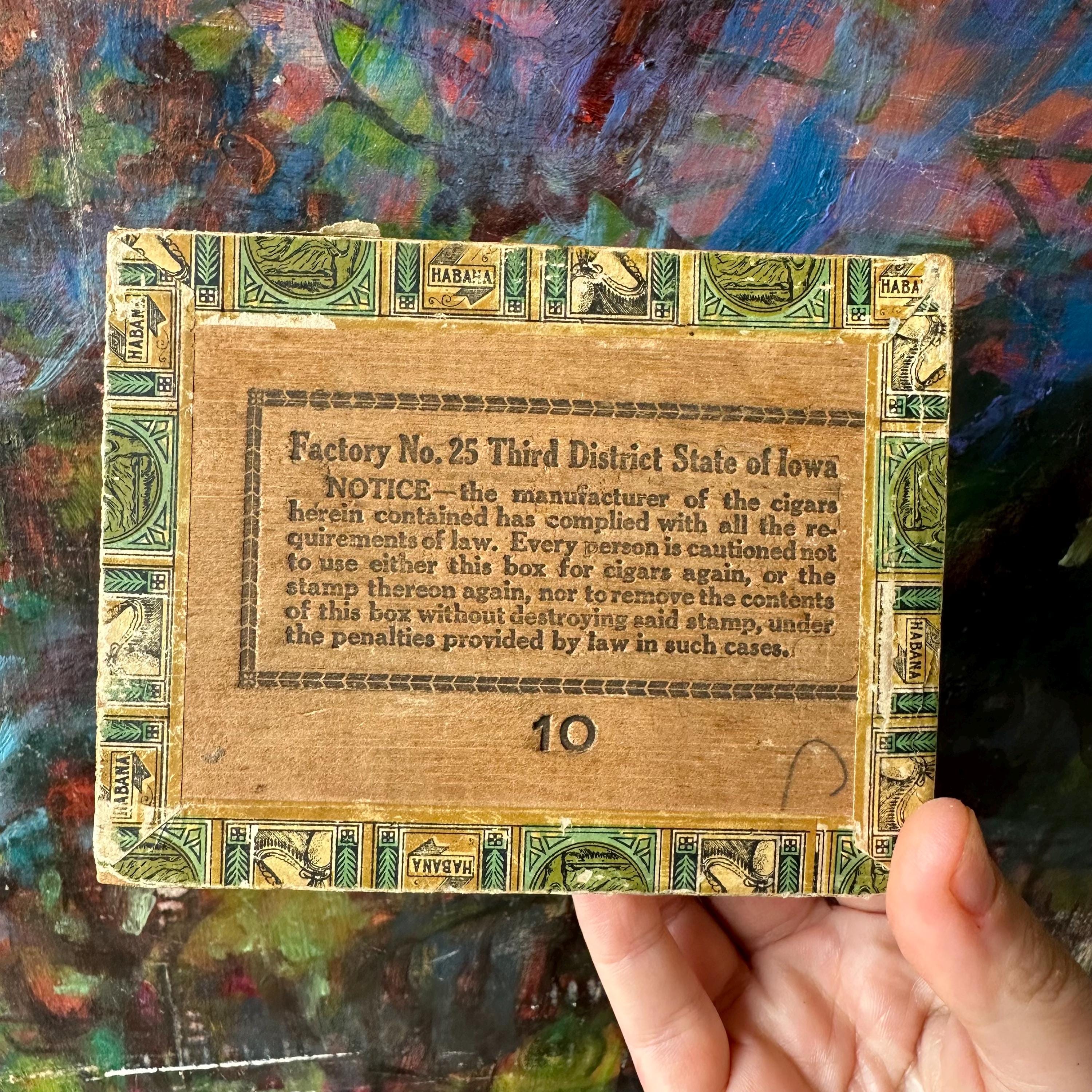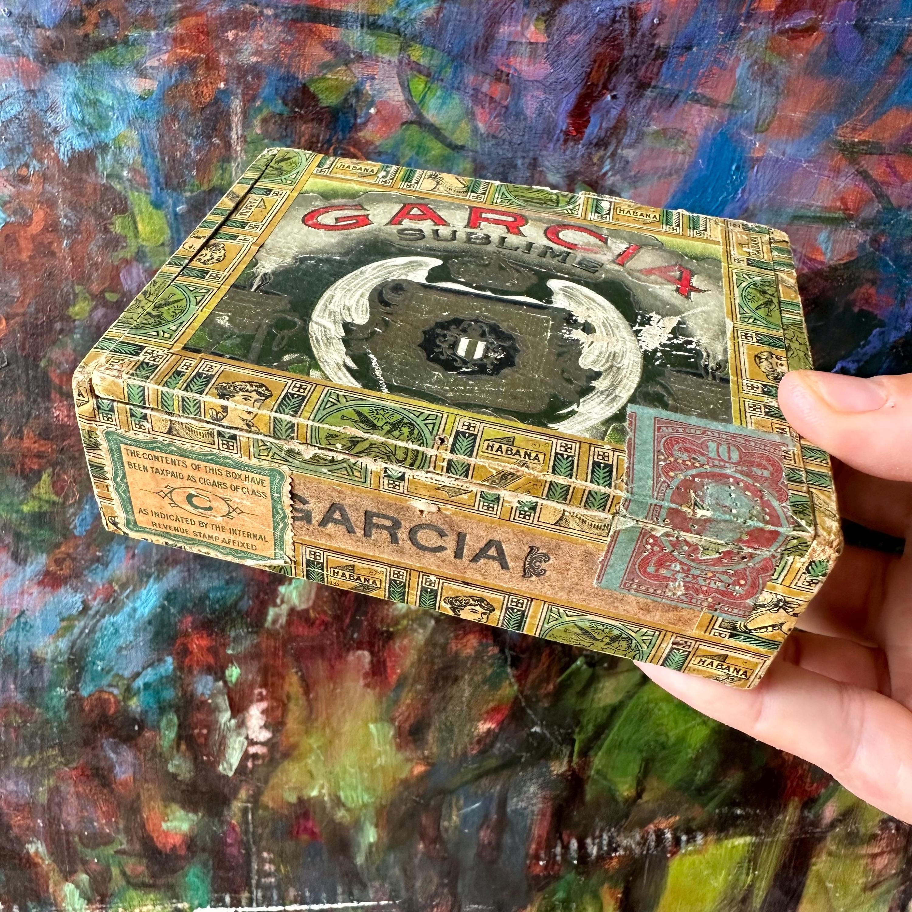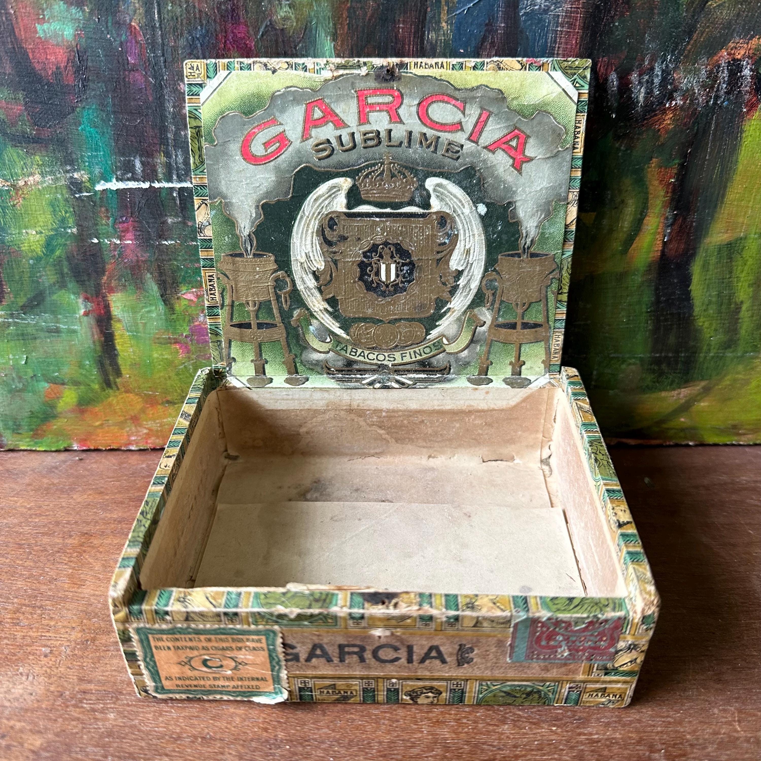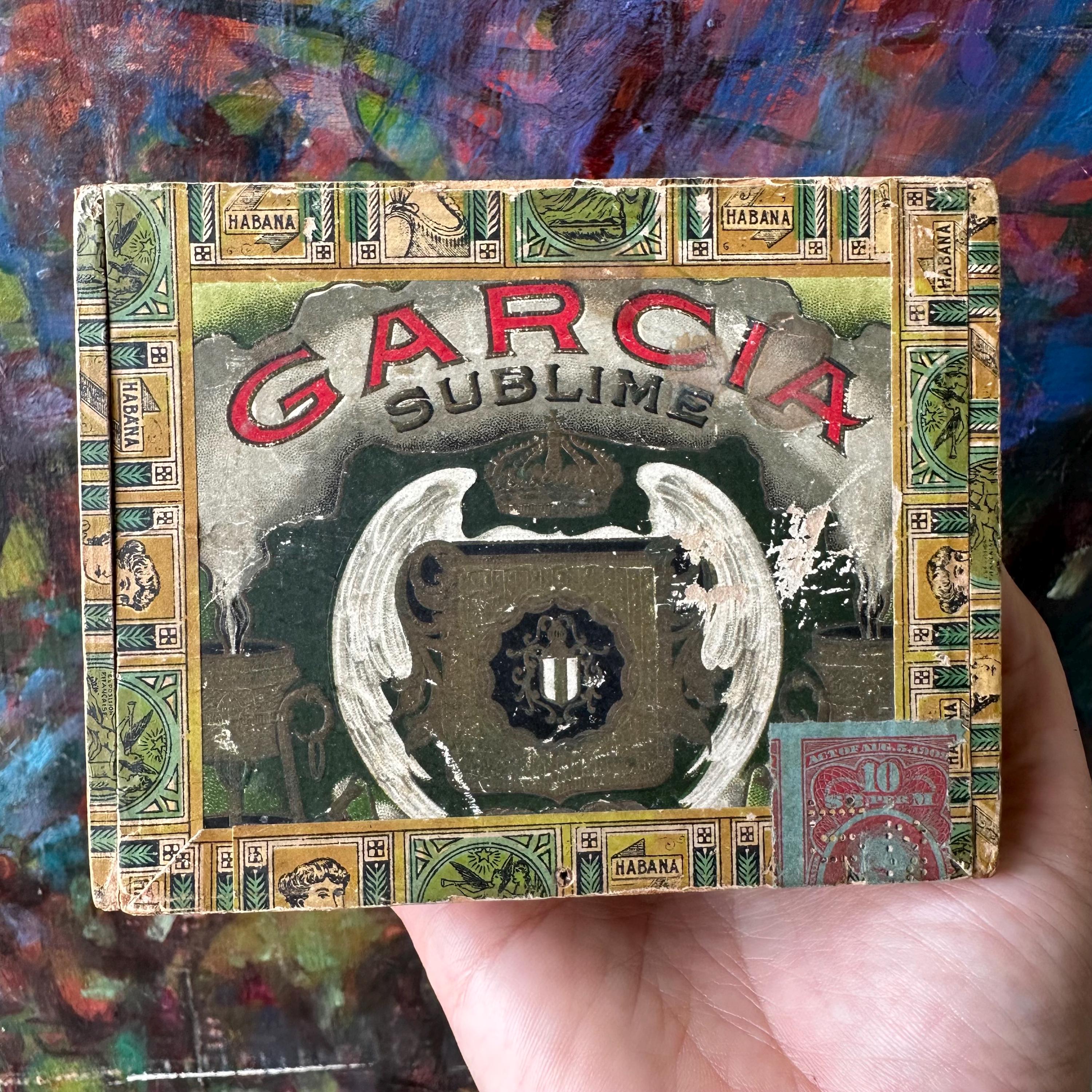 This is a vintage, possibly antique, wood cigar box for Garcia Sublime Claro with the most wonderful graphics and typology. It is made of wood with colorful labels on the top, remnants of tax and government stamps and stickers, and a full color decorated inner lid. These cigars were made at Factory 25 in the Third District State of Iowa. They were produced by the McKee and Marks Cigar Co between 1918 and 1924.