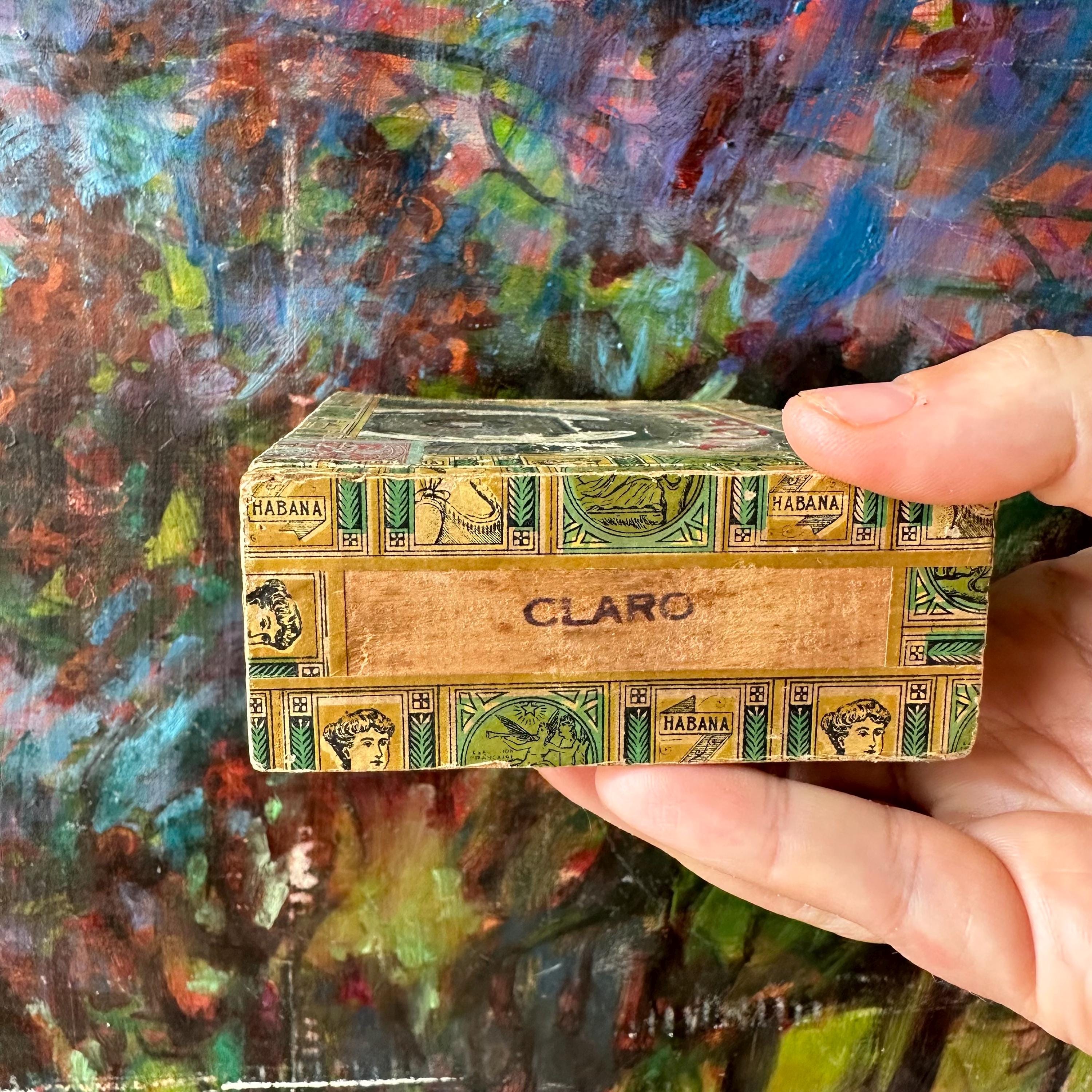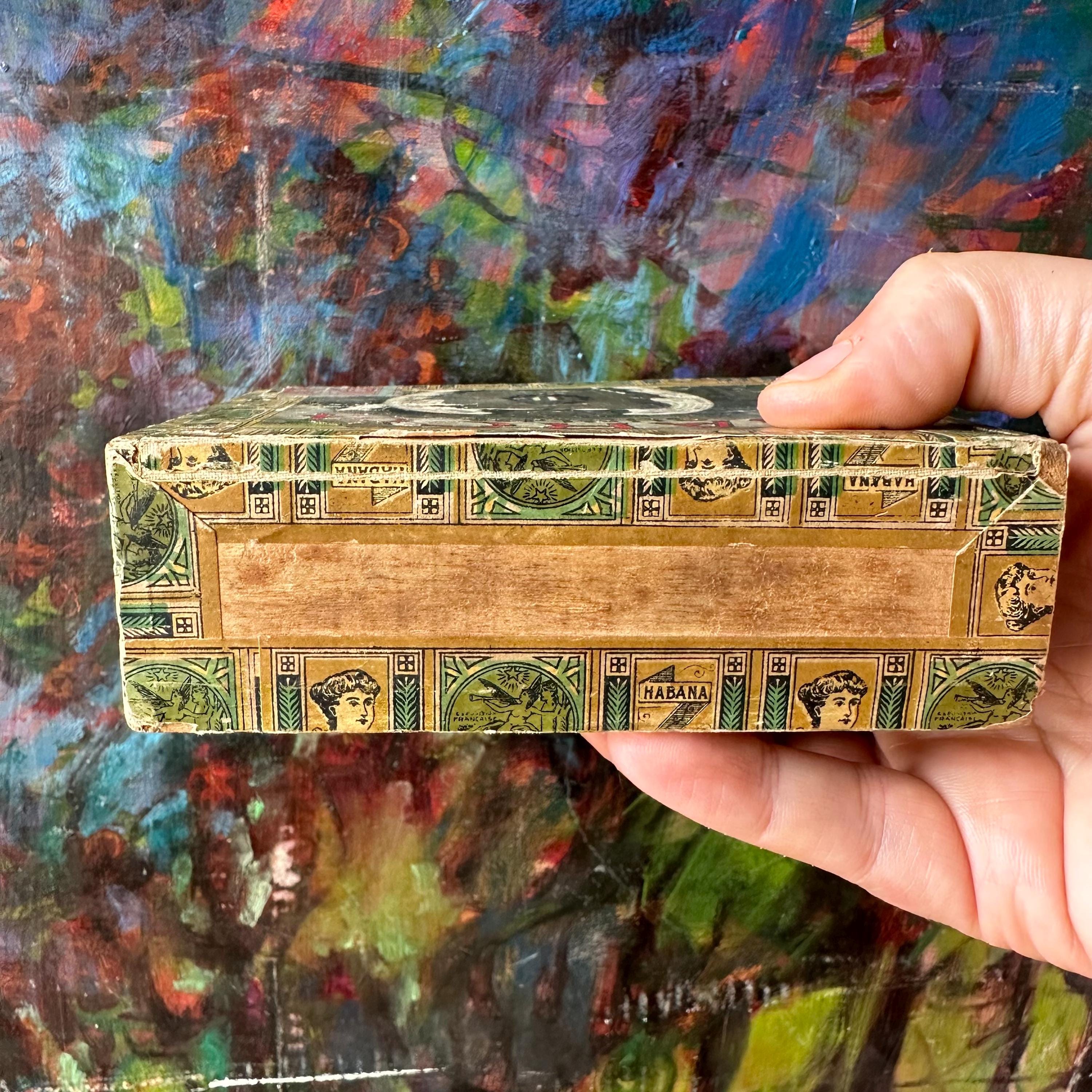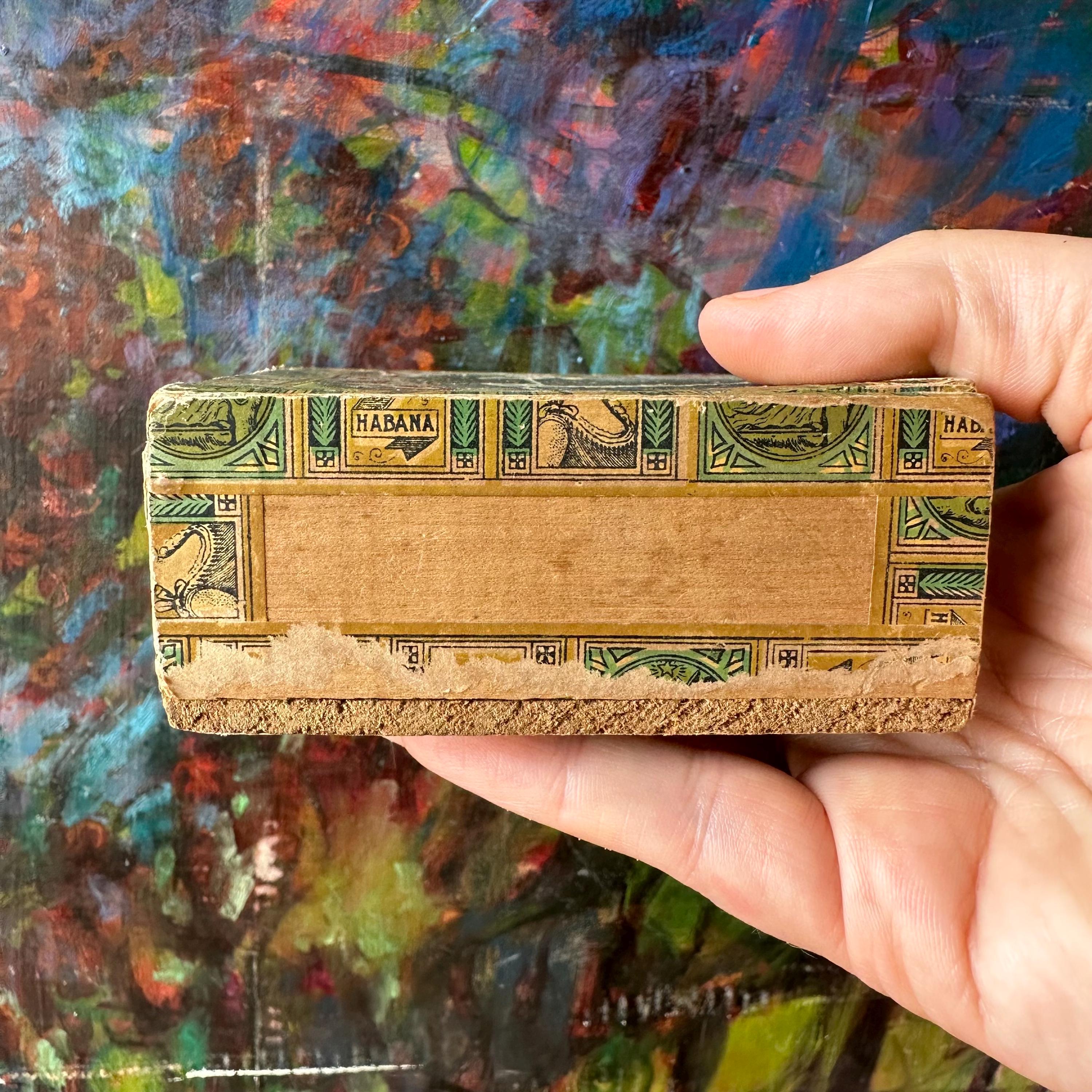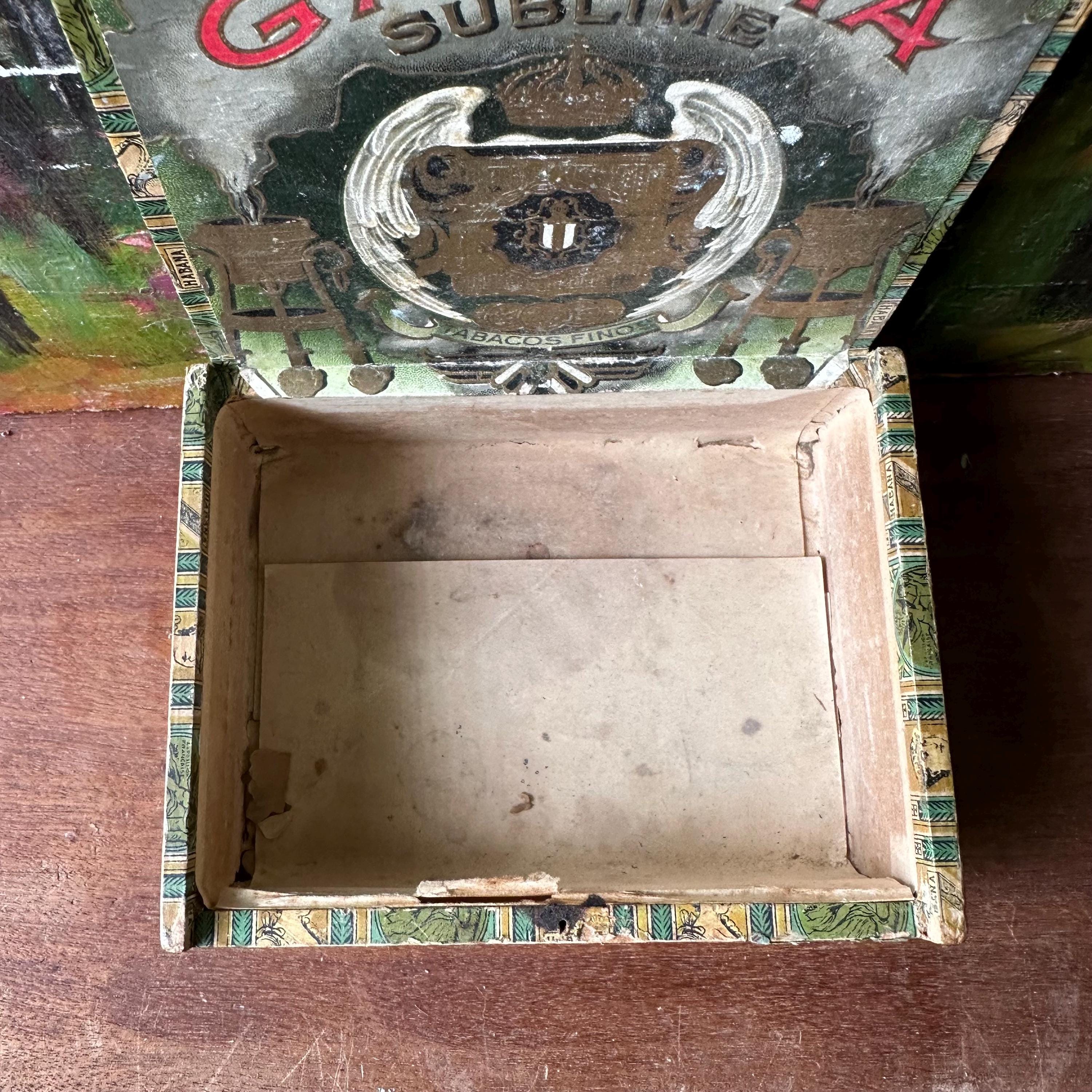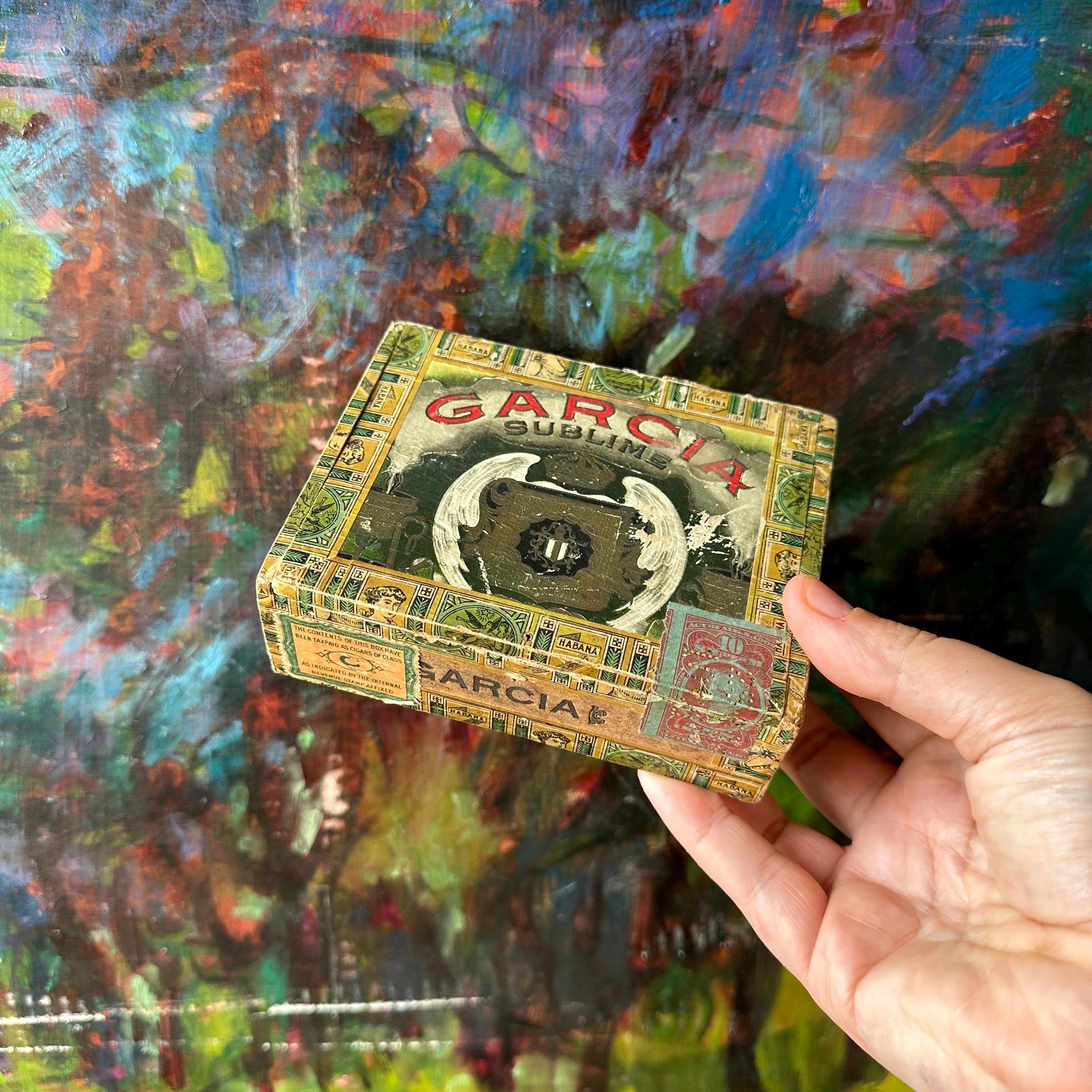 This is a vintage, possibly antique, wood cigar box for Garcia Sublime Claro with the most wonderful graphics and typology. It is made of wood with colorful labels on the top, remnants of tax and government stamps and stickers, and a full color decorated inner lid. These cigars were made at Factory 25 in the Third District State of Iowa. They were produced by the McKee and Marks Cigar Co between 1918 and 1924.