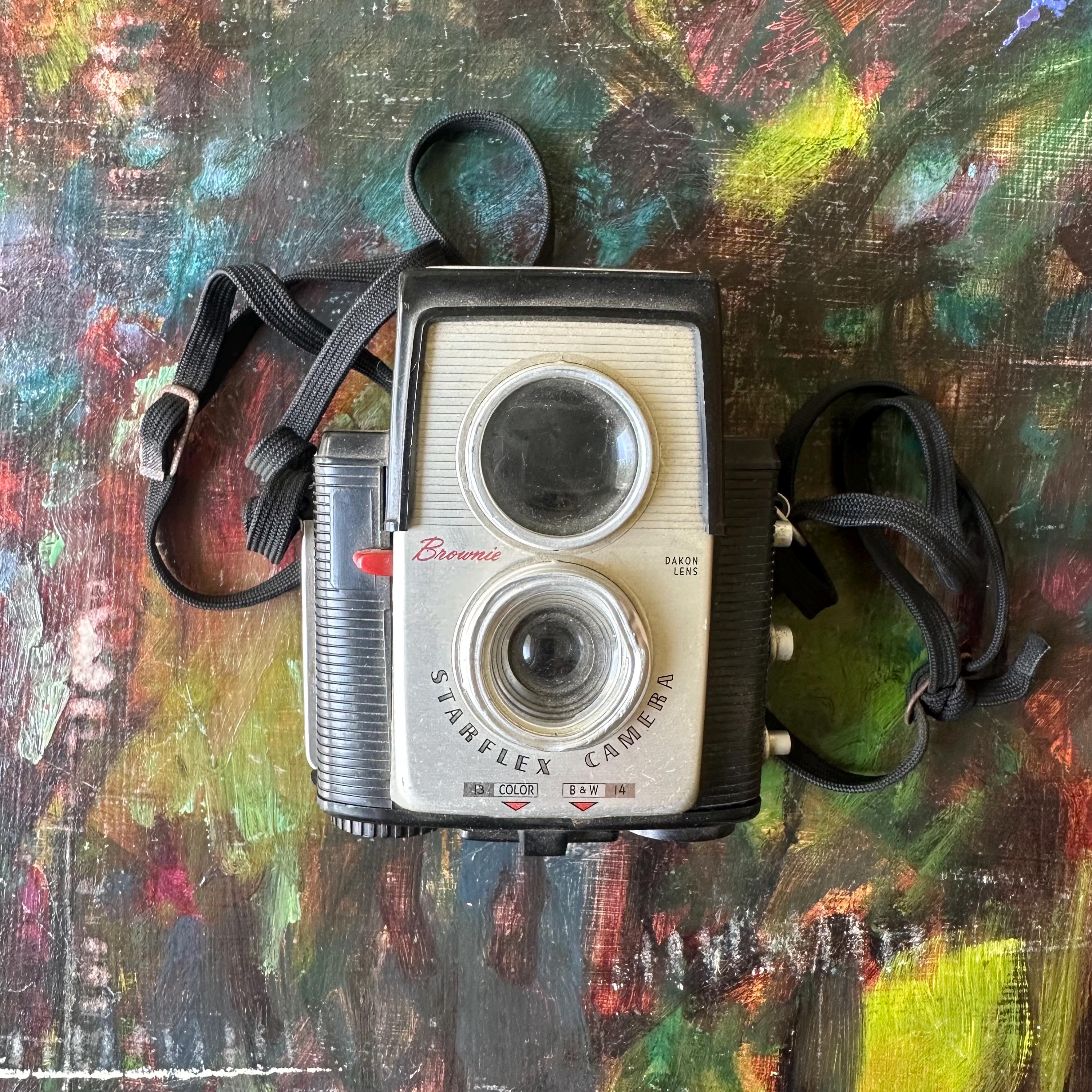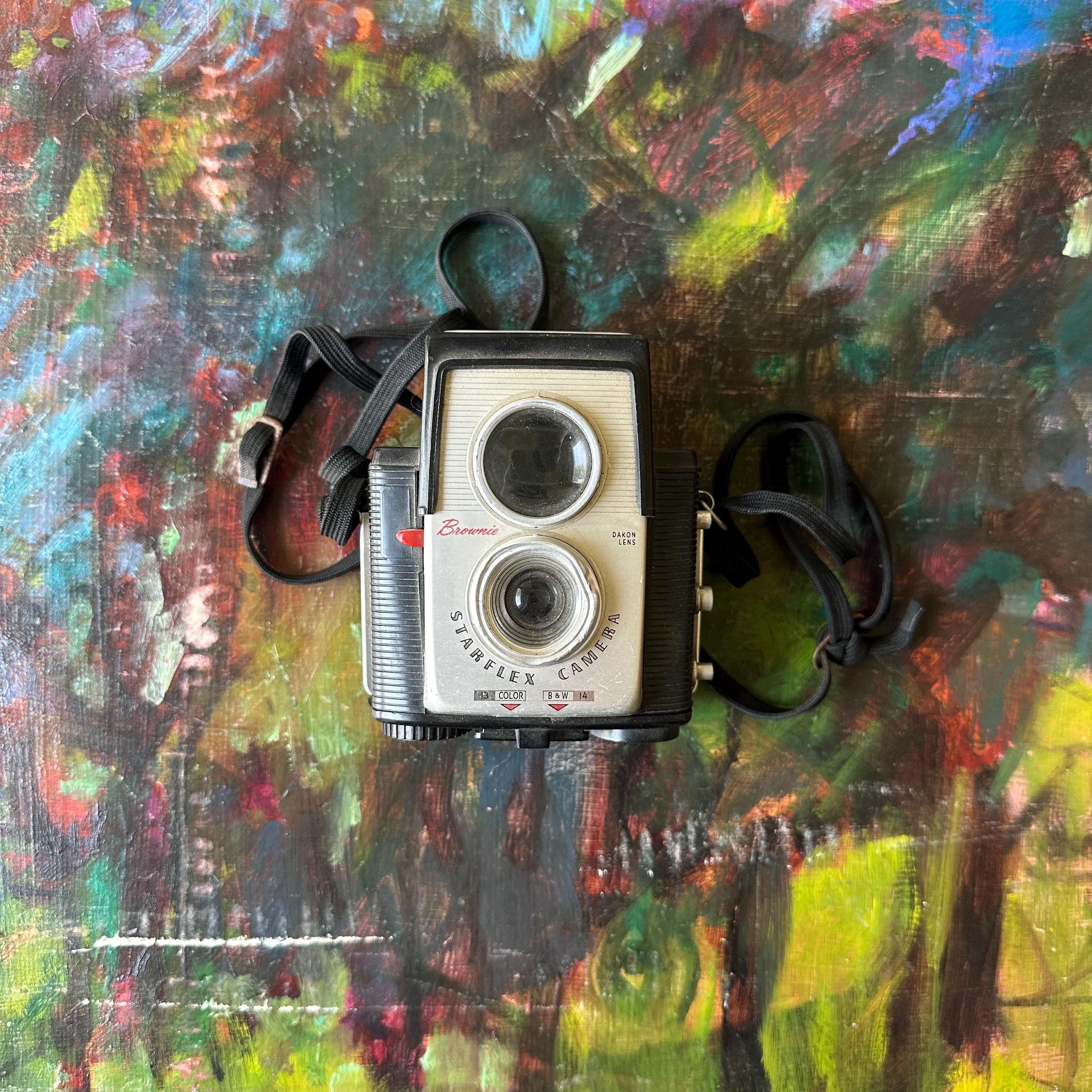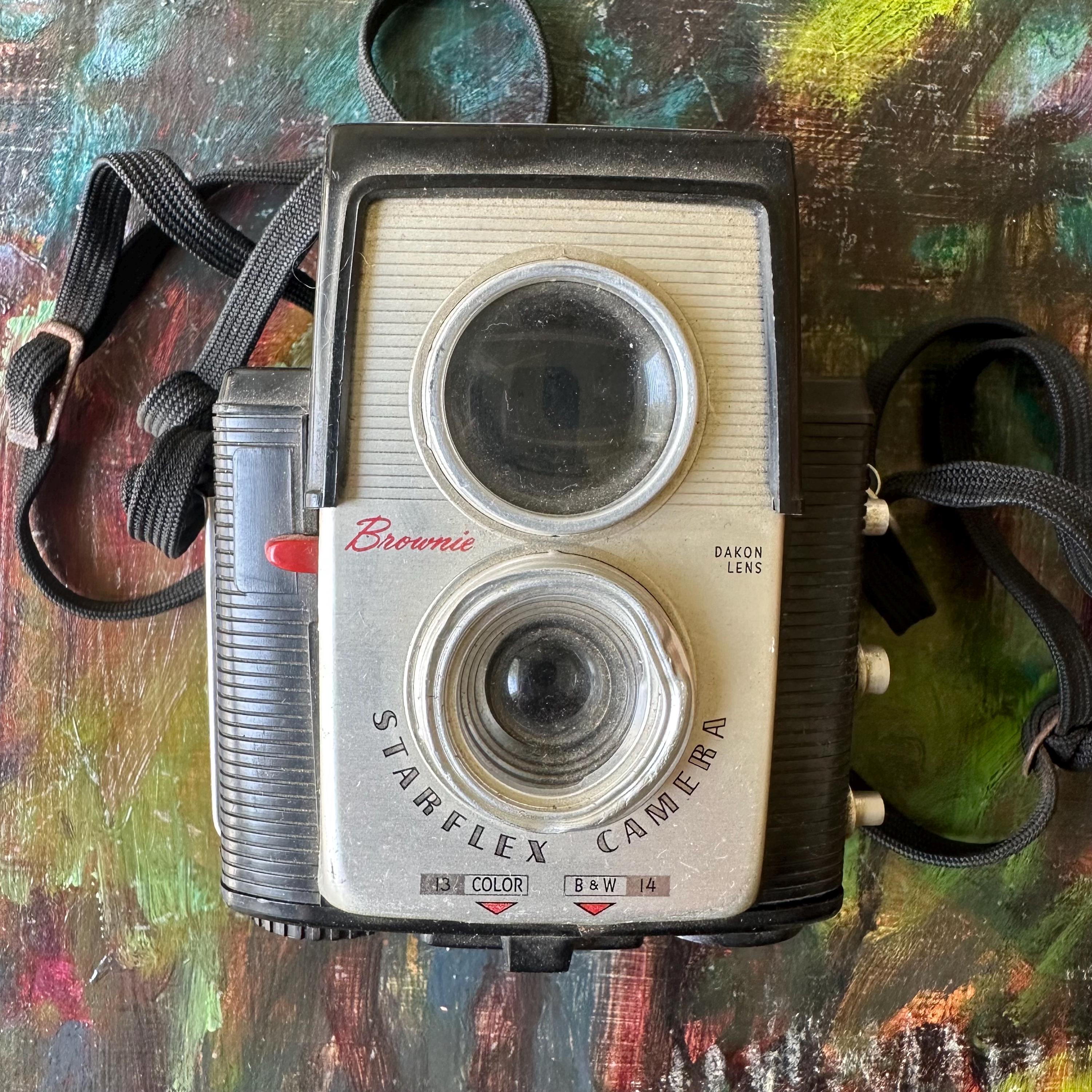 This is a vintage Kodak Brownie Starflex film camera. It has black casing with silver metal detailing and frame. The top of the camera is marked with a elongated star and flips up to reveal the viewfinder. The Starflex was made from 1957-1964. It would take 127 roll film, but this camera has not been tested and is meant as decor.