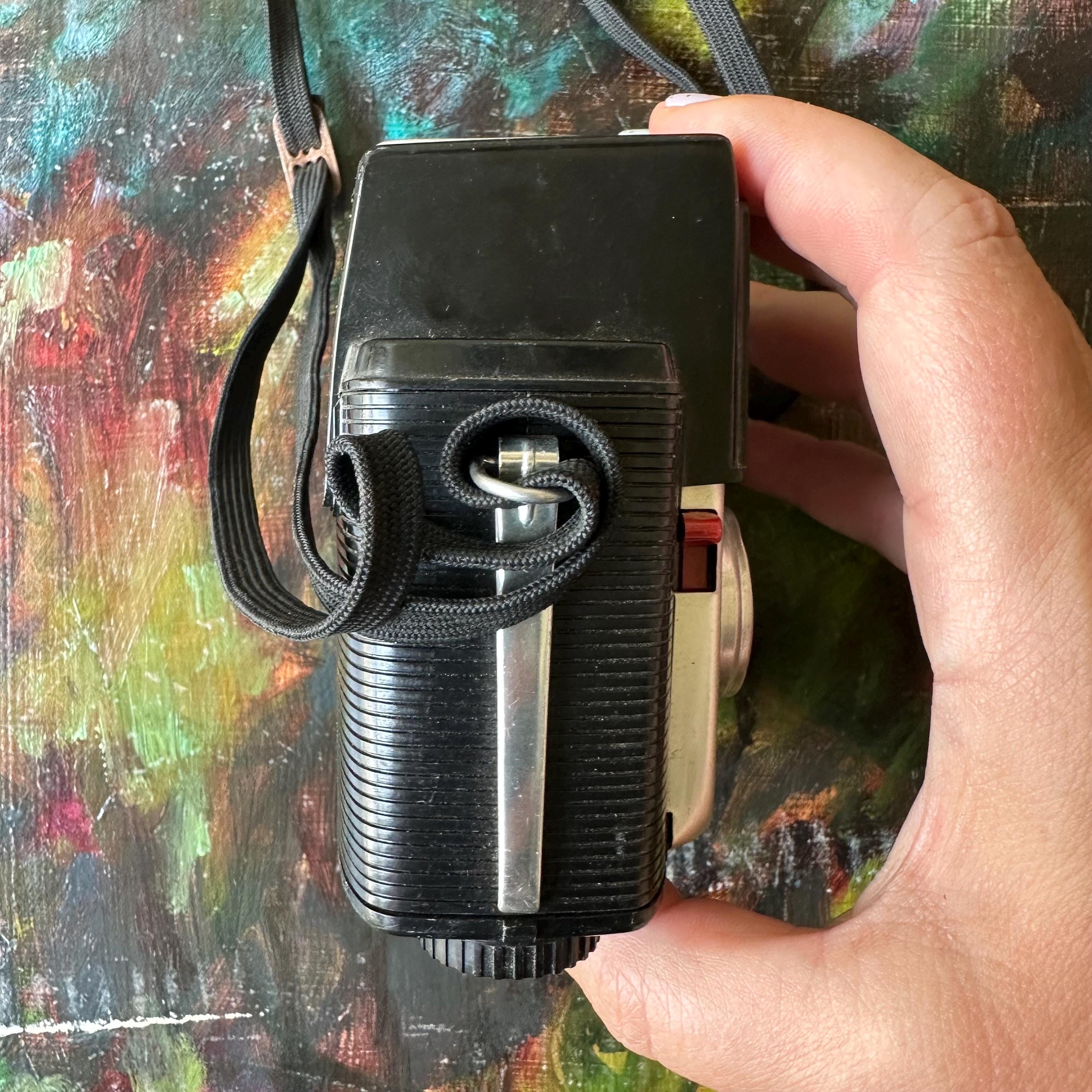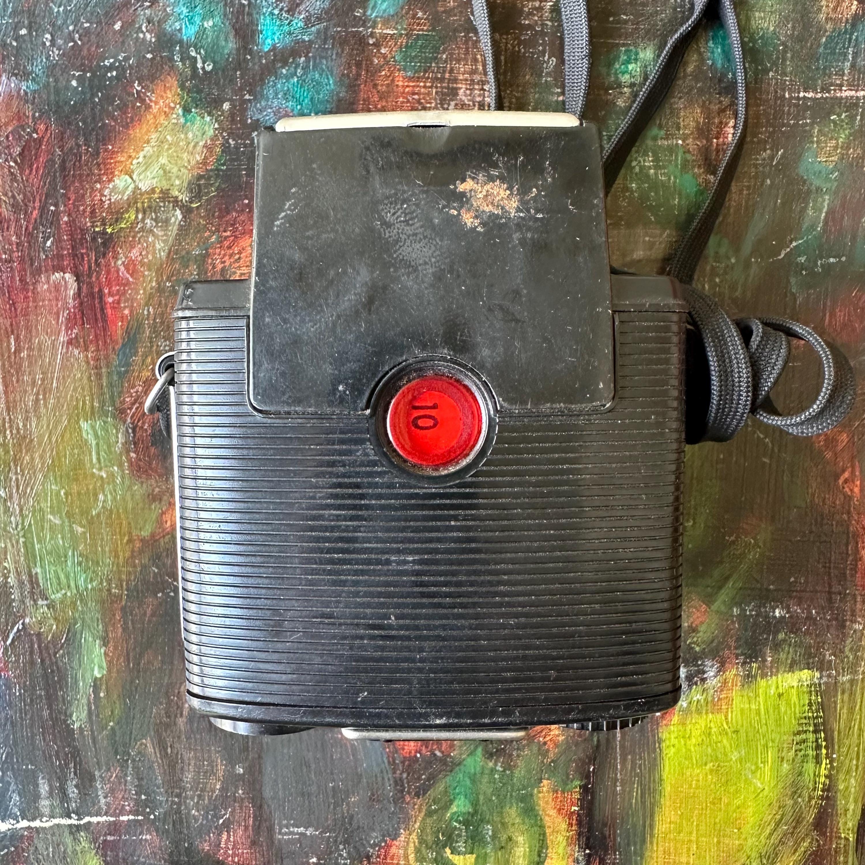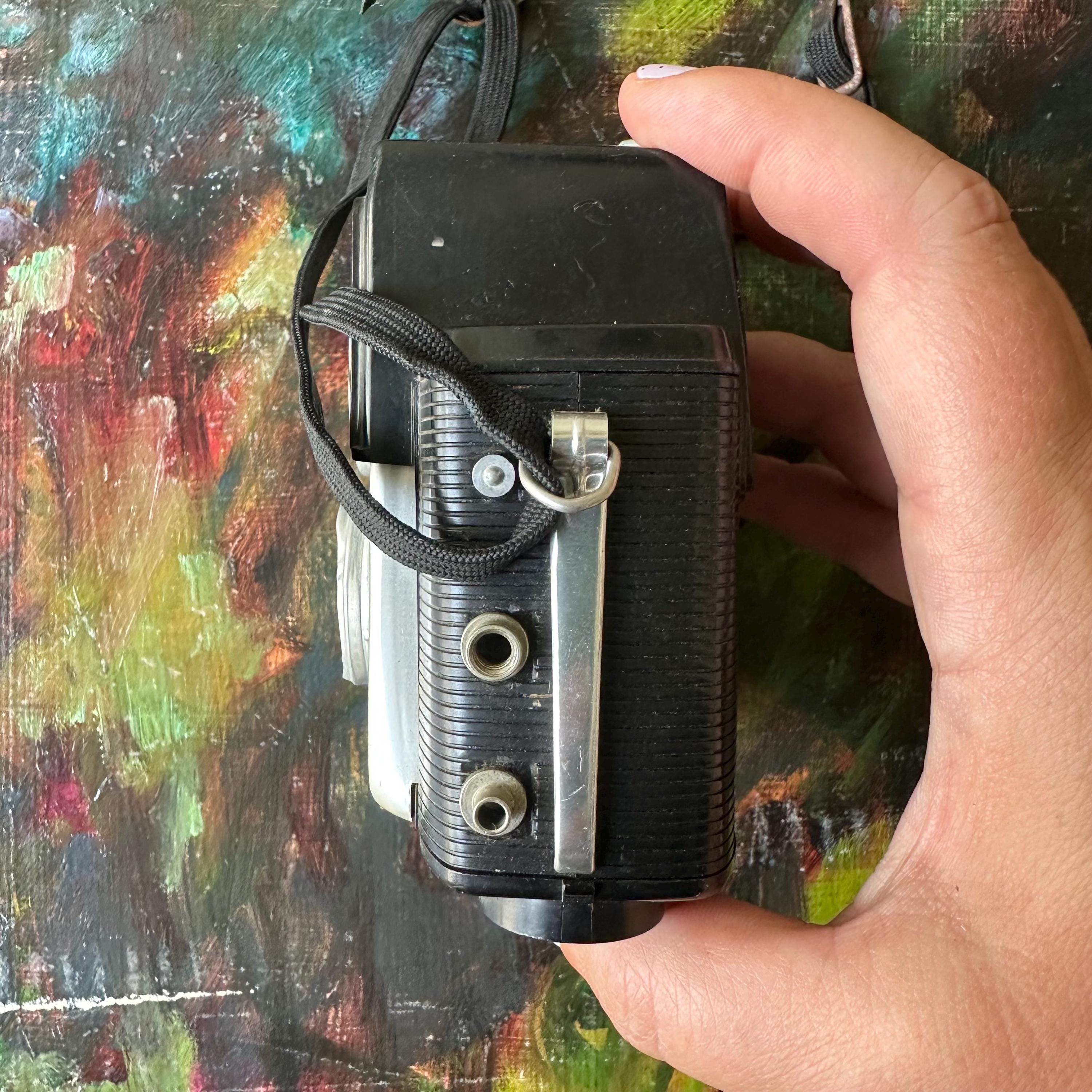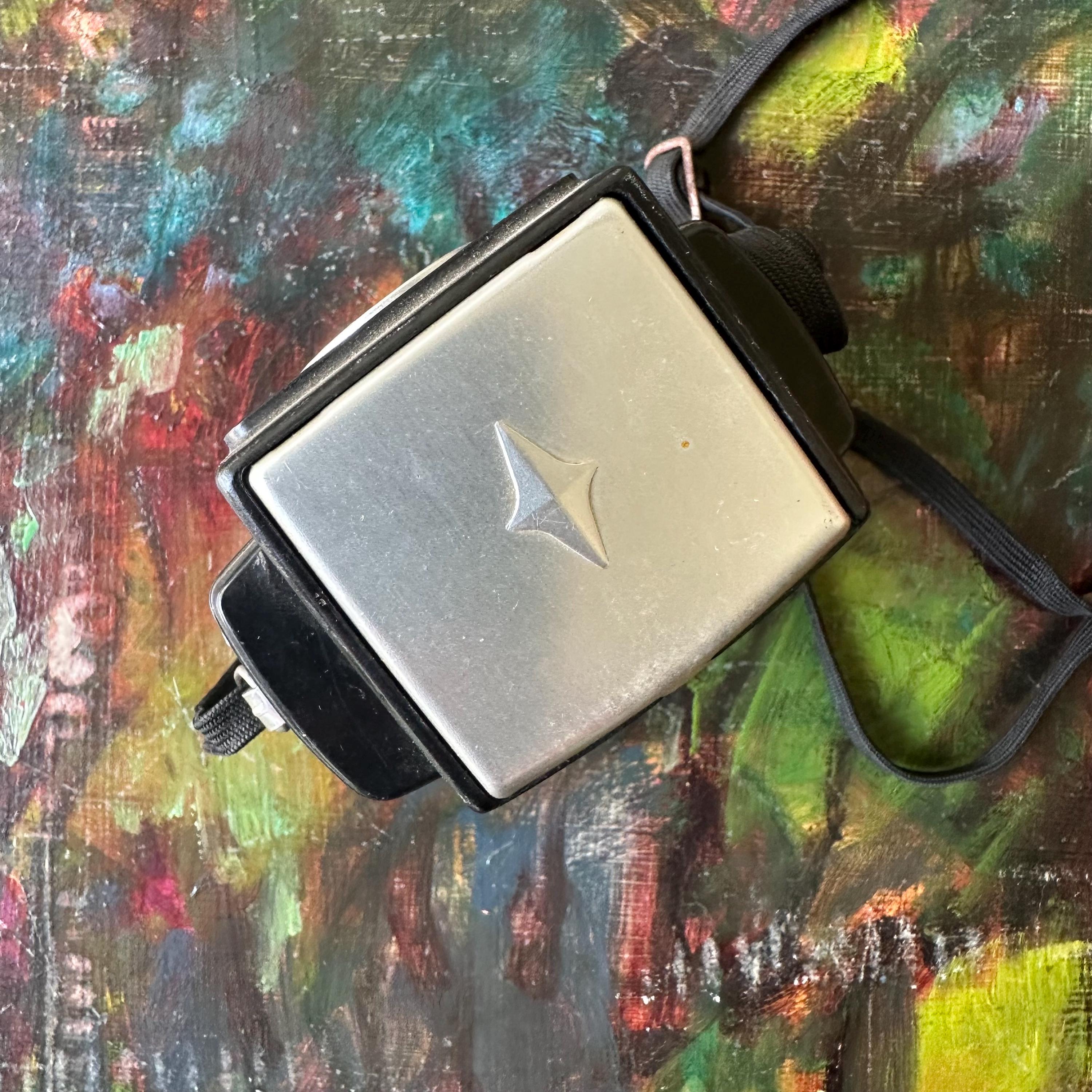 This is a vintage Kodak Brownie Starflex film camera. It has black casing with silver metal detailing and frame. The top of the camera is marked with a elongated star and flips up to reveal the viewfinder. The Starflex was made from 1957-1964. It would take 127 roll film, but this camera has not been tested and is meant as decor.