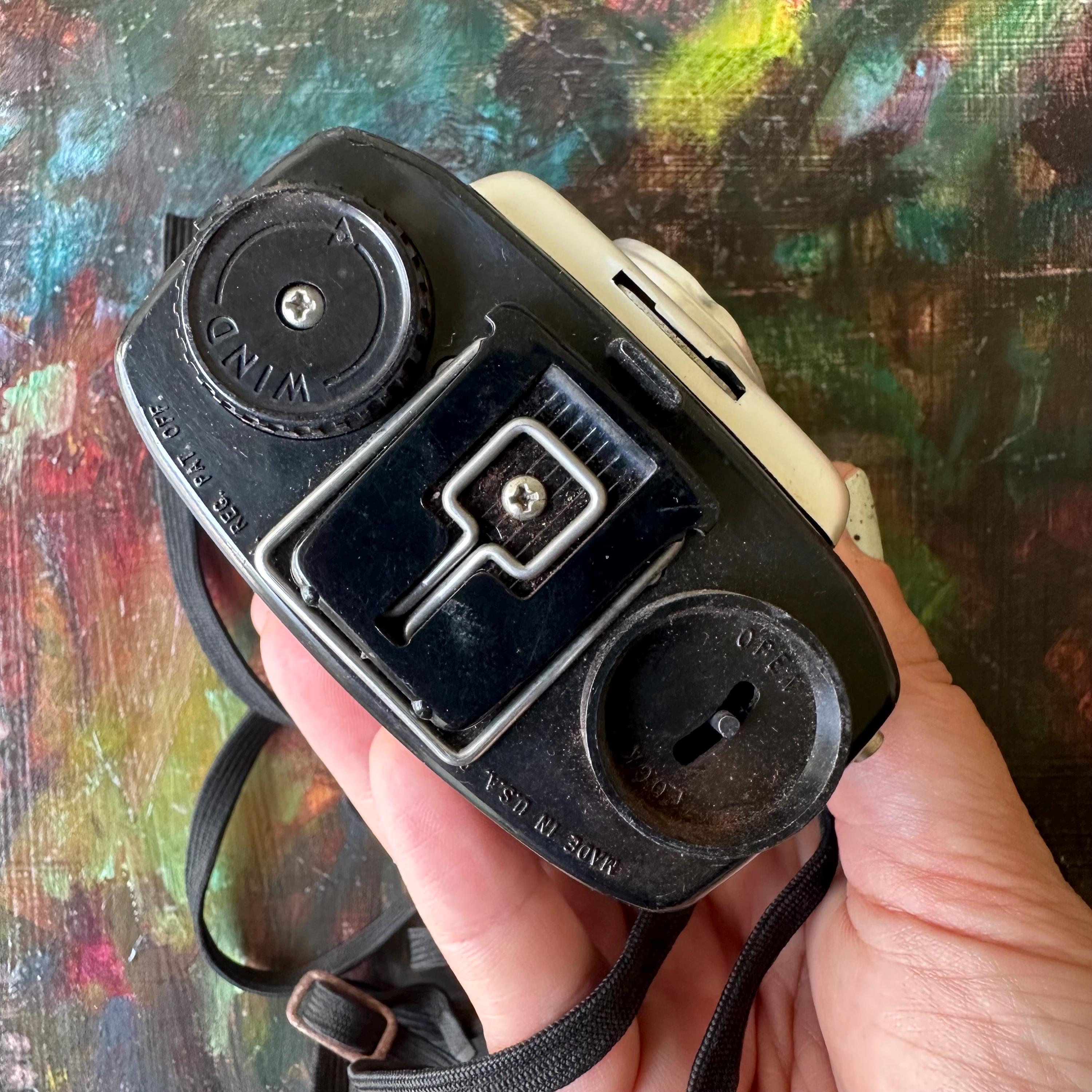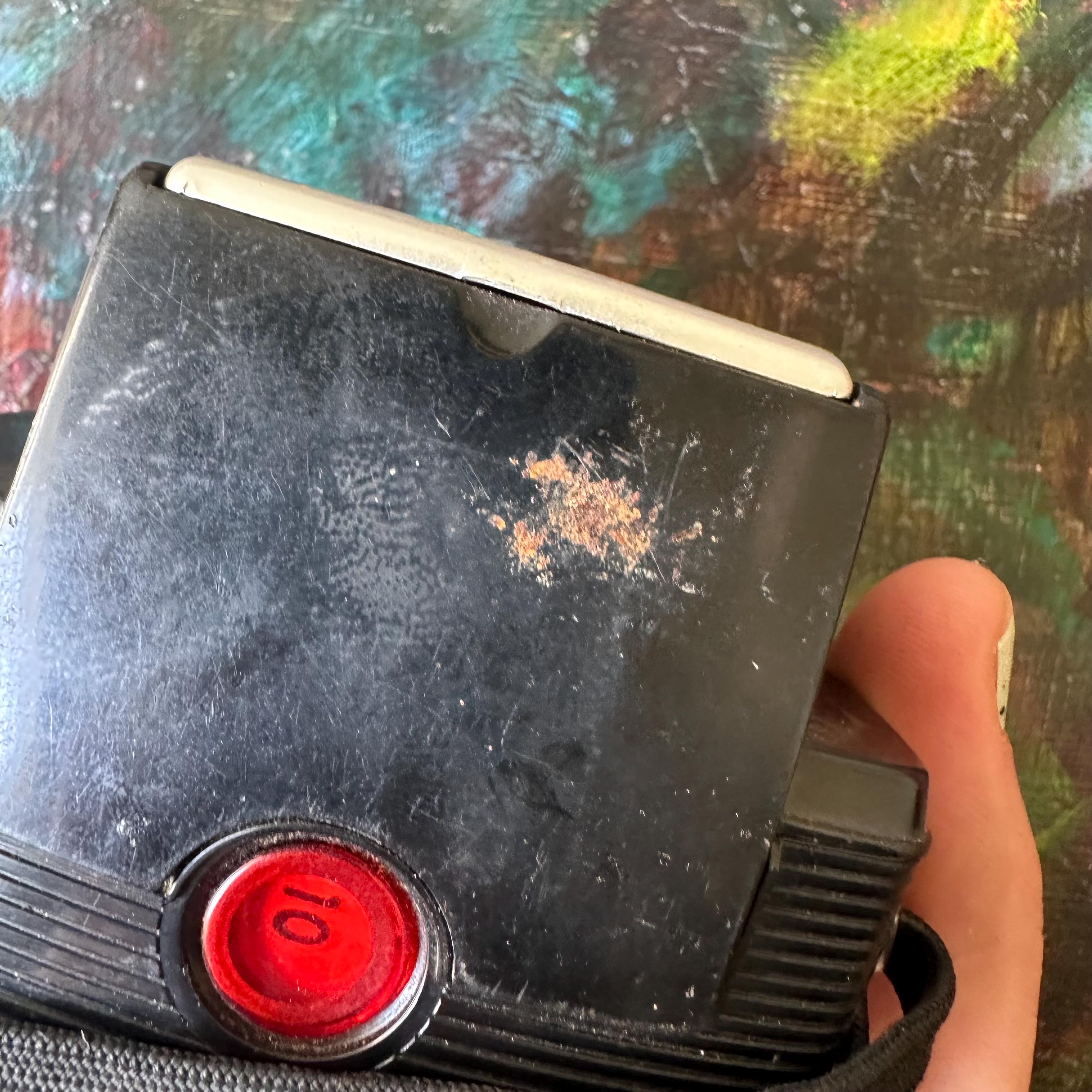 This Starflex is in good vintage condition for its age and use. The viewfinder and back film casing open and close easily. There is general wear to the casing with some minor scratching and discoloration. The lens looks dusty through the viewfinder and is unfocused, but the Duraflex doesn't have the ability to focus, so not sure if that's part of the original design. The shutter works, and I think there is still a roll of film in the camera. The number advanced from 10-12 when I tried the shutter! The back of the camera has a rust spot at the top. The bottom front lens is dented to the top right.