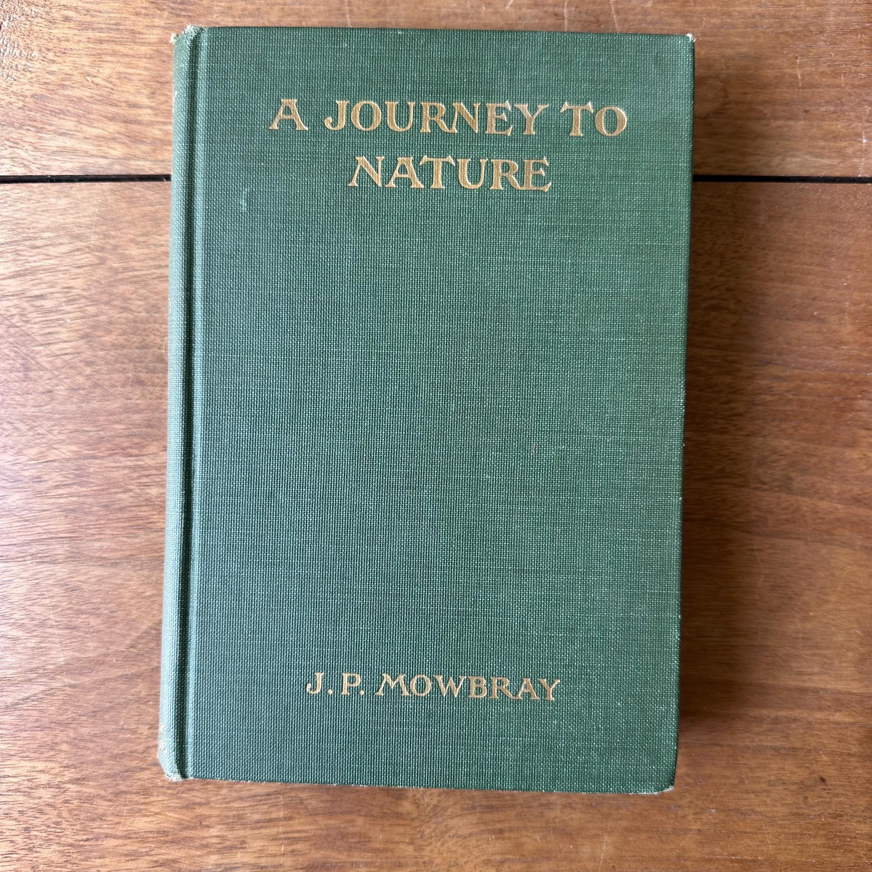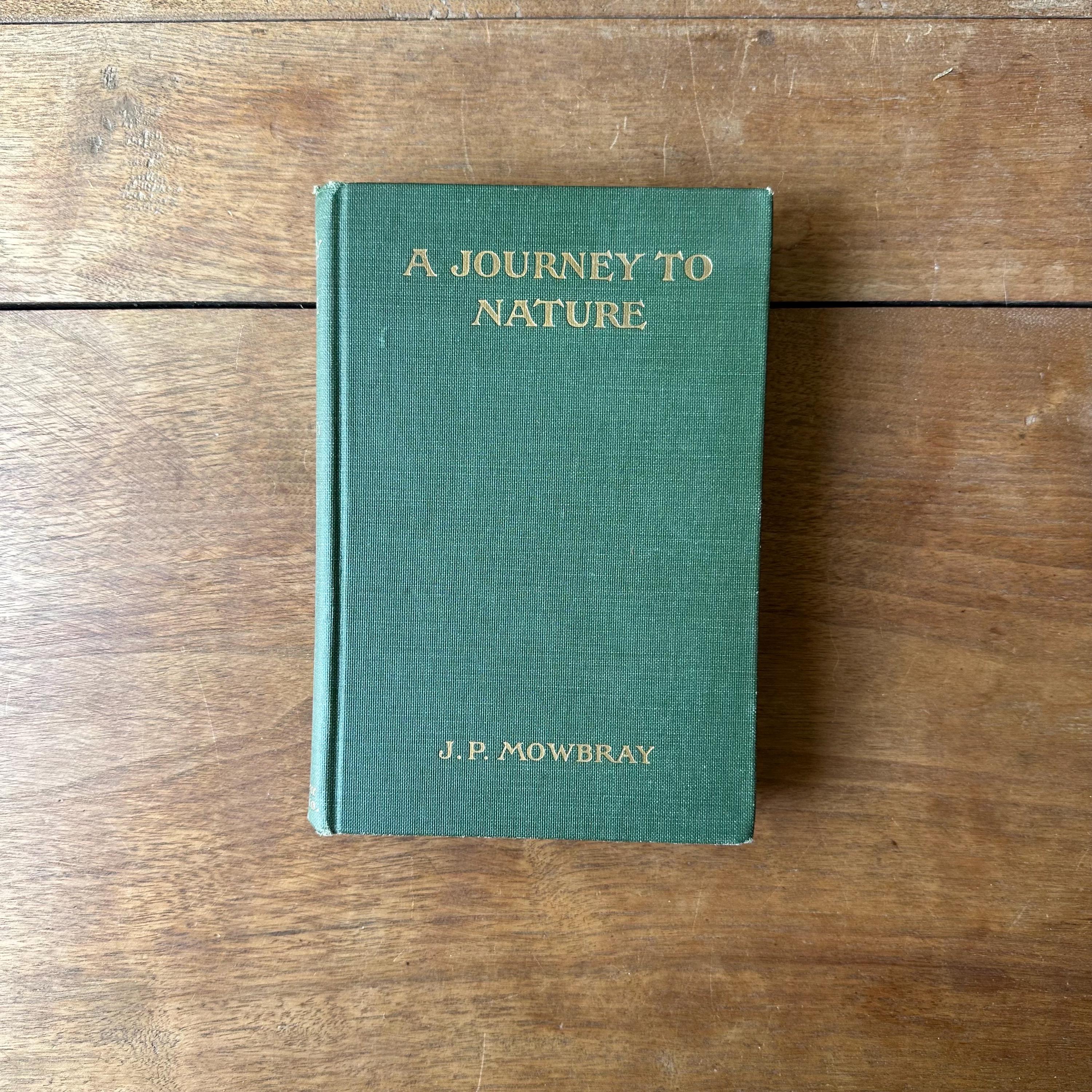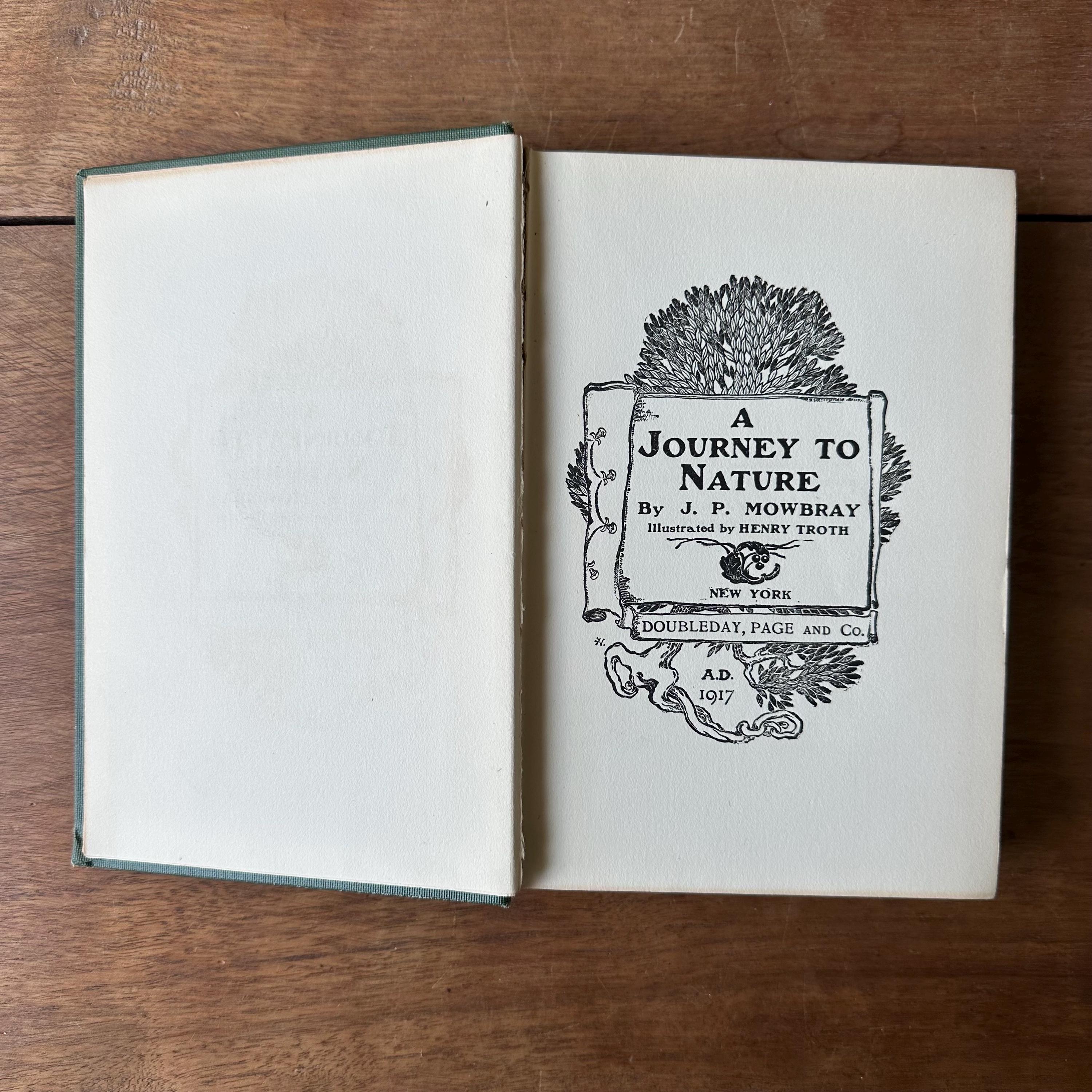 This is the antique 1917 edition of A Journey to Nature by J.P. Mowbray, published by Doubleday Page & Co. It features a forest green cover with gold lettering. The spine is also lettered in gold. The title page has a lovely Art Nouveau illustration of a tree, and the first and last page of each chapter also has illustrations by Henry Troth. There are 315 pages.