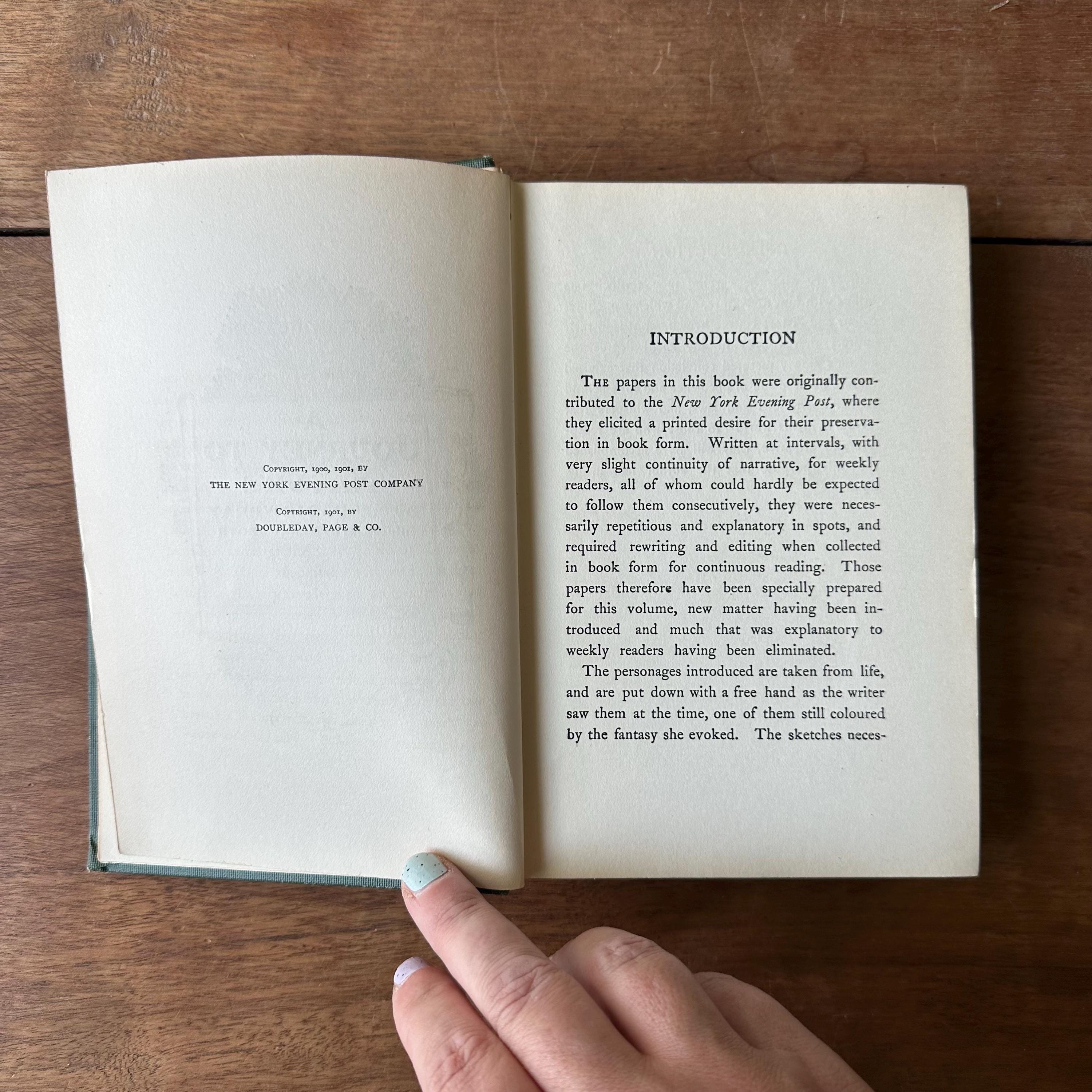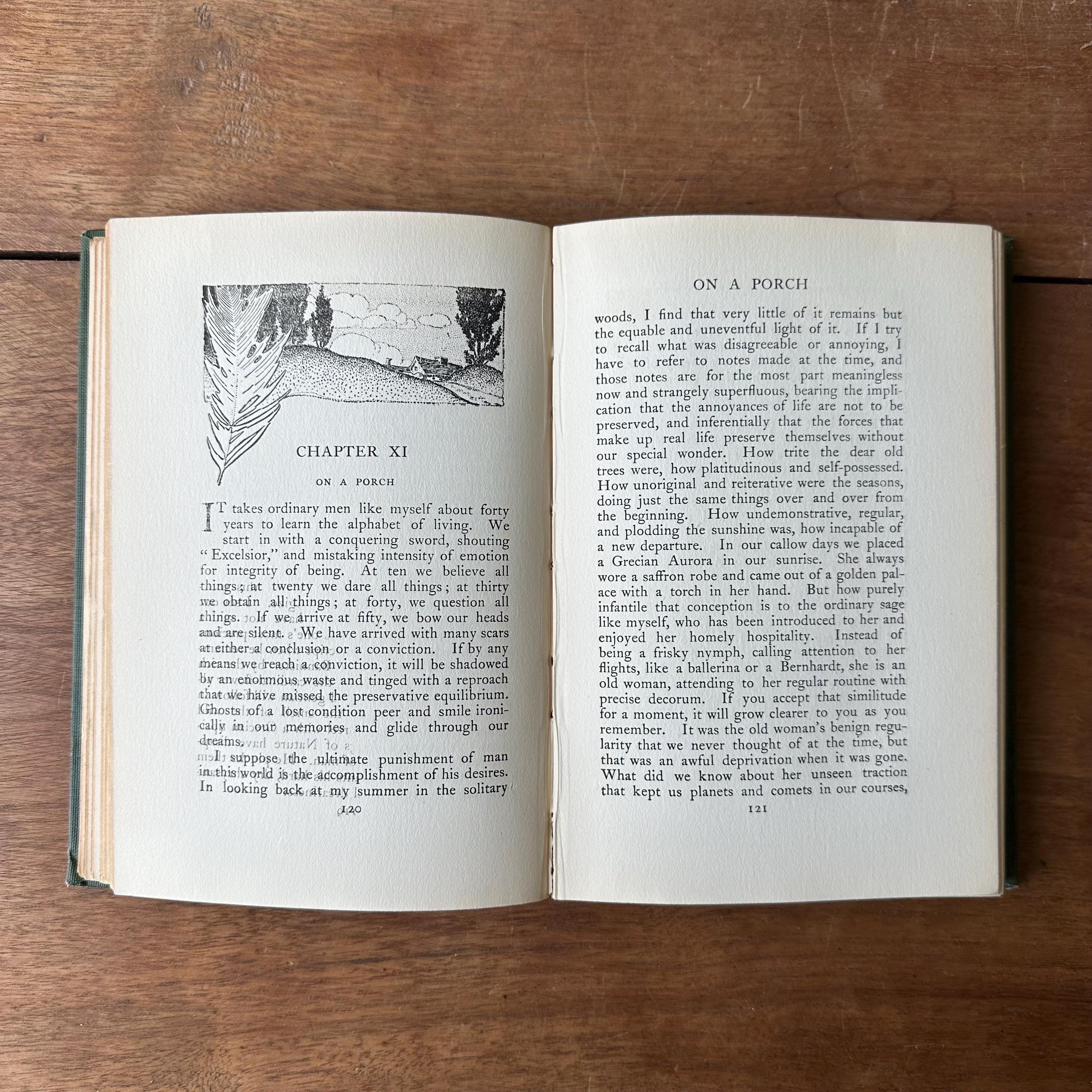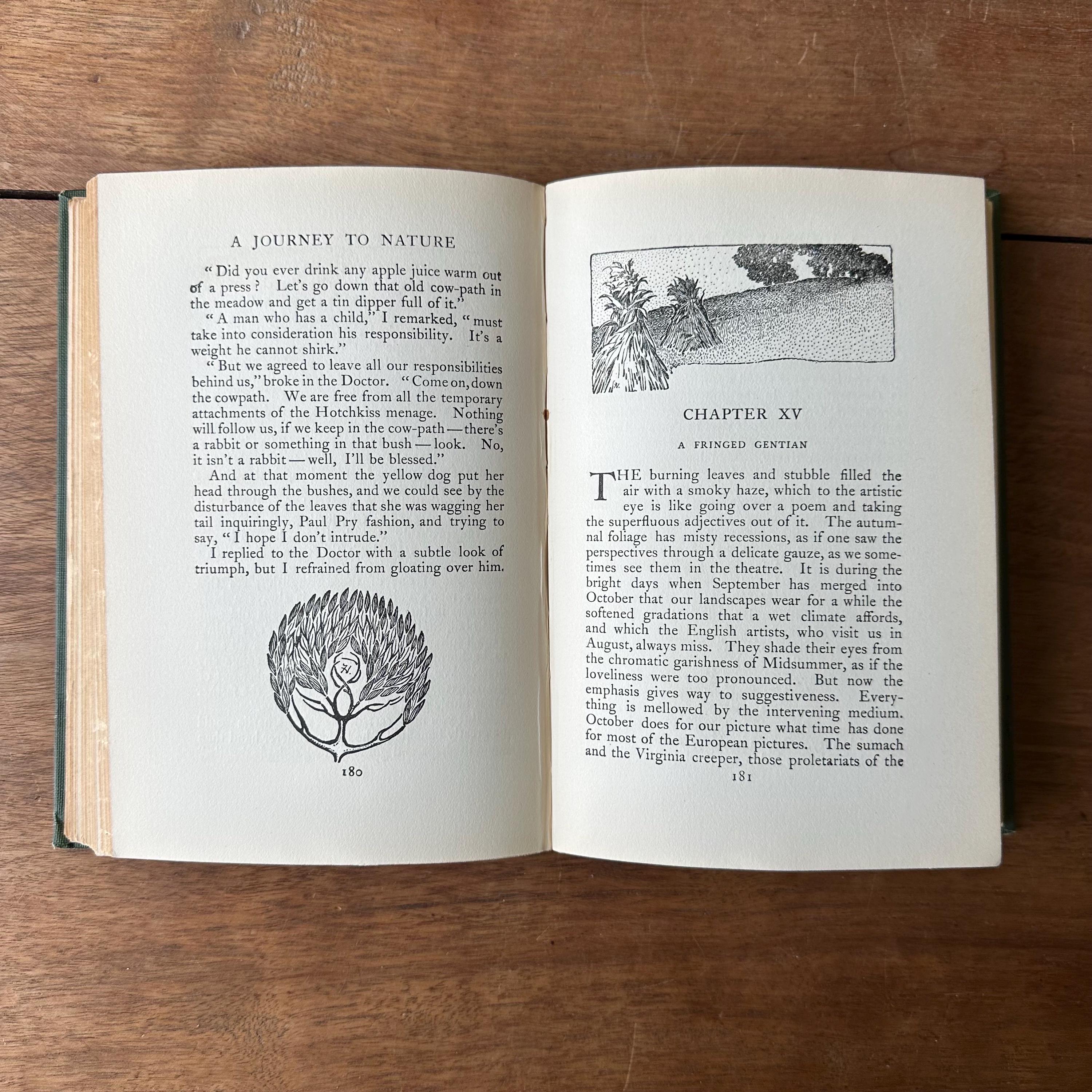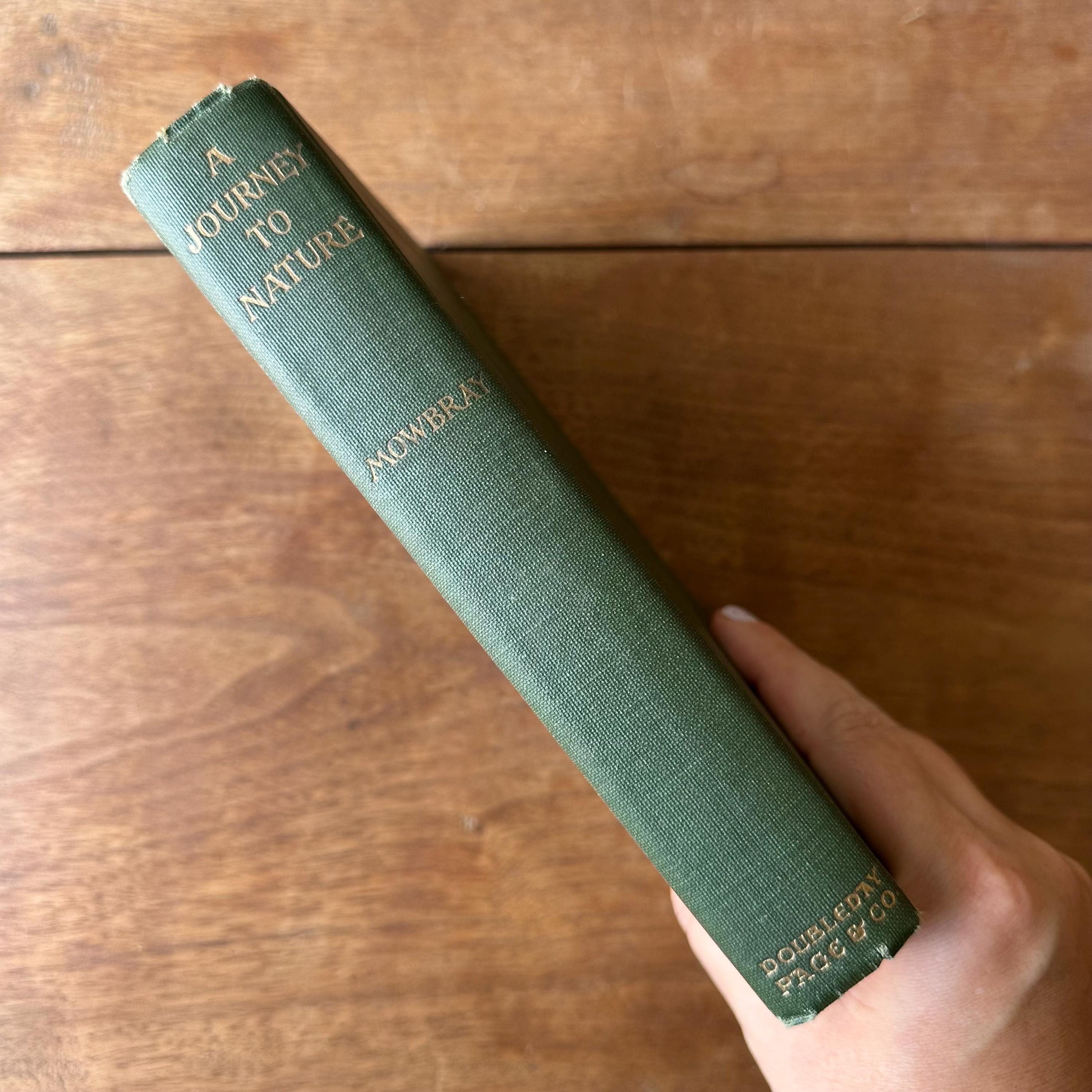 This is the antique 1917 edition of A Journey to Nature by J.P. Mowbray, published by Doubleday Page & Co. It features a forest green cover with gold lettering. The spine is also lettered in gold. The title page has a lovely Art Nouveau illustration of a tree, and the first and last page of each chapter also has illustrations by Henry Troth. There are 315 pages.