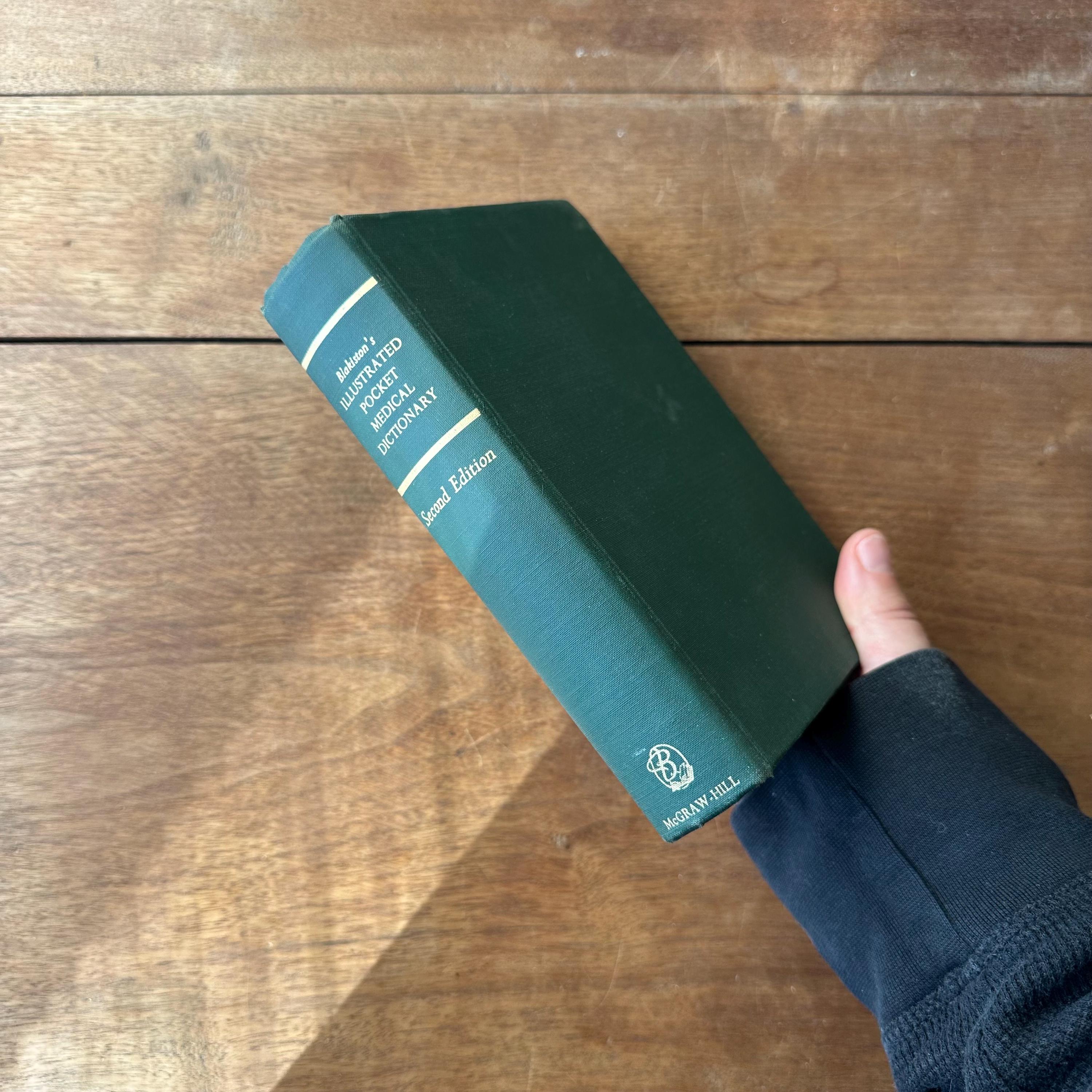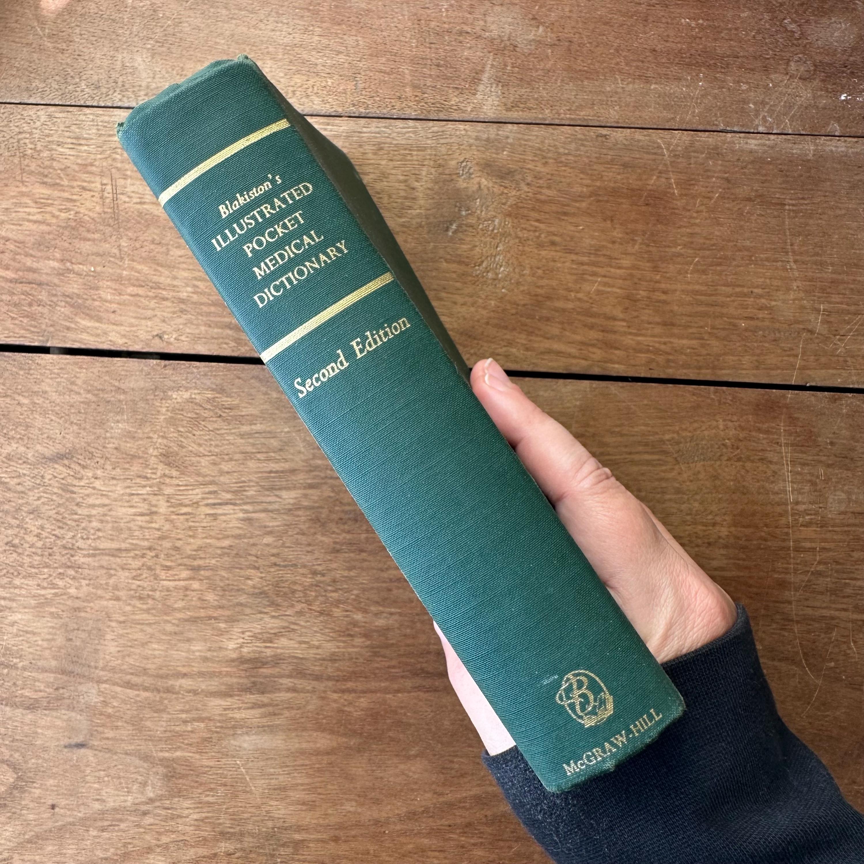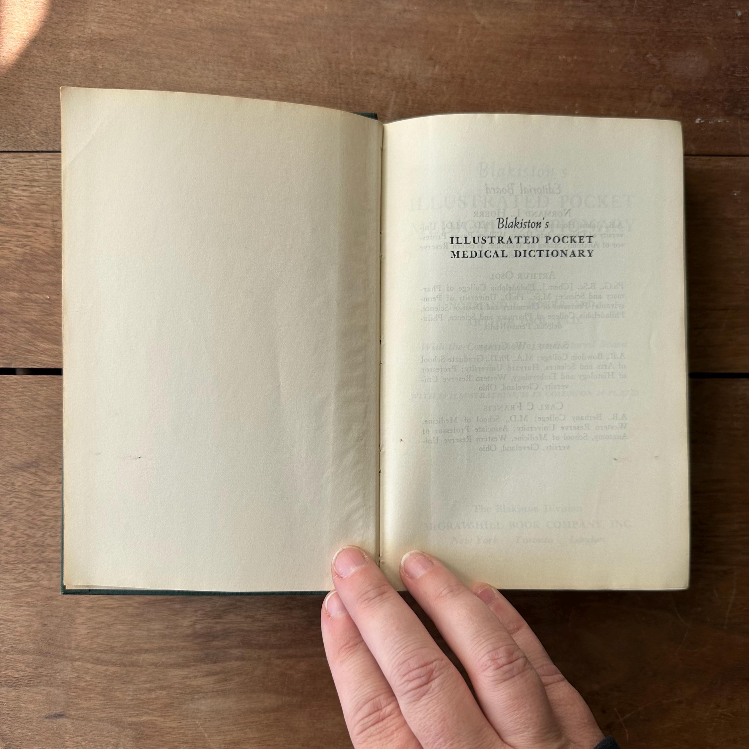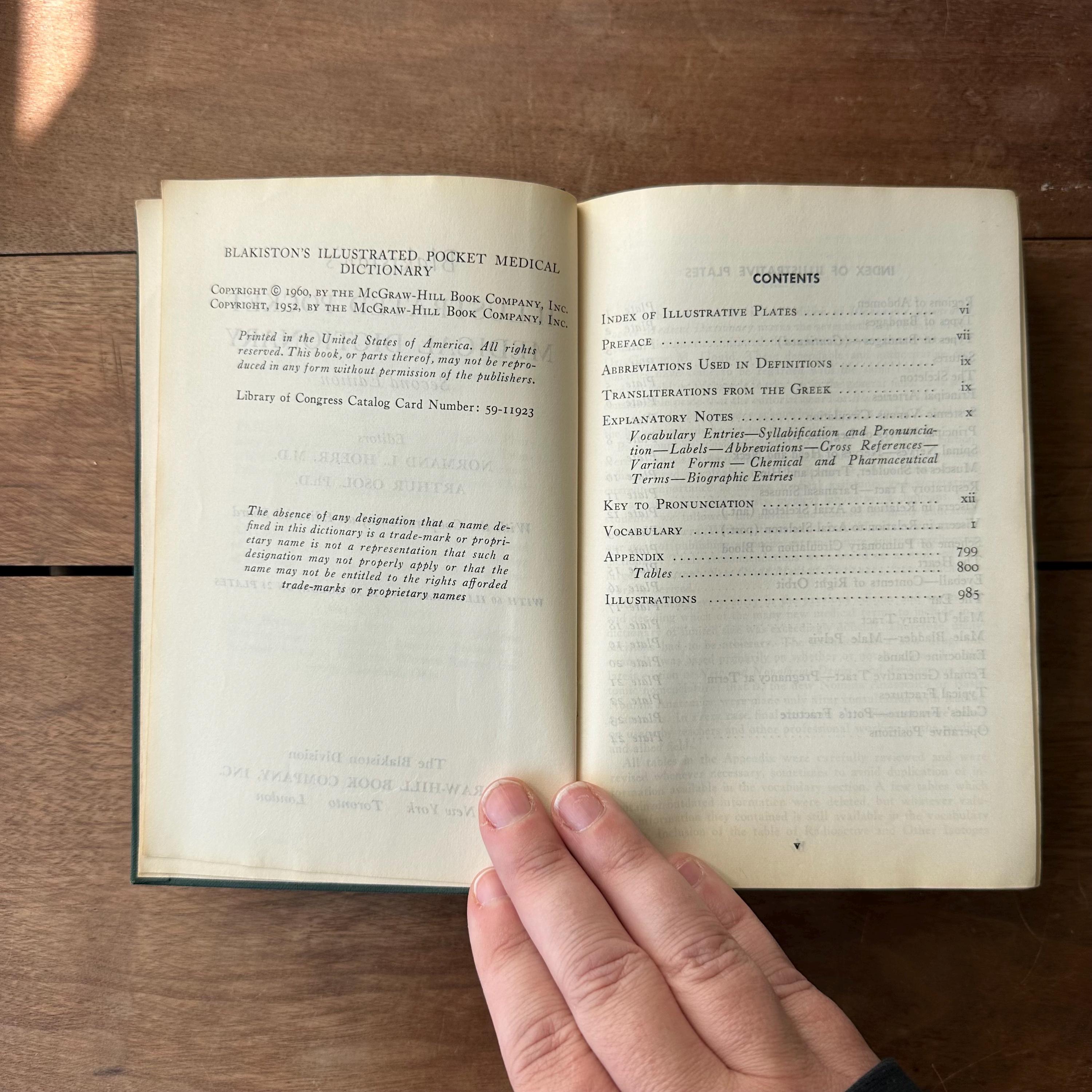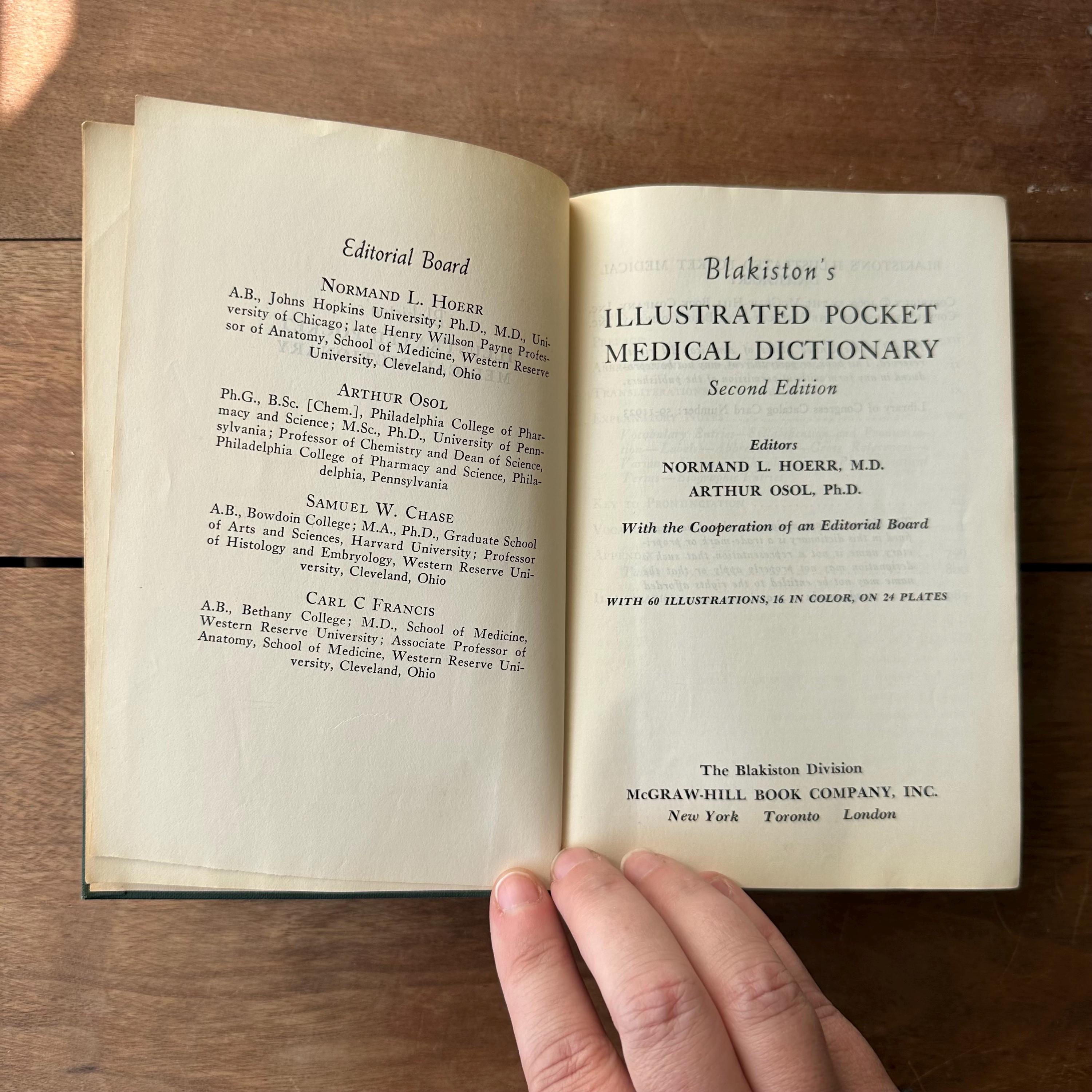 This is the 1960 Second Edition of Blakiston's Illustrated Pocket Medical Dictionary, edited by Normand L. Hoerr and Arthur Osol, and published by The Blakiston Division of McGraw-Hill Book Company, Inc. It has dark green covers with gold lettering on the spine. The dictionary has 24 illustrative plates with both color and black and white plates. There are 985 pages.