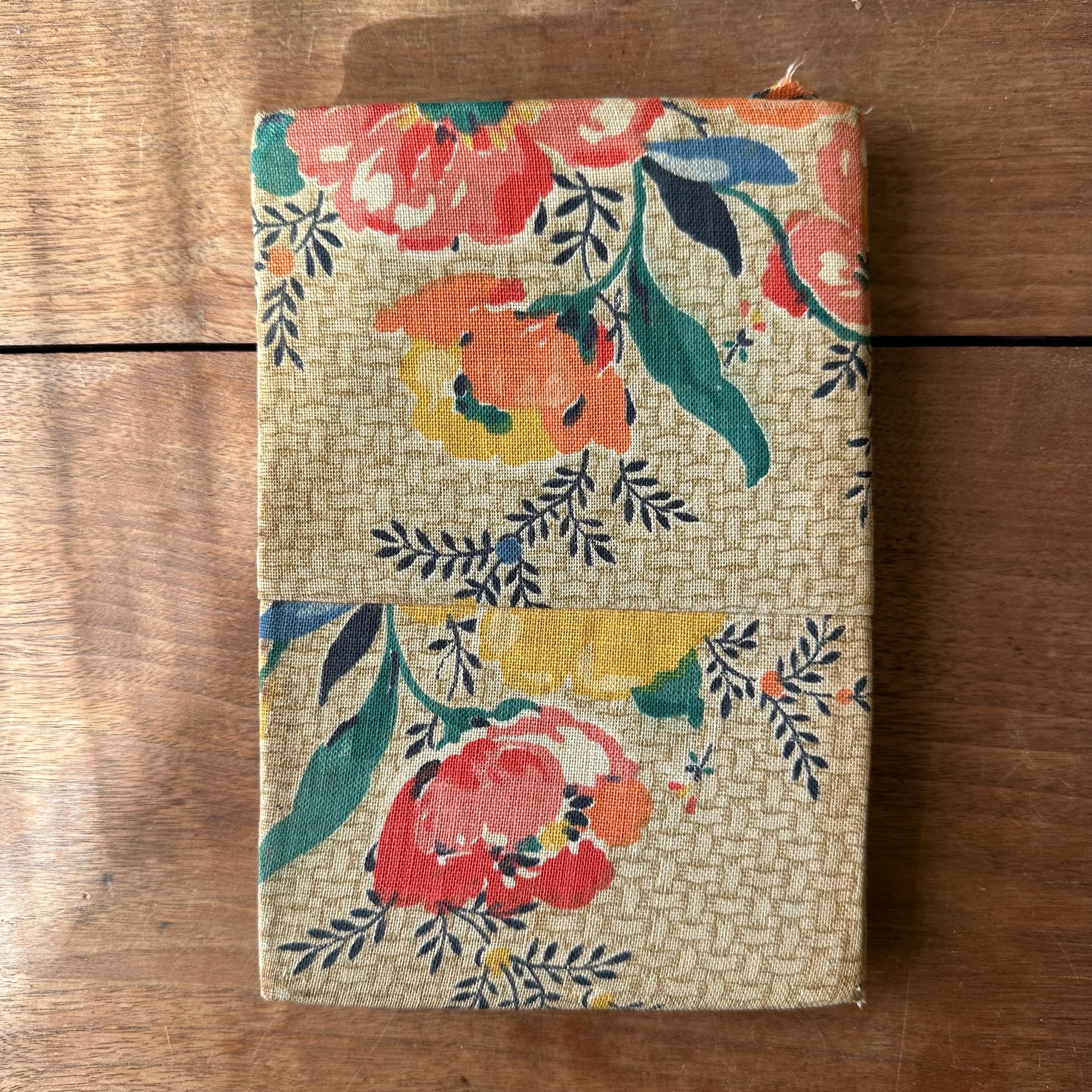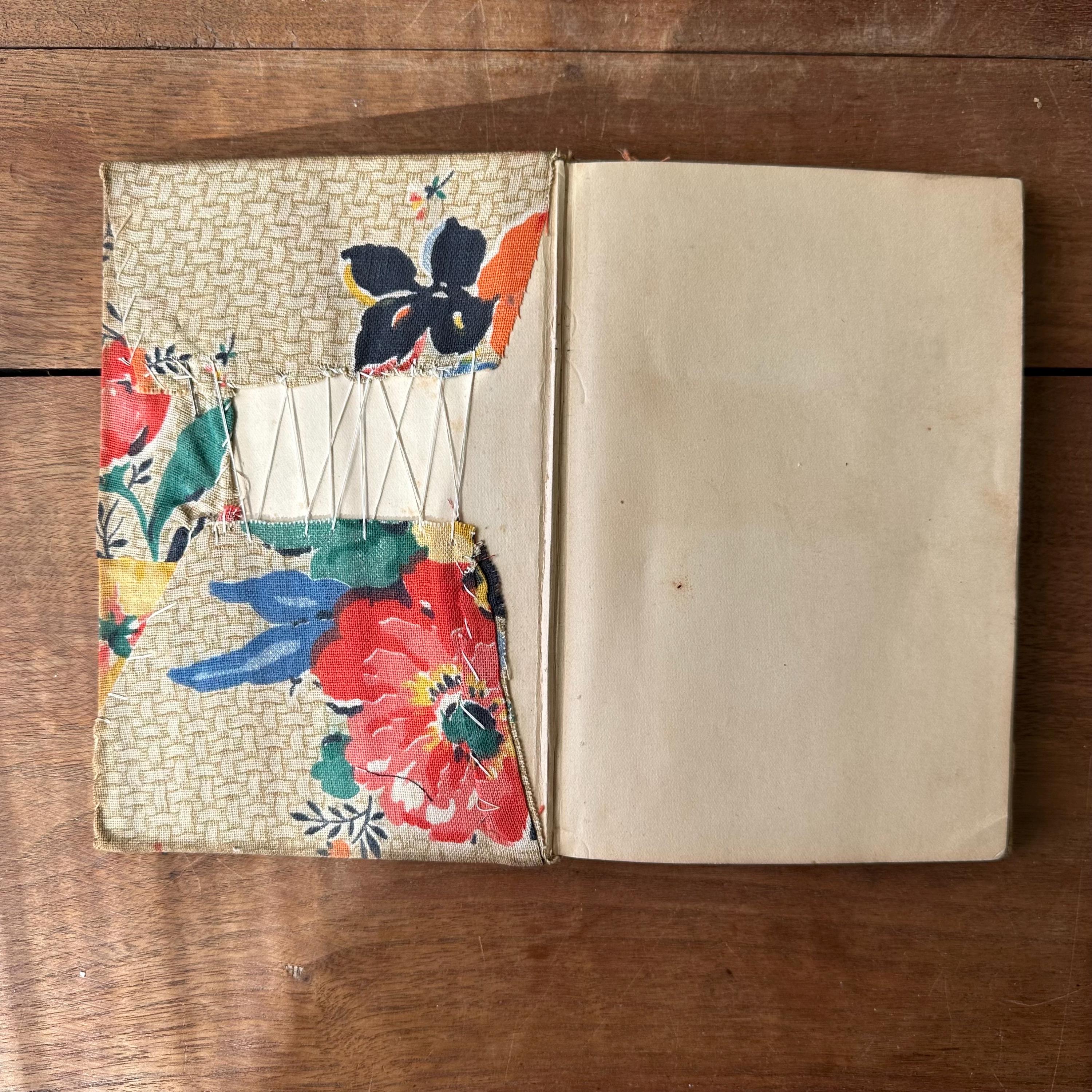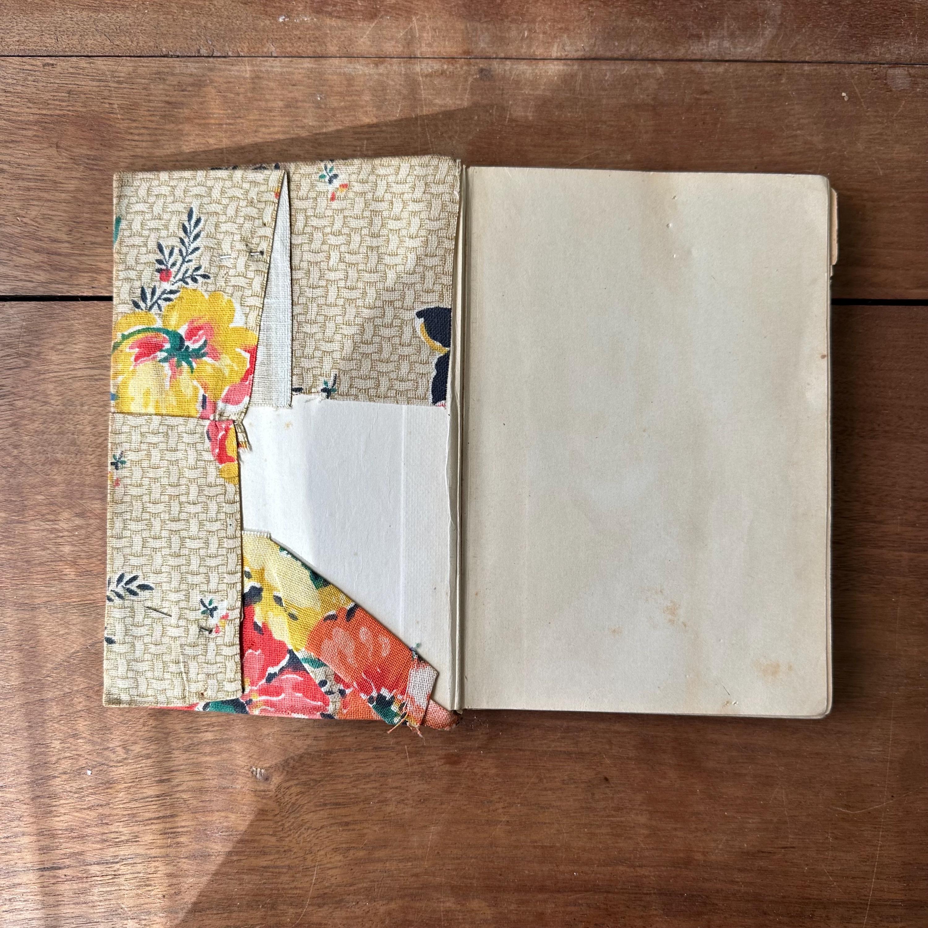 The book is in vintage condition for its age and use. Like I said, it's a puzzle, but it's an interesting one with some cool vintage fabric for the cover! The fabric has some discoloration and staining along the right edge. The book pages are loose but the covers are still attached at the spine. The pages are yellowed.