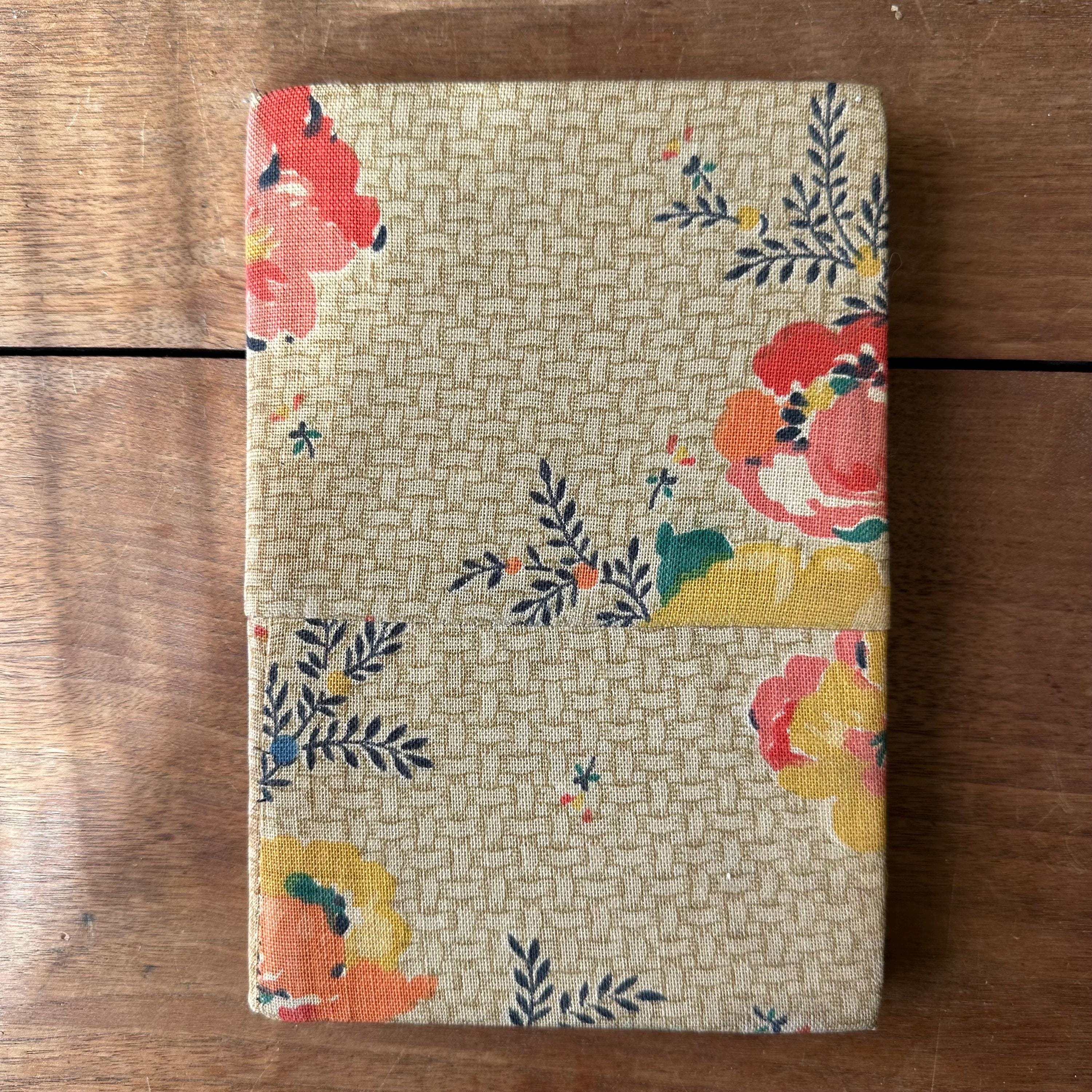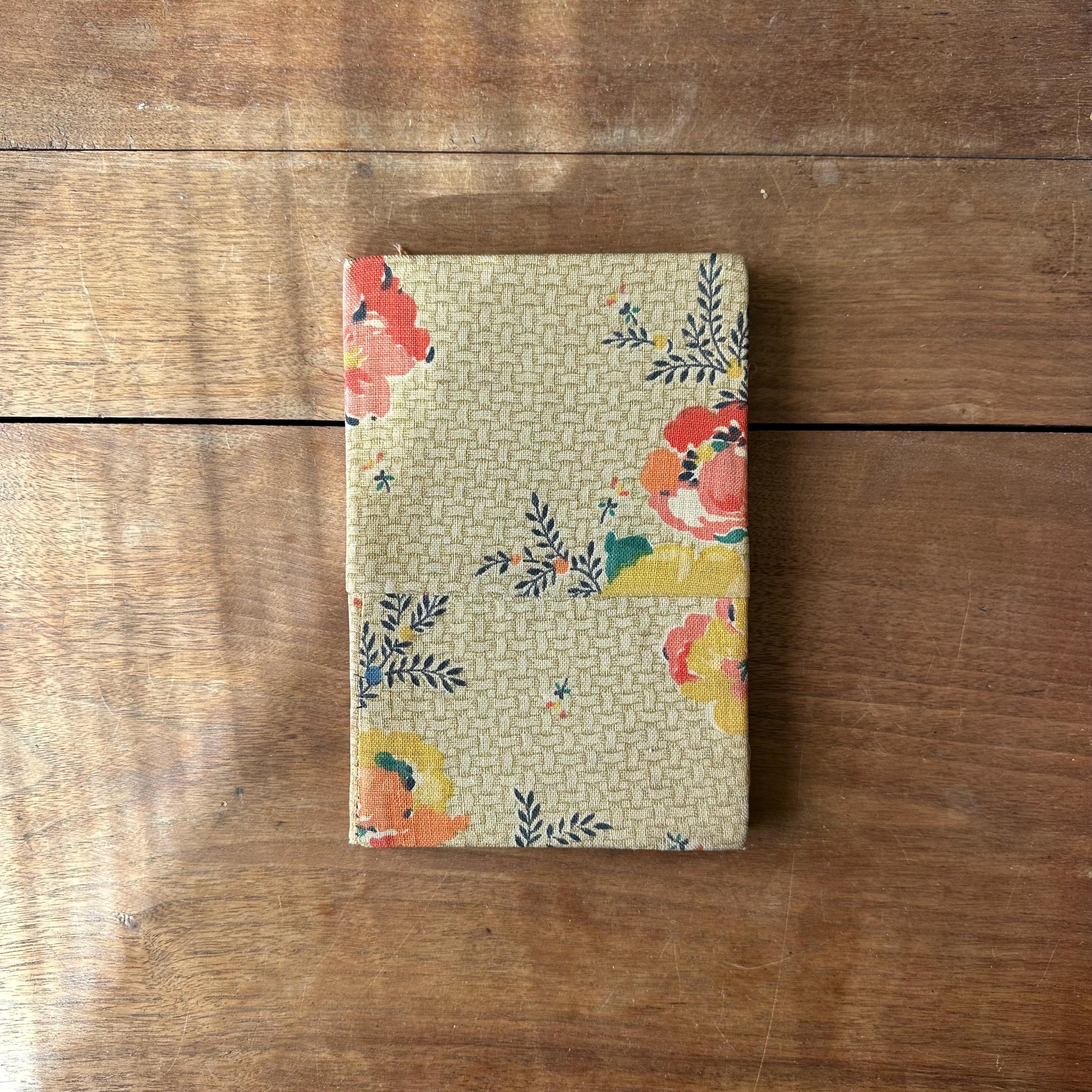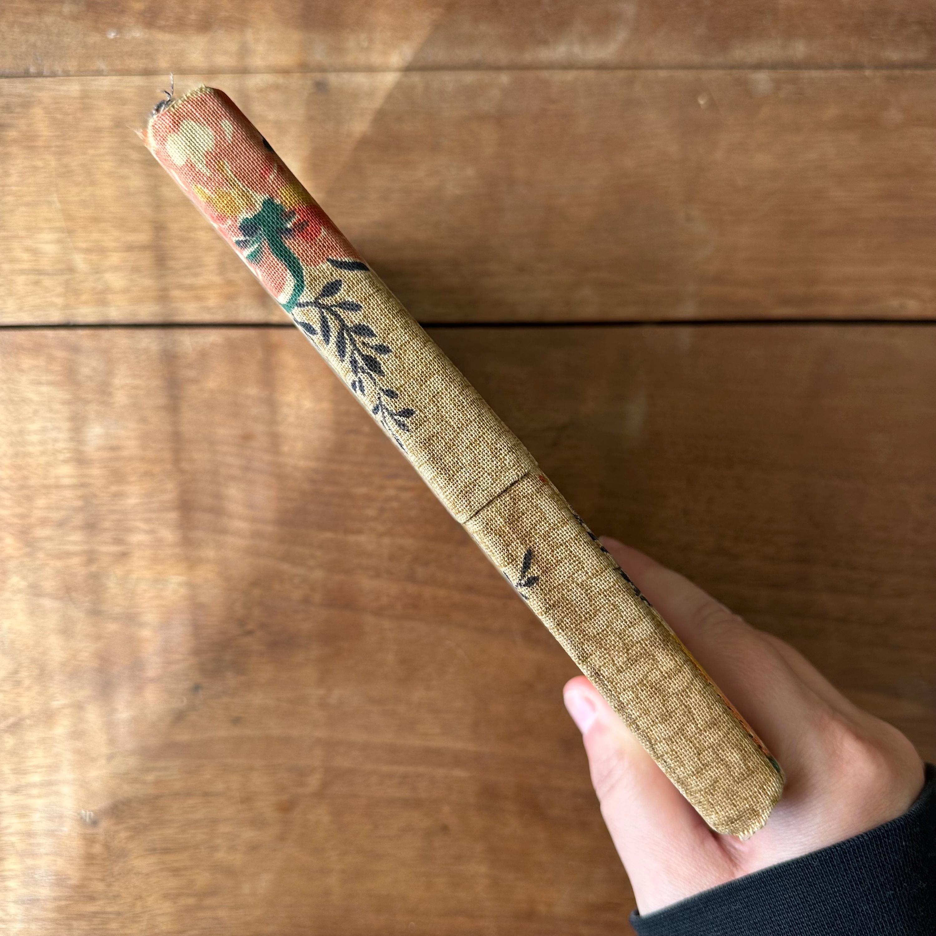 The book is in vintage condition for its age and use. Like I said, it's a puzzle, but it's an interesting one with some cool vintage fabric for the cover! The fabric has some discoloration and staining along the right edge. The book pages are loose but the covers are still attached at the spine. The pages are yellowed.