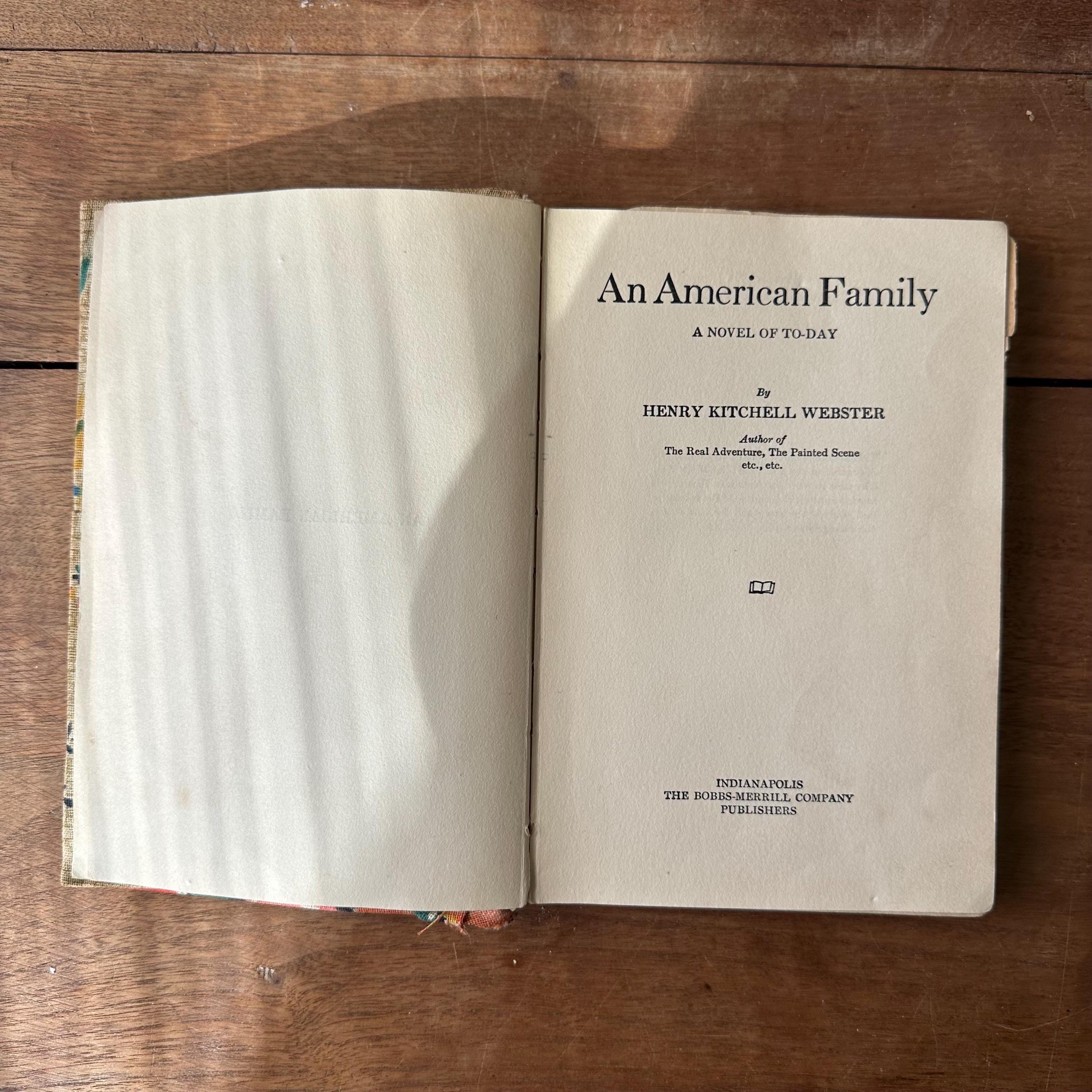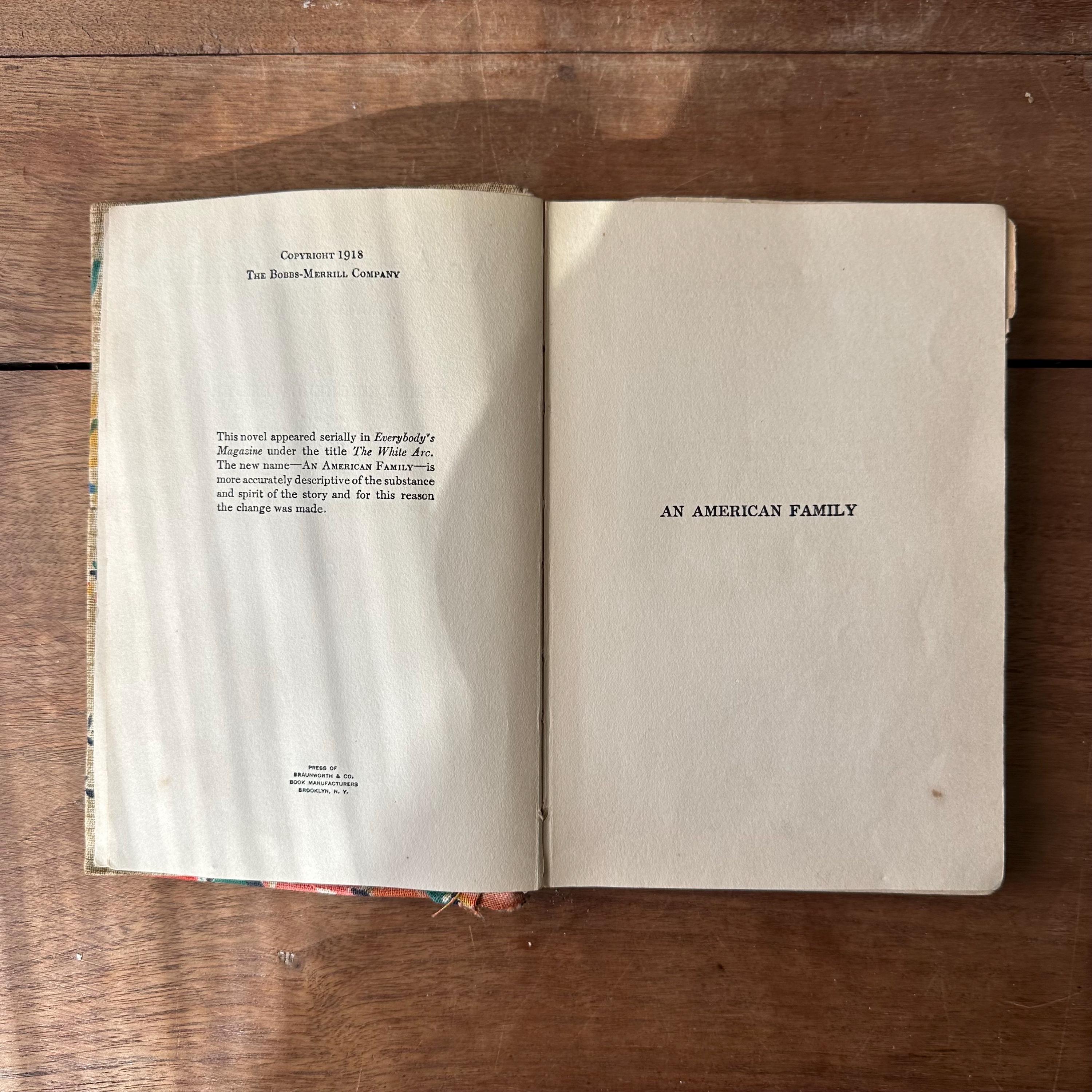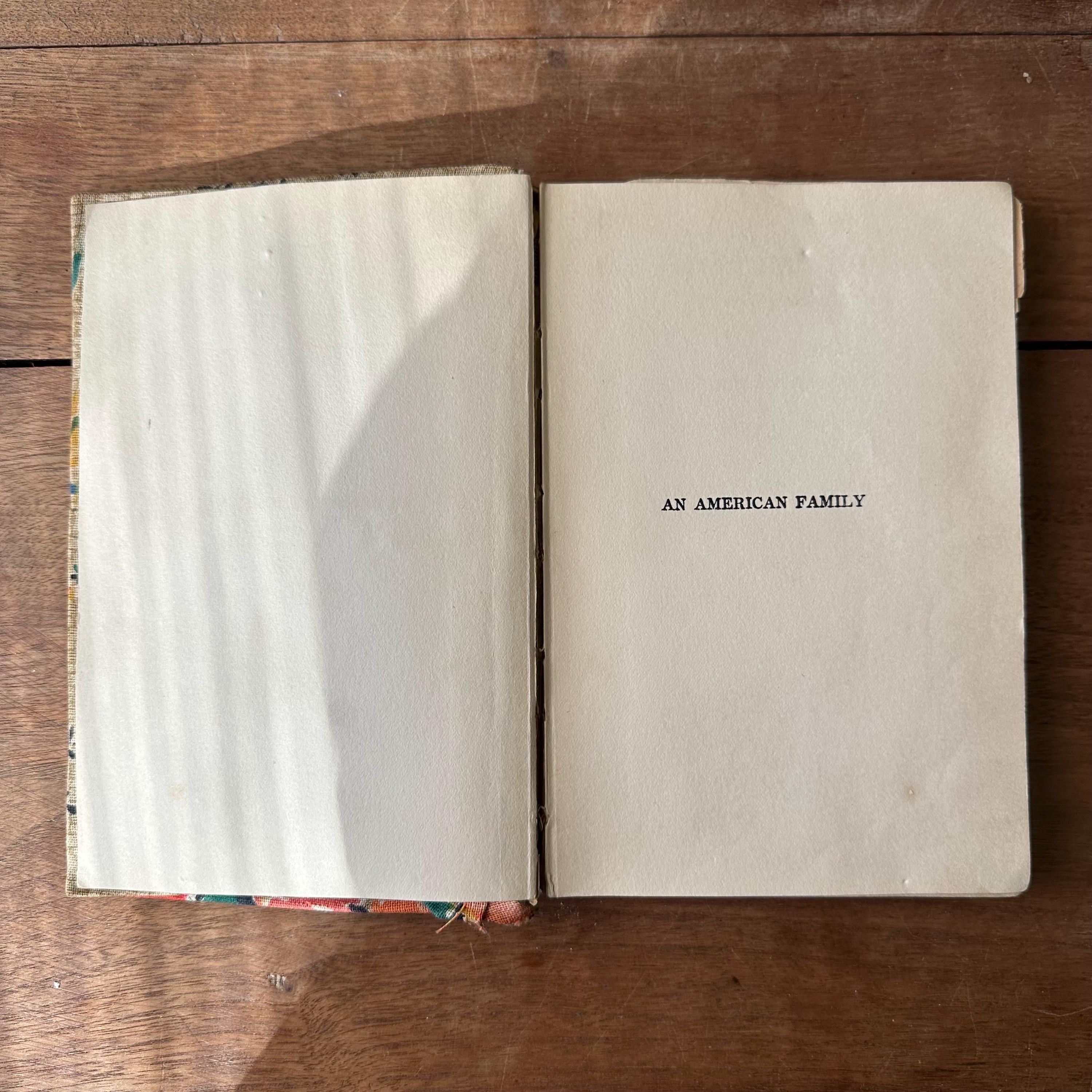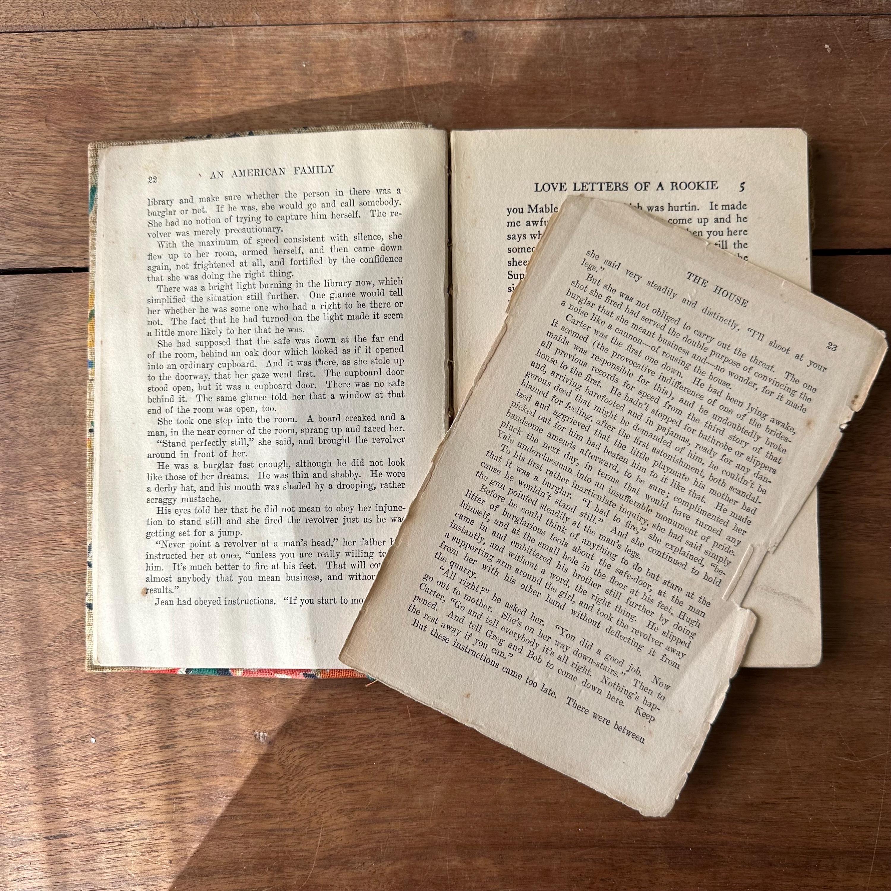 This book is a puzzle! It is actually two separate books - one-quarter An American Family from 1918 and the other three-quarters from Love Letters of a Rookie. It looks like maybe someone was learning how to bind and cover books and used two book remnants as practice. The book is covered with a bright floral fabric that has been sewn together down the middle. The front cover is pinned on. The back cover is sewn together.