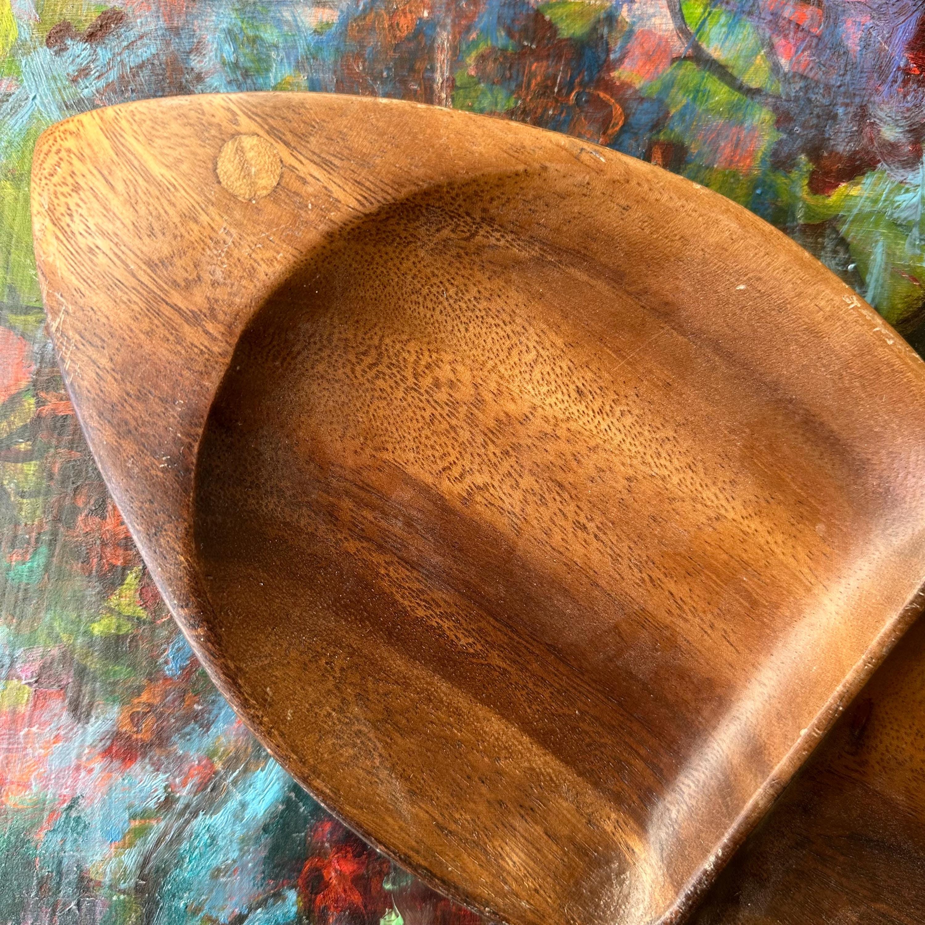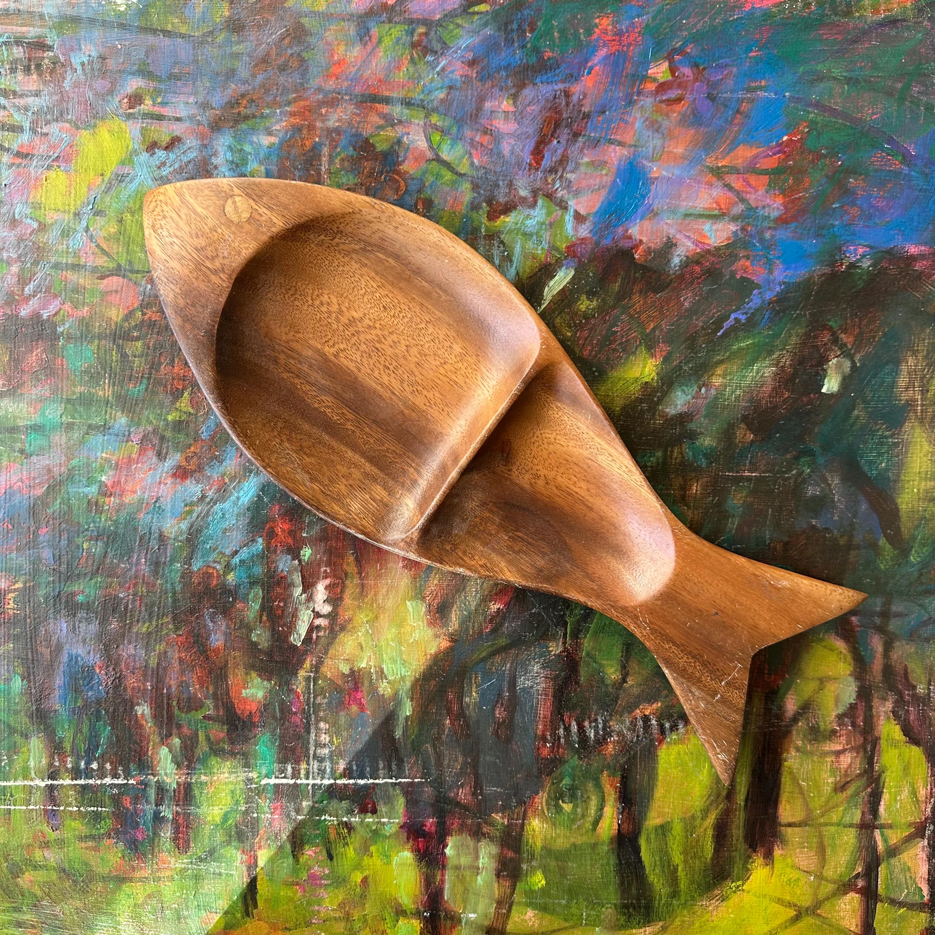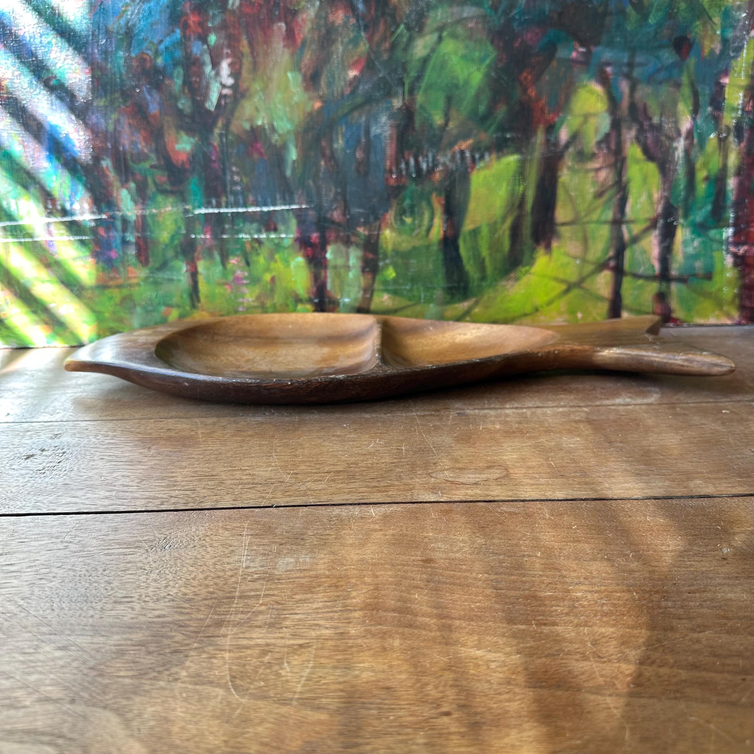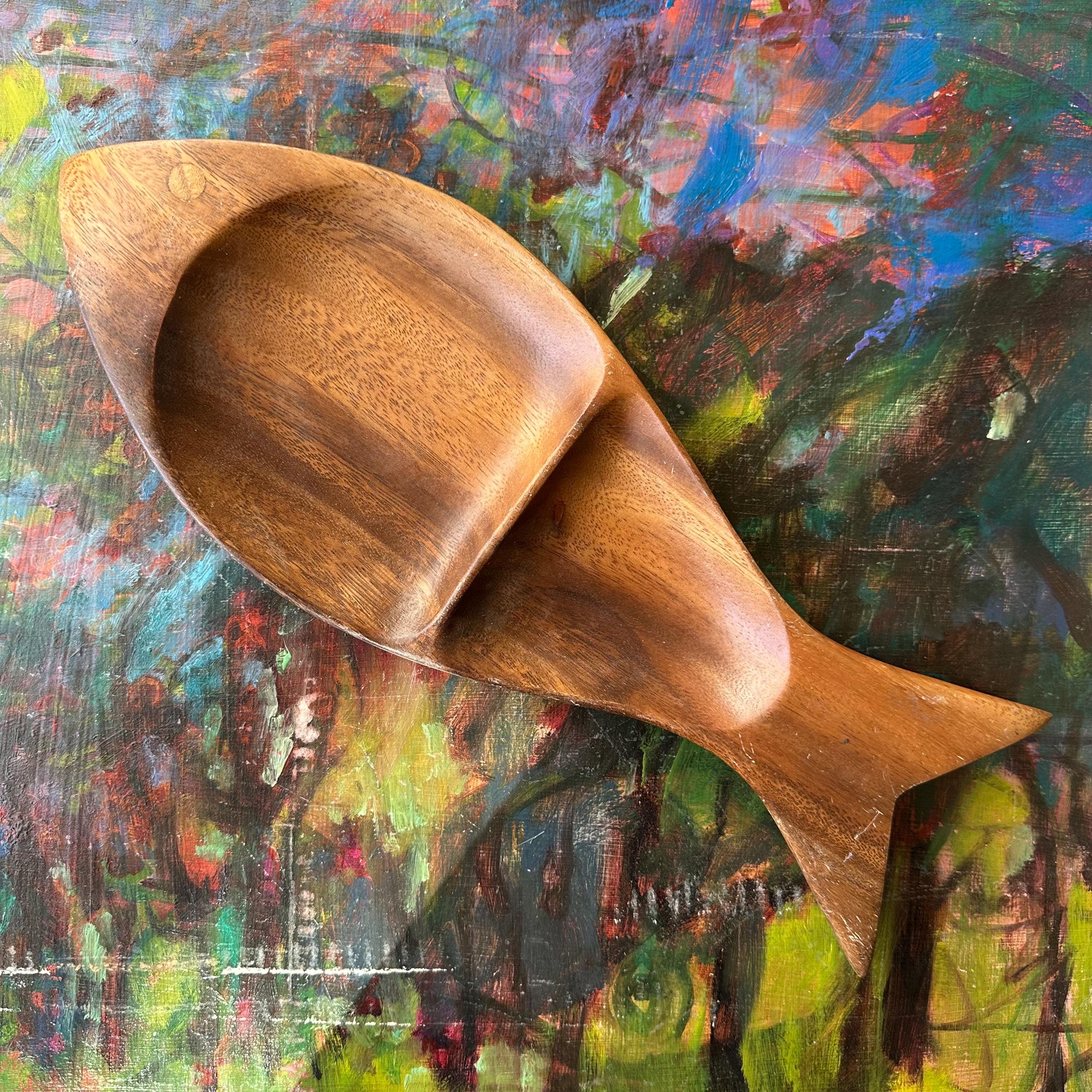 This is a midcentury teak wood serving dish in the shape of a fish. The fish fins are meant to be the carrying handle, and the body of the fish is divided into two compartments for snacks, cheeses, meats, olives, whatever your heart desires for your fish dish! The eye of the fish is an inset piece of lighter colored wood.