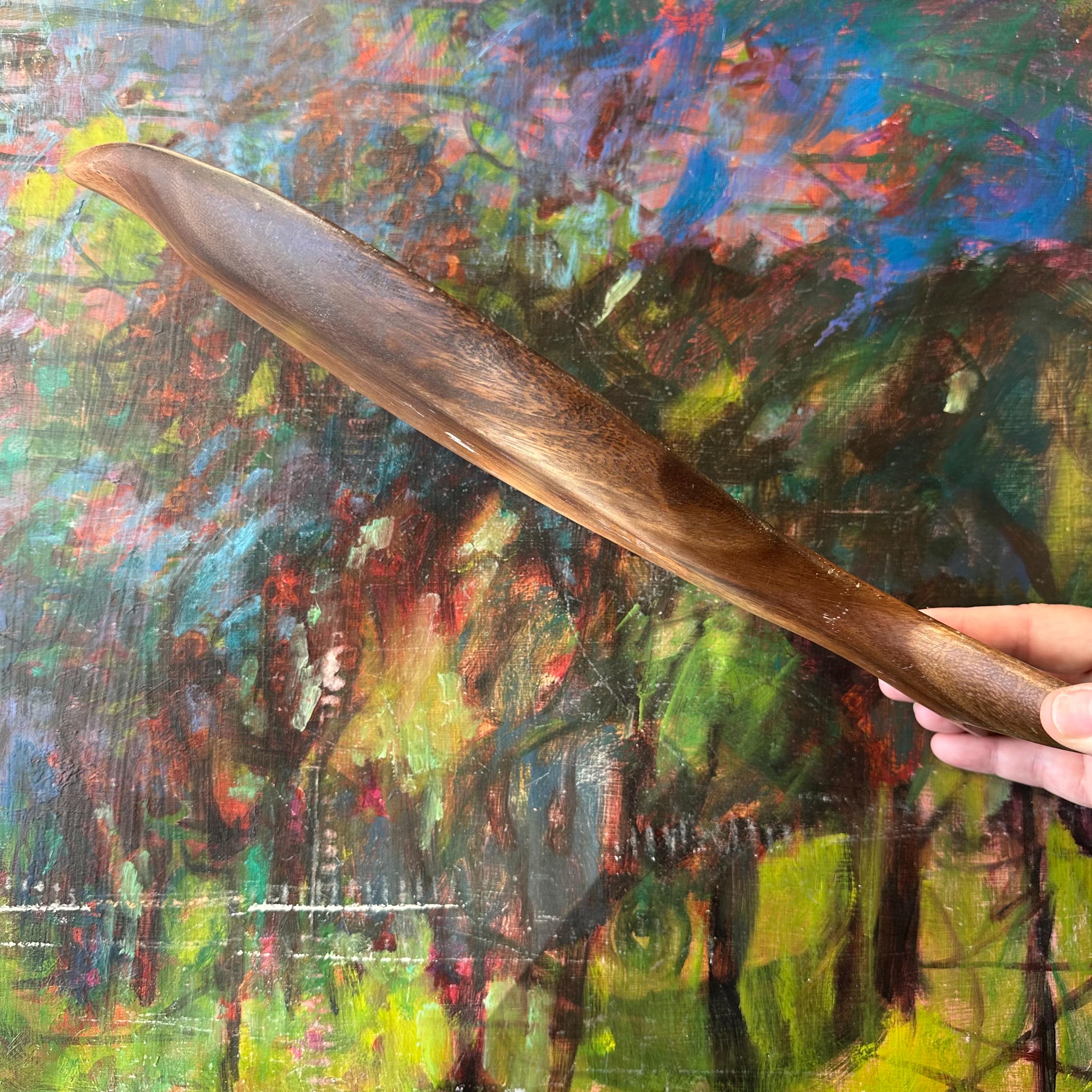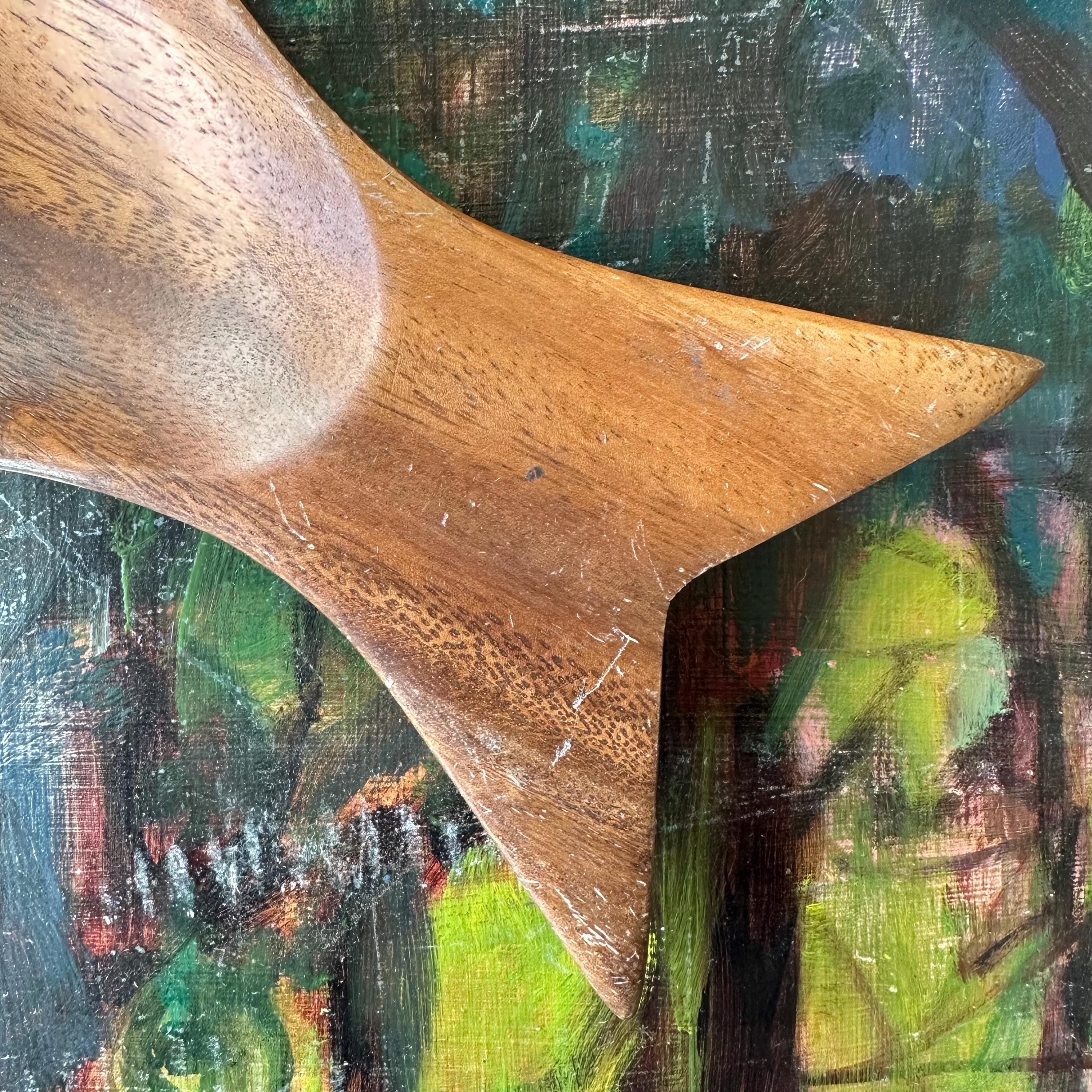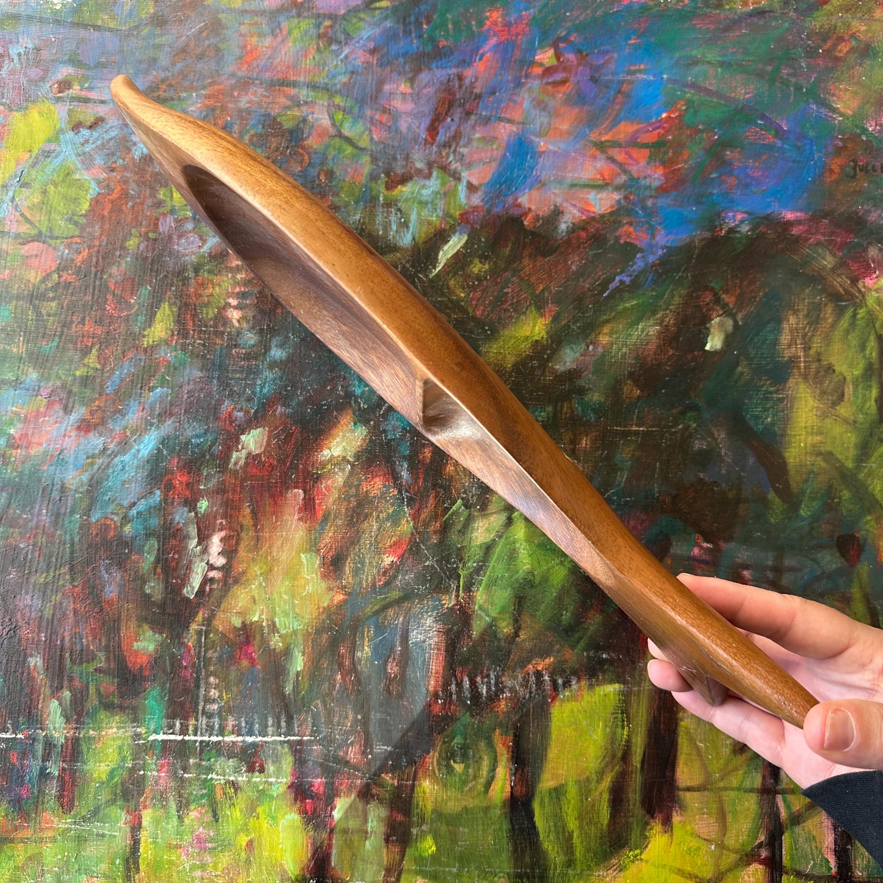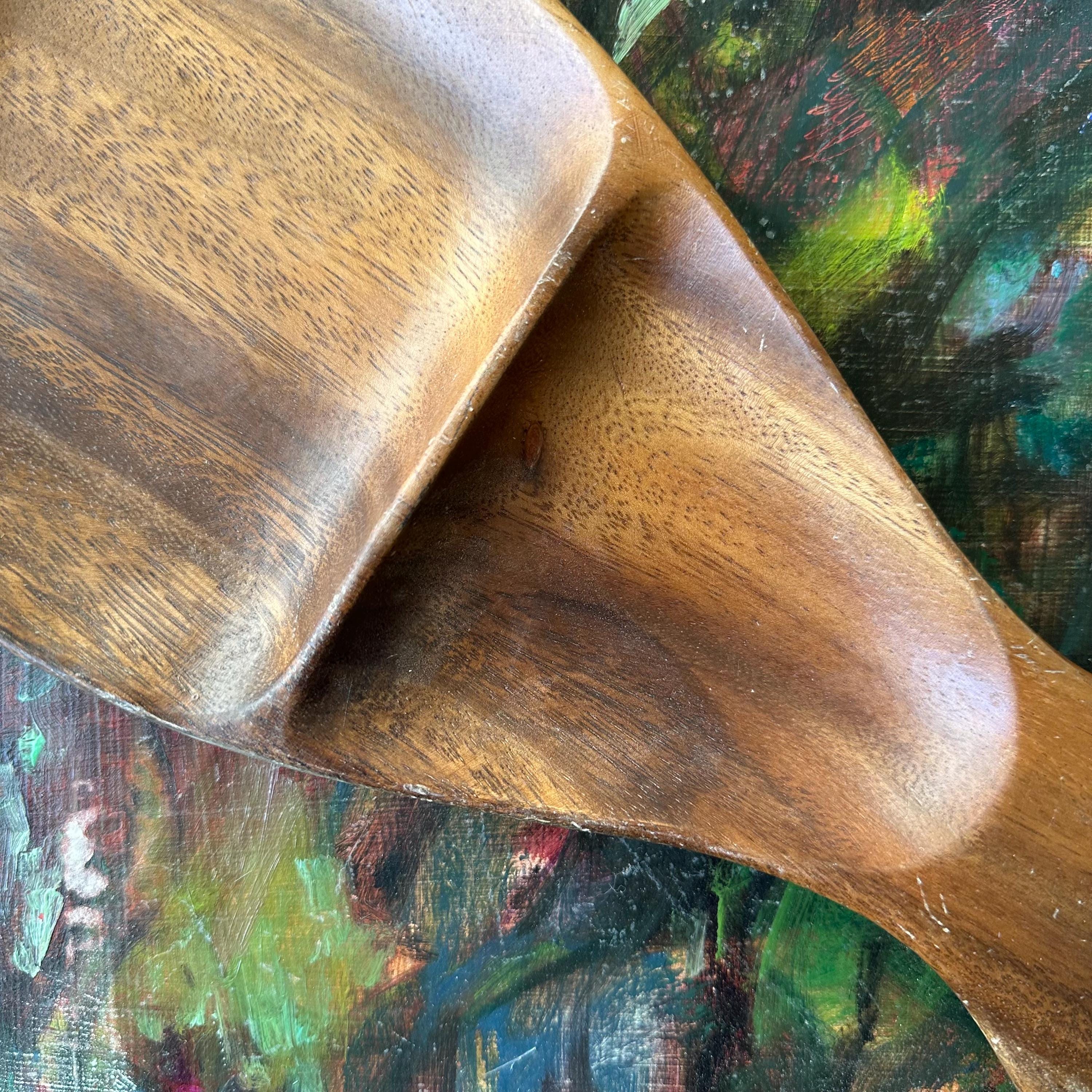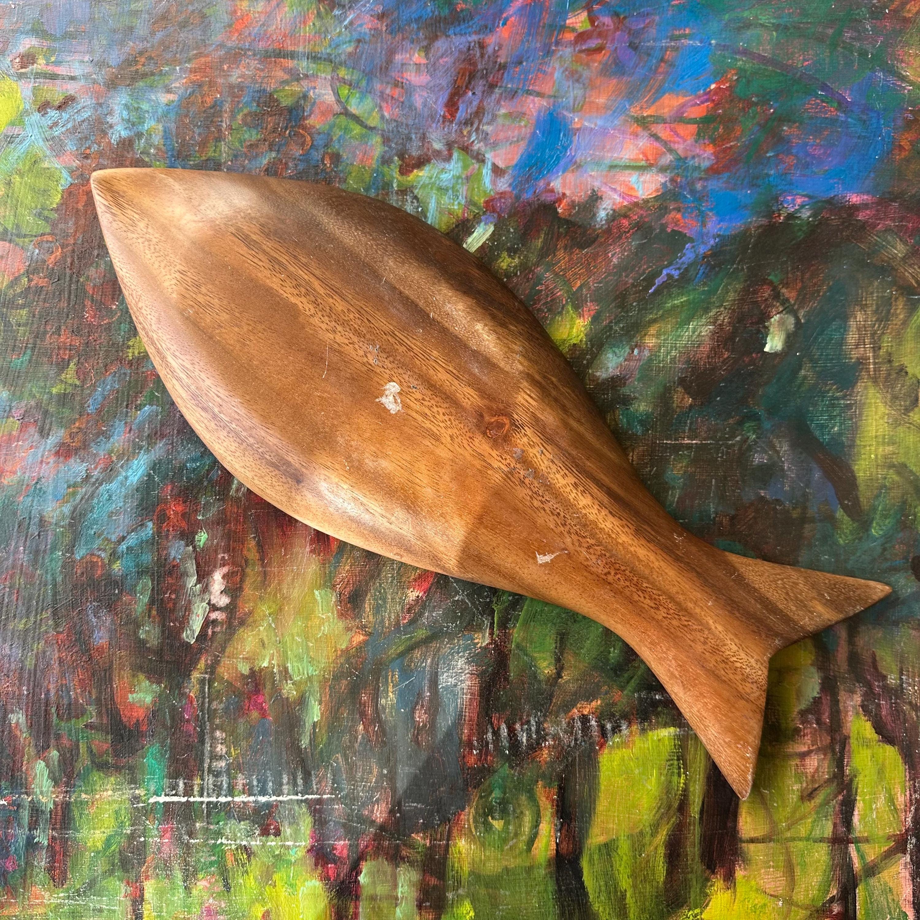 This is a midcentury teak wood serving dish in the shape of a fish. The fish fins are meant to be the carrying handle, and the body of the fish is divided into two compartments for snacks, cheeses, meats, olives, whatever your heart desires for your fish dish! The eye of the fish is an inset piece of lighter colored wood.