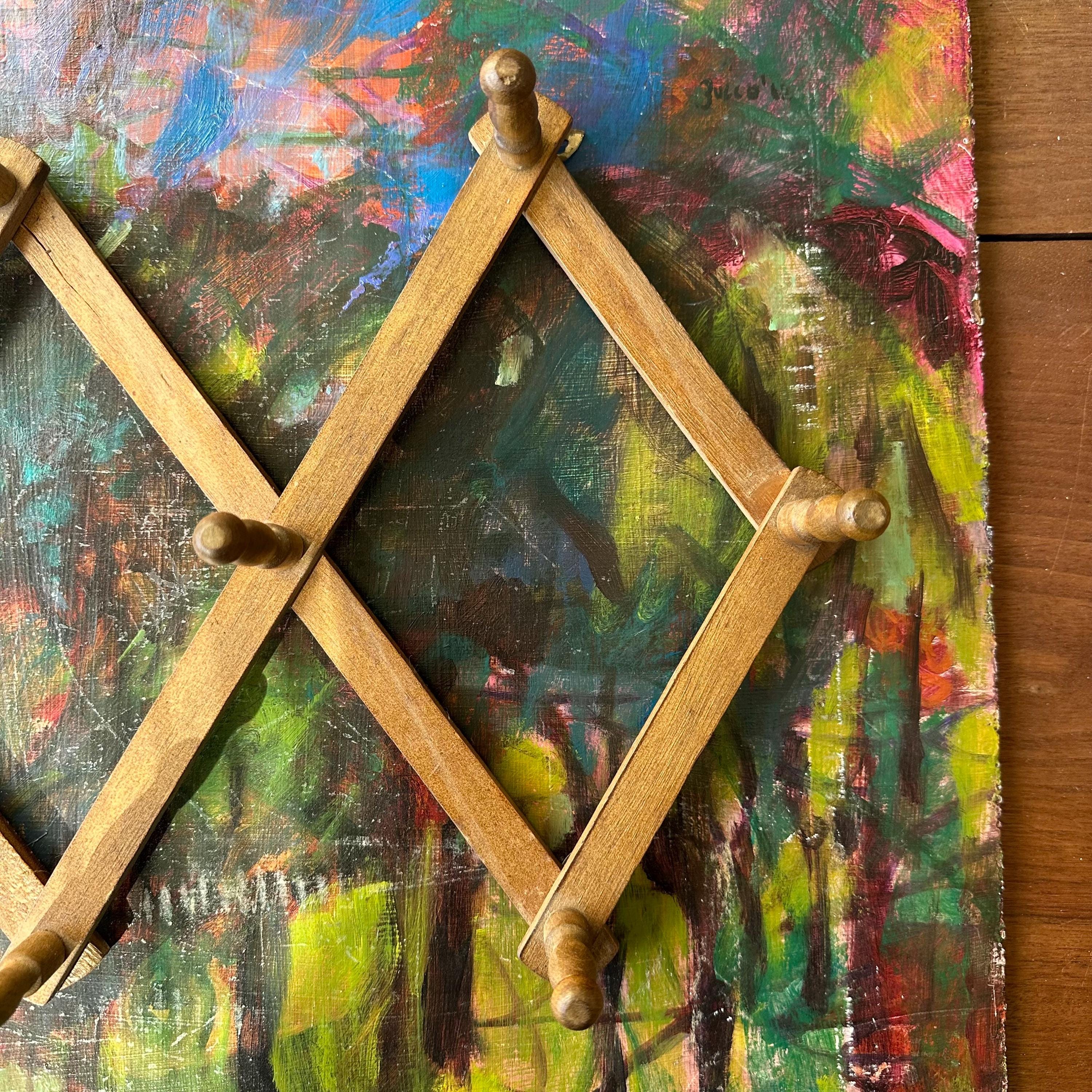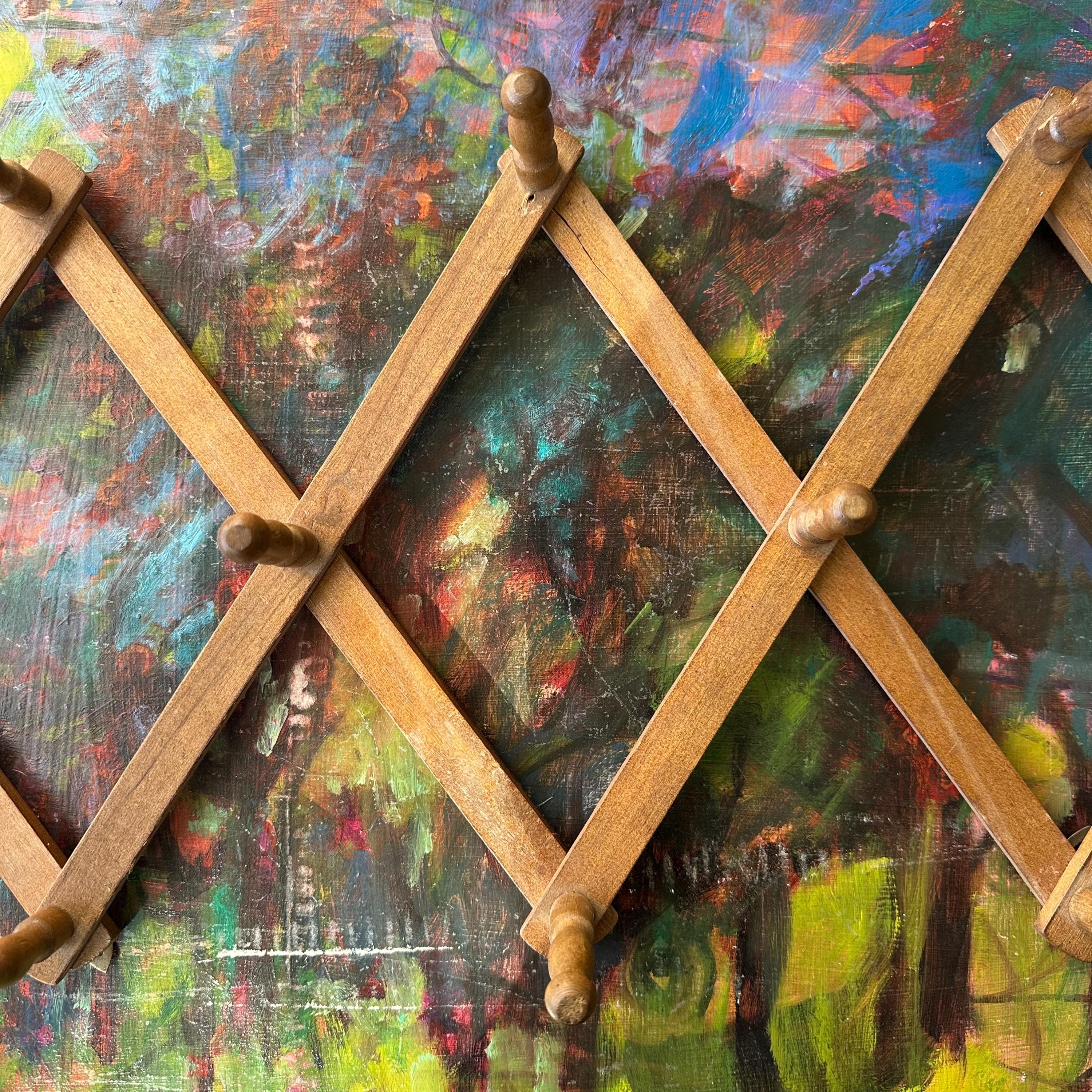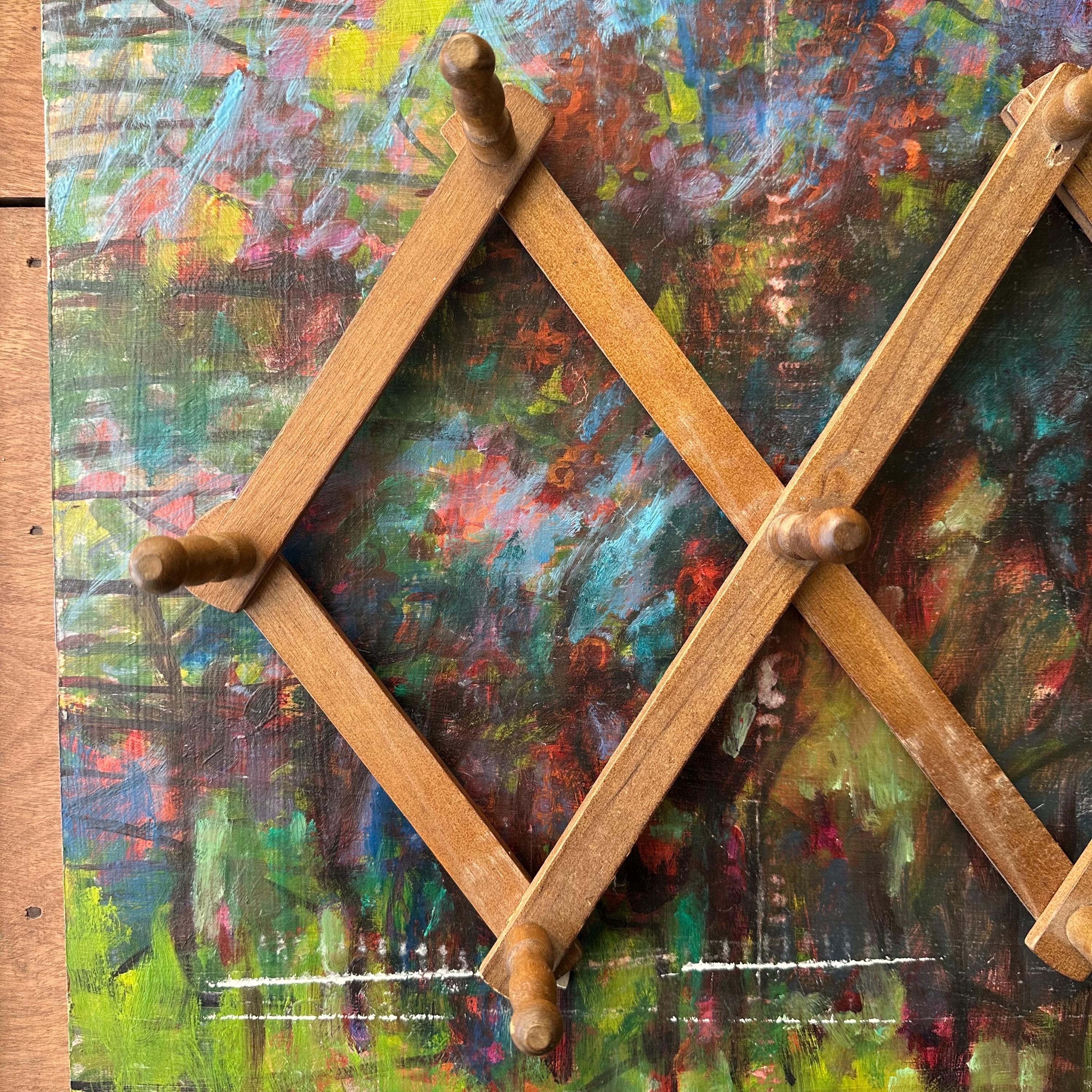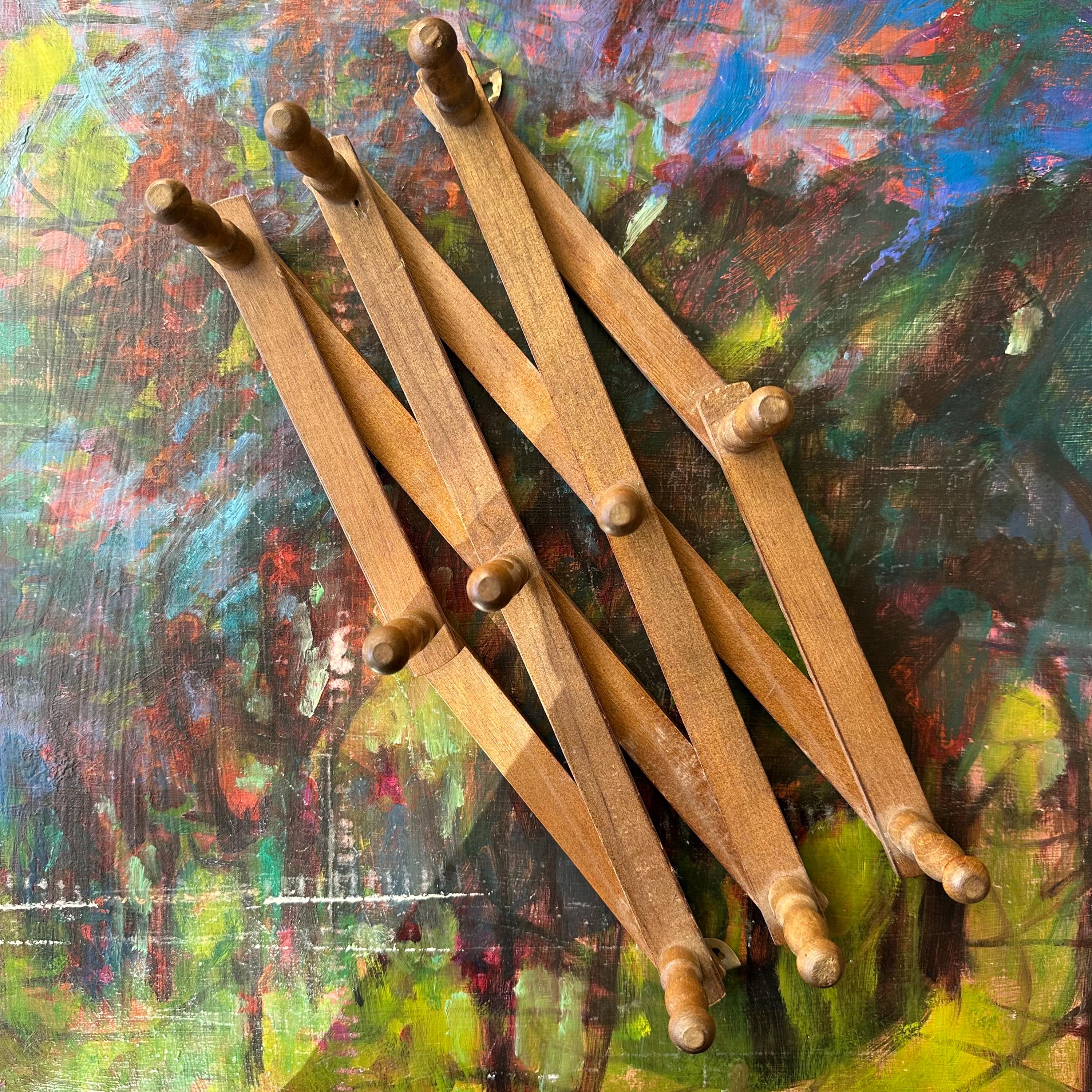 This is a vintage folding wood peg rack. It is stained a dark brown and expands like an accordion. It has 10 pegs and is attached to the wall with three brass loops, making it hangable either horizontally or vertically.