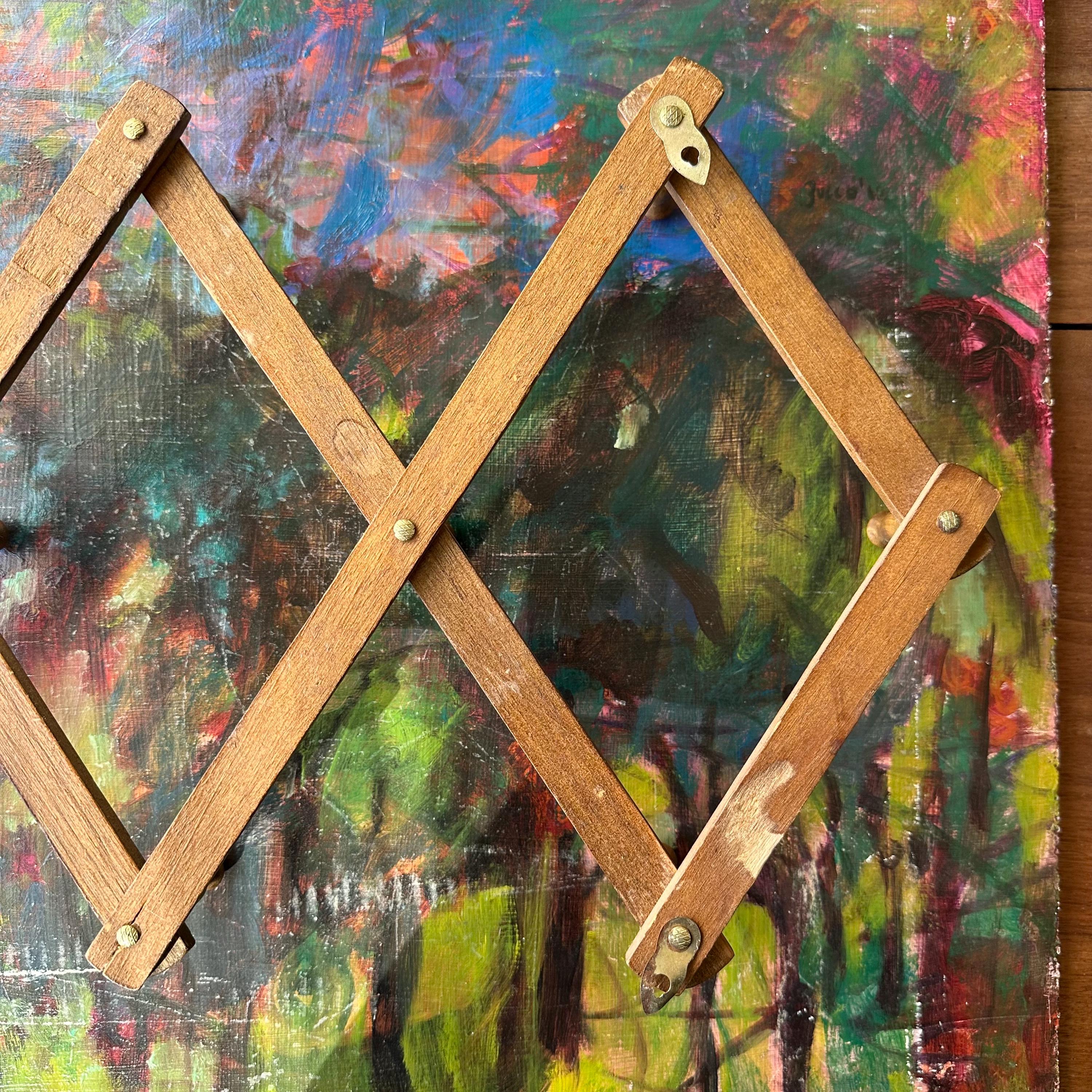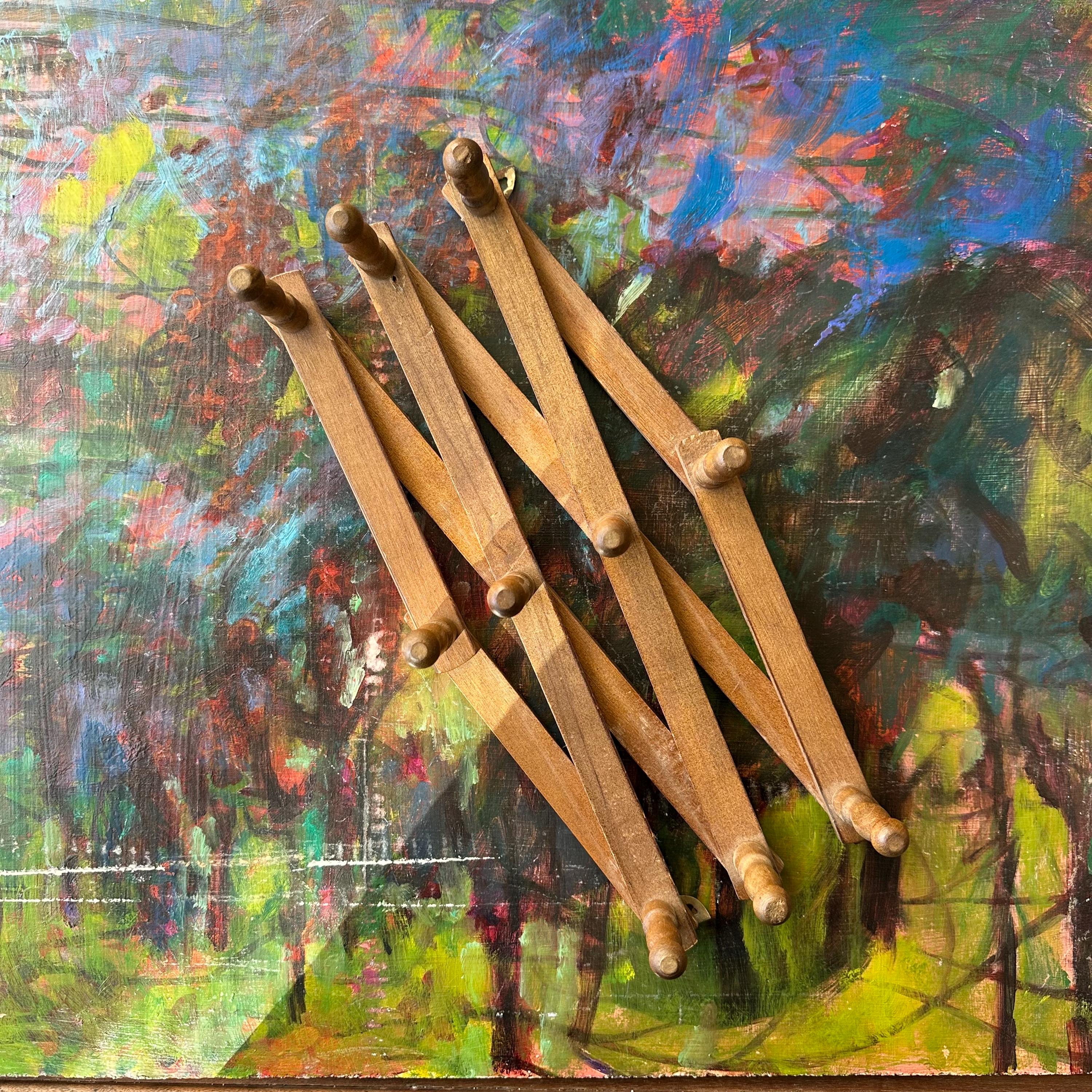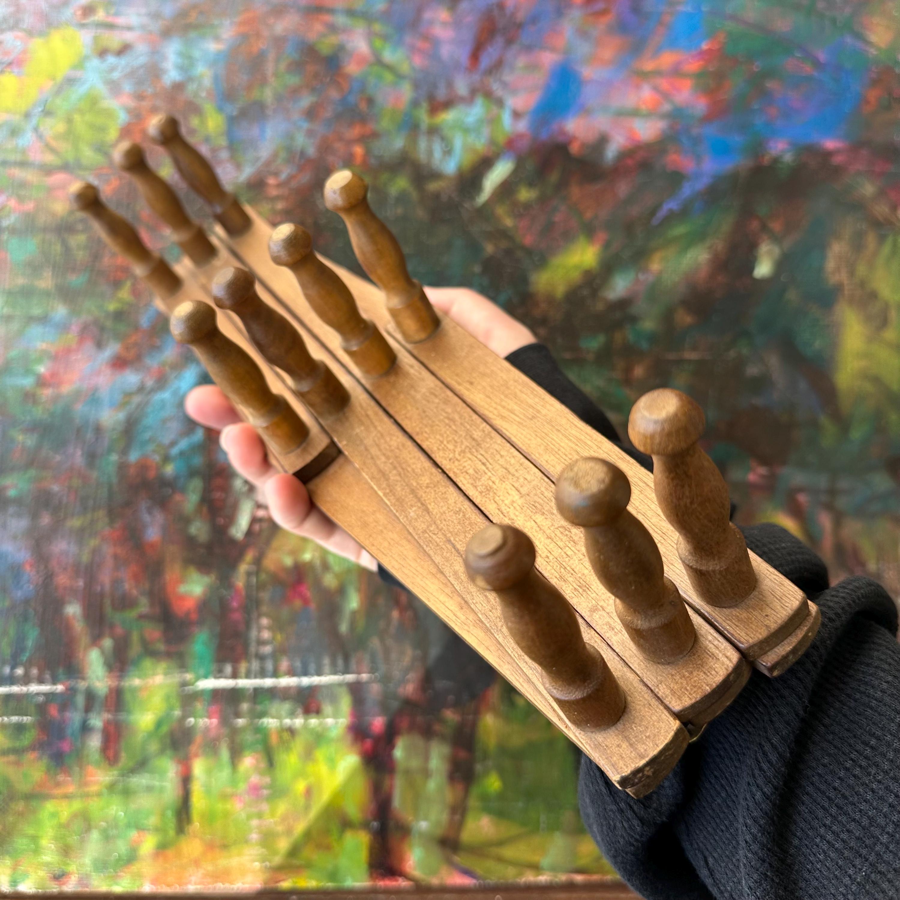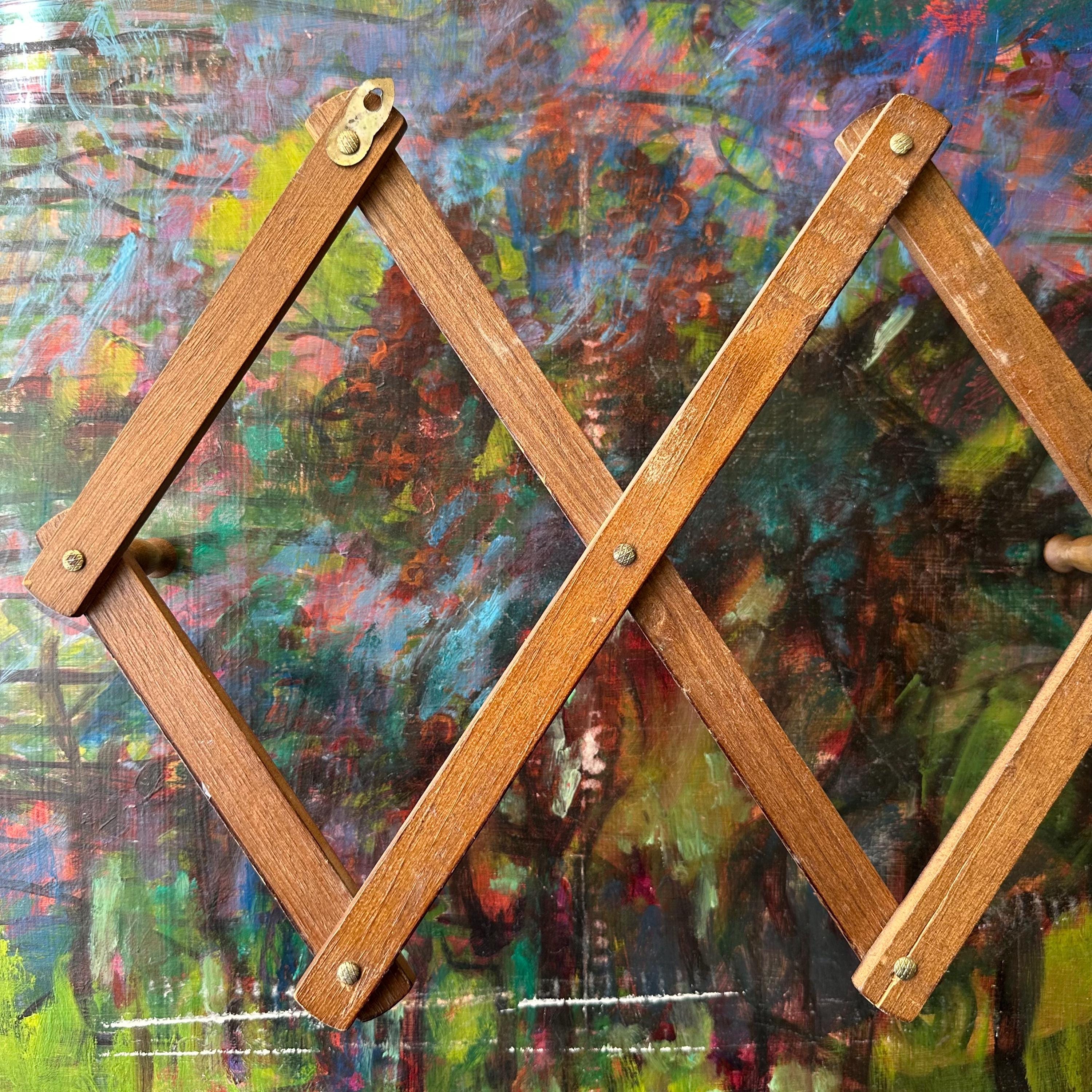 This is a vintage folding wood peg rack. It is stained a dark brown and expands like an accordion. It has 10 pegs and is attached to the wall with three brass loops, making it hangable either horizontally or vertically.