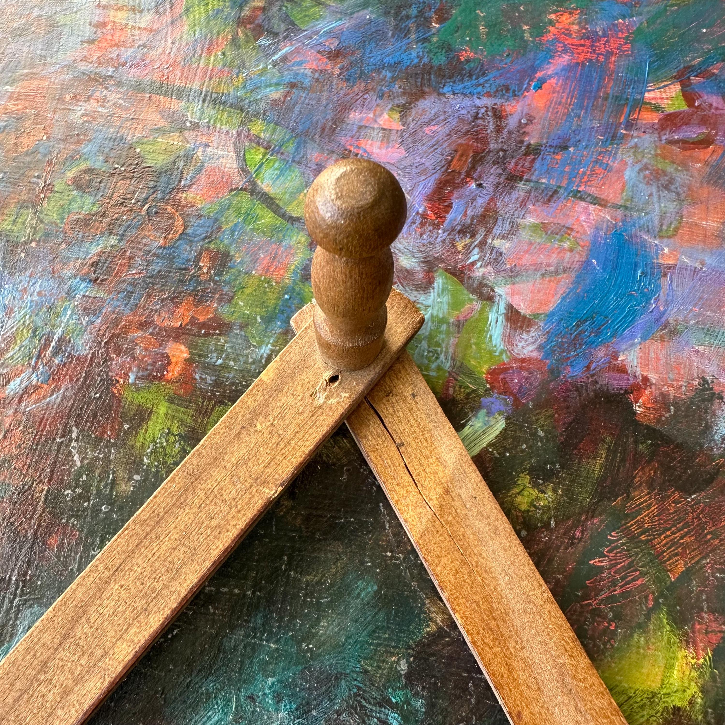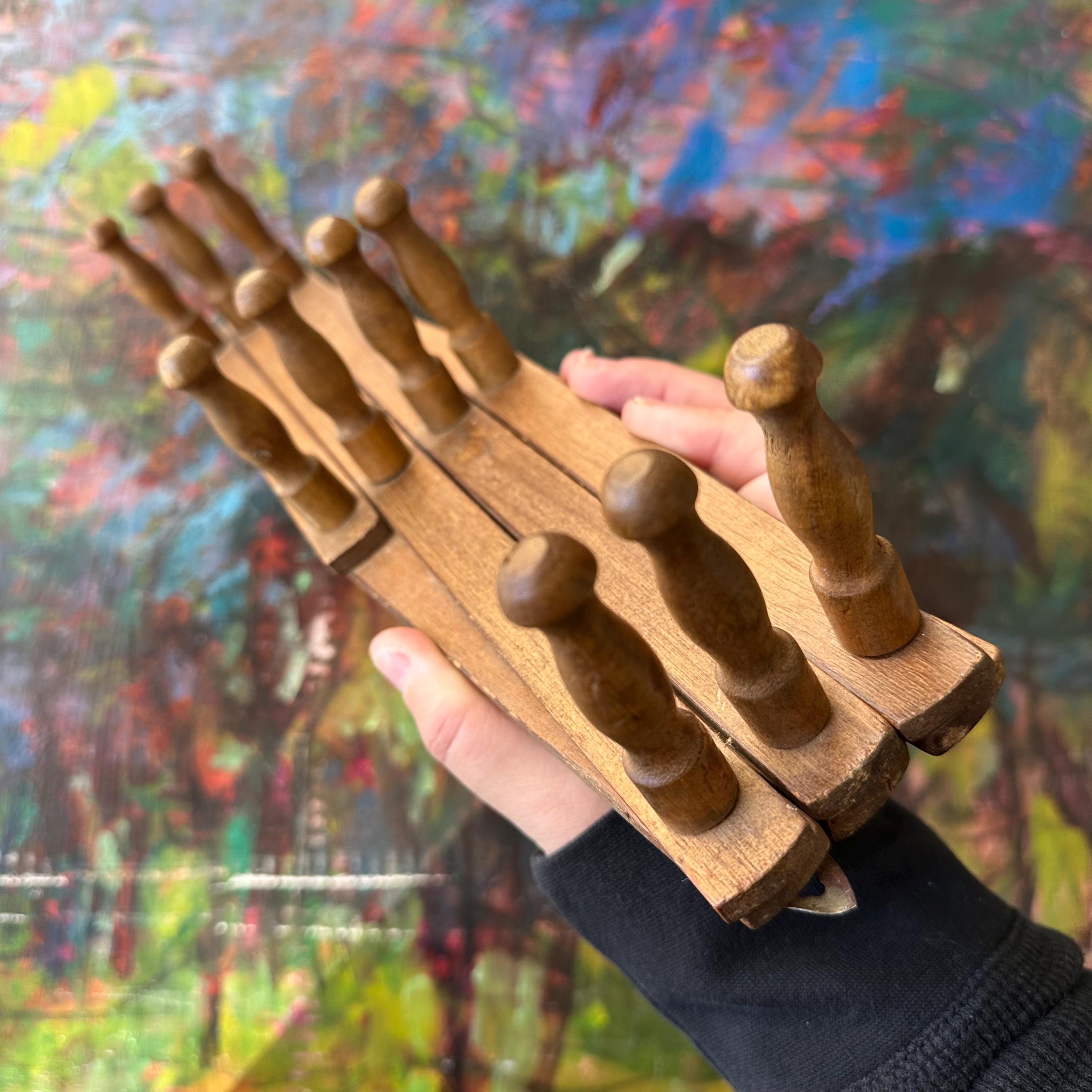 The rack is in good vintage condition for its age and use. It has some loose pegs. They're still attached; they just spin around where the others are tight. The middle v has a hole and middle crack where the screw meets the peg. Overall, it has general wear with some discoloration and scratches.