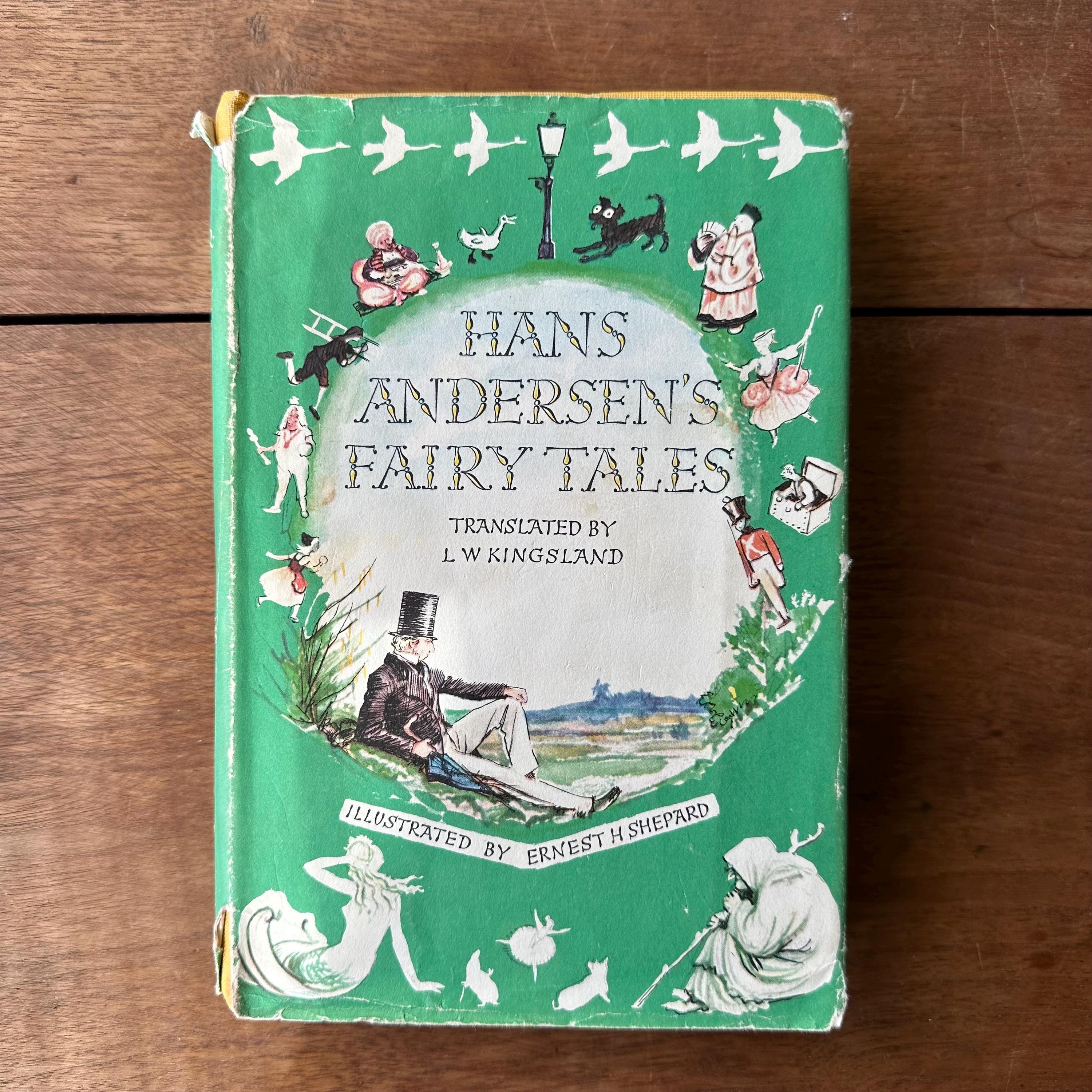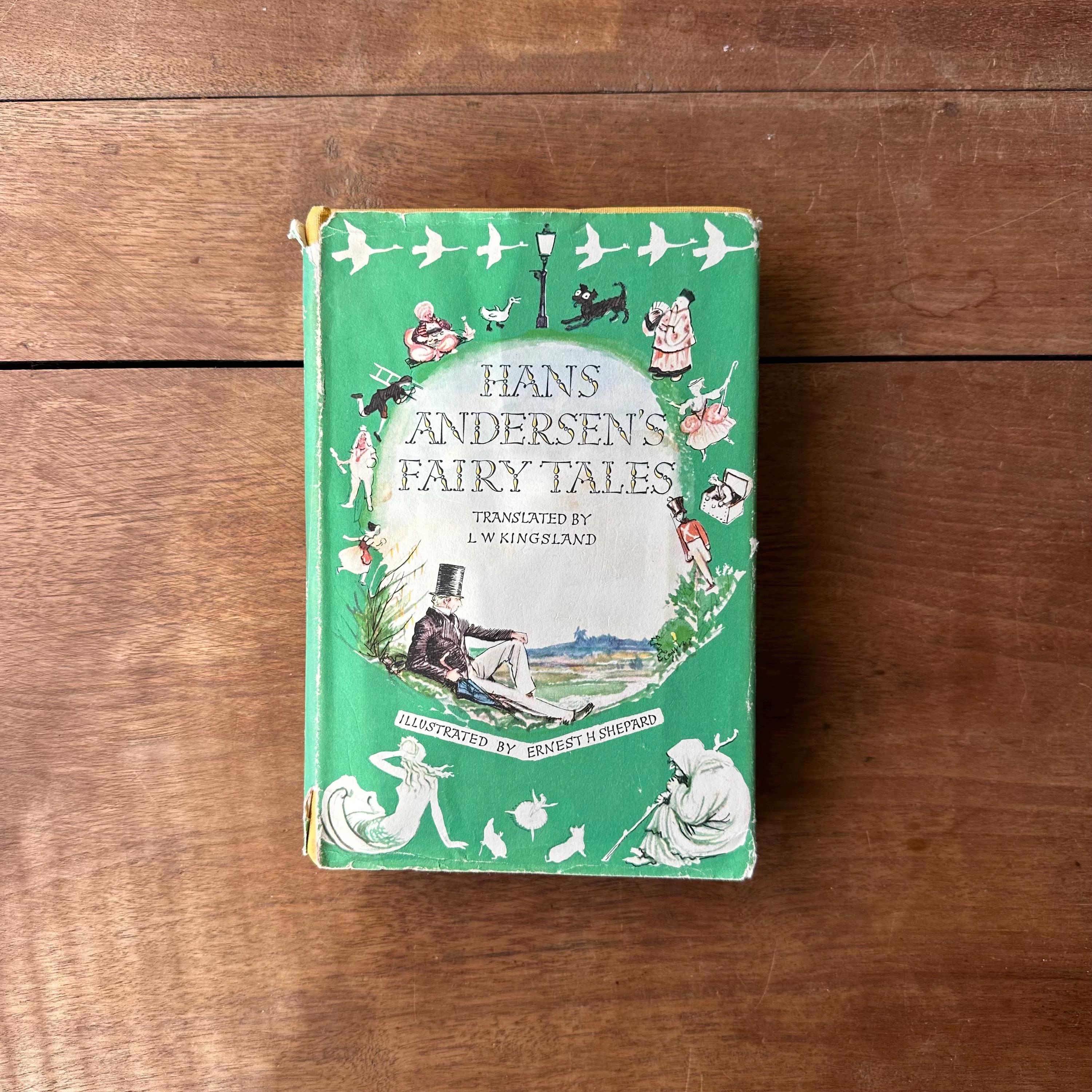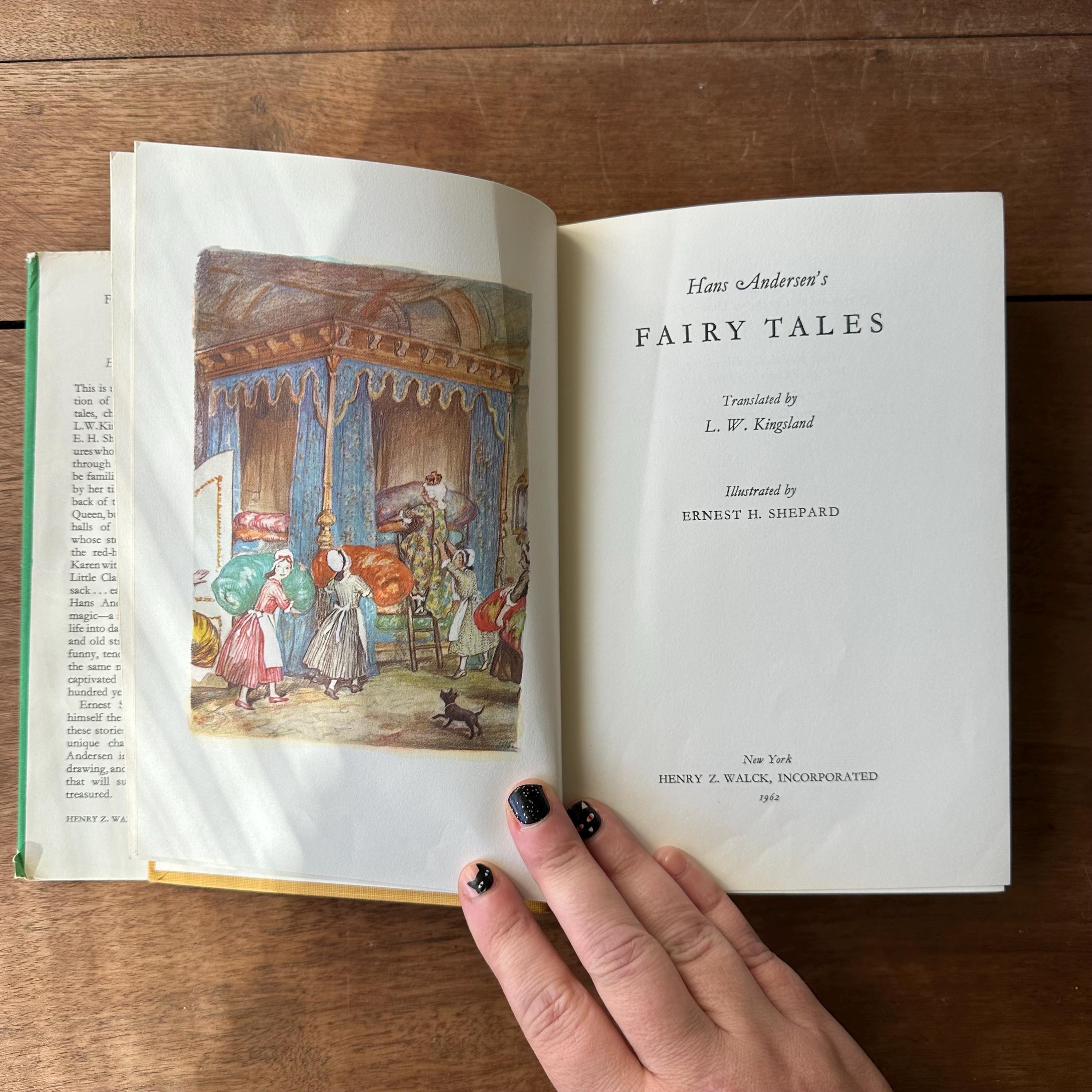 This is the 1962 first American edition of Hans Andersen's Fairy Tales, translated by L W Kingsland, illustrated by Ernest Shepard, and published by Henry Z. Walck, Incorporated. It has its original green illustrated dust jacket. Underneath, the book is mustard gold with black lettering on the spine. The book is fully illustrated with both black and white illustrations and full color illustration plates. Fairy tales include Hans Christian Andersen's most famous tales like The Little Mermaid.
