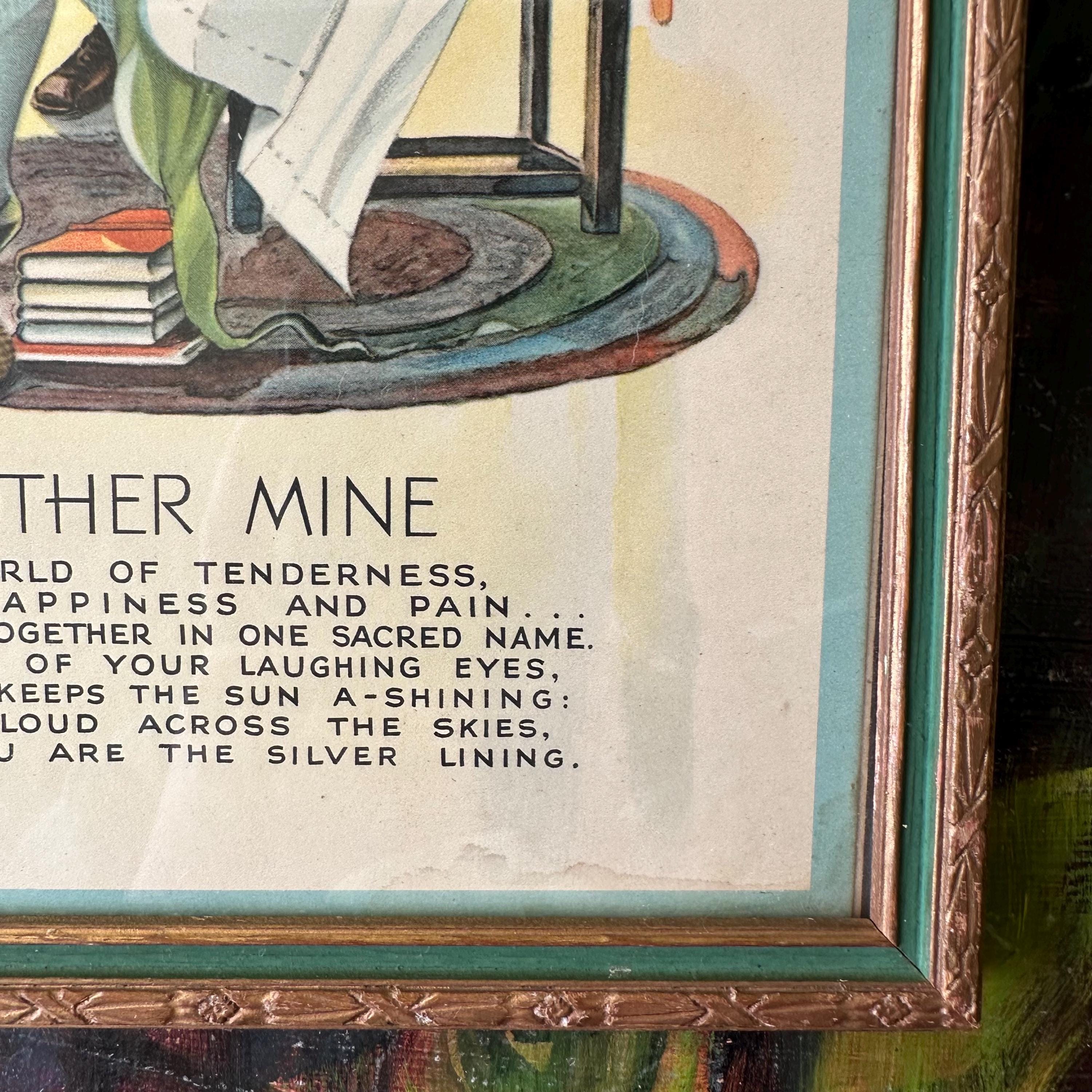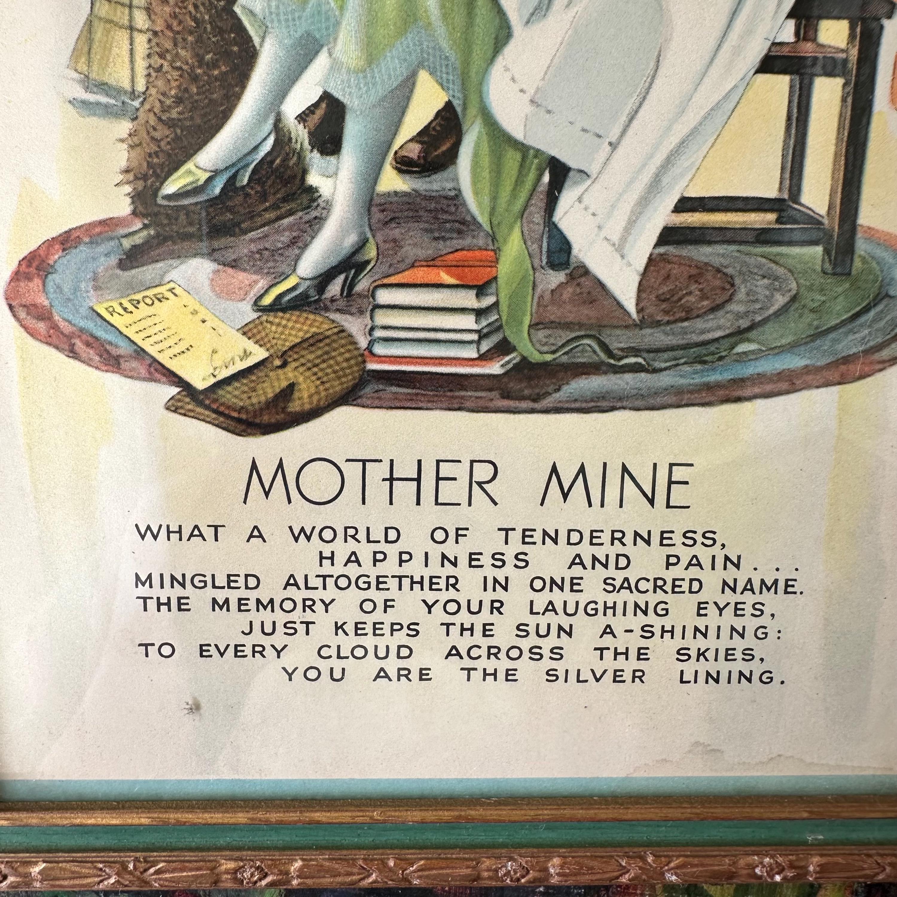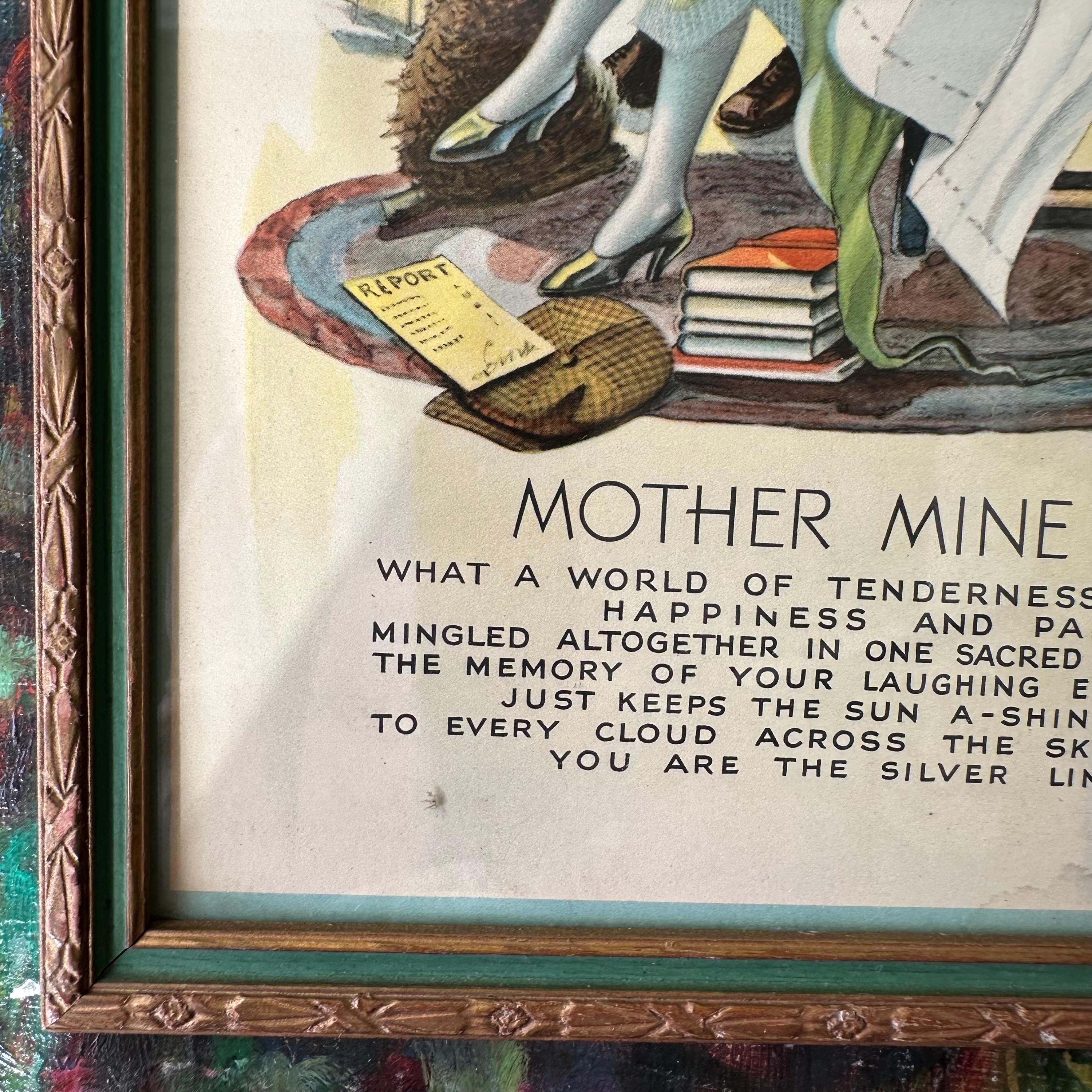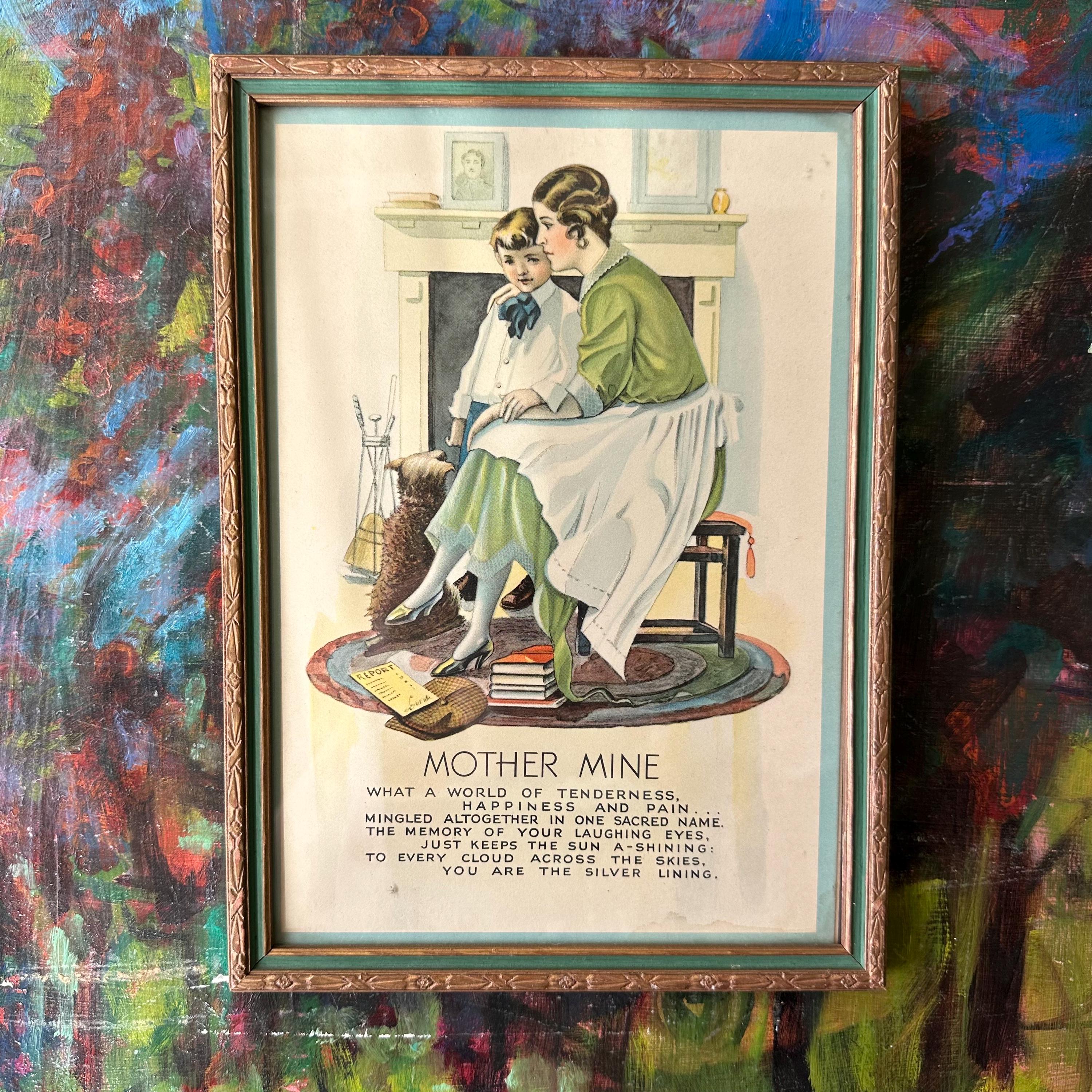 This is a 1930s era sentimental print title Mother Mine. It features a mom in a green dress with an apron standing with her little boy in white shirt and blue pants. They are sitting in front of a fireplace with a small curly-haired dog and school books. There is a sweet poem written underneath comparing mom to silver linings. It is framed in a wood frame with a green inner border. The wood is etched with flower and geometric detailing. There is picture wire for hanging on the back.