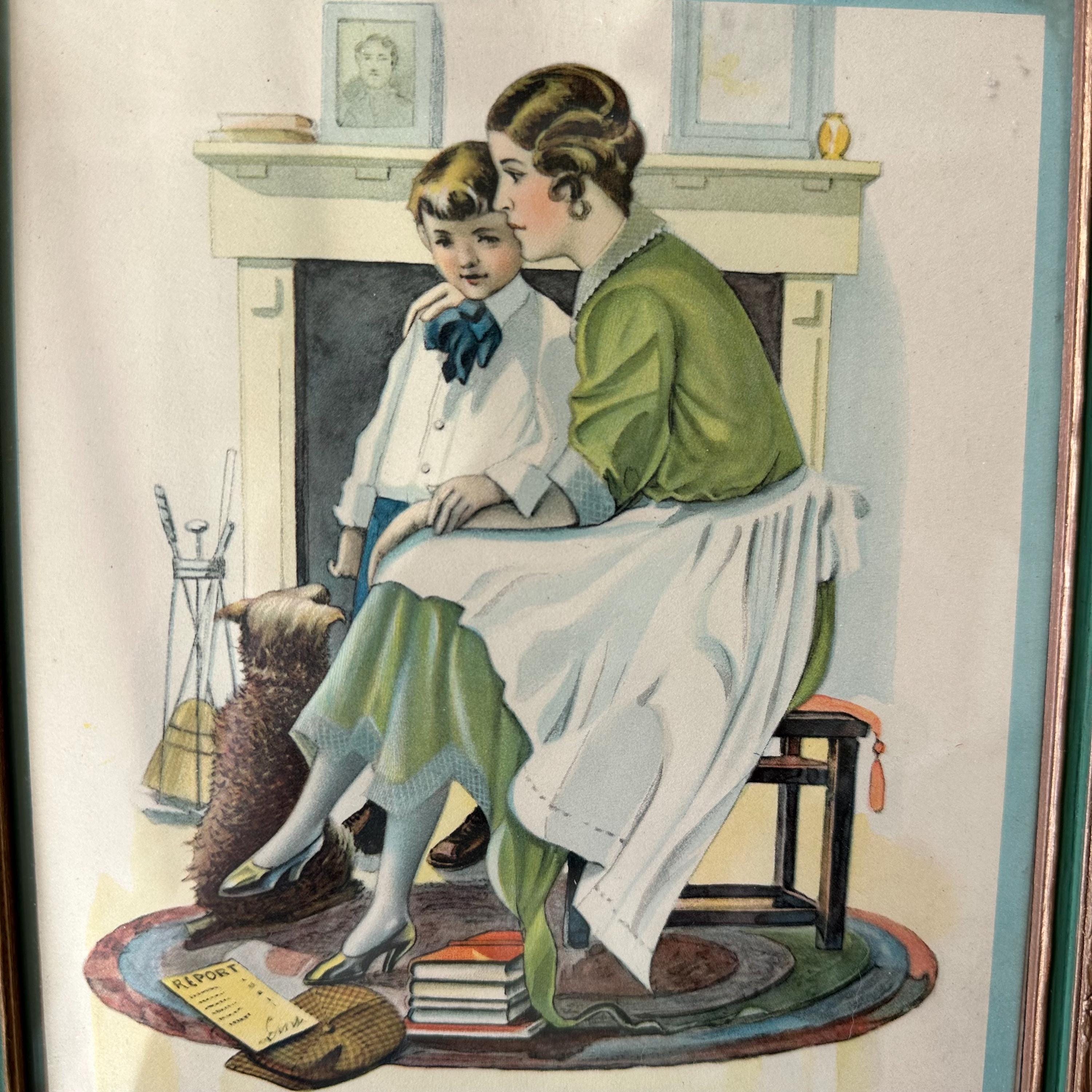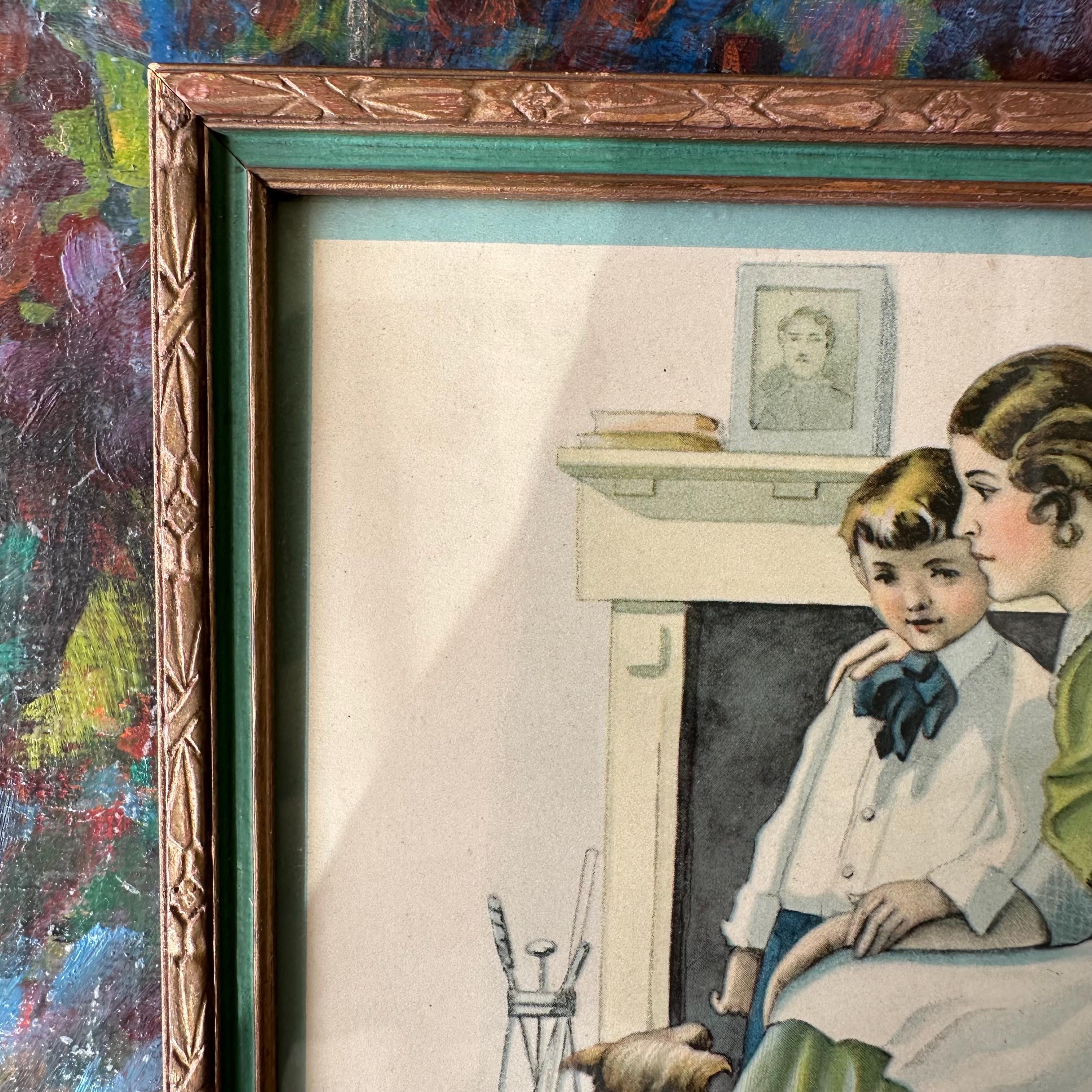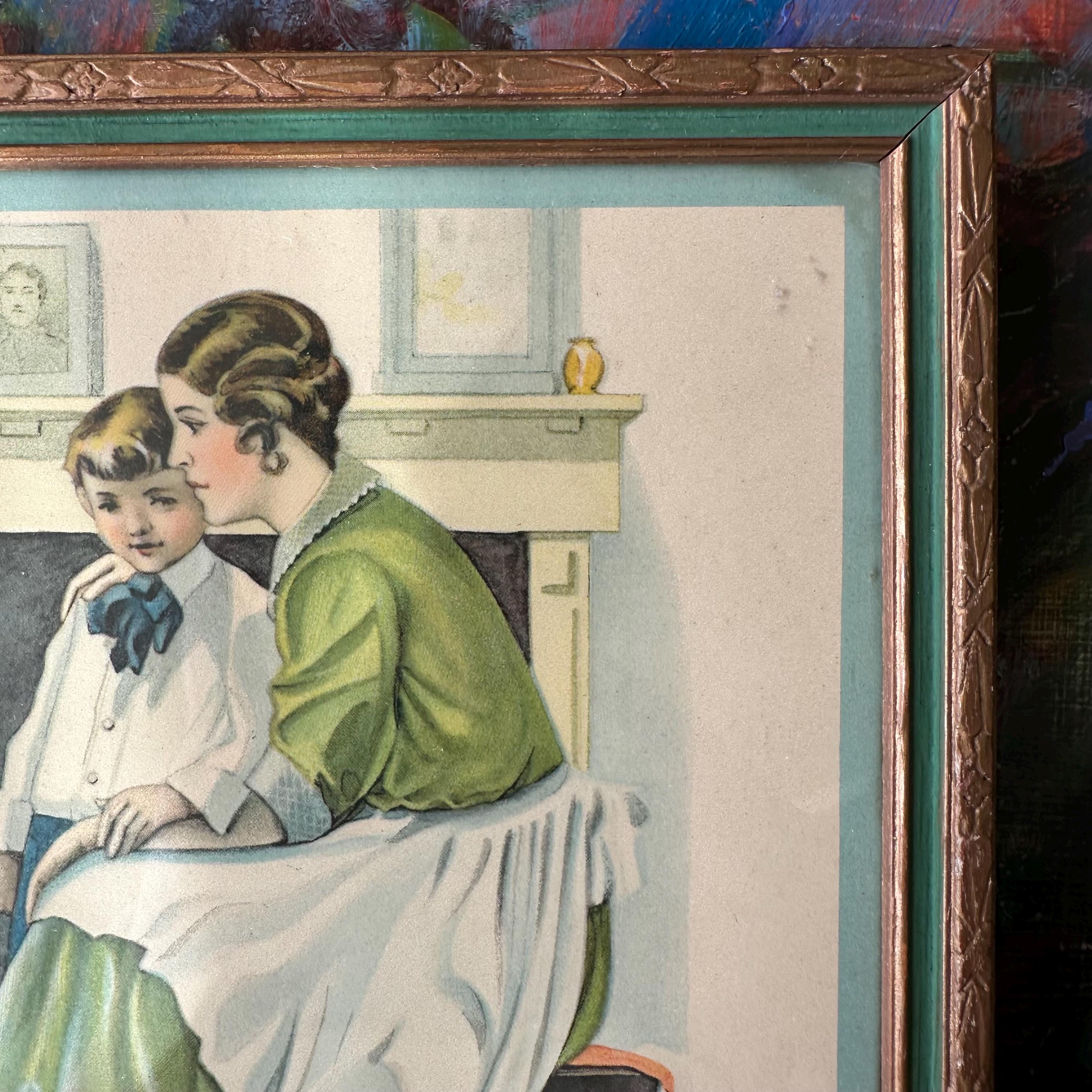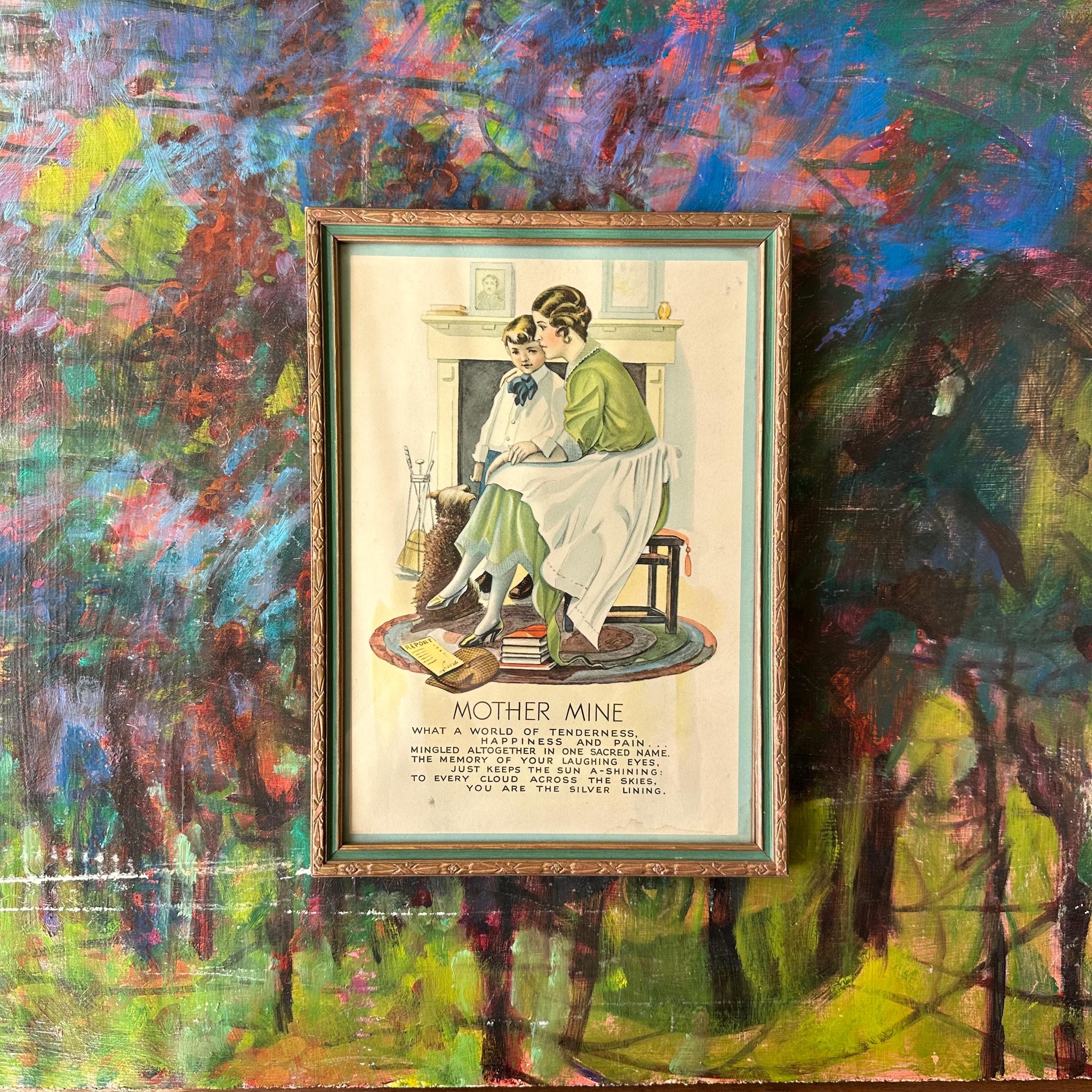 This is a 1930s era sentimental print title Mother Mine. It features a mom in a green dress with an apron standing with her little boy in white shirt and blue pants. They are sitting in front of a fireplace with a small curly-haired dog and school books. There is a sweet poem written underneath comparing mom to silver linings. It is framed in a wood frame with a green inner border. The wood is etched with flower and geometric detailing. There is picture wire for hanging on the back.