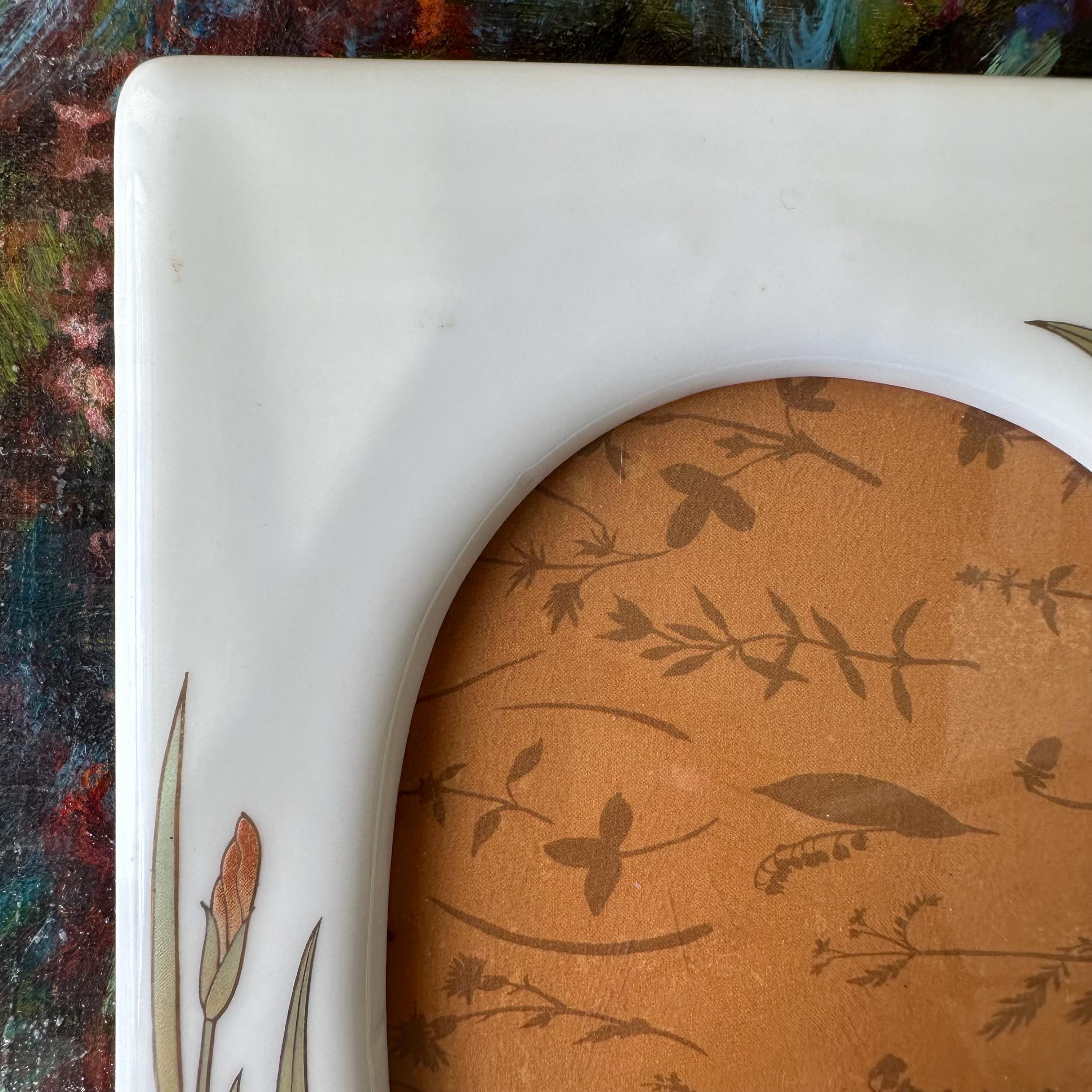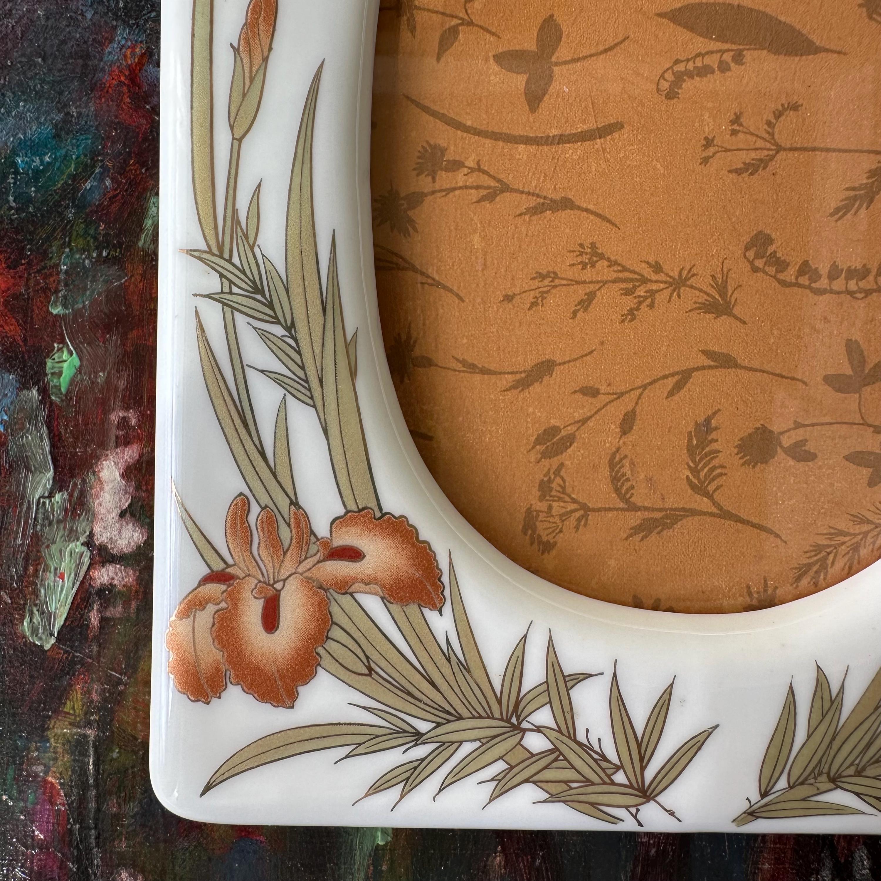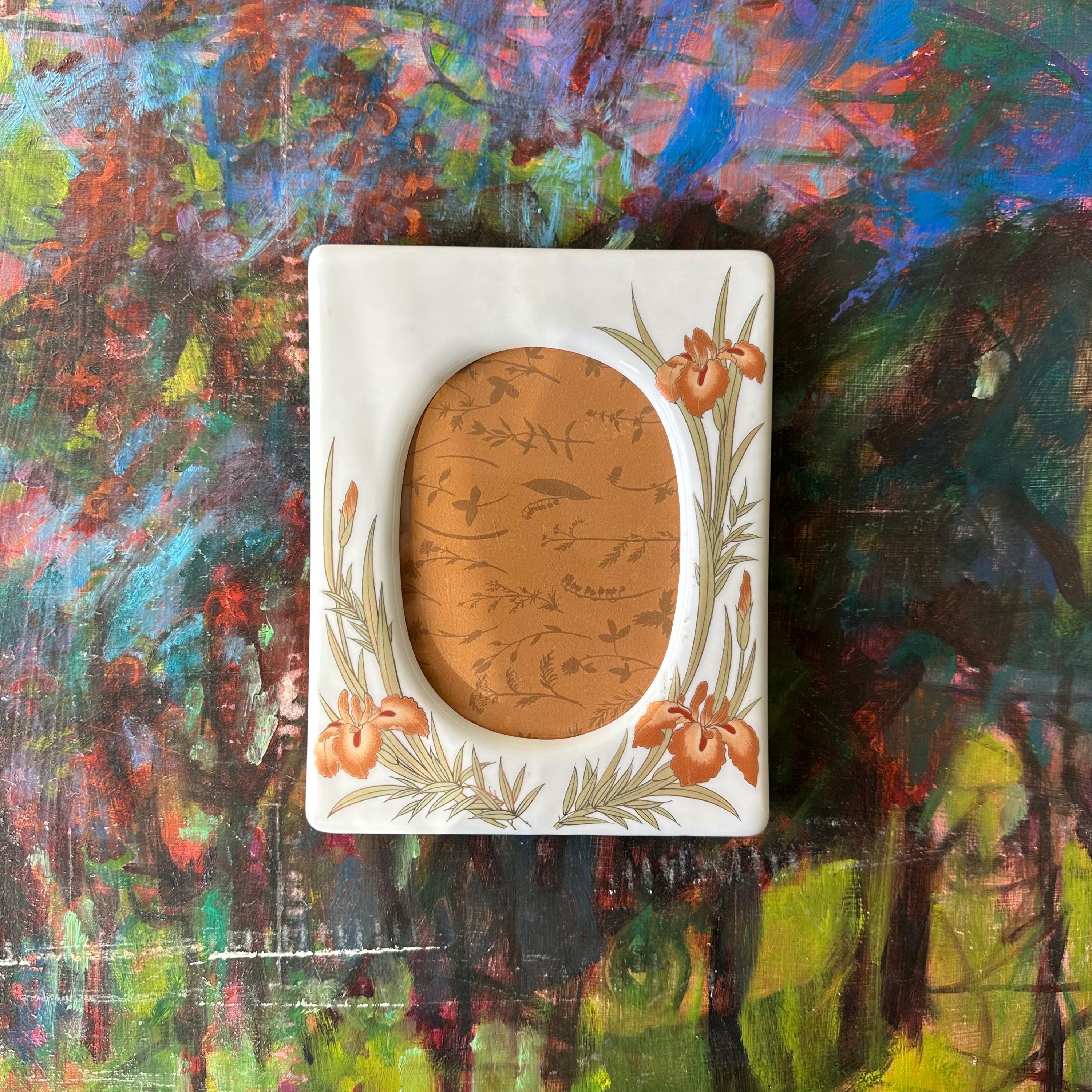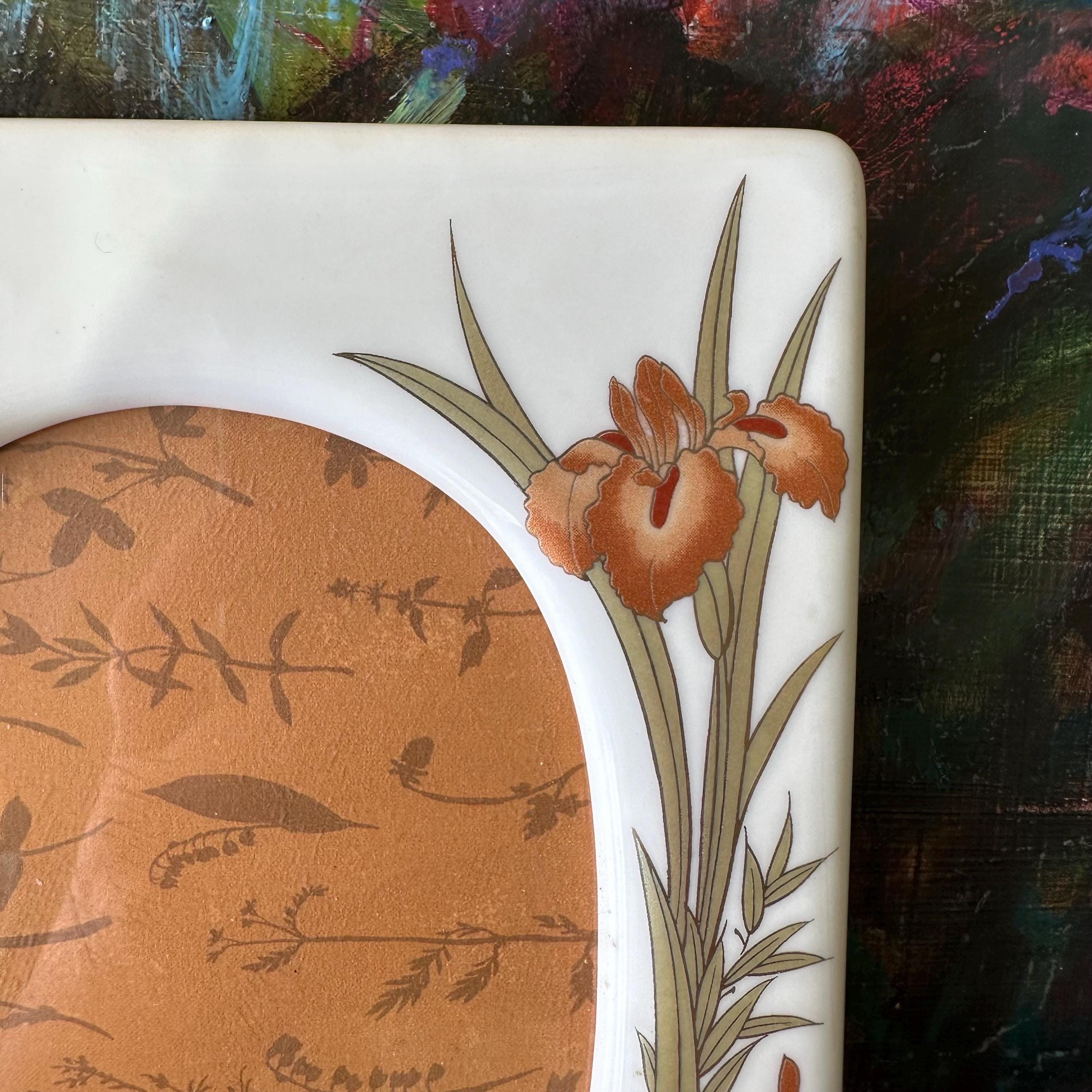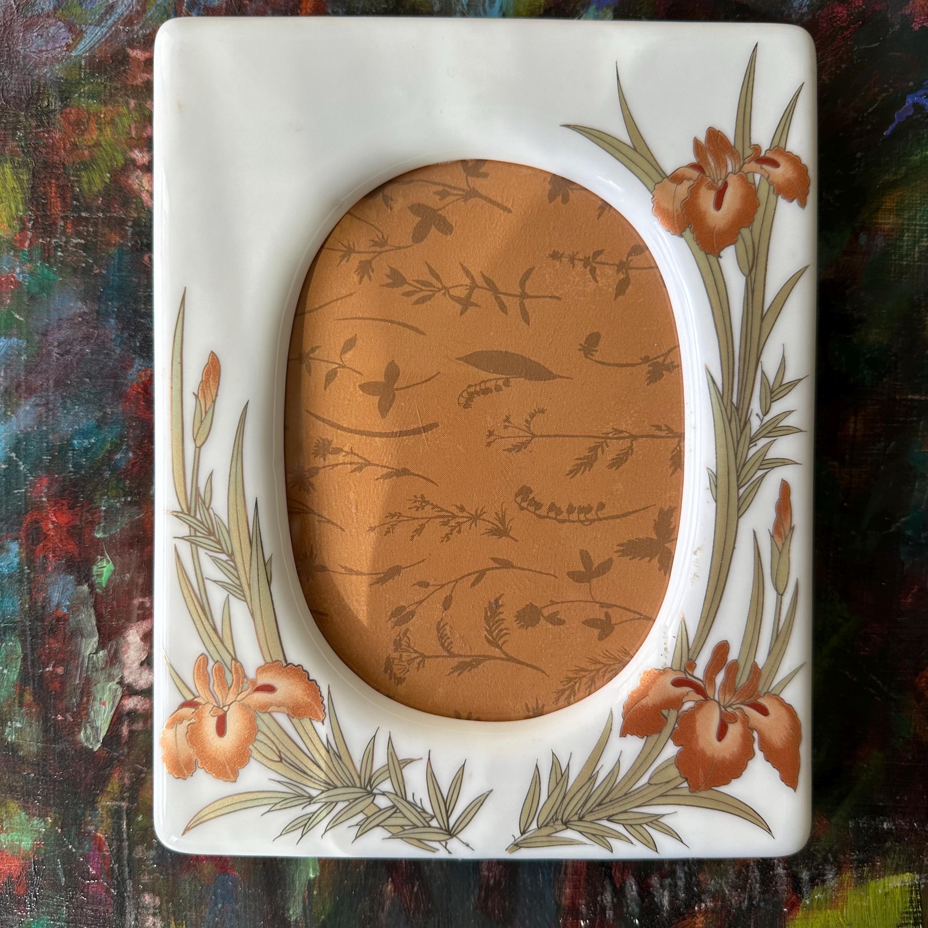 This is a vintage white ceramic picture frame with an oval opening. The frame is white ceramic with orange irises. The irises and their light green leaves are outlined in gold. The frame has a plastic back with both nail holes to hang the frame horizontally and vertically as well as a stand. The back is marked Japan.