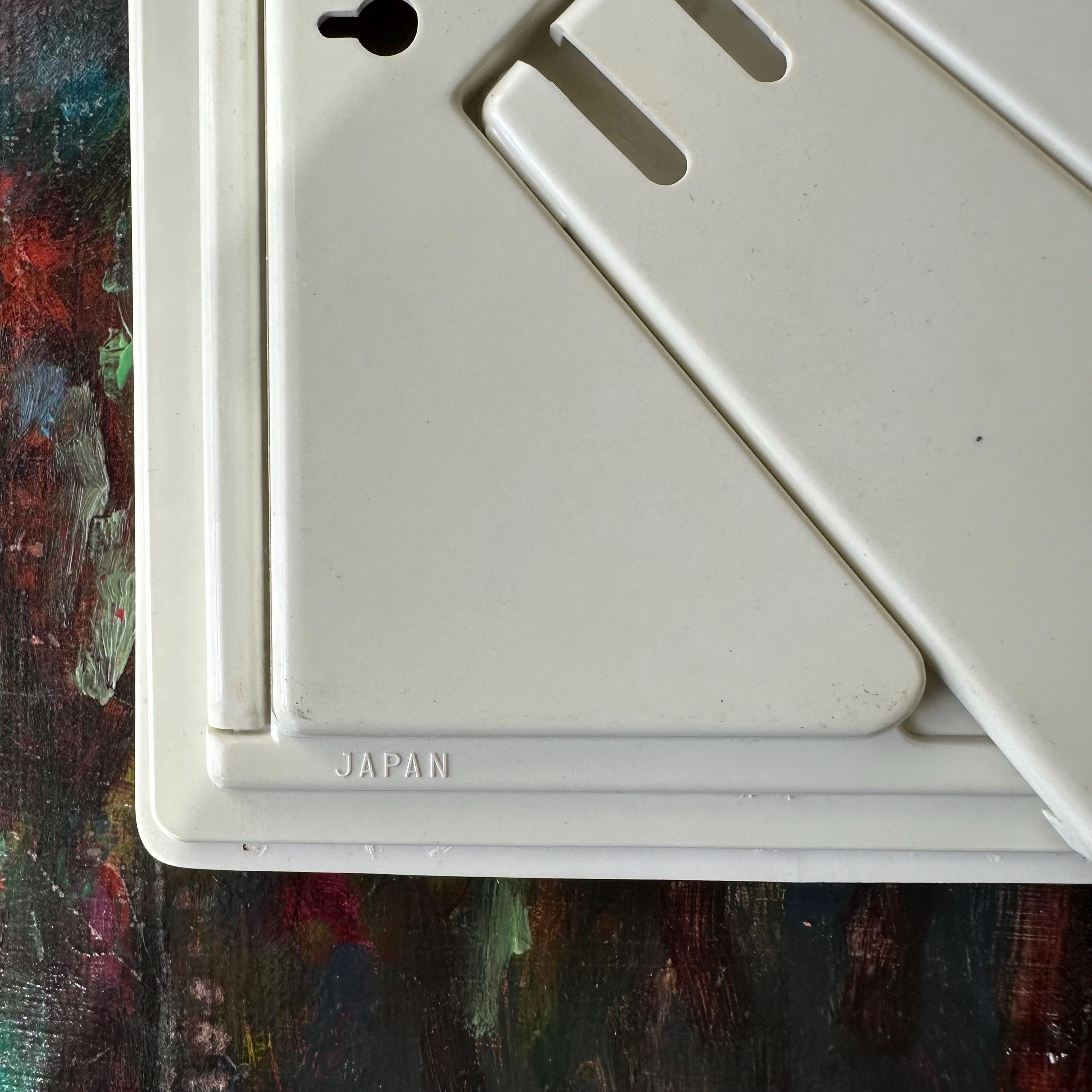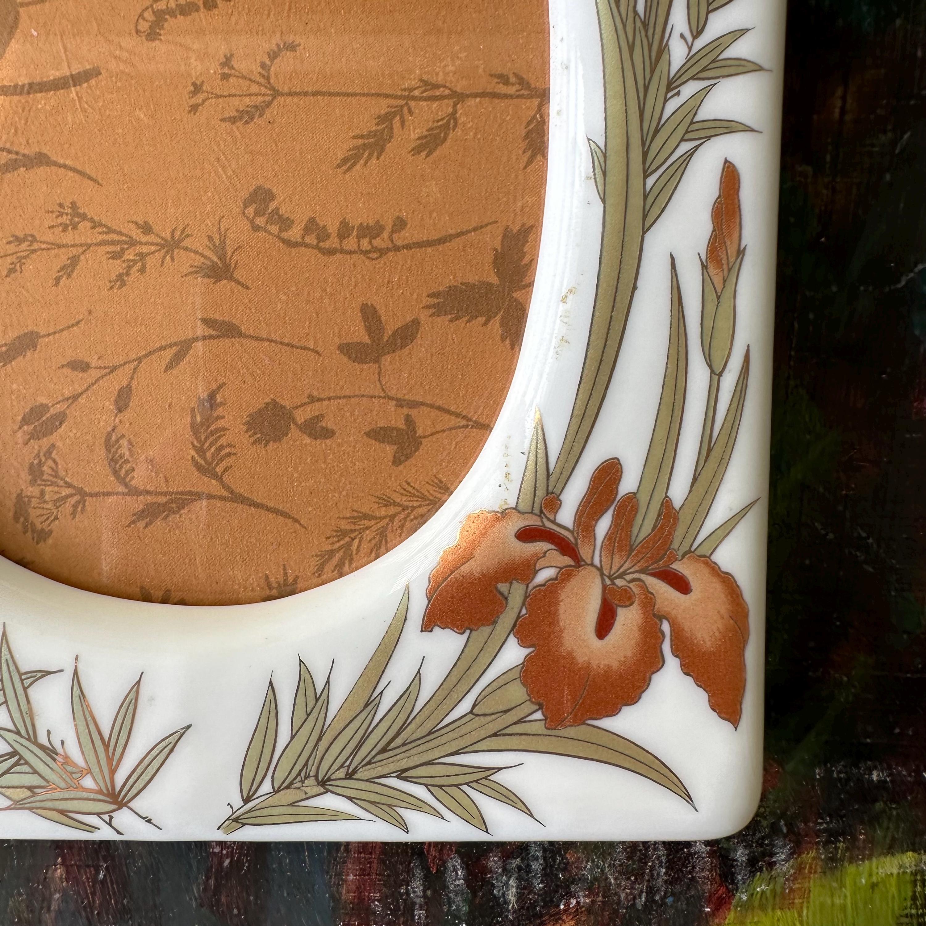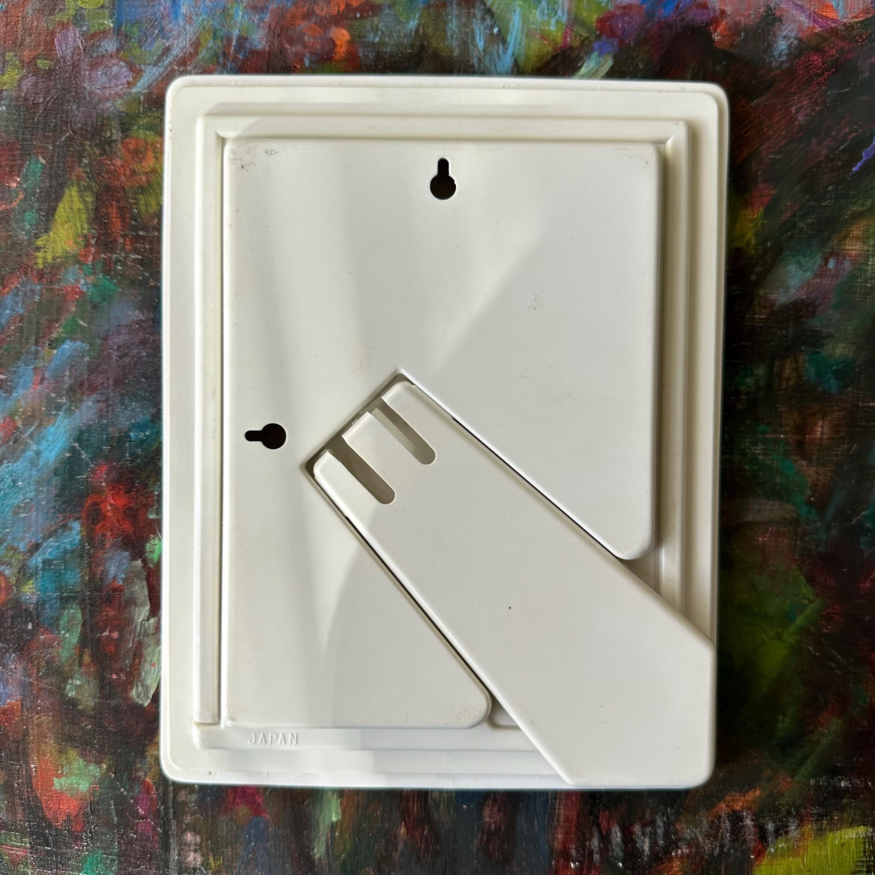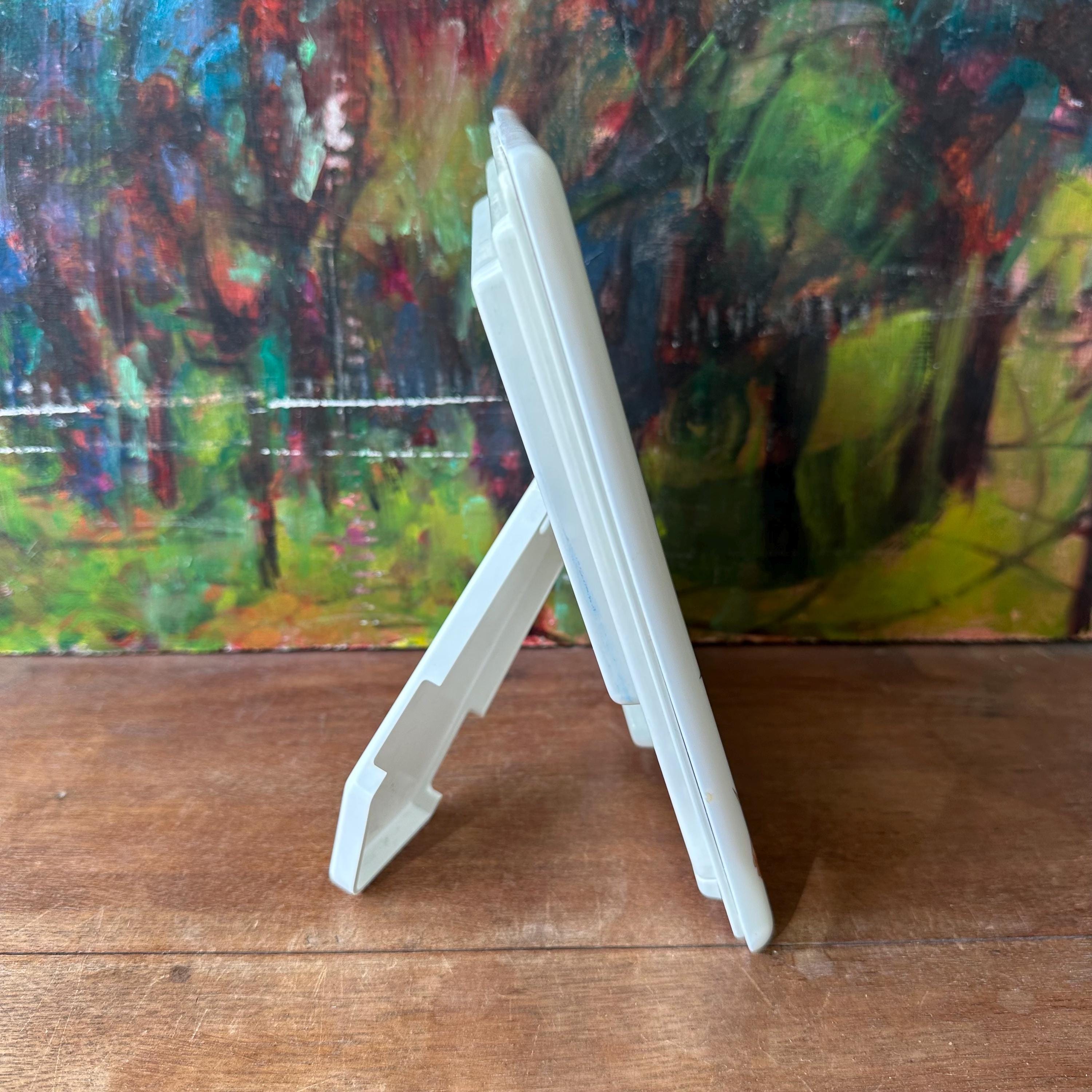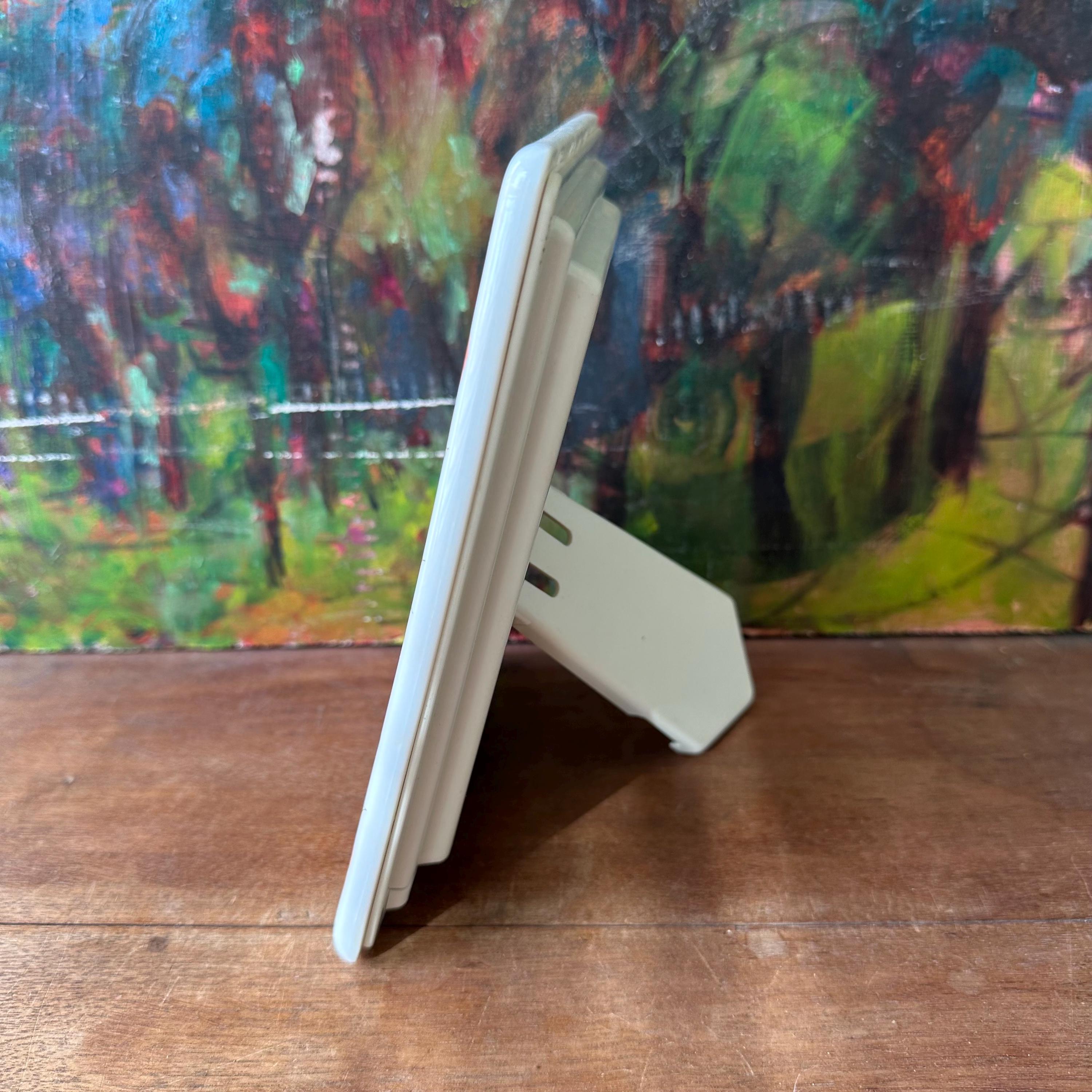 The frame is great vintage condition for its age and use. It has two small areas of discoloration to the bottom right portion of the oval opening. The ceramic is bright with no chips or cracks. The irises and gold detailing are bright and intact. The plastic frame covering has some scratches. The back slides on and off. The stand opens and closes easily.