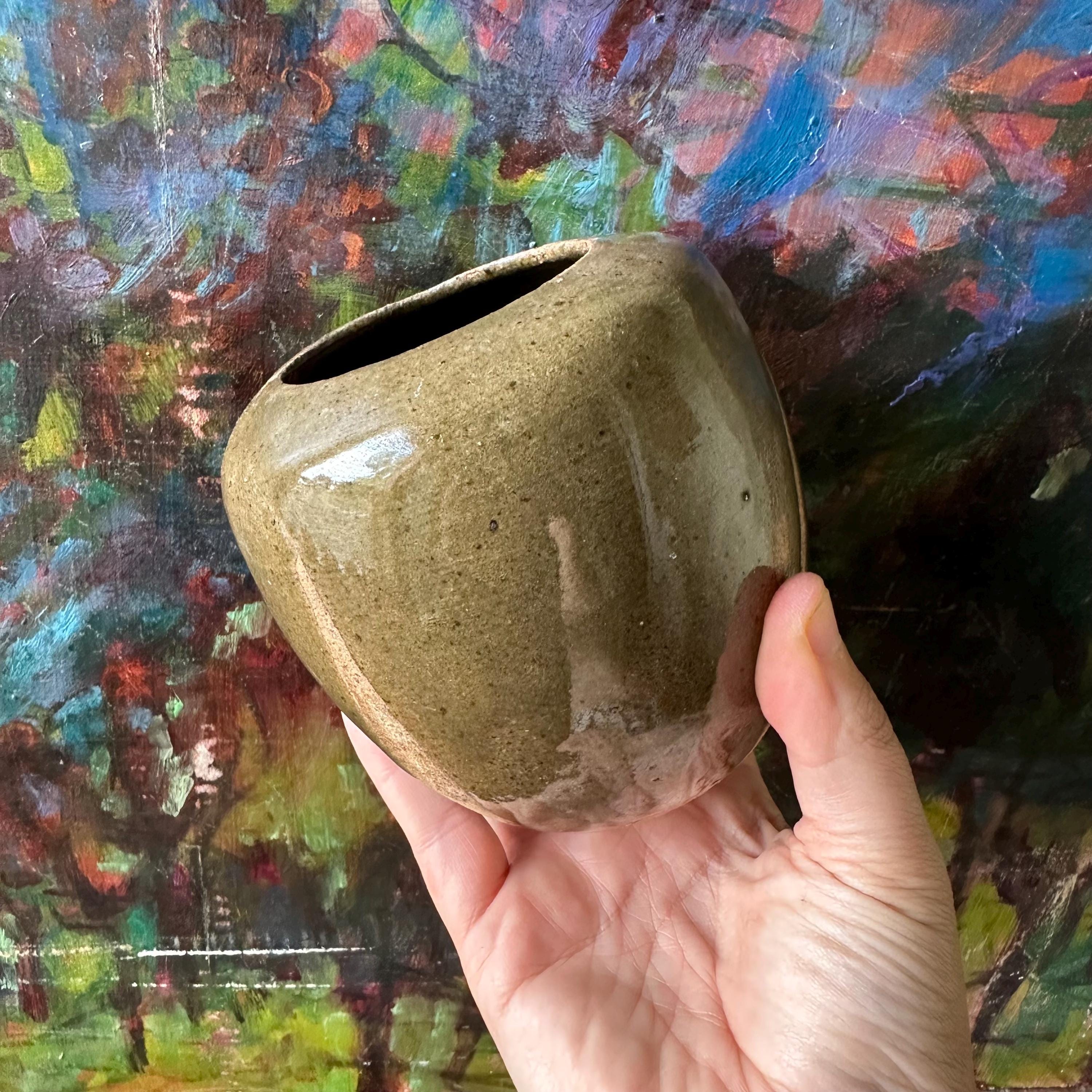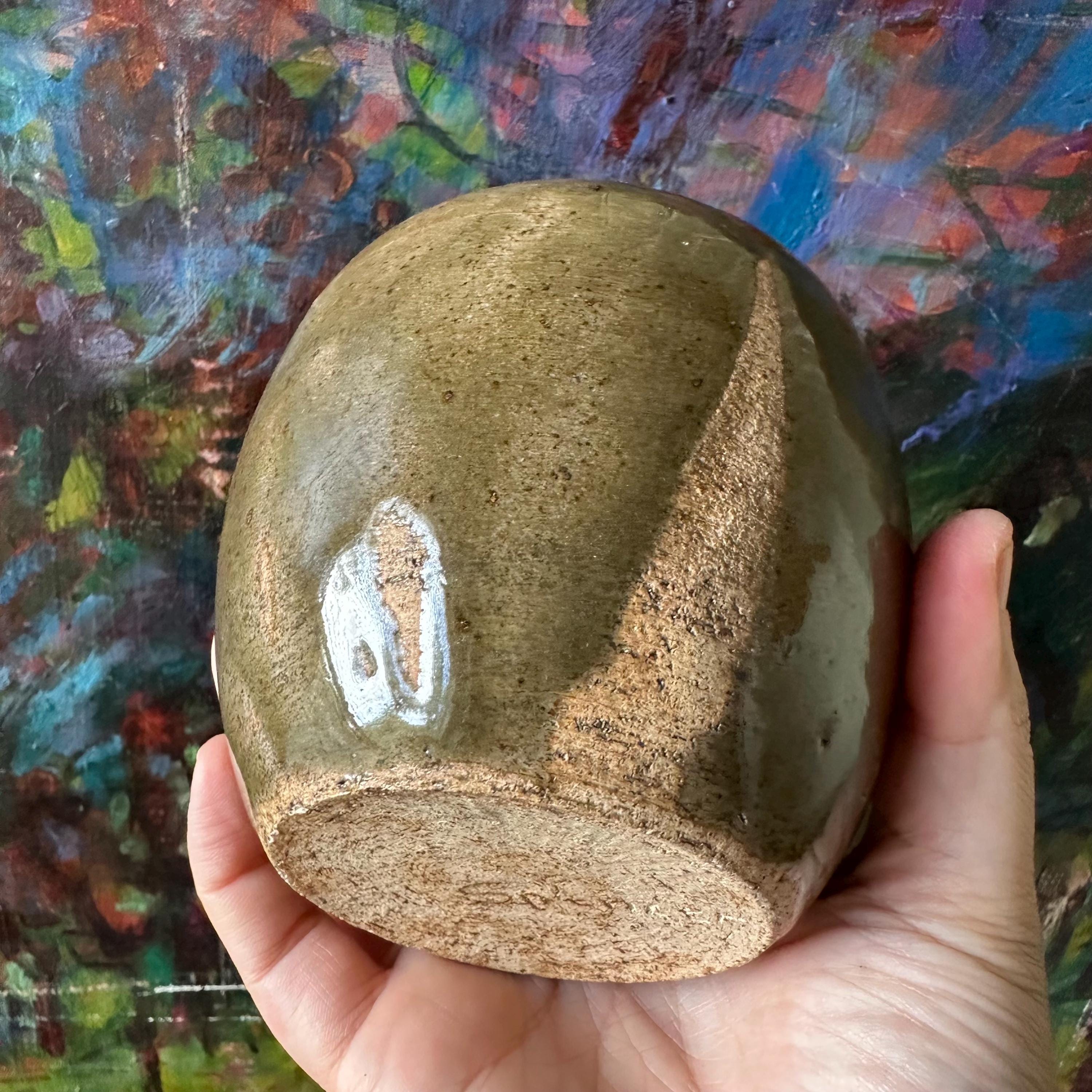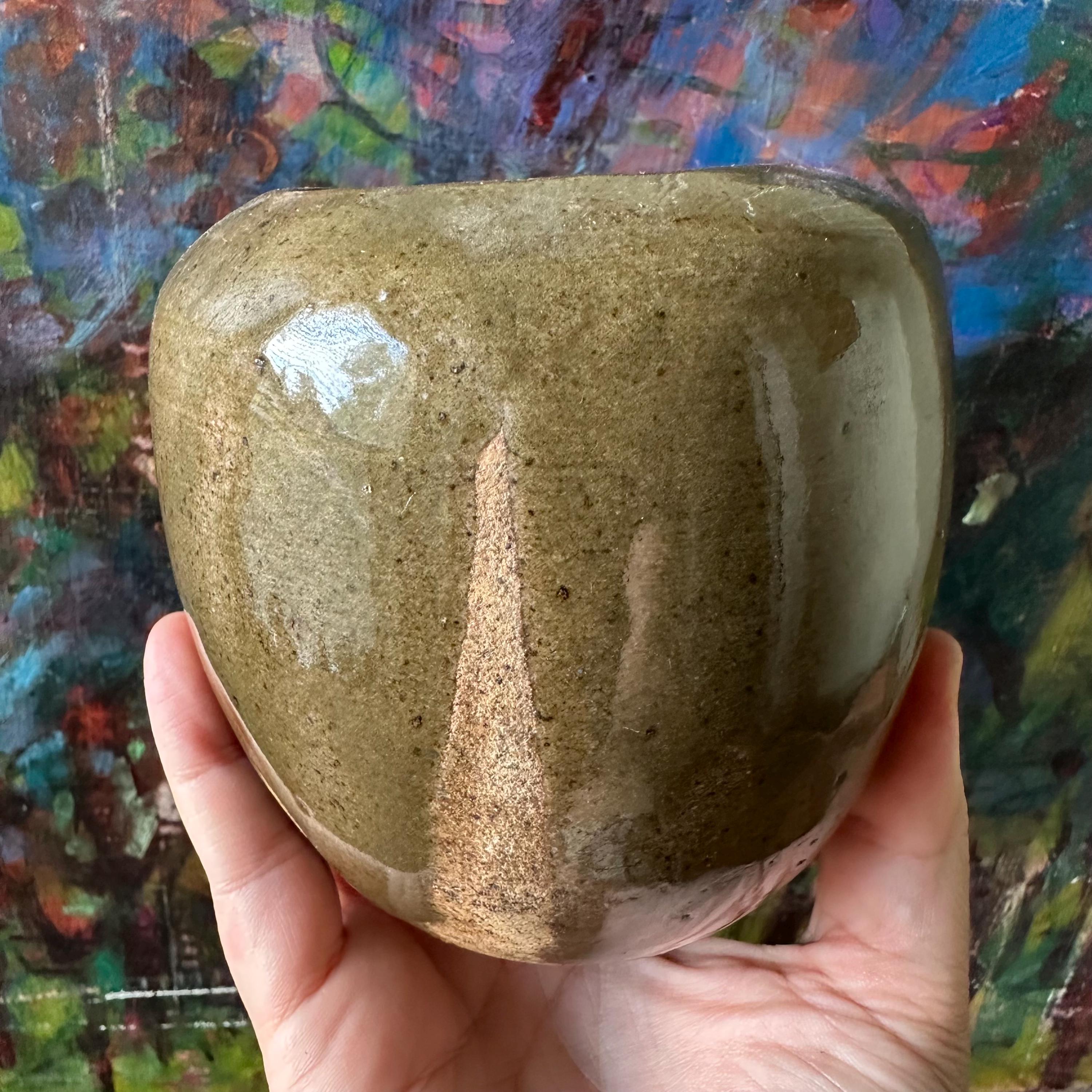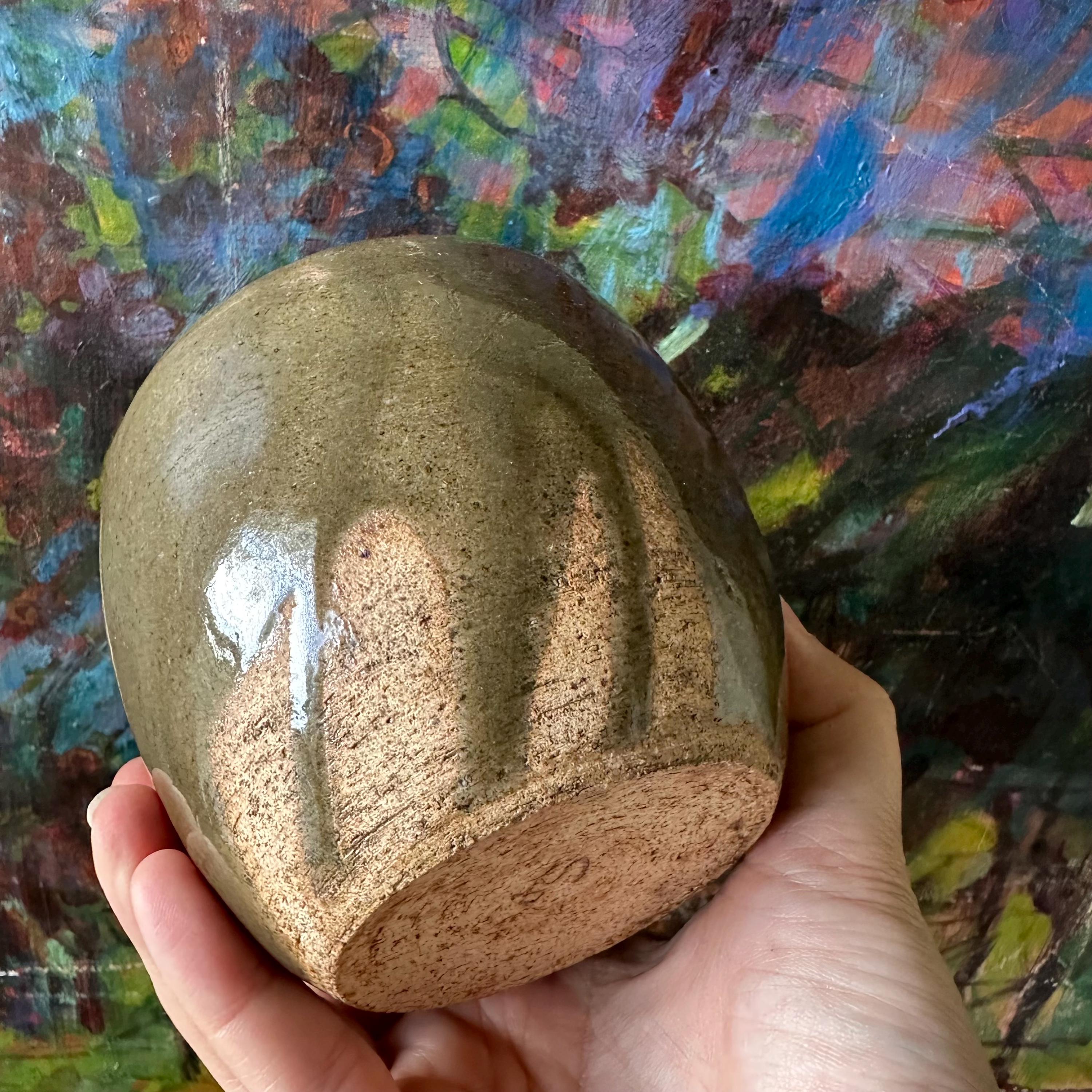 This is a small olive shaped stoneware vase with a green drip glaze. The vase is a minimalist olive shape signed Sper on the bottom. The base is beige stoneware with a lovely olive green shiny drip glaze that covers most of the vase but leaves the stoneware exposed along the bottom edge.