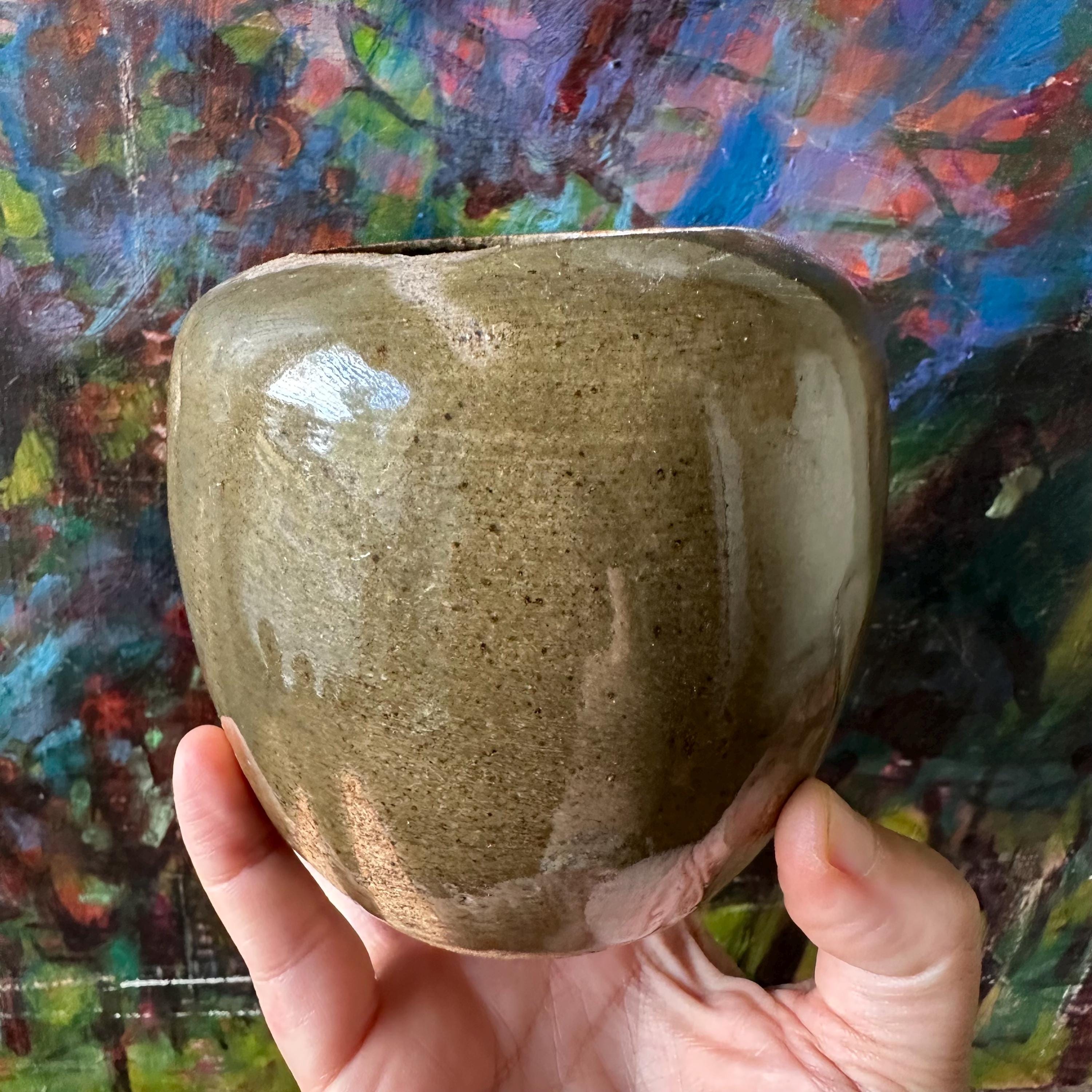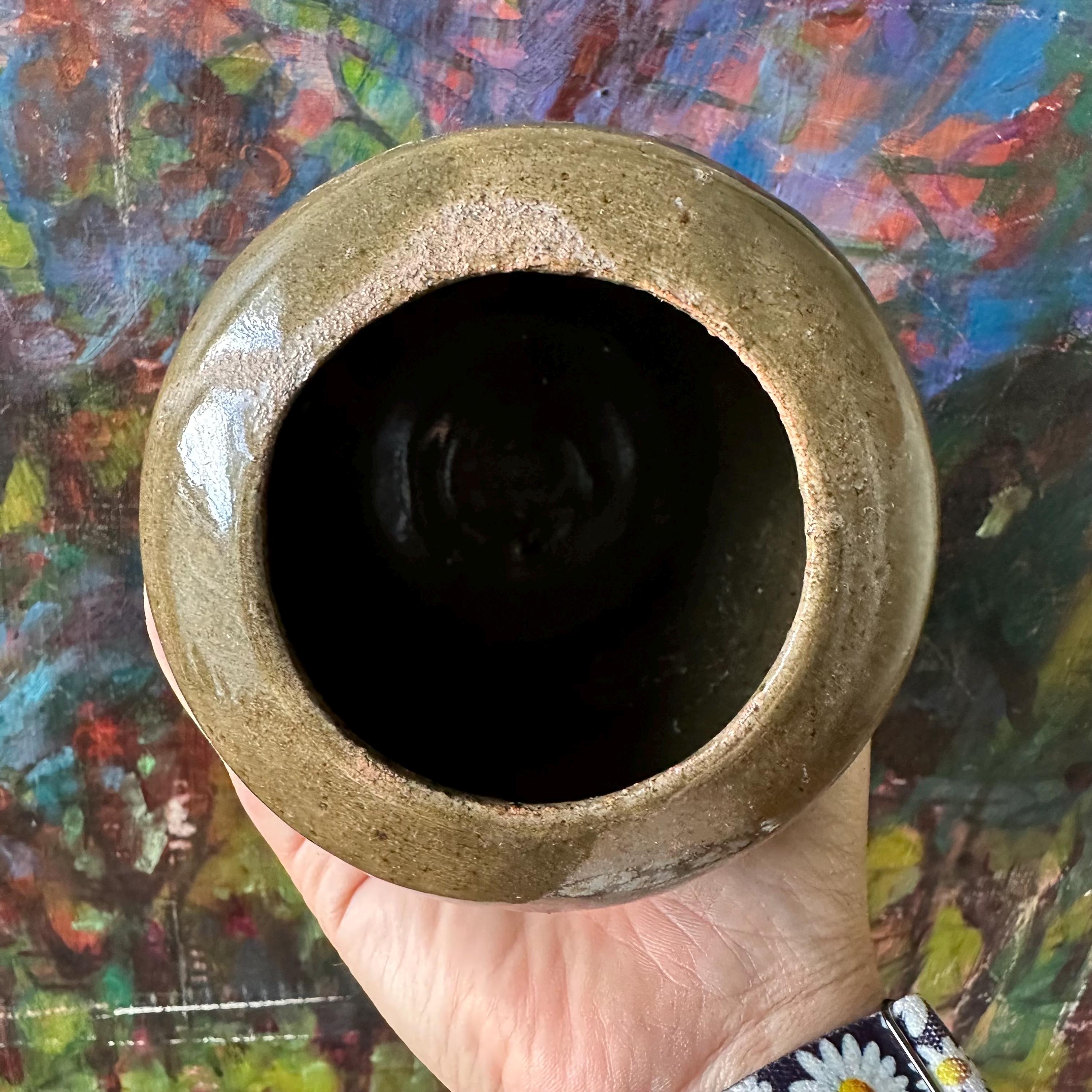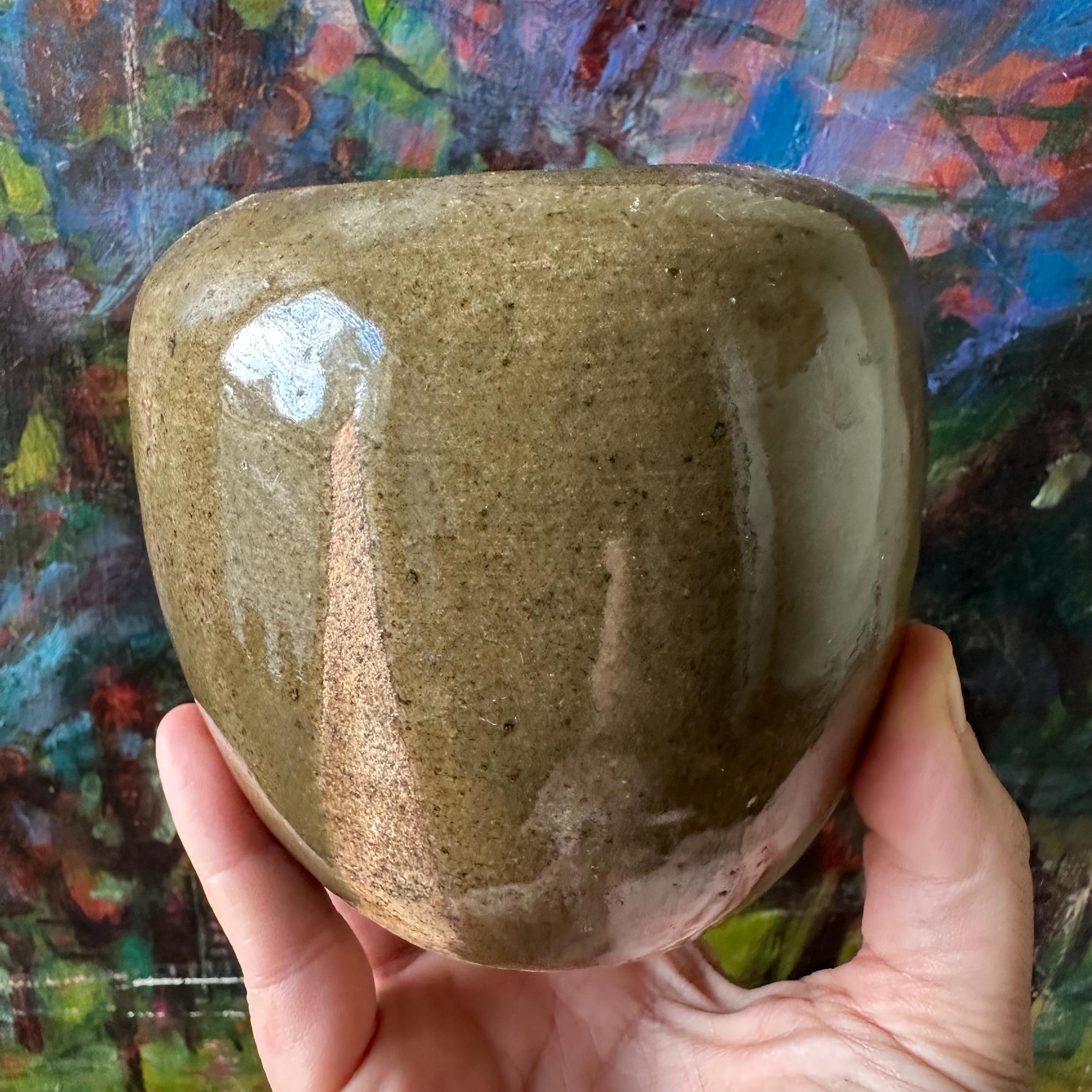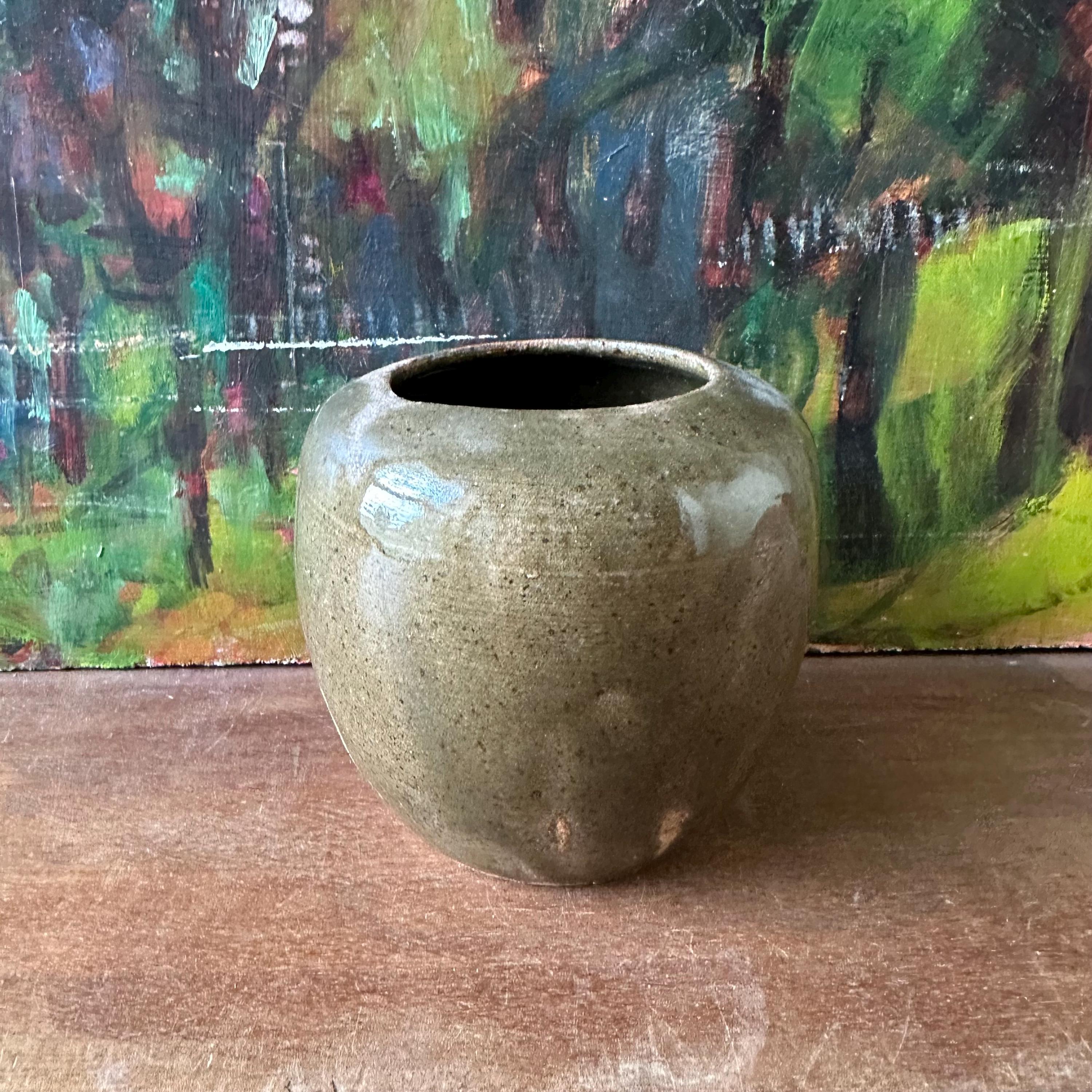 This is a small olive shaped stoneware vase with a green drip glaze. The vase is a minimalist olive shape signed Sper on the bottom. The base is beige stoneware with a lovely olive green shiny drip glaze that covers most of the vase but leaves the stoneware exposed along the bottom edge.