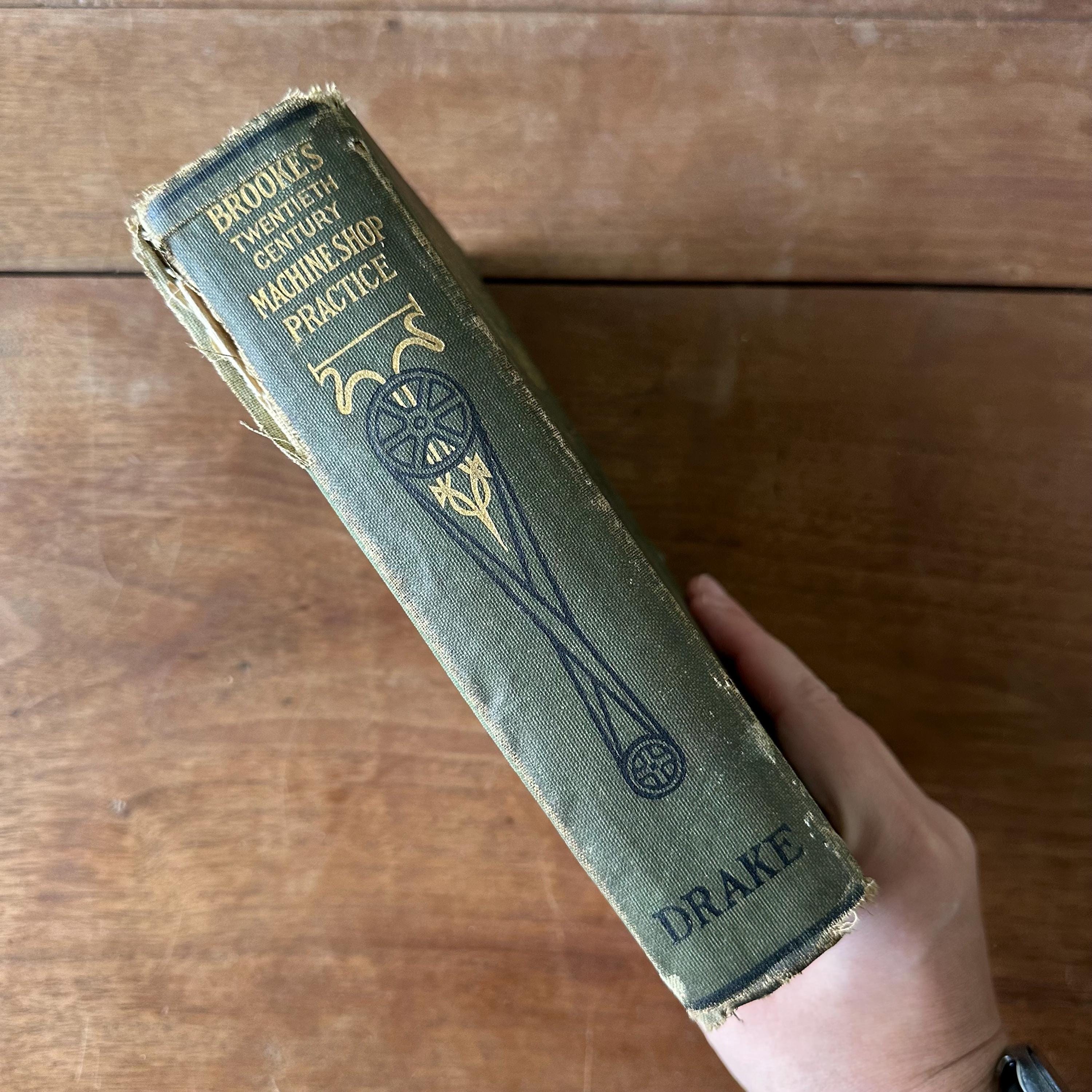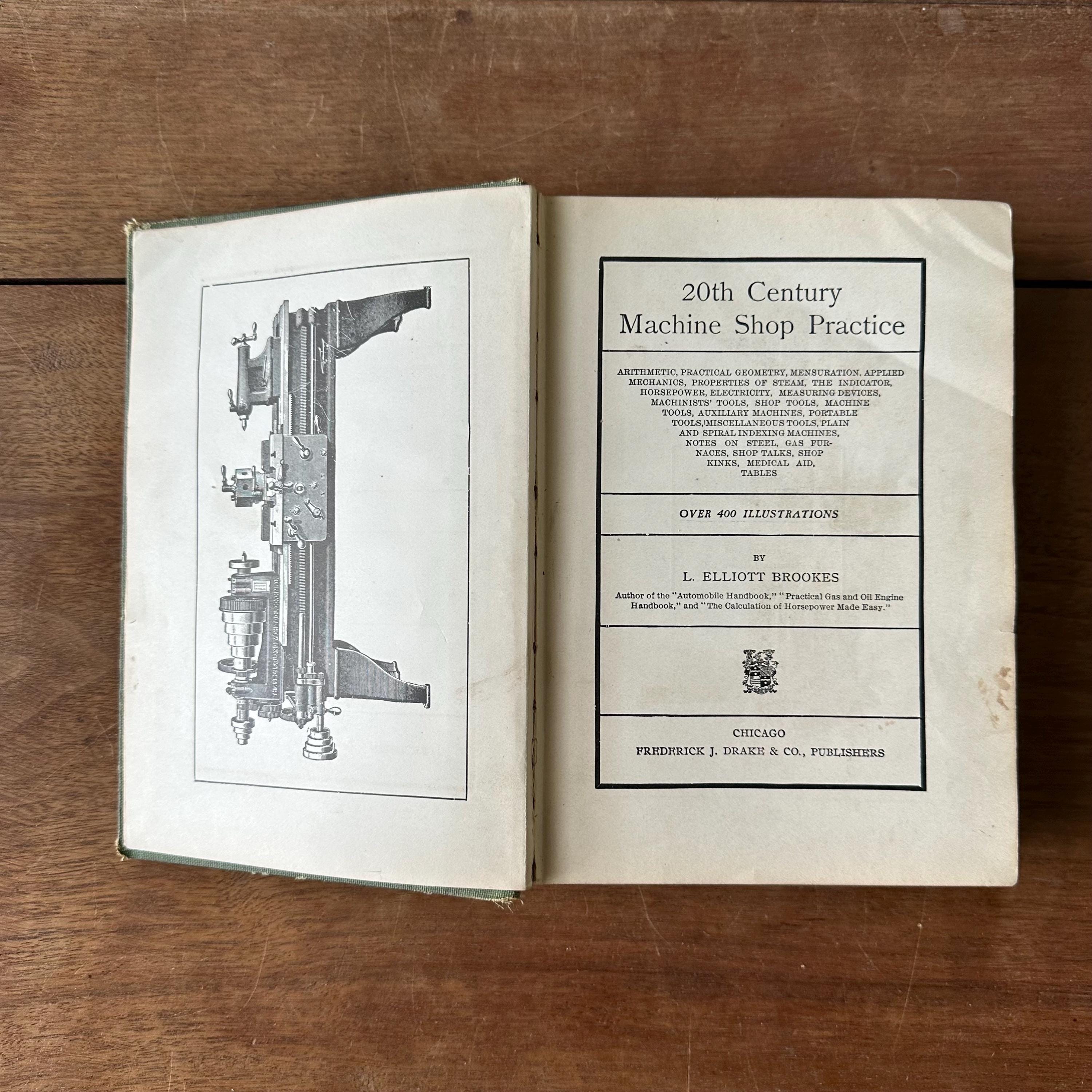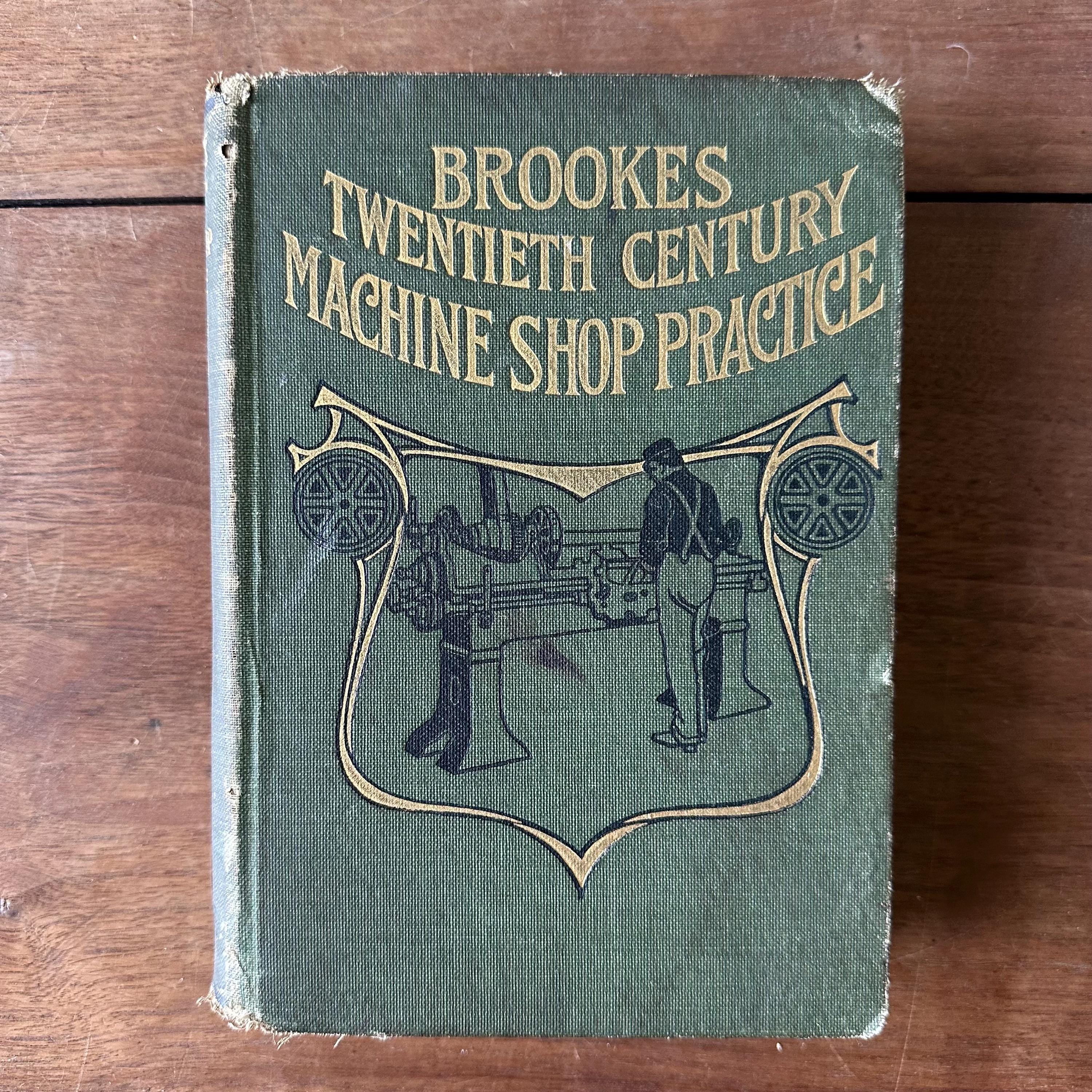 This is the 1915 edition of Brookes Twentieth Century Machine Shop Practices. It has green covers with a black line illustration of a machine shop on the cover and gold detailing and lettering. The spine is also decorated with wheels and belts with gold detailing and lettering. The book has over 400 black and white illustrations. There are 631 pages with several pages of ads at the end.