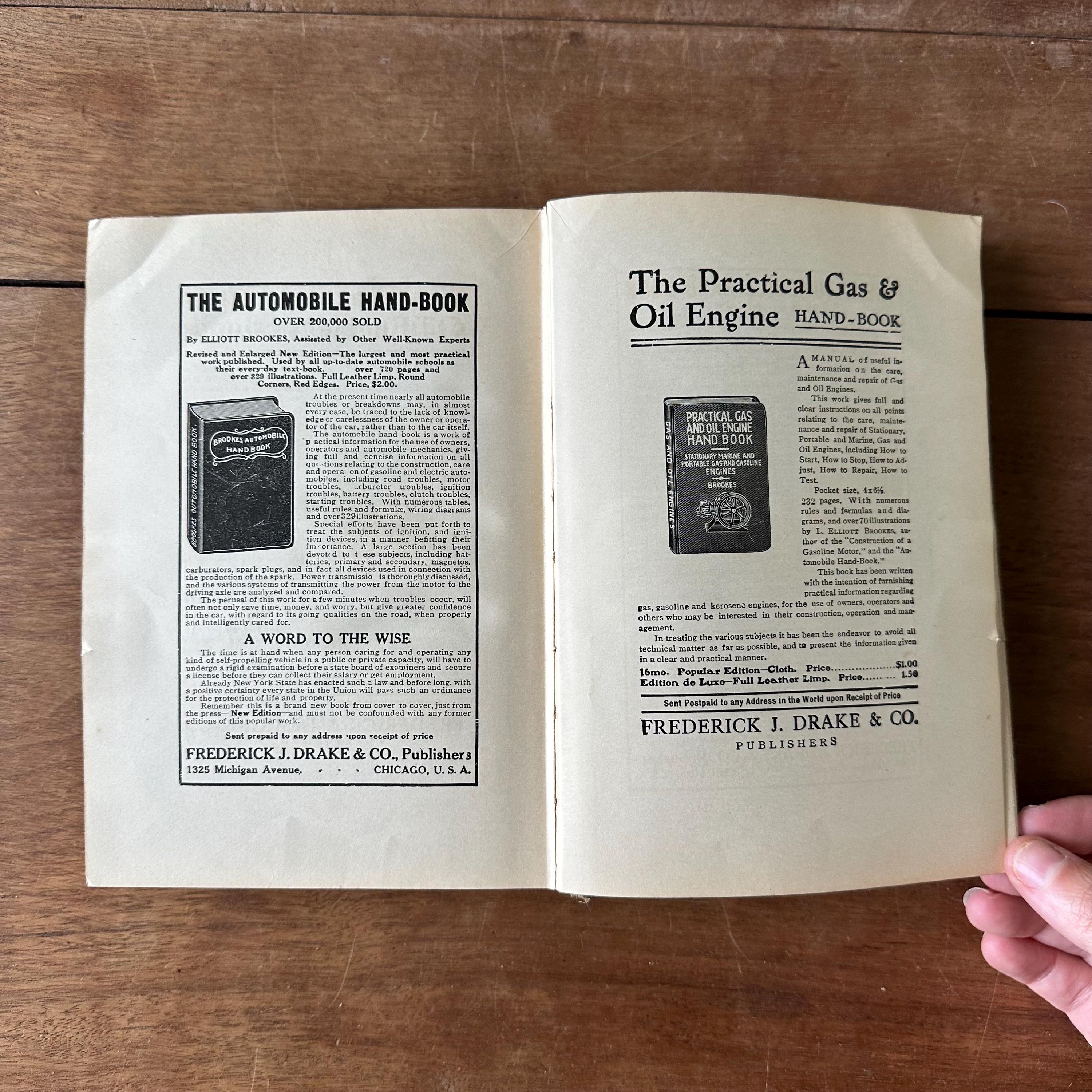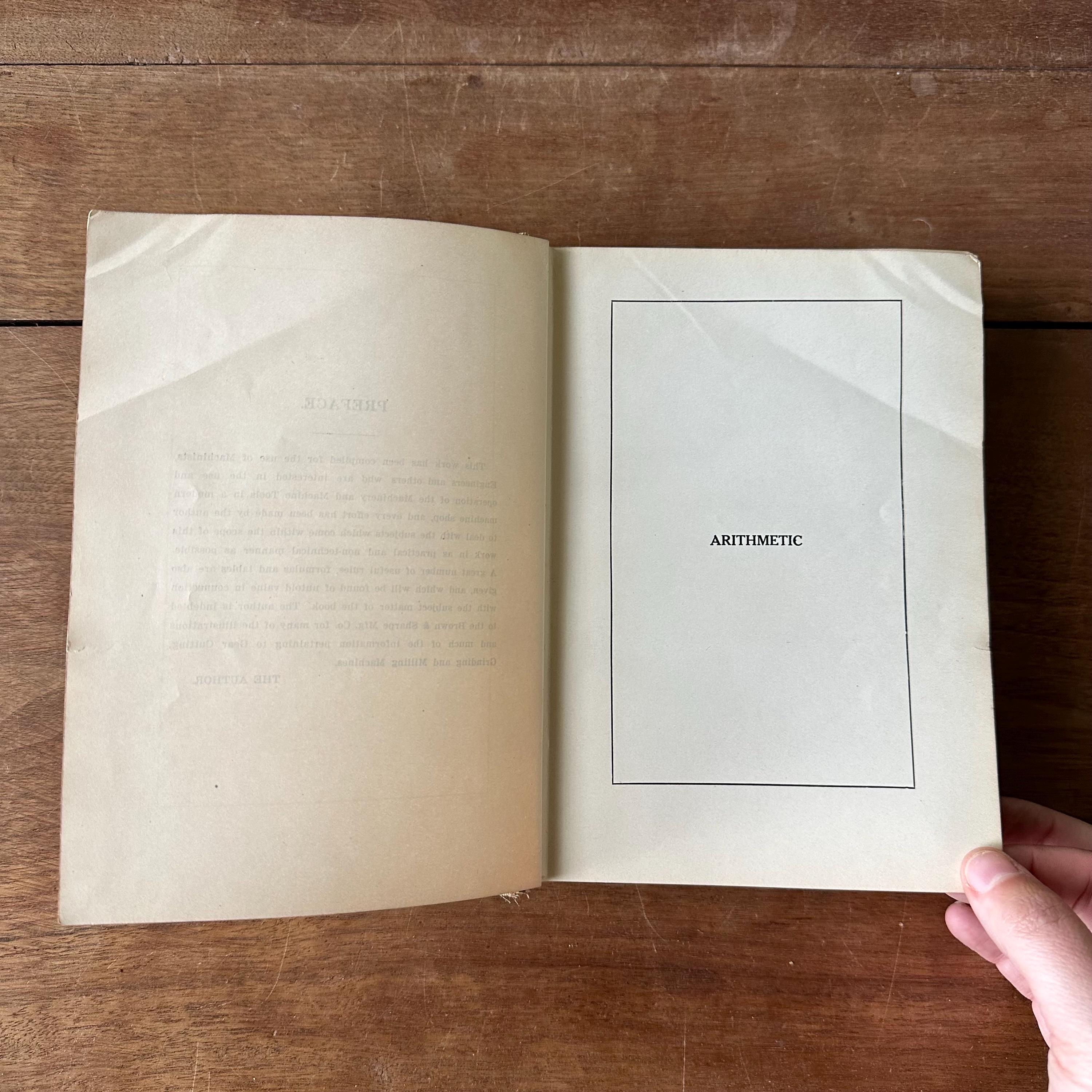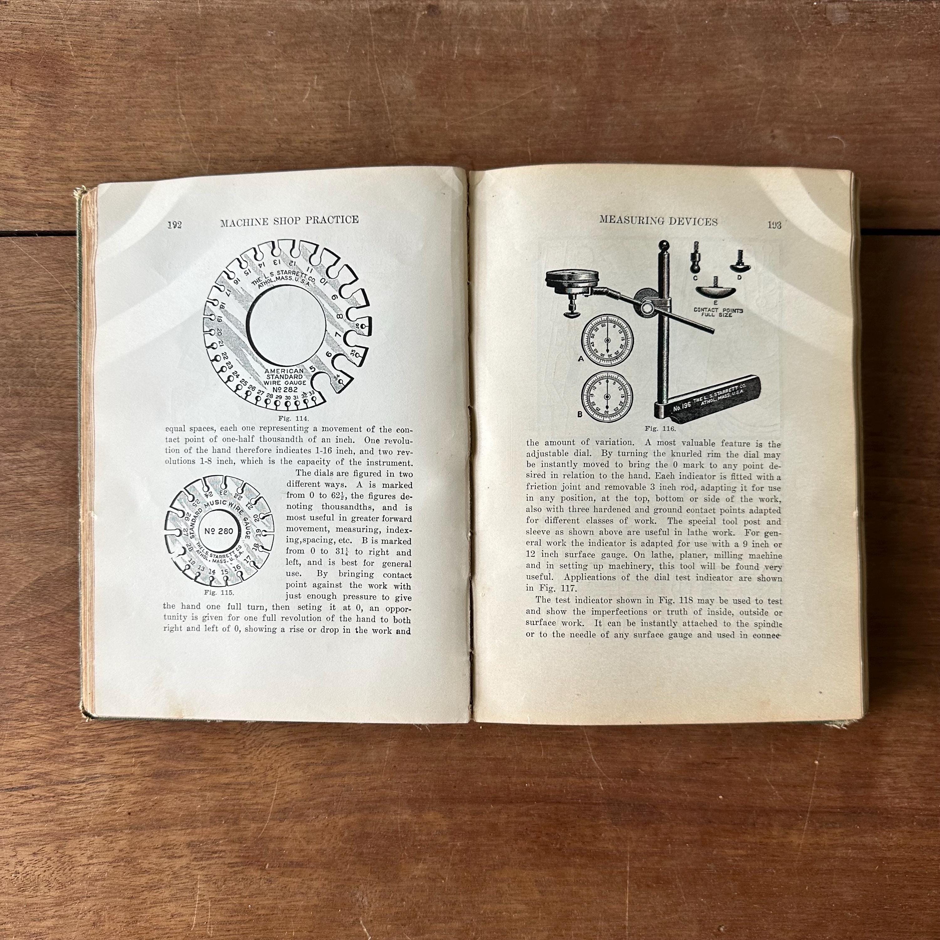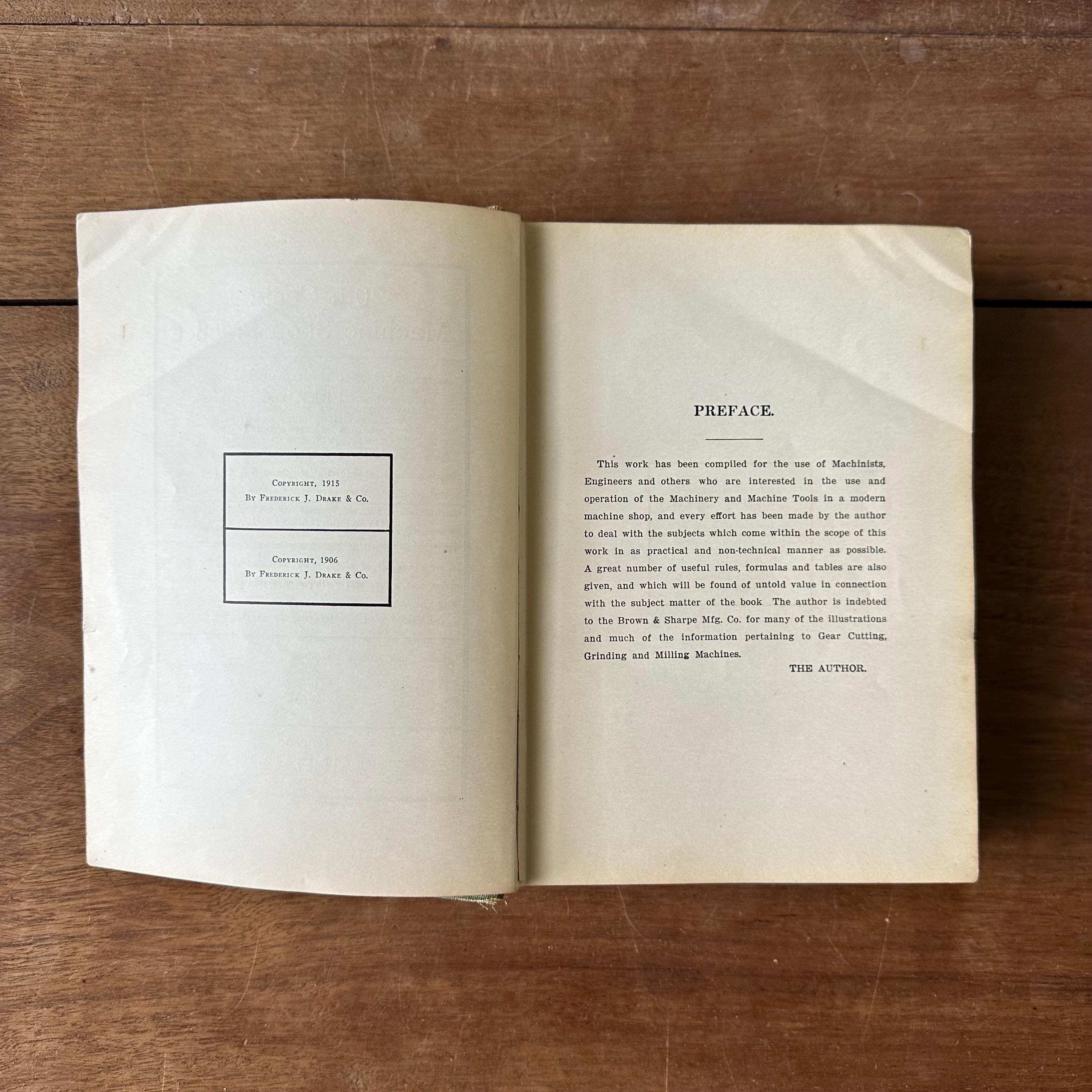 This is the 1915 edition of Brookes Twentieth Century Machine Shop Practices. It has green covers with a black line illustration of a machine shop on the cover and gold detailing and lettering. The spine is also decorated with wheels and belts with gold detailing and lettering. The book has over 400 black and white illustrations. There are 631 pages with several pages of ads at the end.