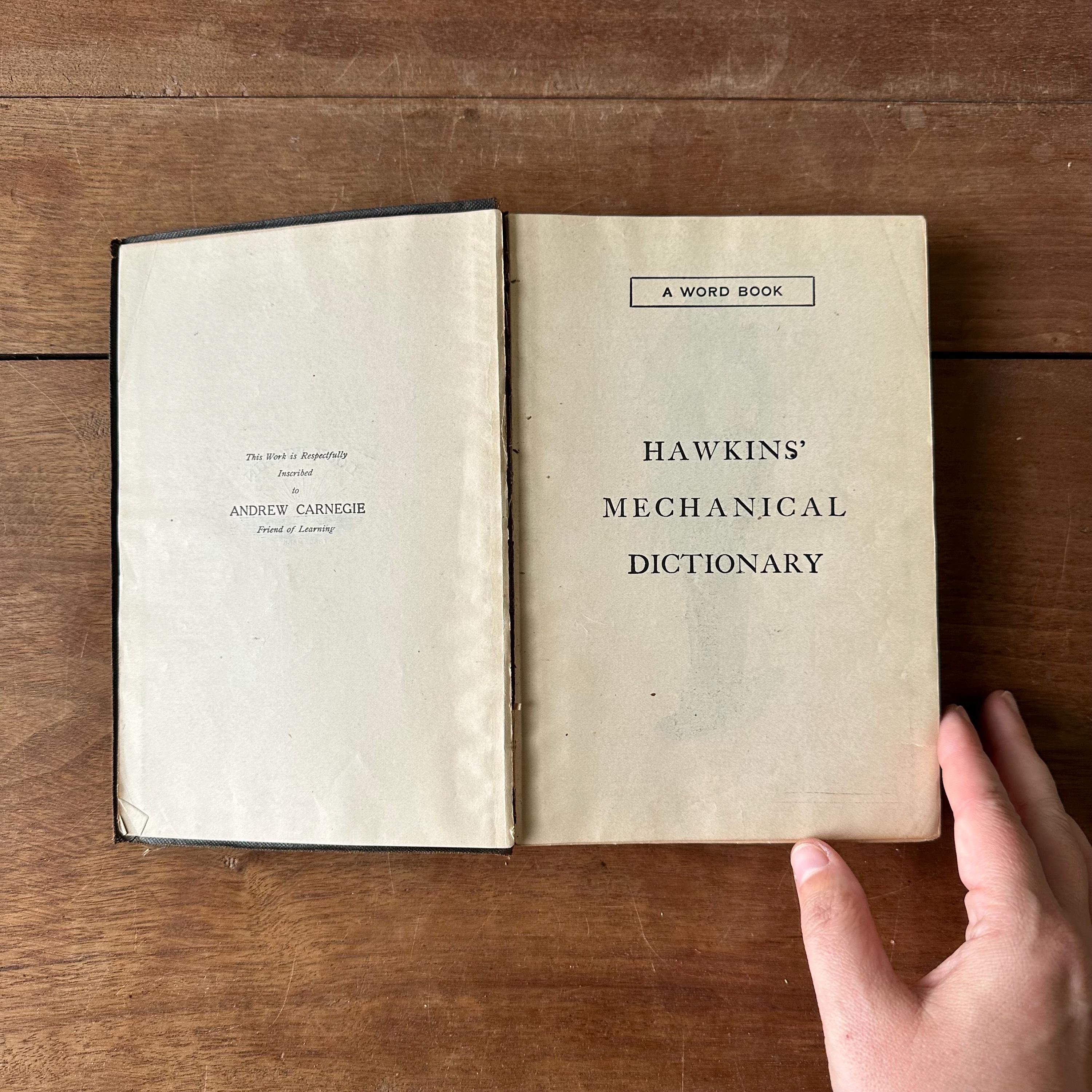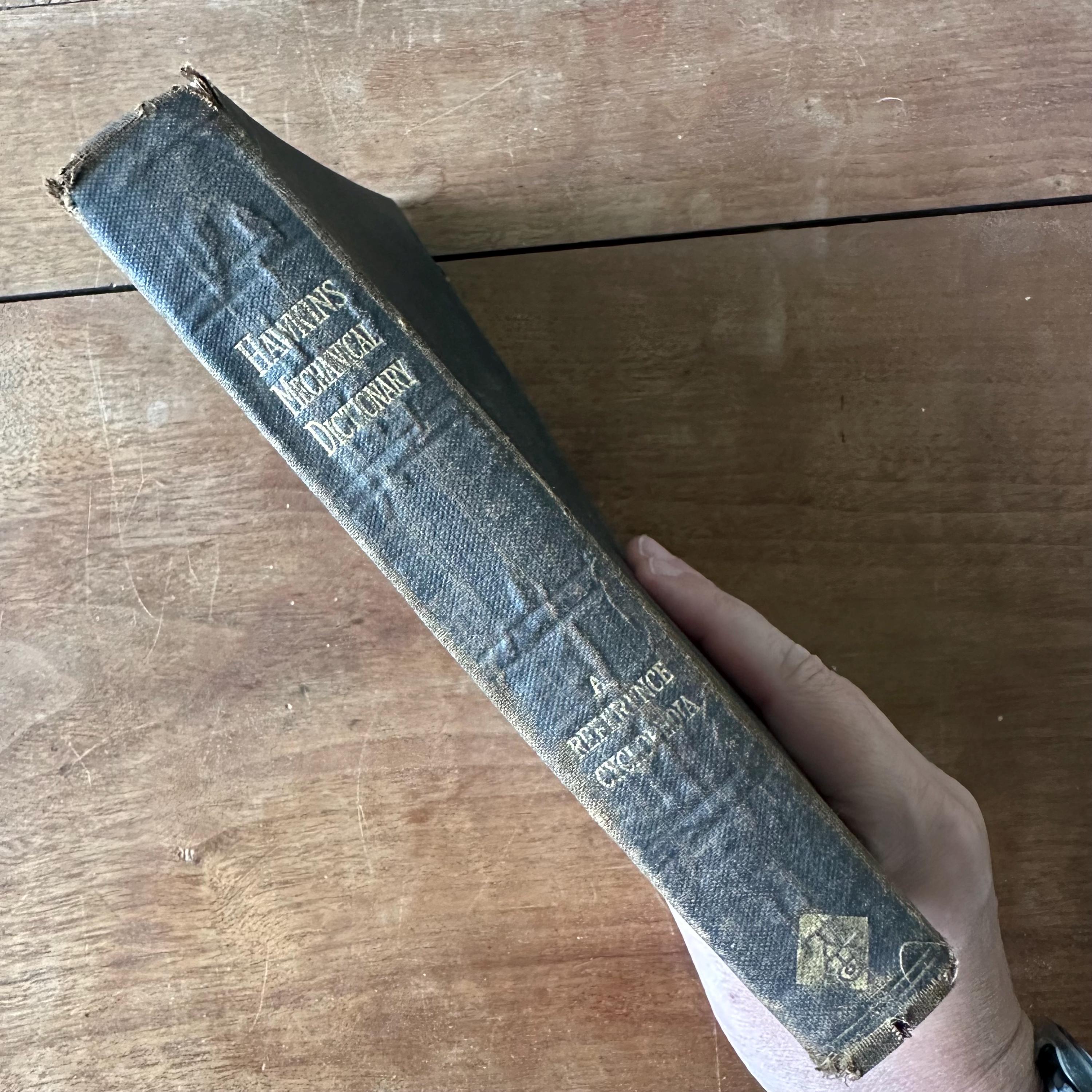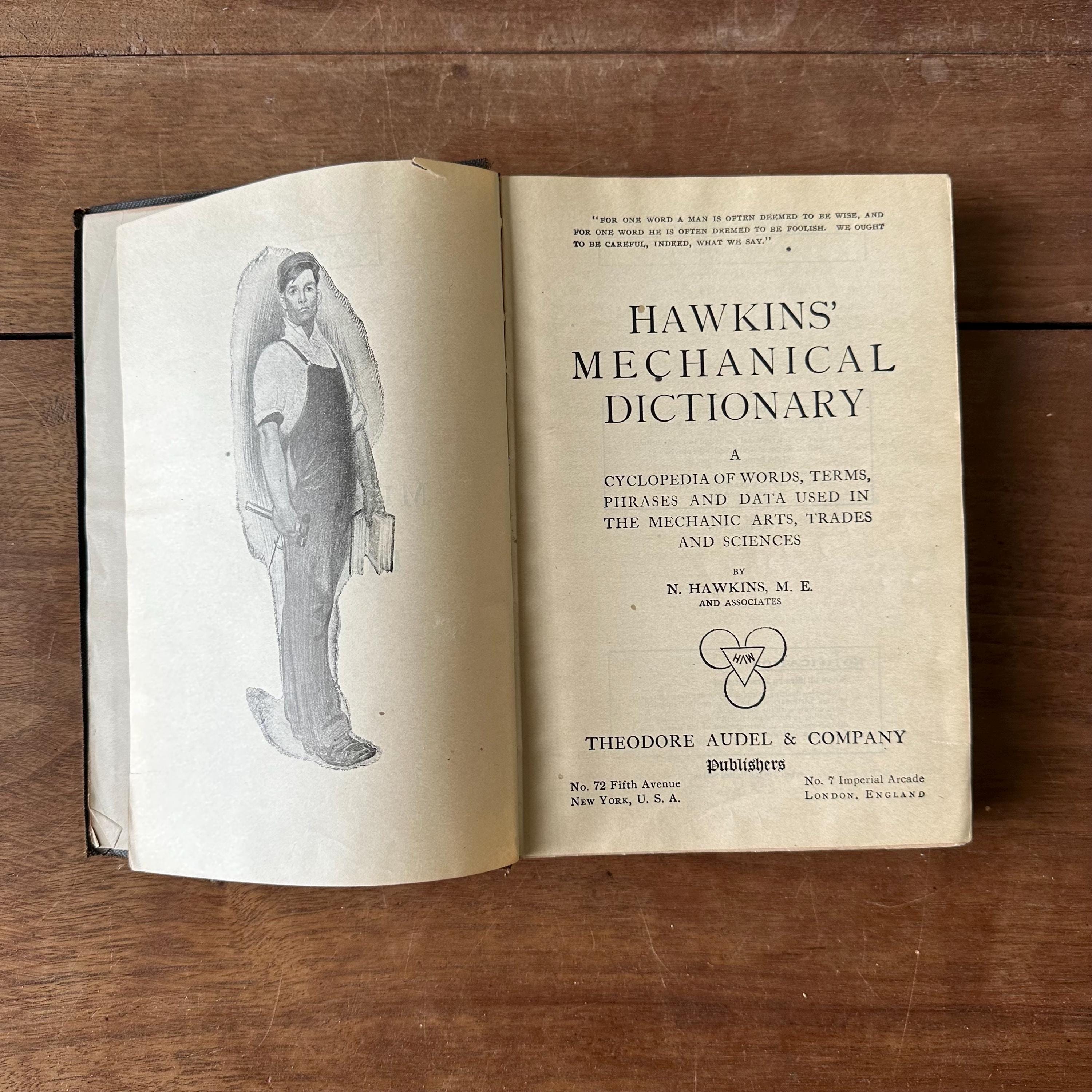 This is the antique 1909 edition of Hawkins' Mechanical Dictionary, A Cyclopedia of Words, Terms, Phrases, and Data Used in the Mechanic Arts, Trades, and Sciences by N. Hawkins, M.E. and Associates and published by Theodore Audel & Company. It has dark brown or black soft linen covers with gold lettering on the spine. The book has gilded page ends and an illustration plate at the title page. There are also illustrated ads at the end. There are 665 pages.