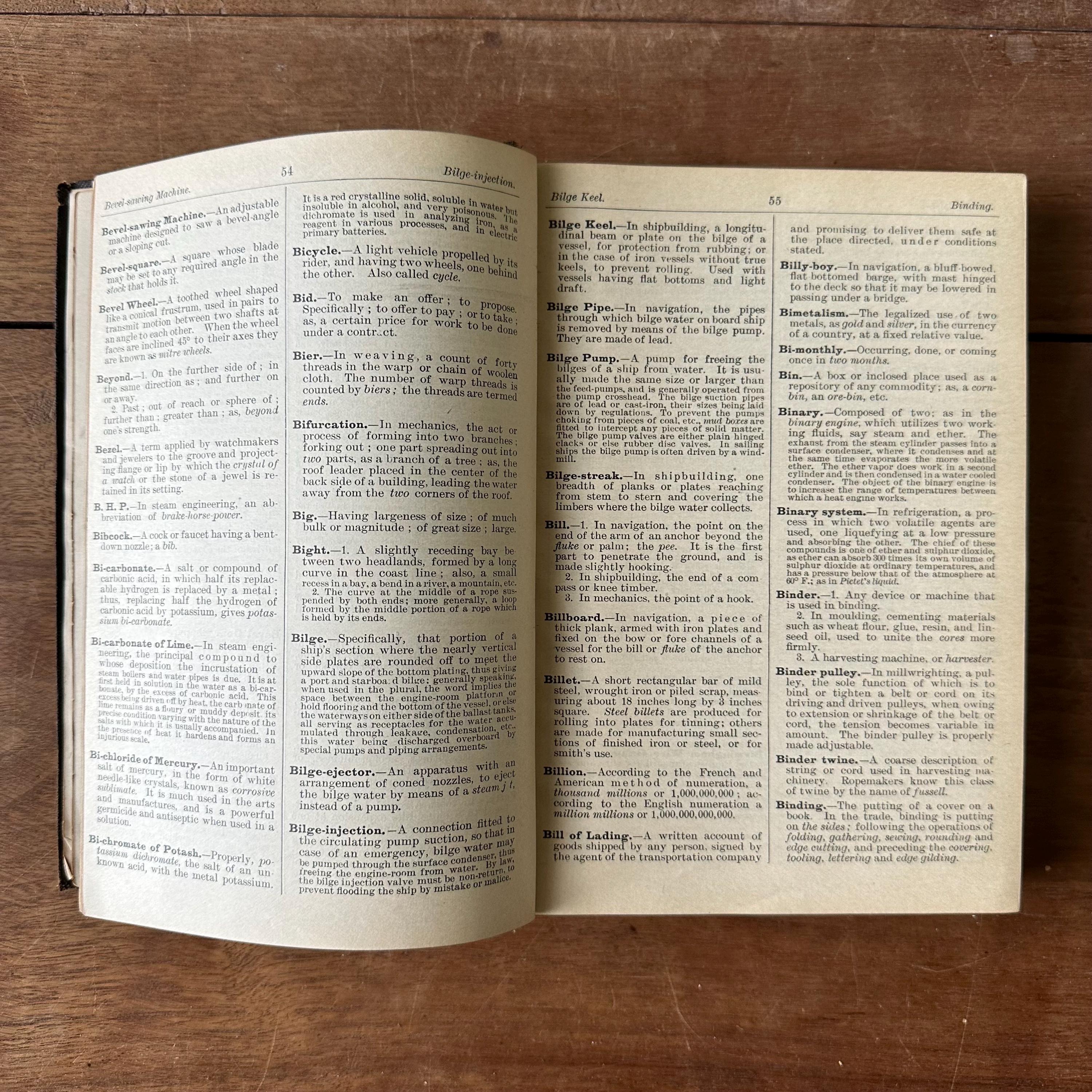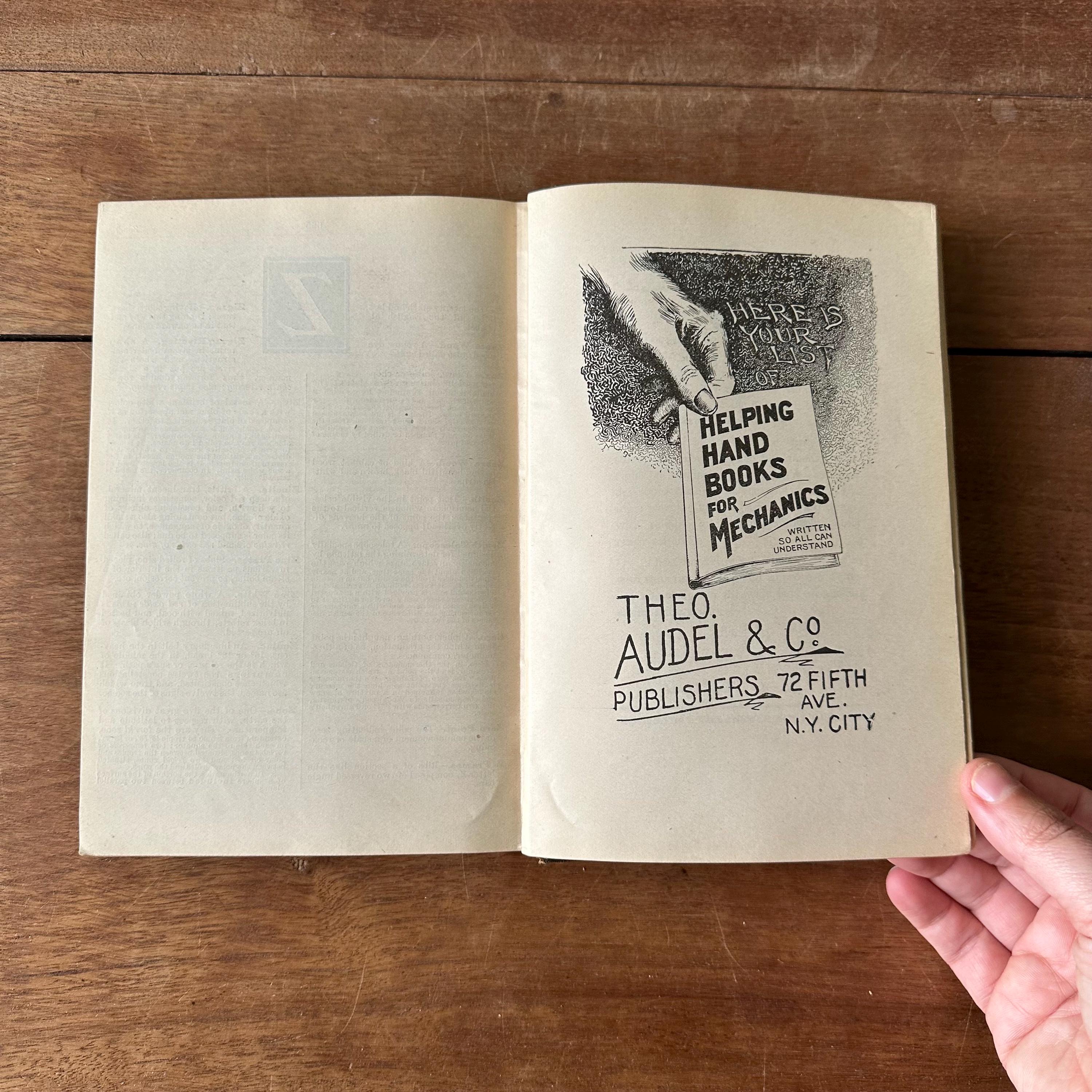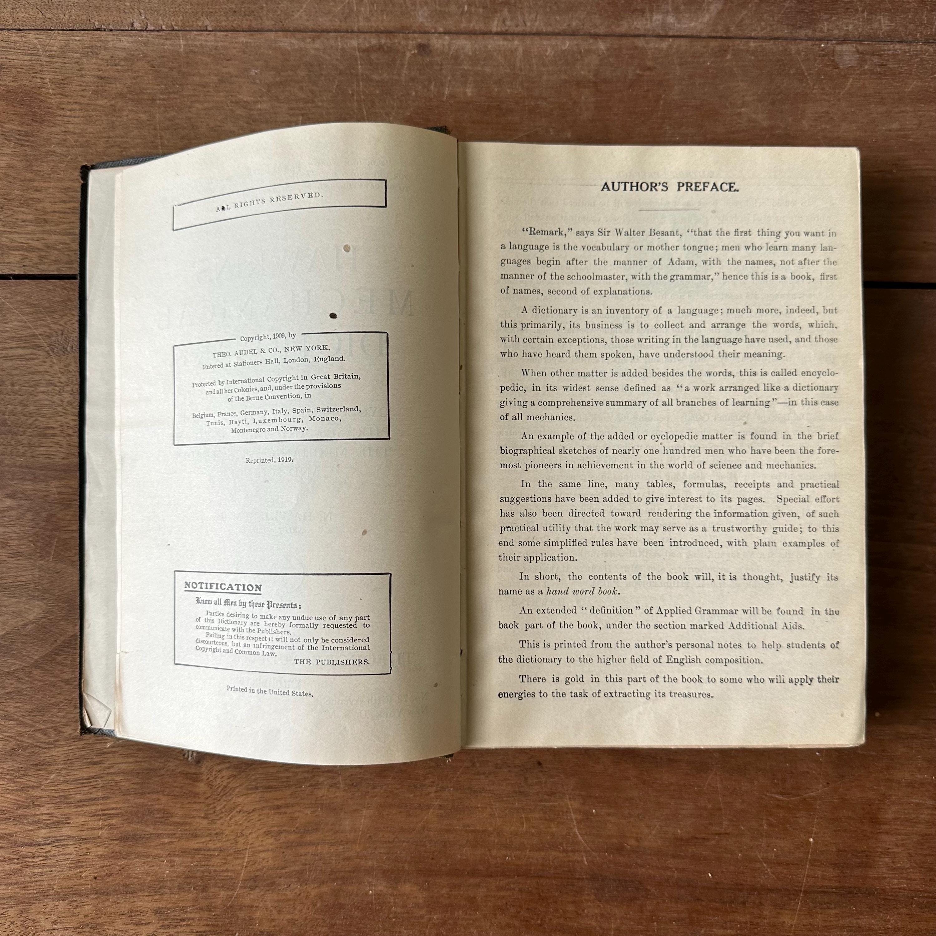 This is the antique 1909 edition of Hawkins' Mechanical Dictionary, A Cyclopedia of Words, Terms, Phrases, and Data Used in the Mechanic Arts, Trades, and Sciences by N. Hawkins, M.E. and Associates and published by Theodore Audel & Company. It has dark brown or black soft linen covers with gold lettering on the spine. The book has gilded page ends and an illustration plate at the title page. There are also illustrated ads at the end. There are 665 pages.