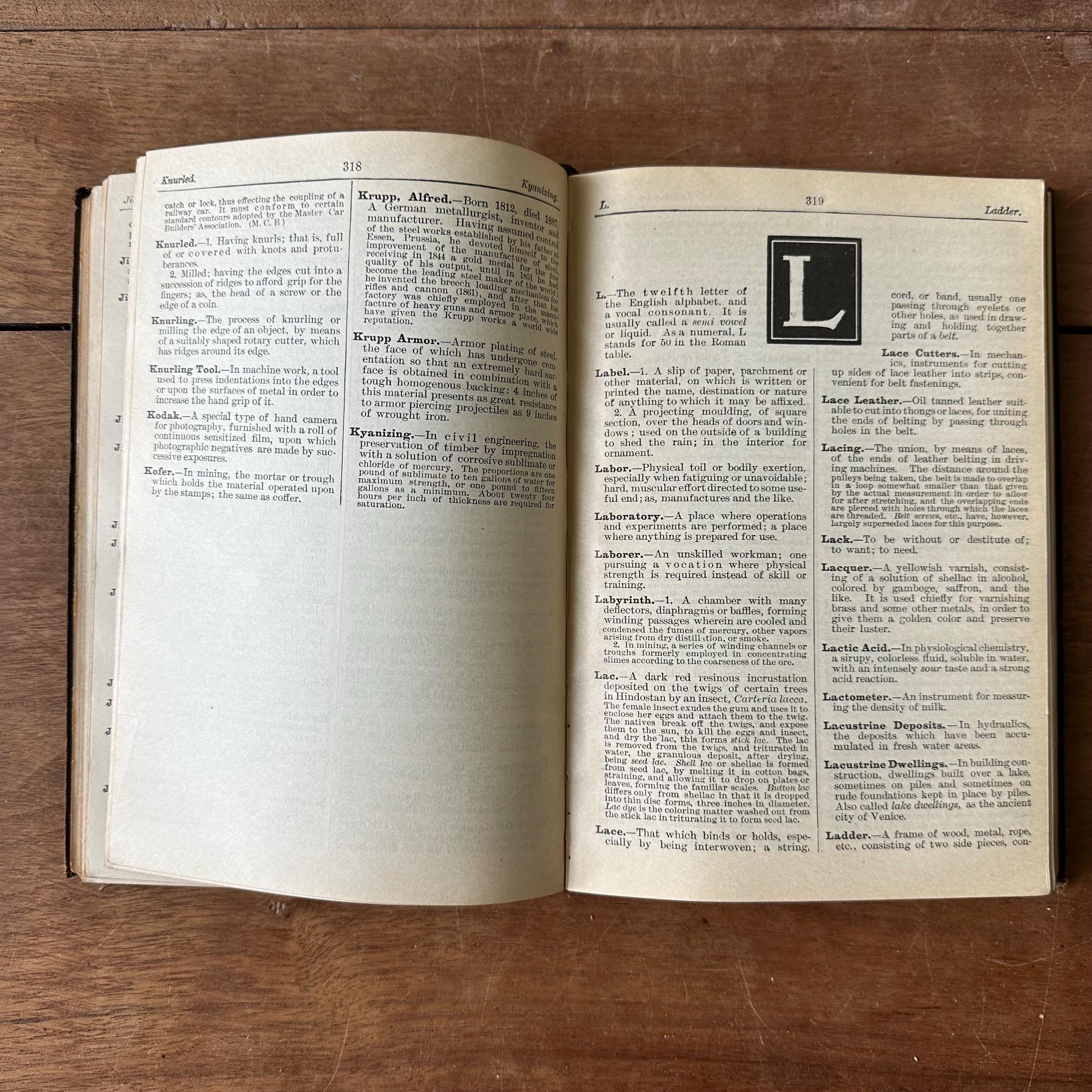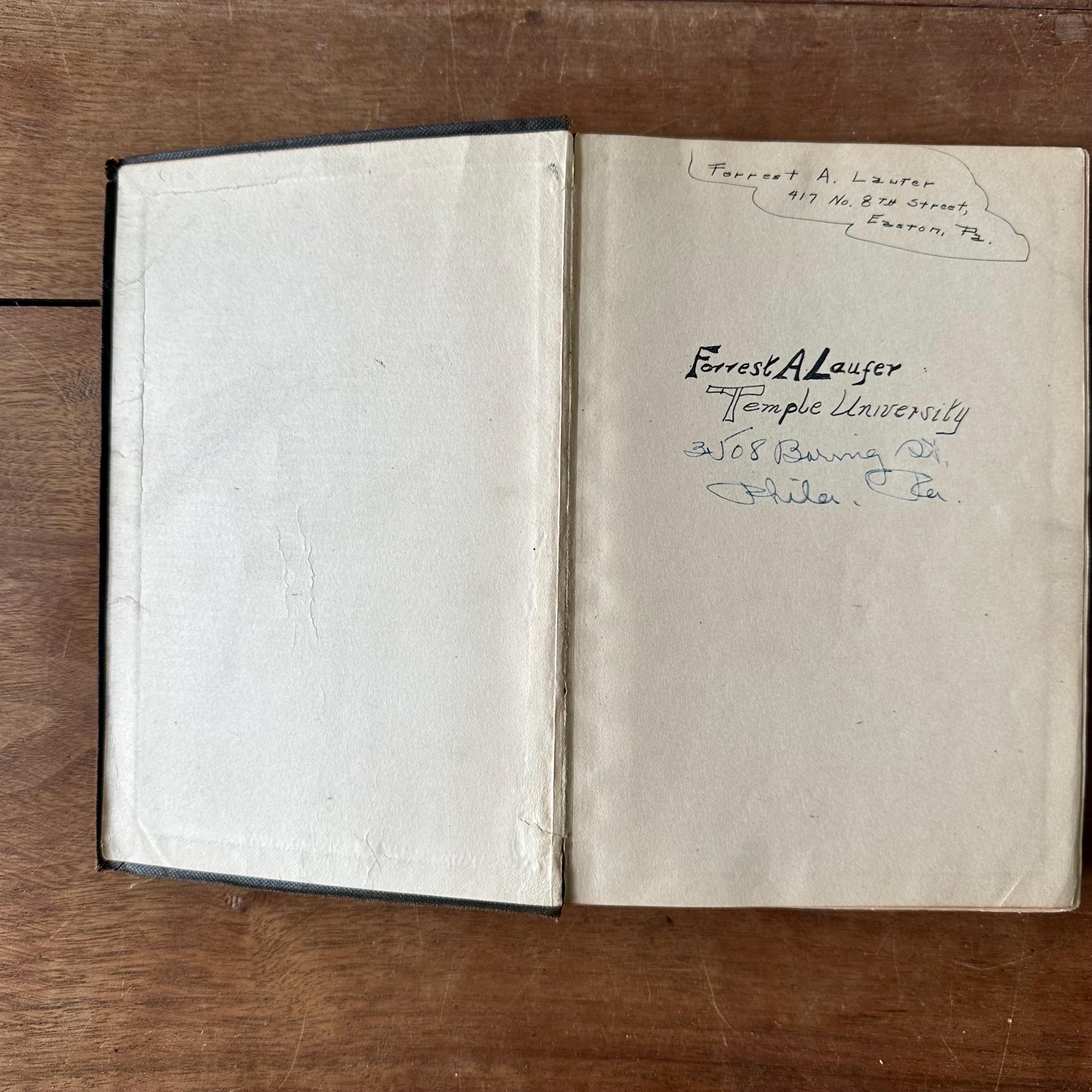 The dictionary is in good antique condition for its age and use. The covers have general wear with some staining, discoloration and fraying, especially on corners and spine edges. The gilding is still bright and shiny. Forrest A. Laurer wrote his name and two different addresses inside the front cover, including an address for Temple University. The back cover has almost completed separated at the spine at the inside back cover. The pages are yellowed.