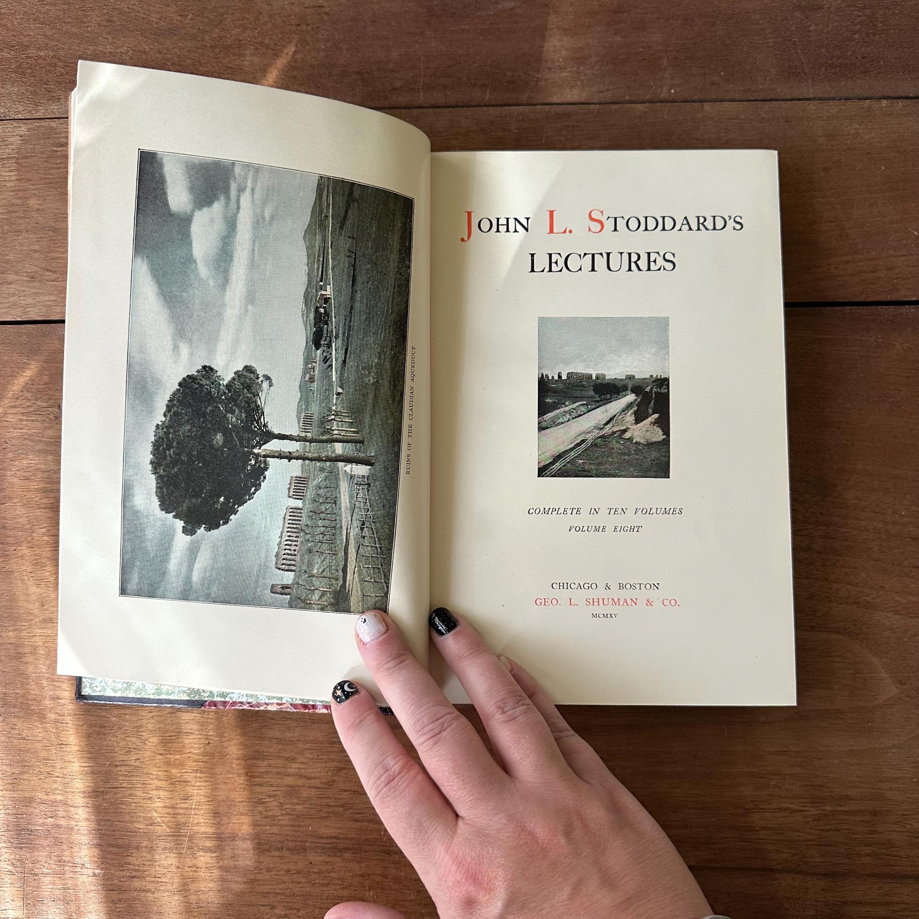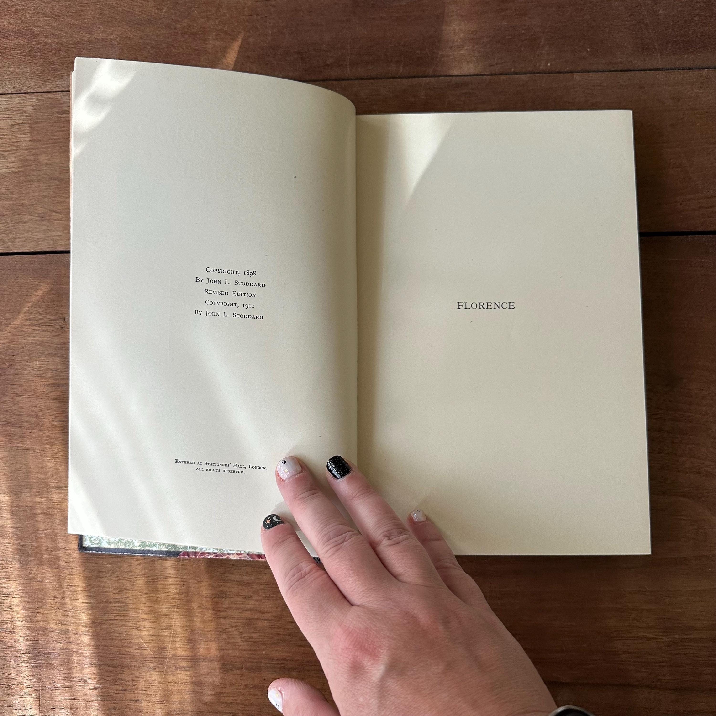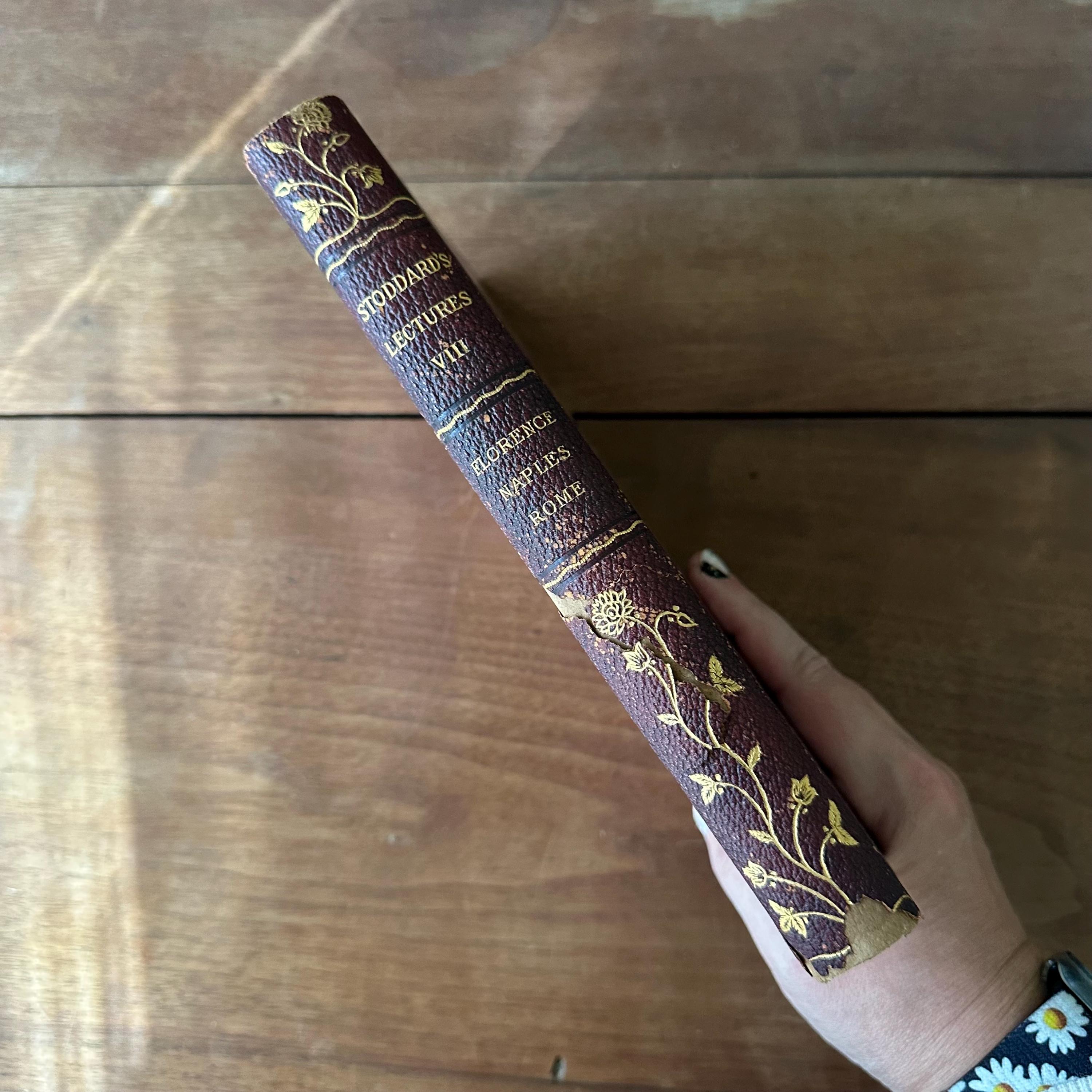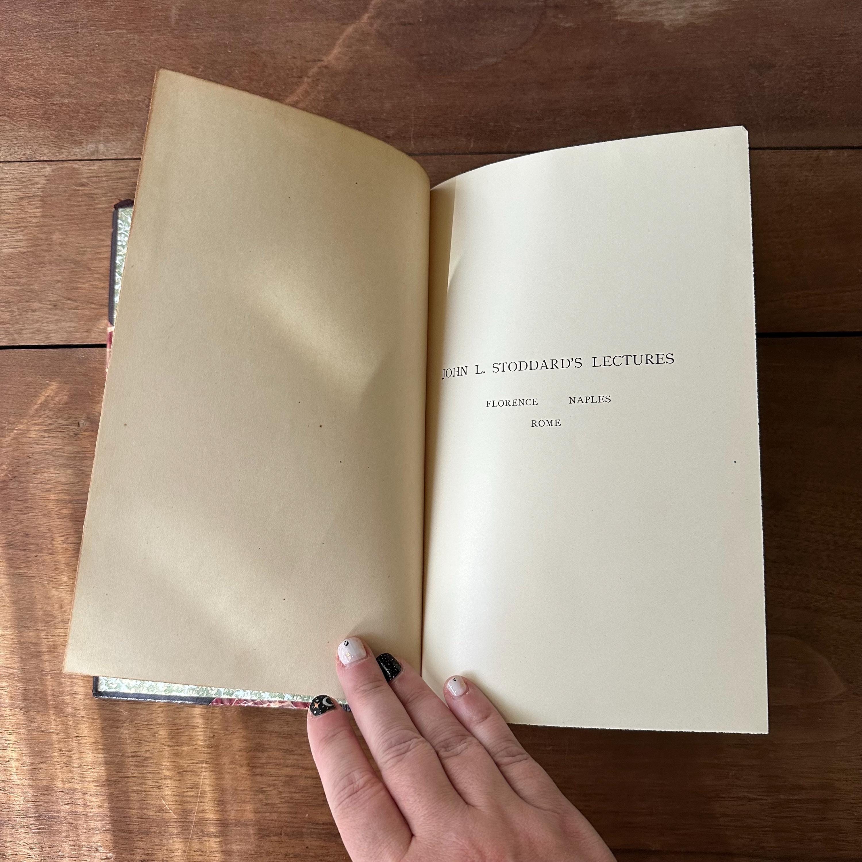 This is the 1915 edition of John L. Stoddard's Lectures, Volume VIII, published by Geo. L. Shuman. It features red marbled covers with dark brown leather corners and spine. The spine is decorated and lettered in gold. The inside front and back endpapers are a green and silver floral pattern. The guide covers Florence, Naples, and Italy with full color and black and white photograph and illustration plates. There are 336 pages.