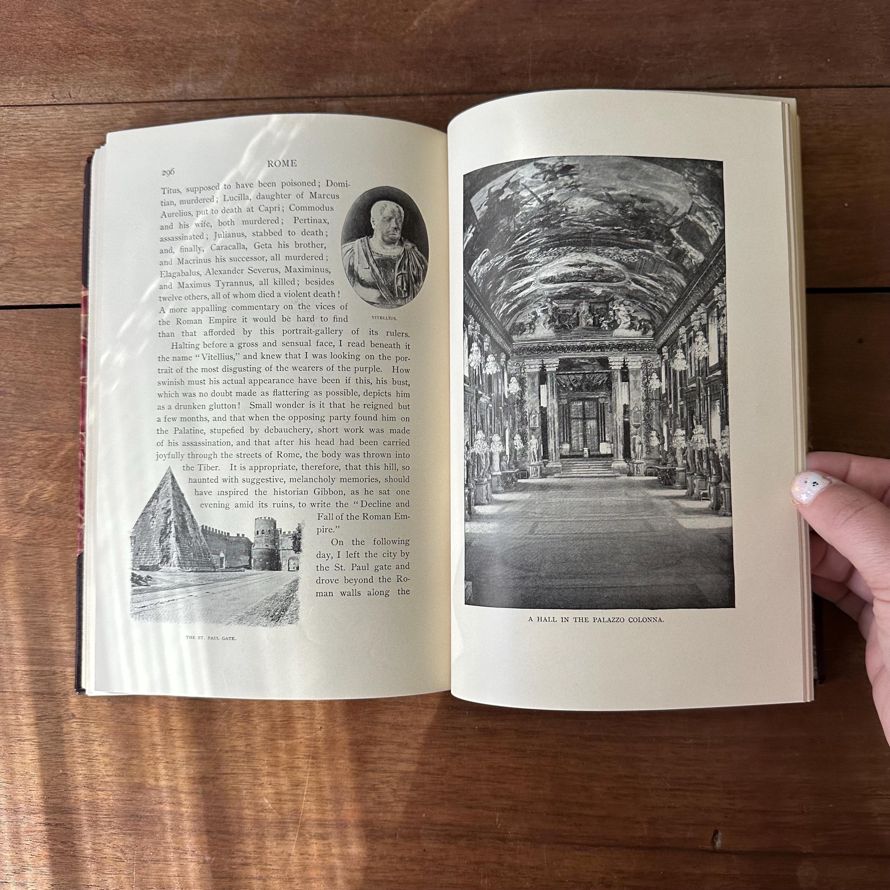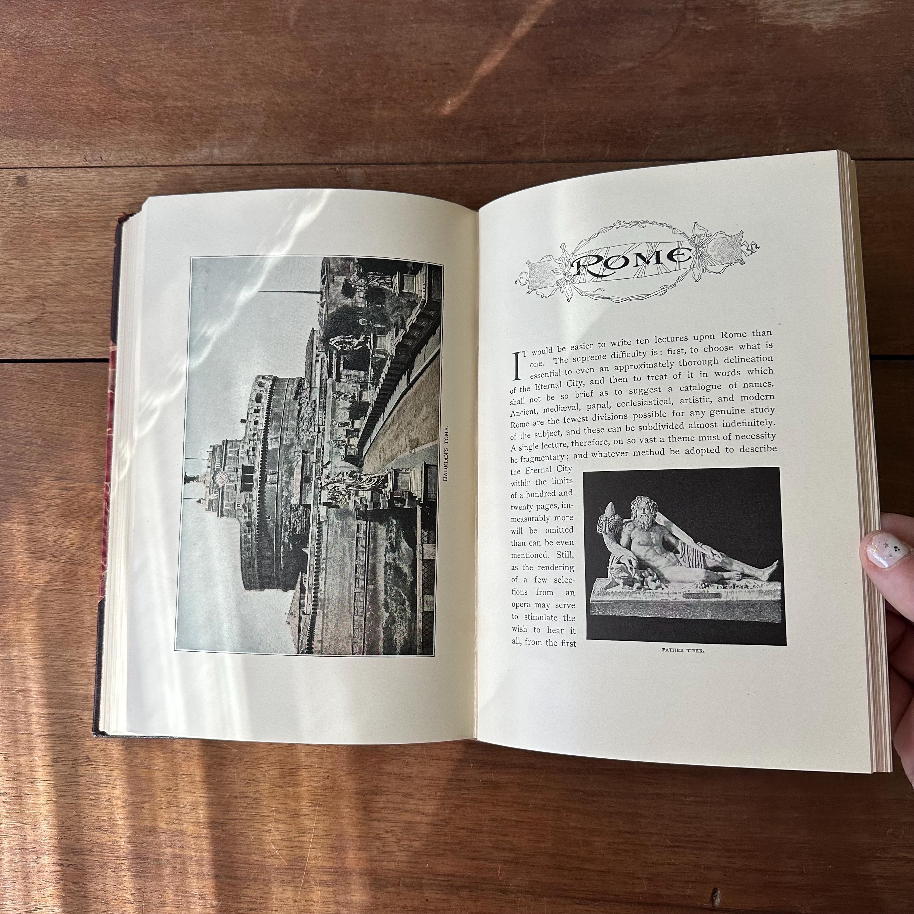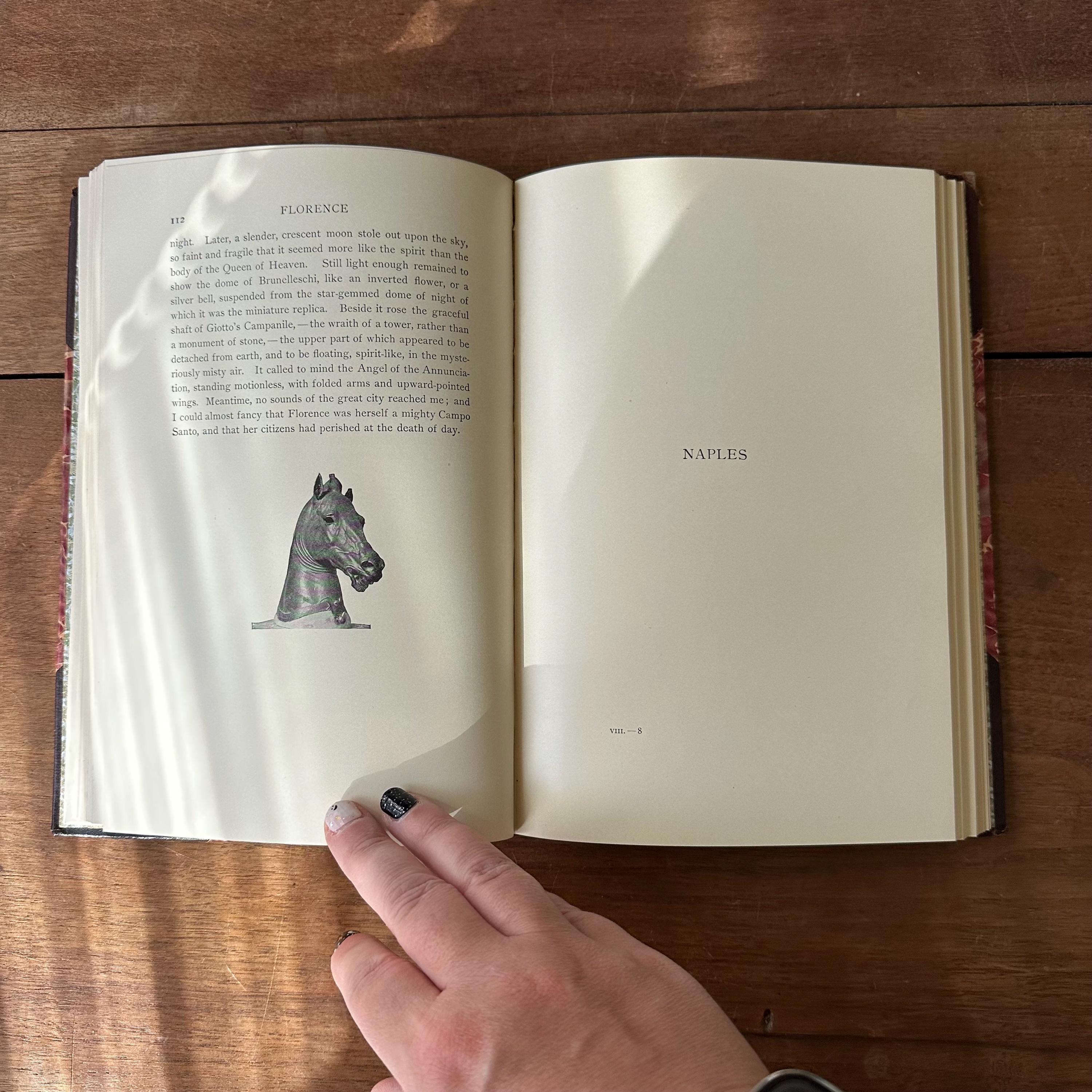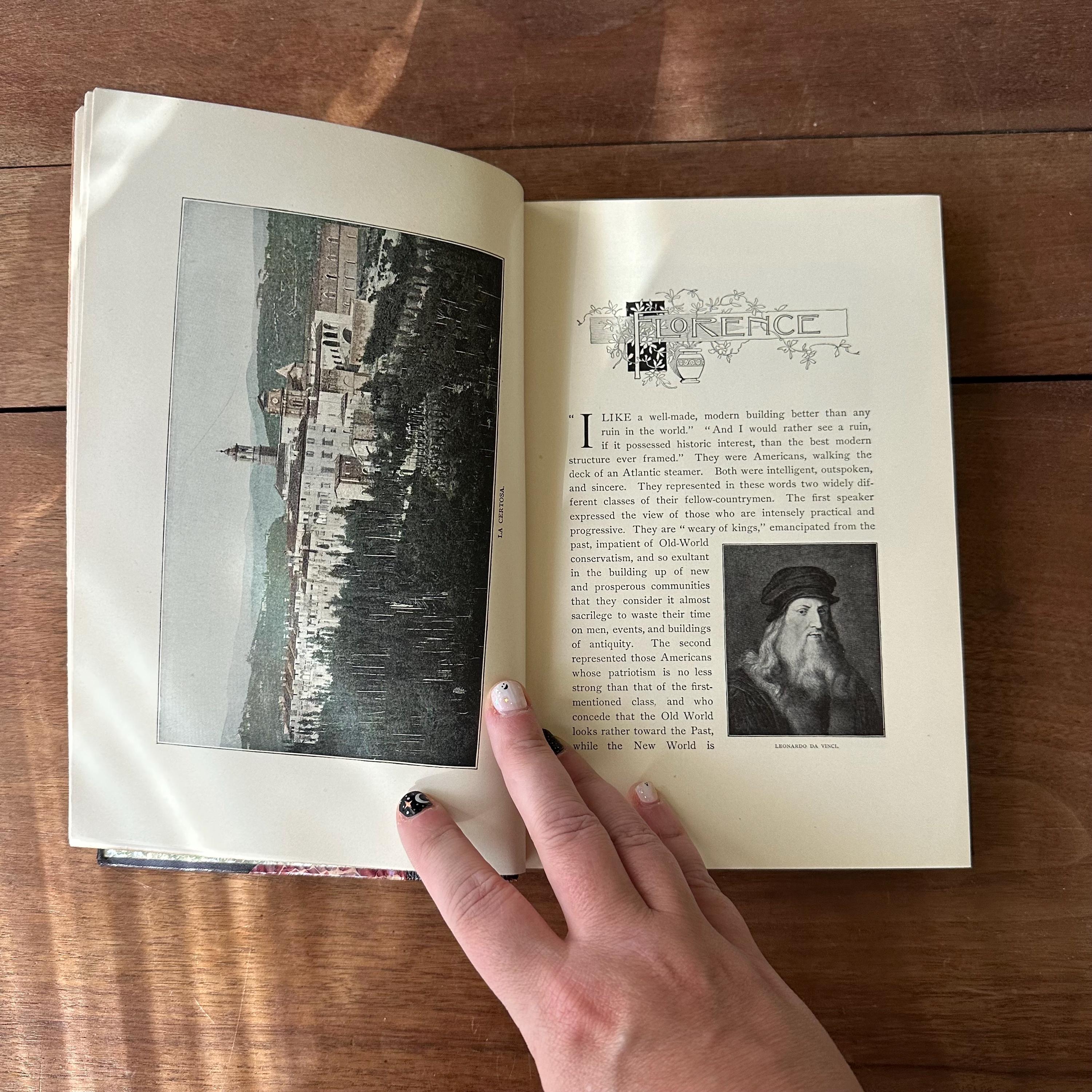 This is the 1915 edition of John L. Stoddard's Lectures, Volume VIII, published by Geo. L. Shuman. It features red marbled covers with dark brown leather corners and spine. The spine is decorated and lettered in gold. The inside front and back endpapers are a green and silver floral pattern. The guide covers Florence, Naples, and Italy with full color and black and white photograph and illustration plates. There are 336 pages.