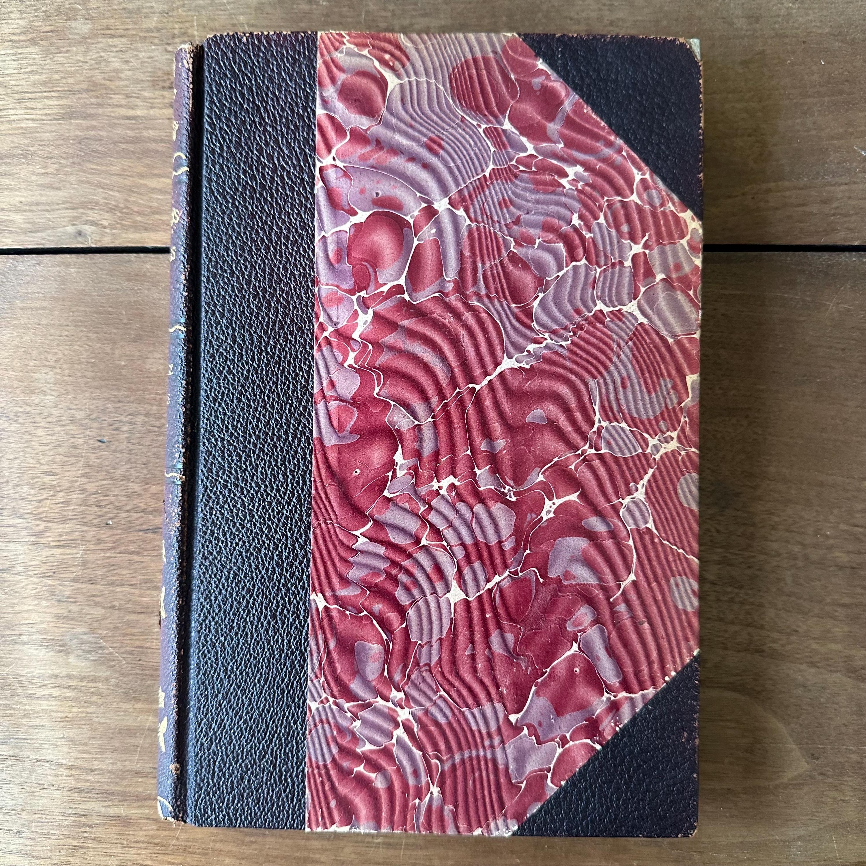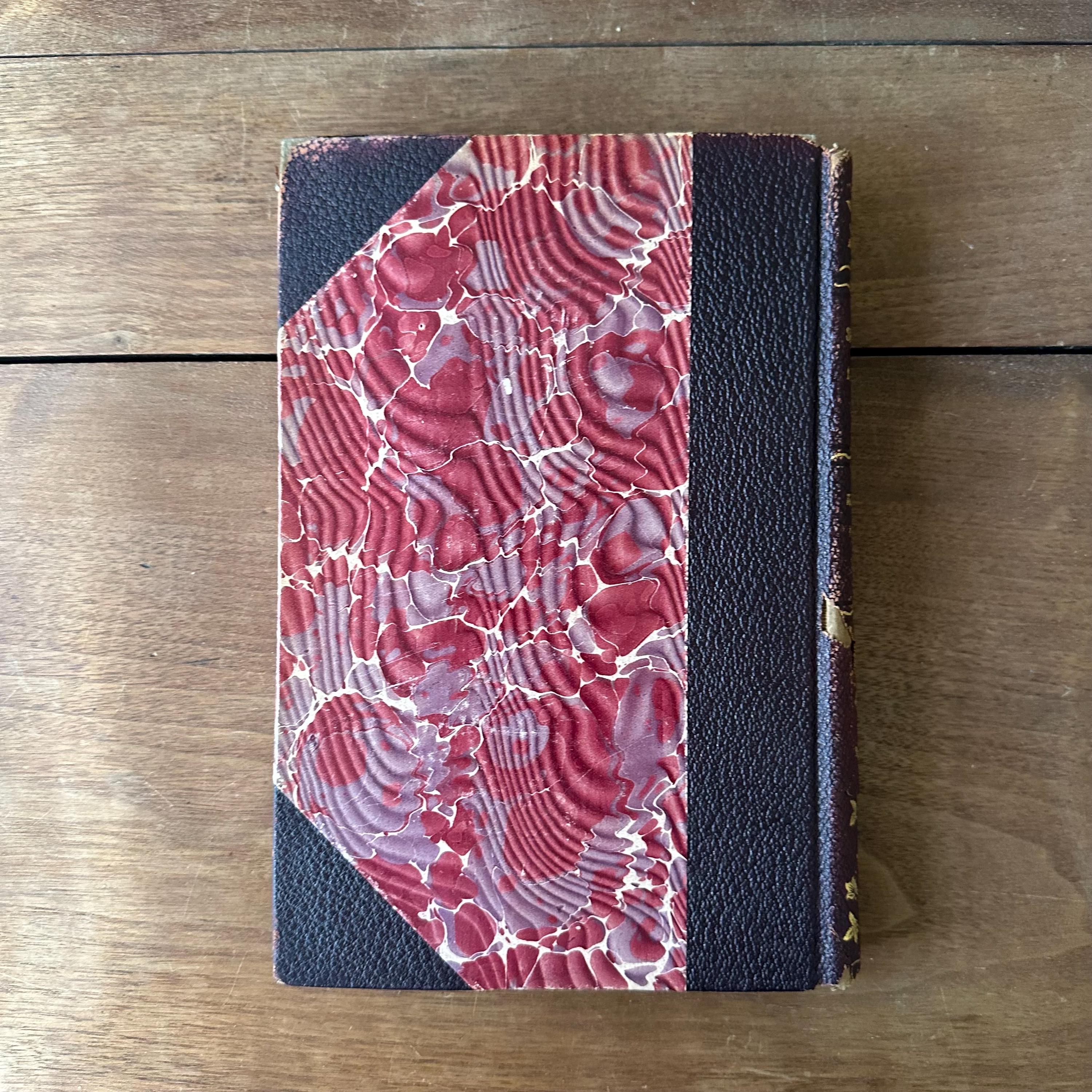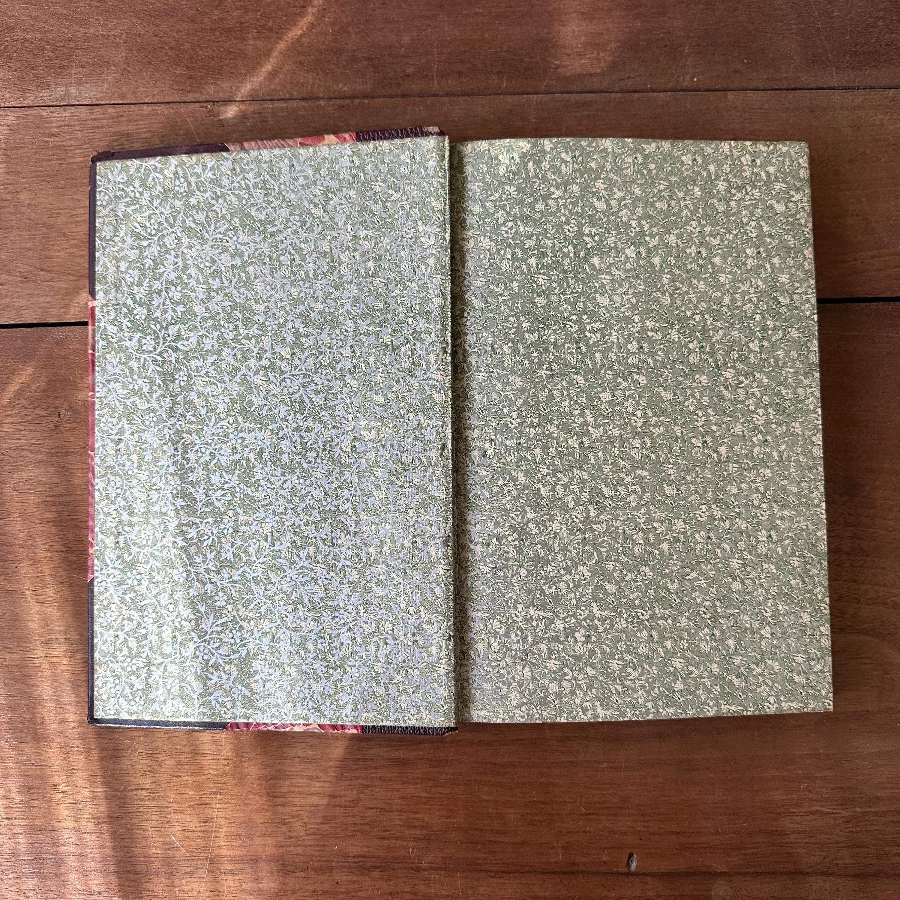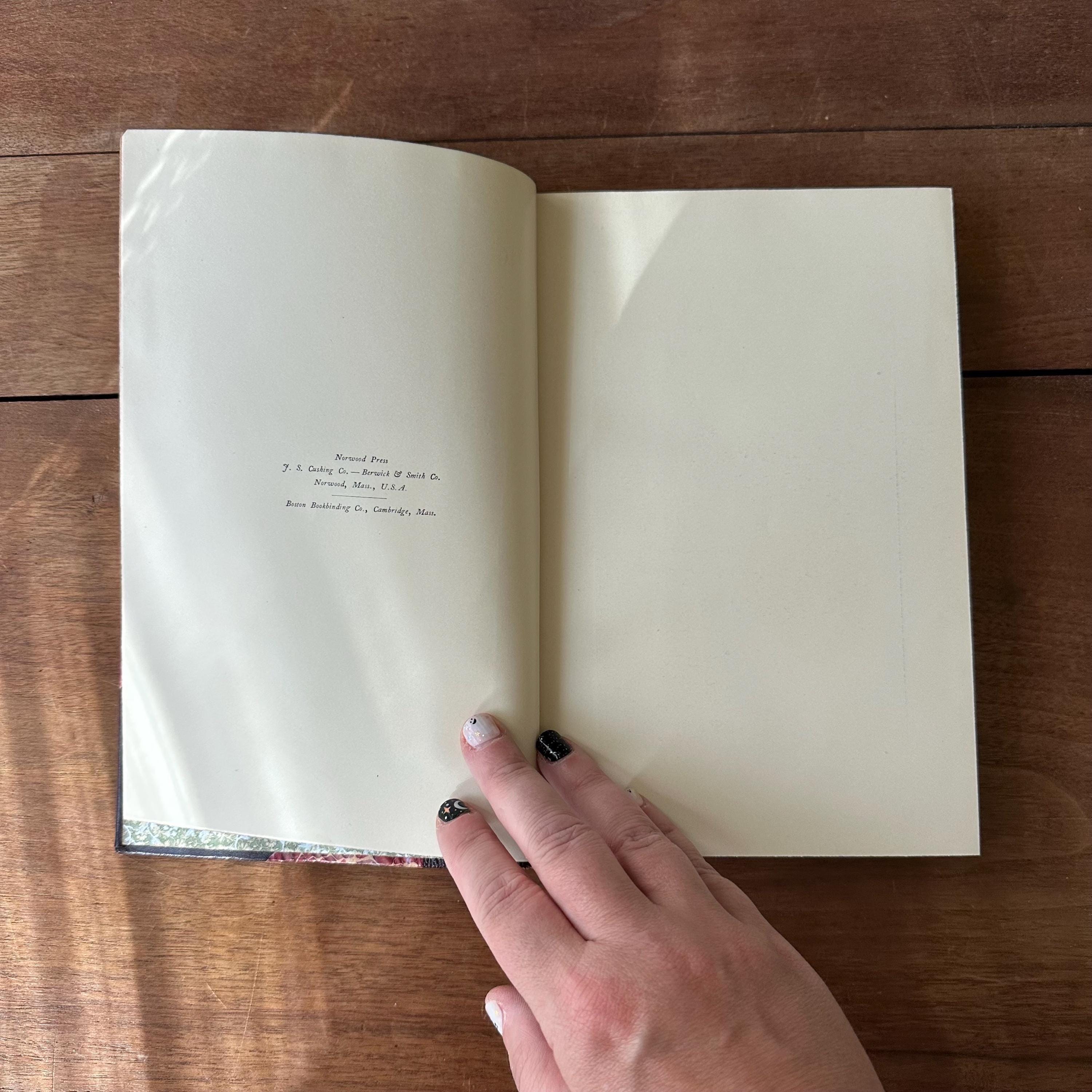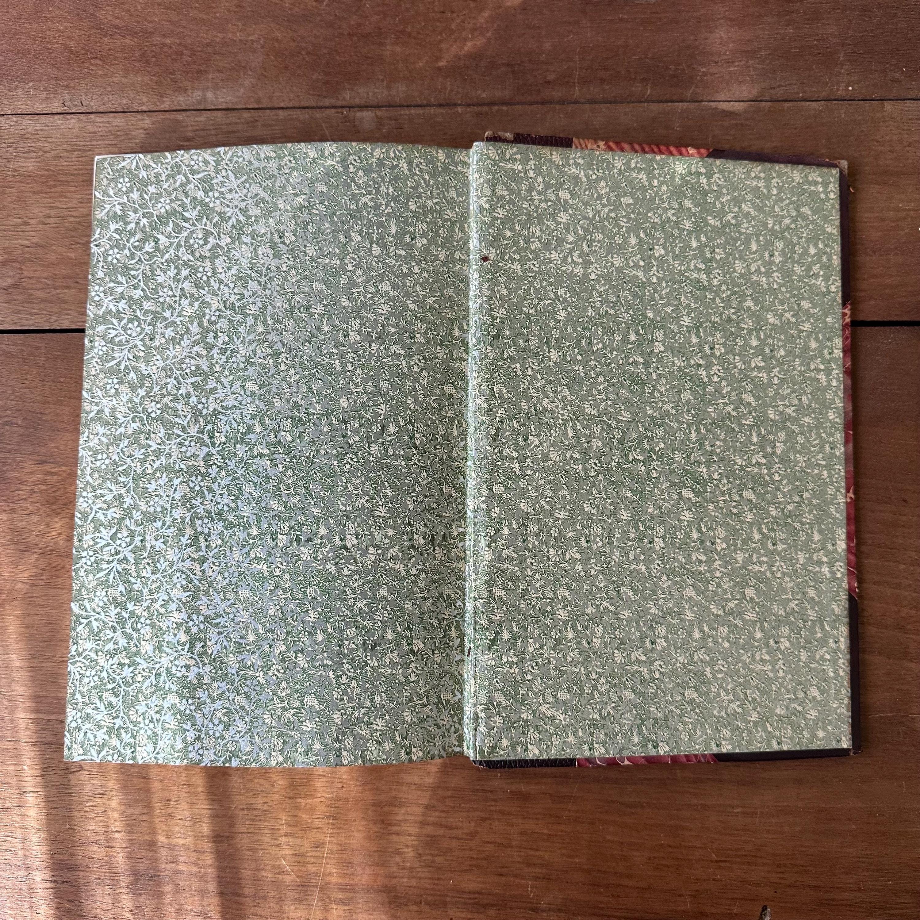 The book is in antique condition for its age and use. The covers have general wear with most wear to the spine. The leather of the spine is cracking at the bottom and has some areas missing, especially where the flowers are. There’s potential it could completely separate during shipping. The covers are attached at the spine at both front and back. The pages have yellowed.