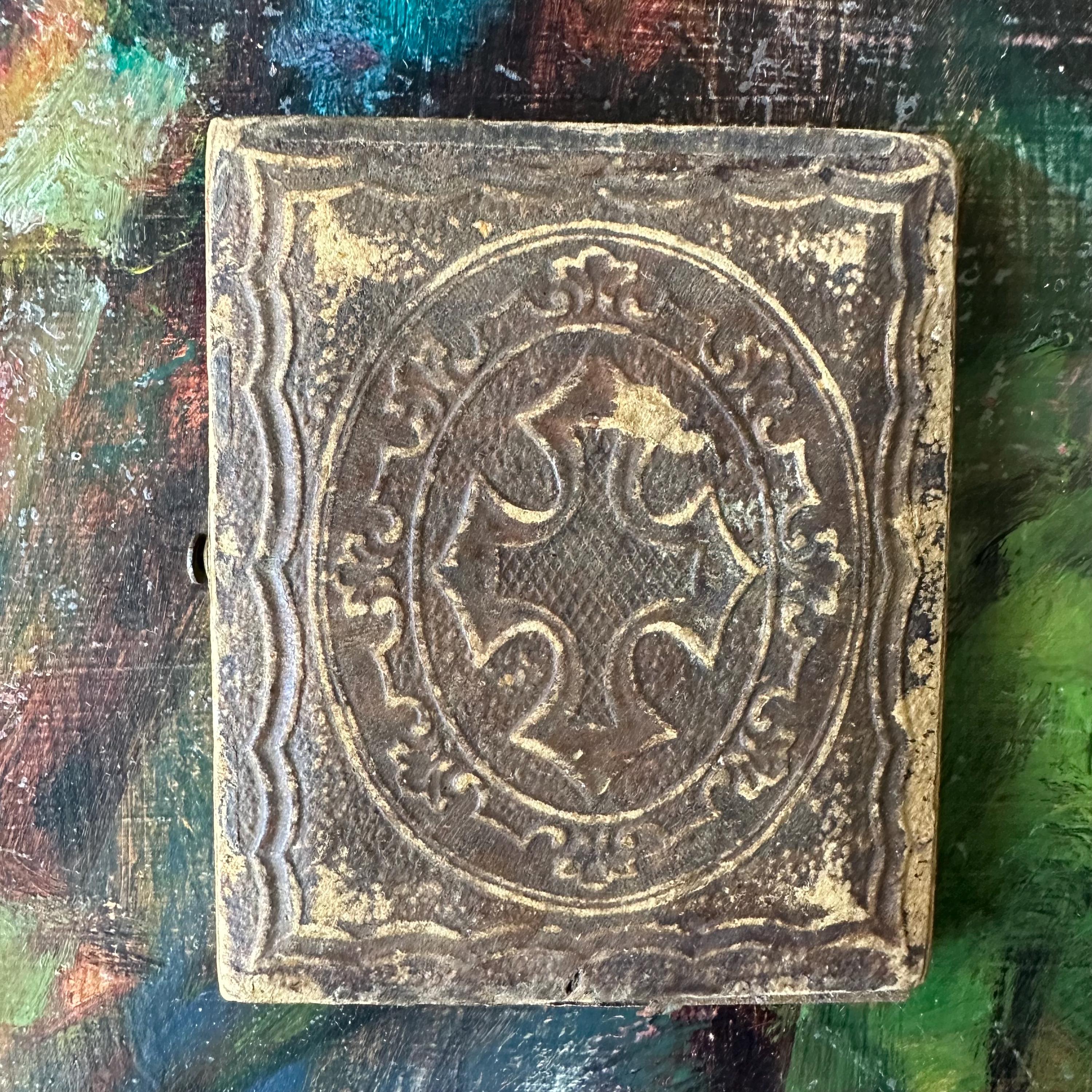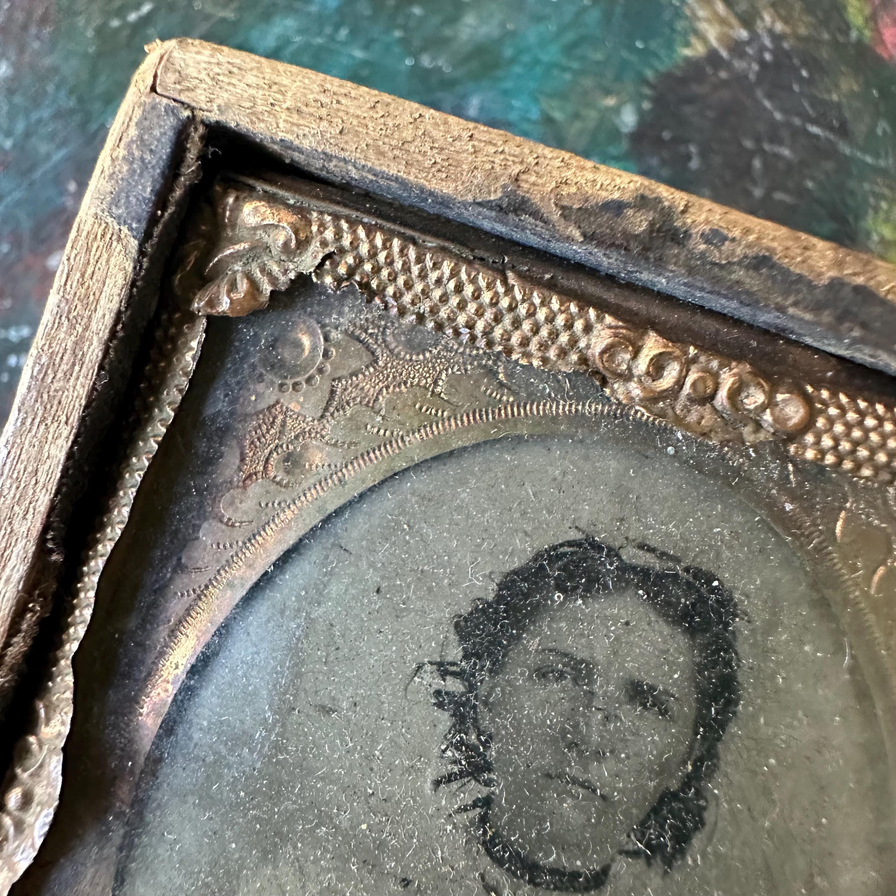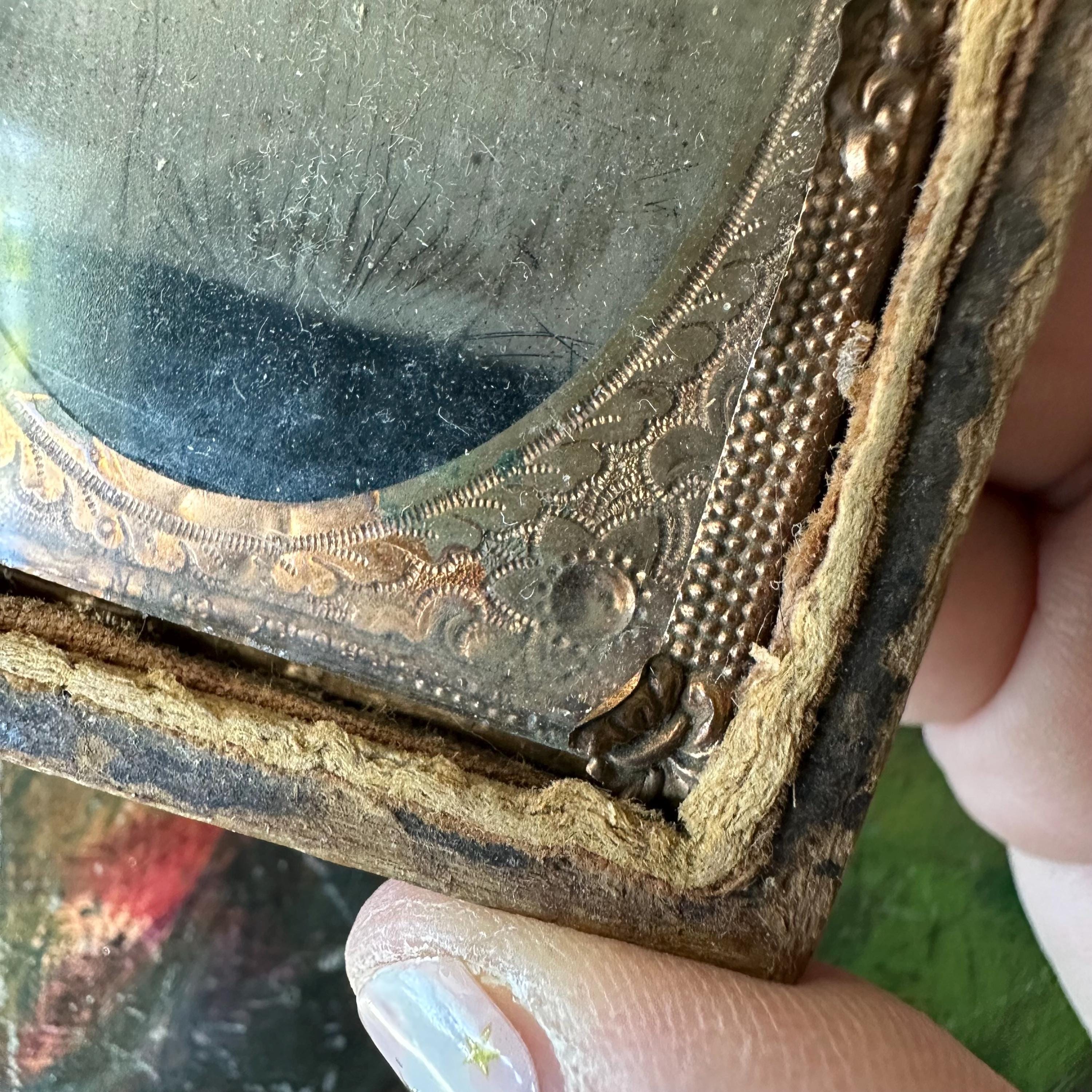 The case and photograph are in antique condition. The photograph is offset in the frame so that the bottom black border can be seen along with the left edge of the photo. The brass mat and border are tarnished and discolored. The bottom edge of the brass frame is missing. The daguerrotype case is only the right side; the left side is missing. The leather has mostly worn away on the case, exposing the wood underneath.