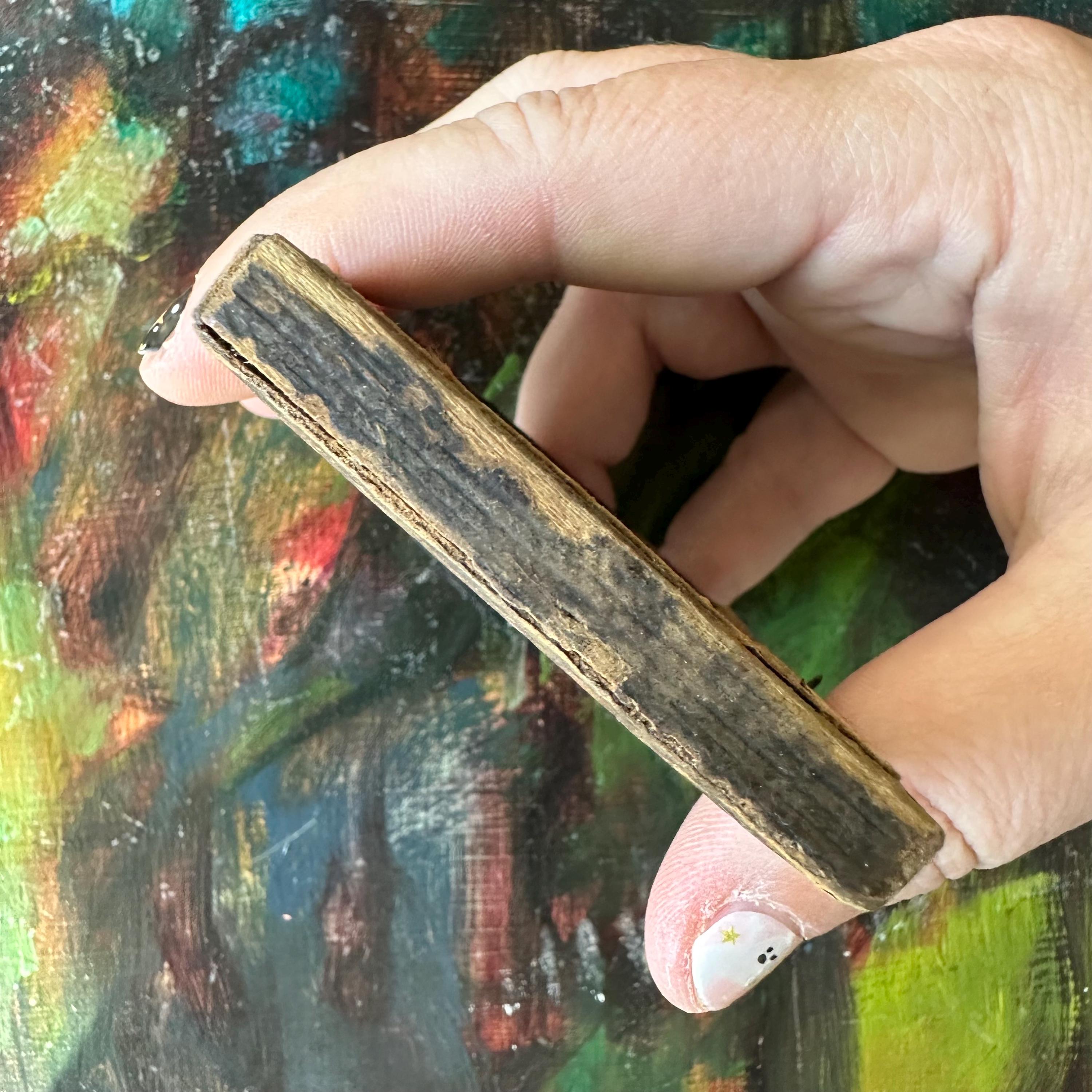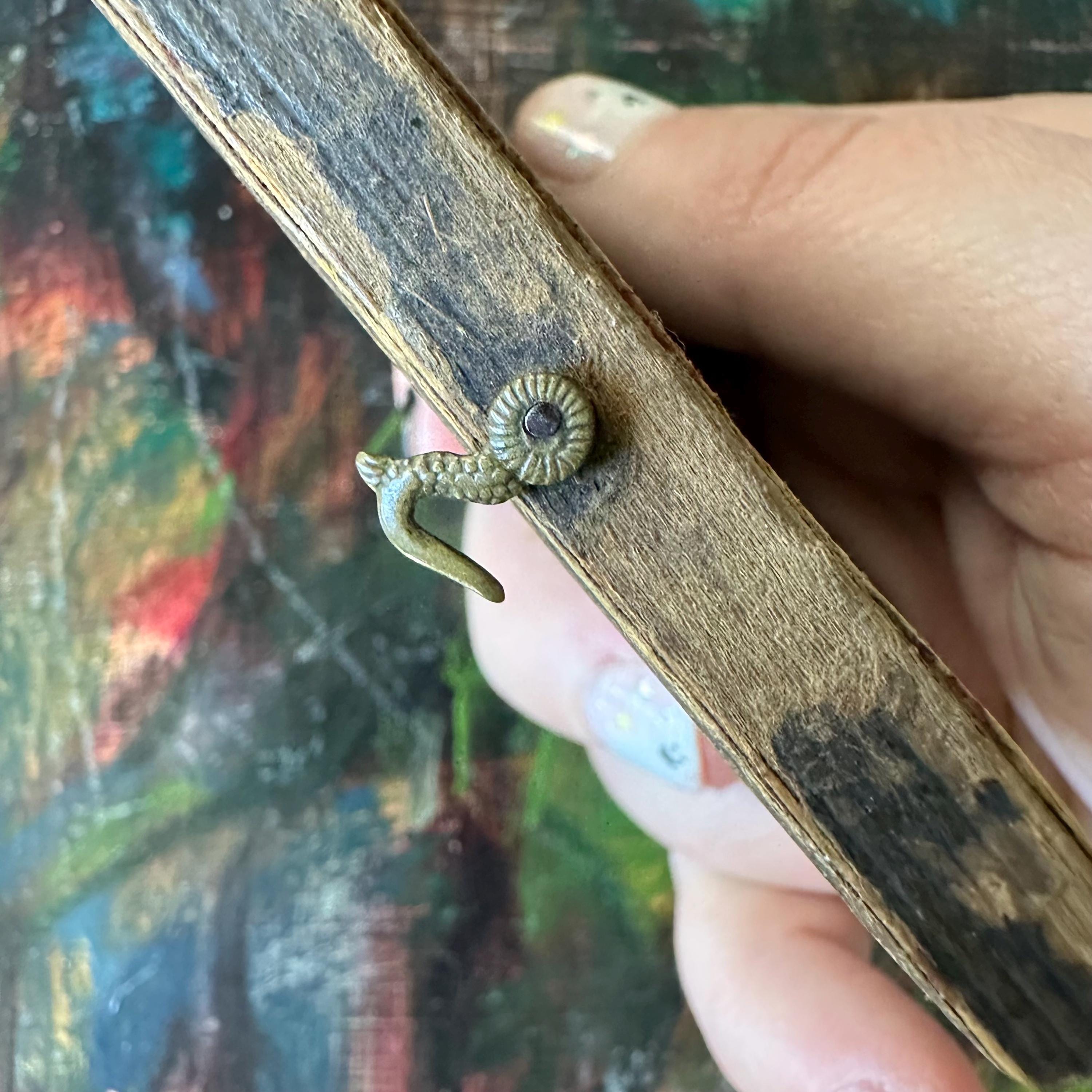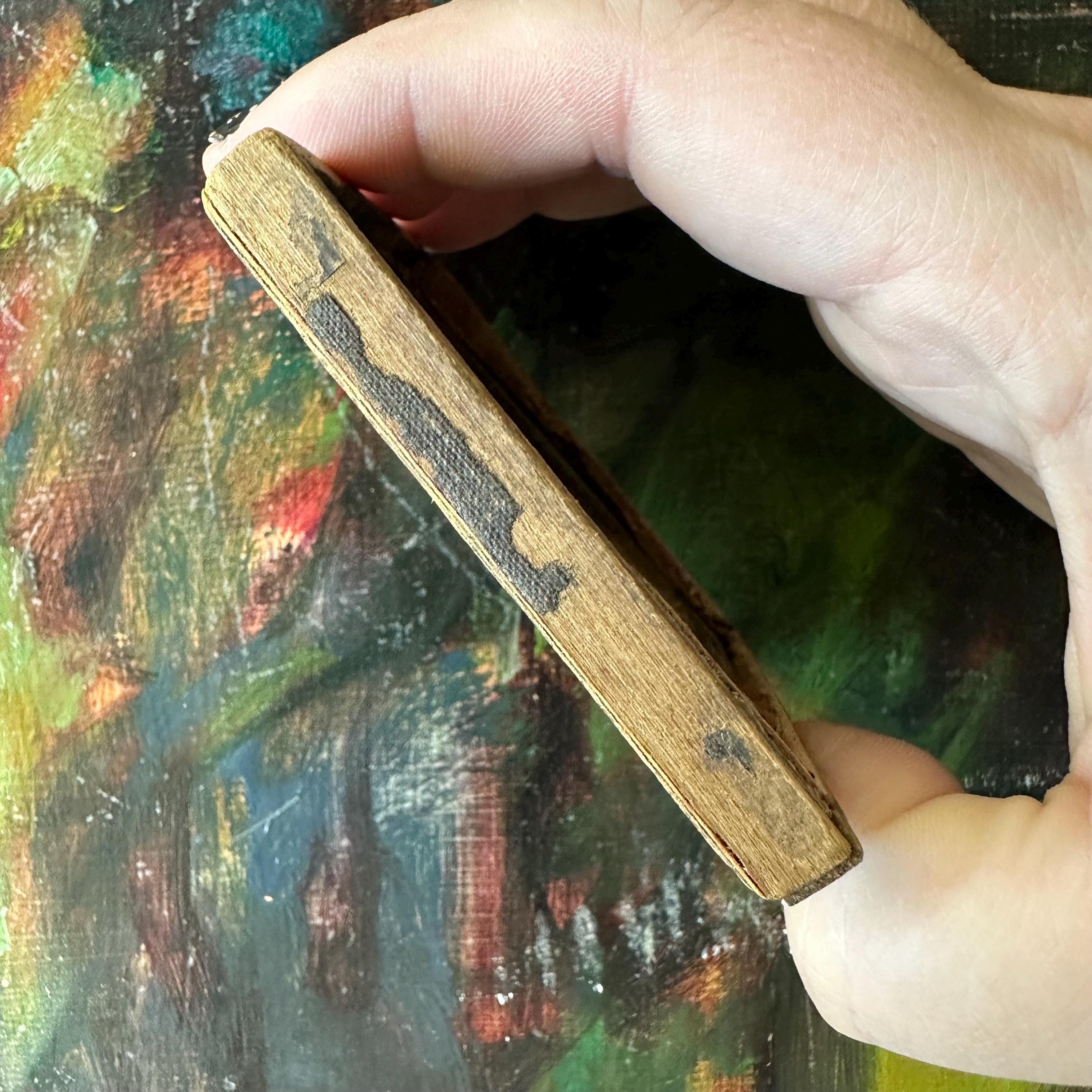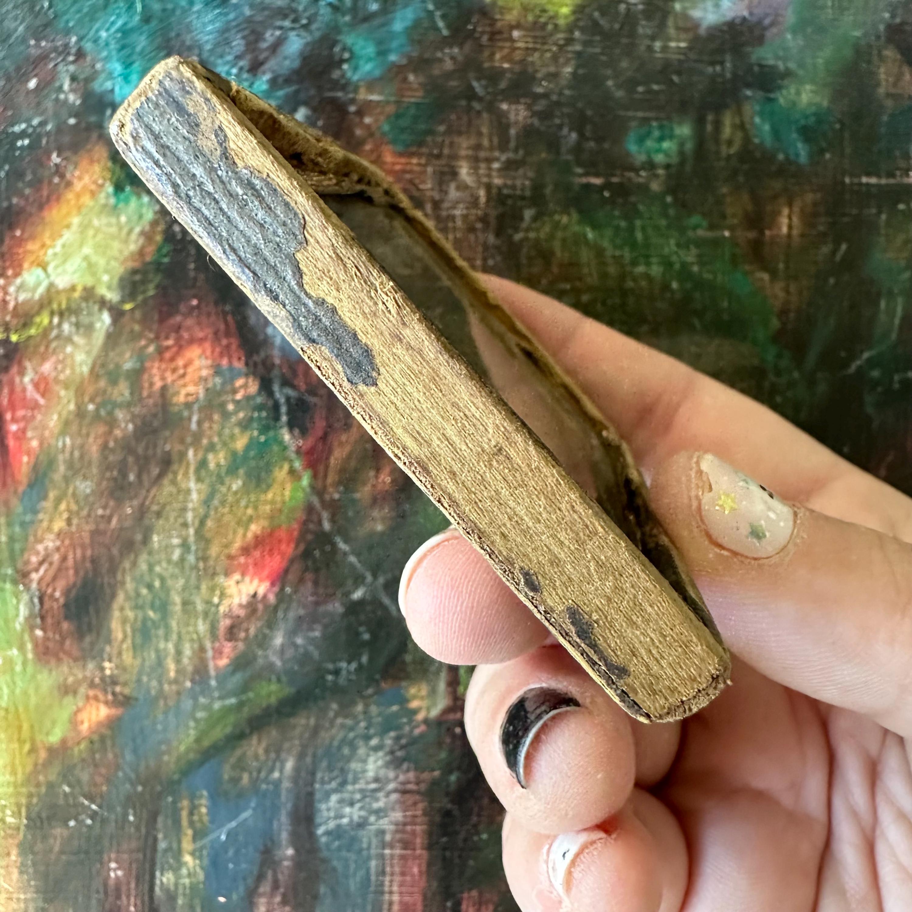 The case and photograph are in antique condition. The photograph is offset in the frame so that the bottom black border can be seen along with the left edge of the photo. The brass mat and border are tarnished and discolored. The bottom edge of the brass frame is missing. The daguerrotype case is only the right side; the left side is missing. The leather has mostly worn away on the case, exposing the wood underneath.