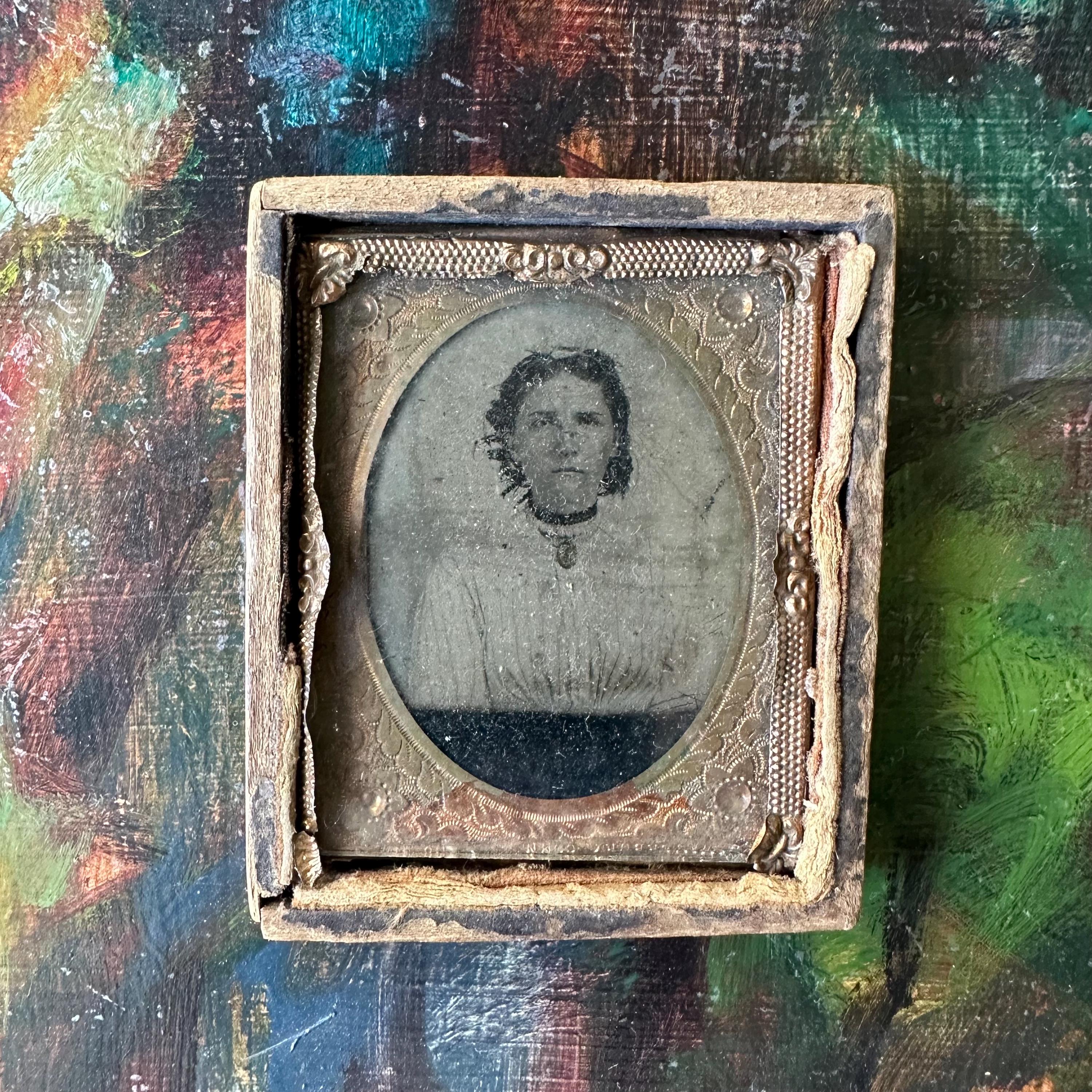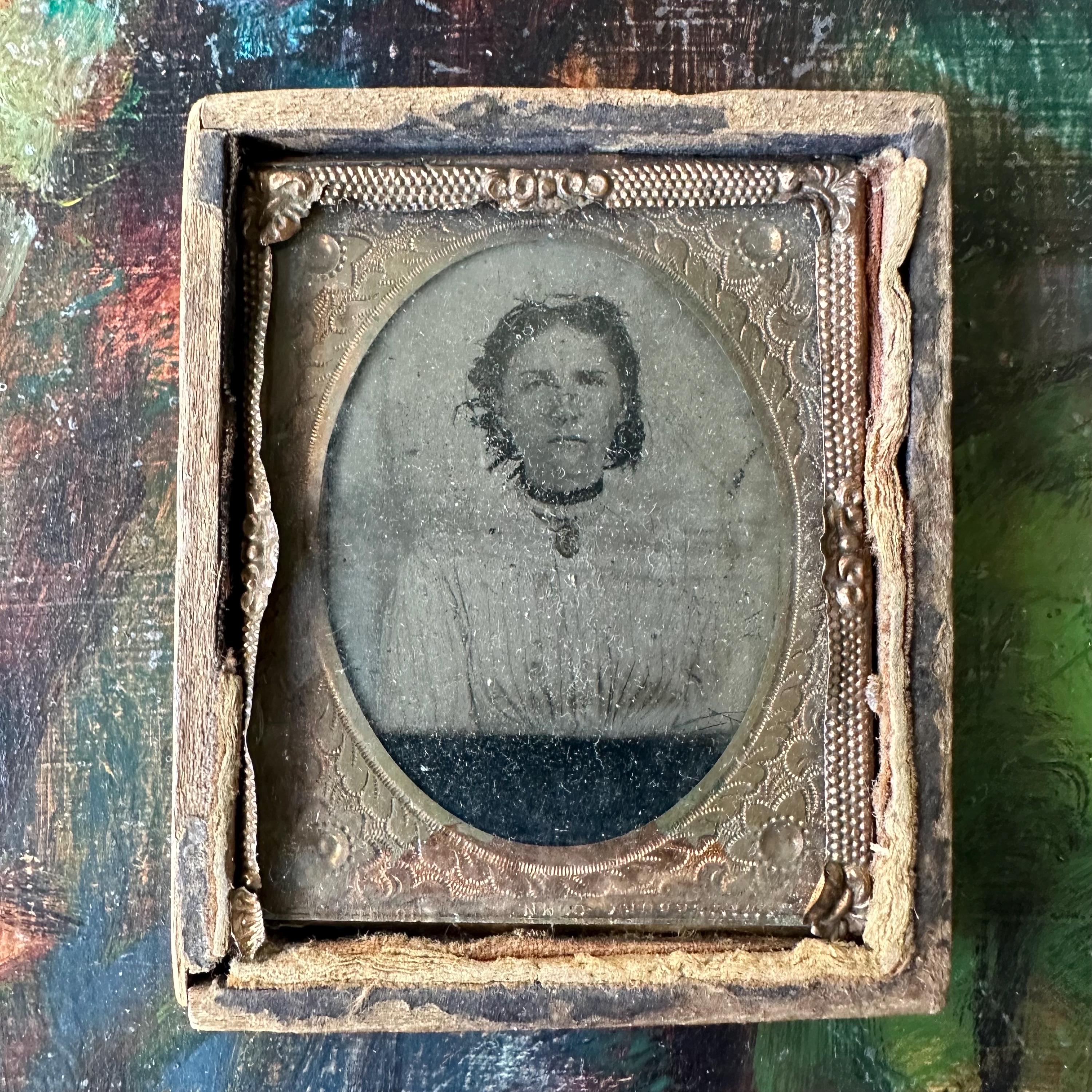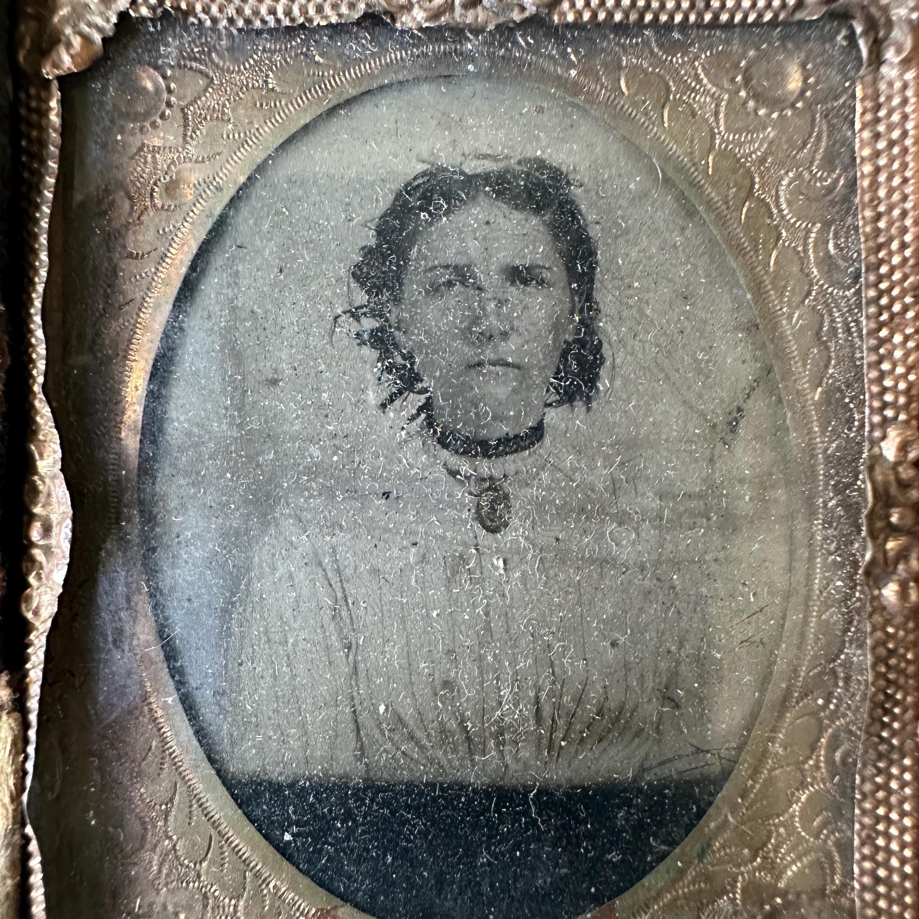 This is a tintype portrait photograph of a young woman in a daguerreotype case. The photograph looks to be a tintype of a young woman with dark hair in a white dress. The tintype is under a brass matt with floral etched designs. The glass plate is under a brass border with more floral details. The portrait is in a daguerreotype wood case that's wrapped in leather and embossed with a geometric cross pattern. There is a small metal hook on the right side.