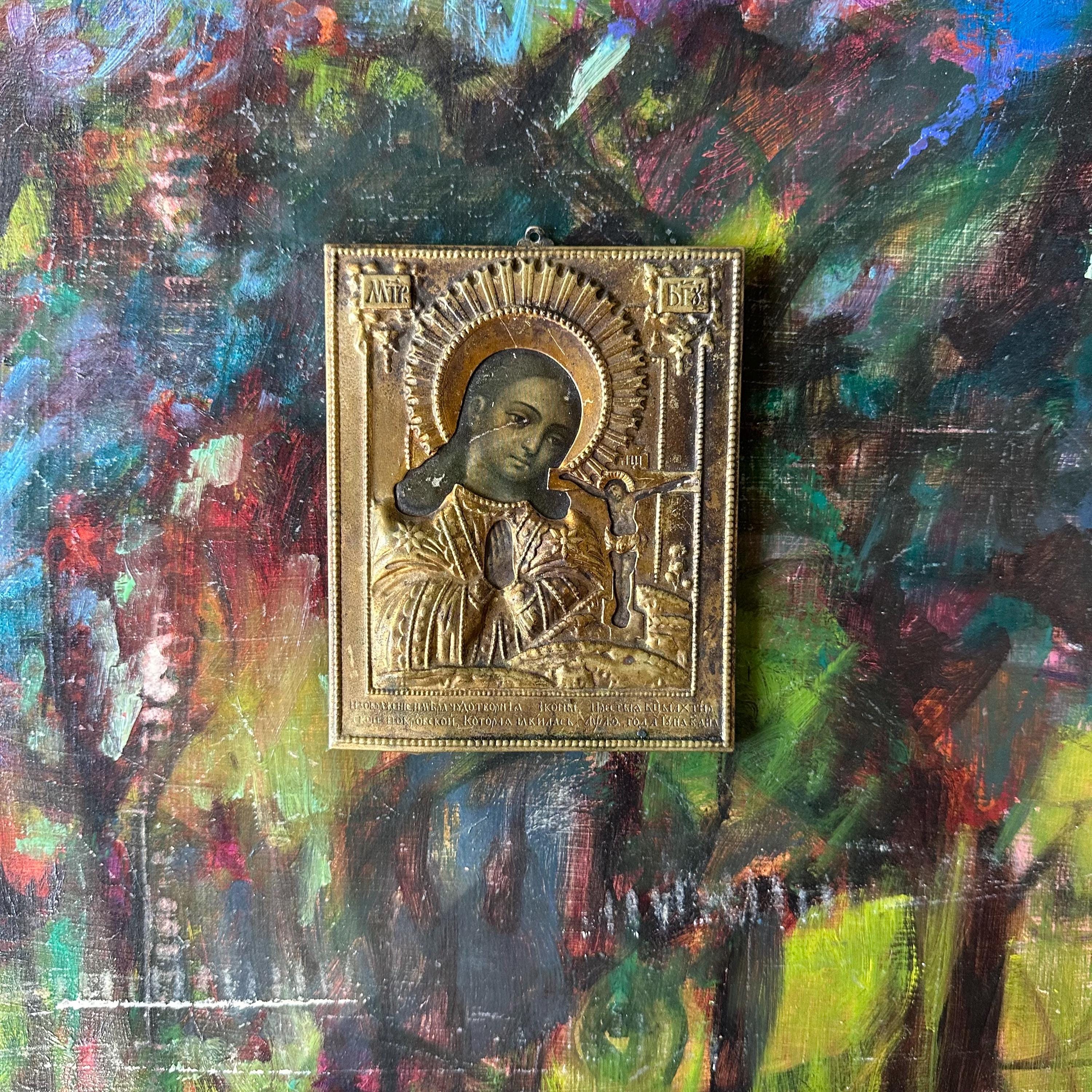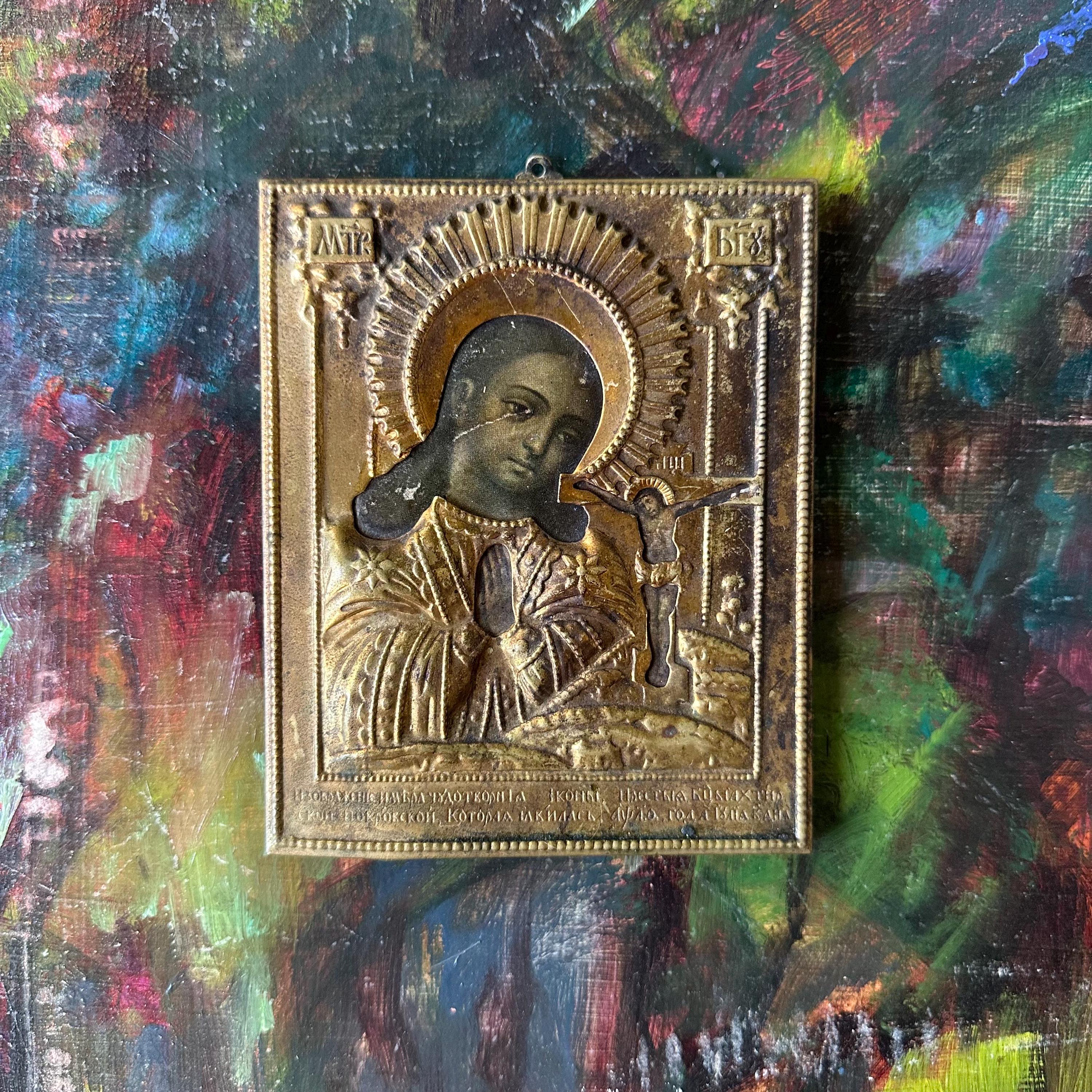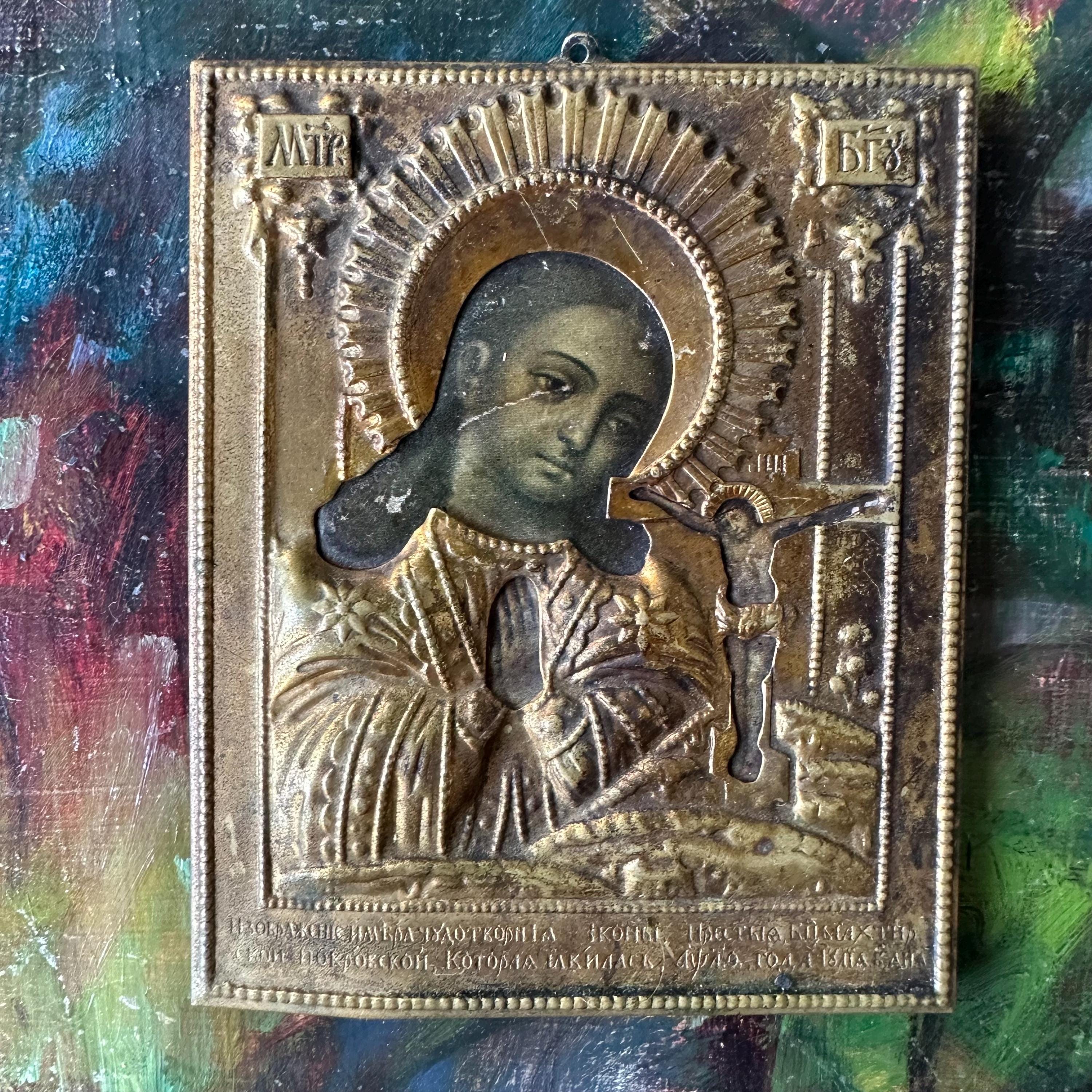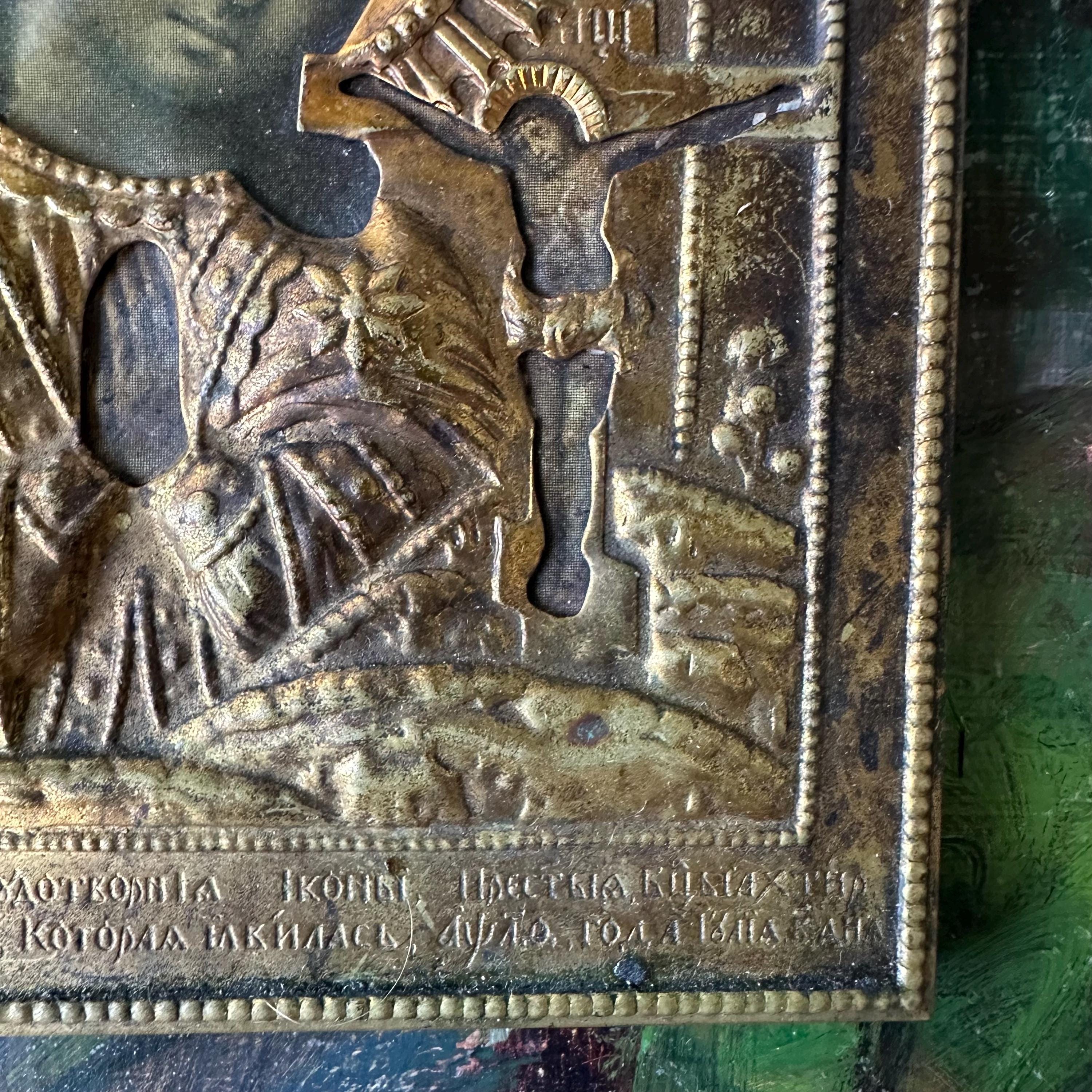 This is a Russian brass engraved icon featuring Mary and Jesus. The icon has a print of Mary looking down on a crucified Jesus in gray and black. This is overlaid with a riza or brass metal cover that is molded and embossed to look 3D. The brass is engraved with MTR in the upper left corner, which is Russian for Mother of God and BRB or God in the right corner. The bottom is also engraved with Russian. The back is covered in cardboard and held in by brass tabs. At the top of icon is a small brass tab with a hole in the center to hang up the icon.