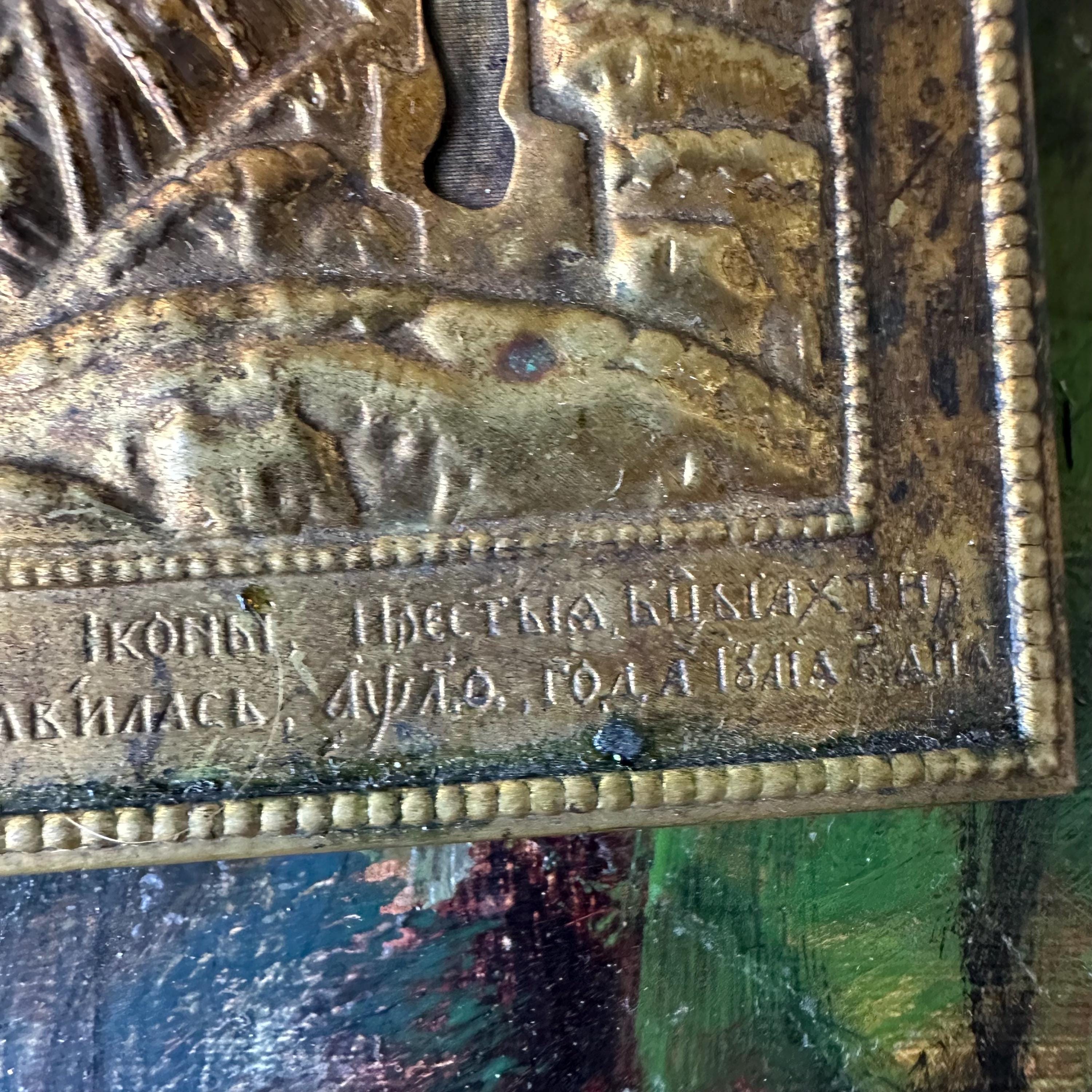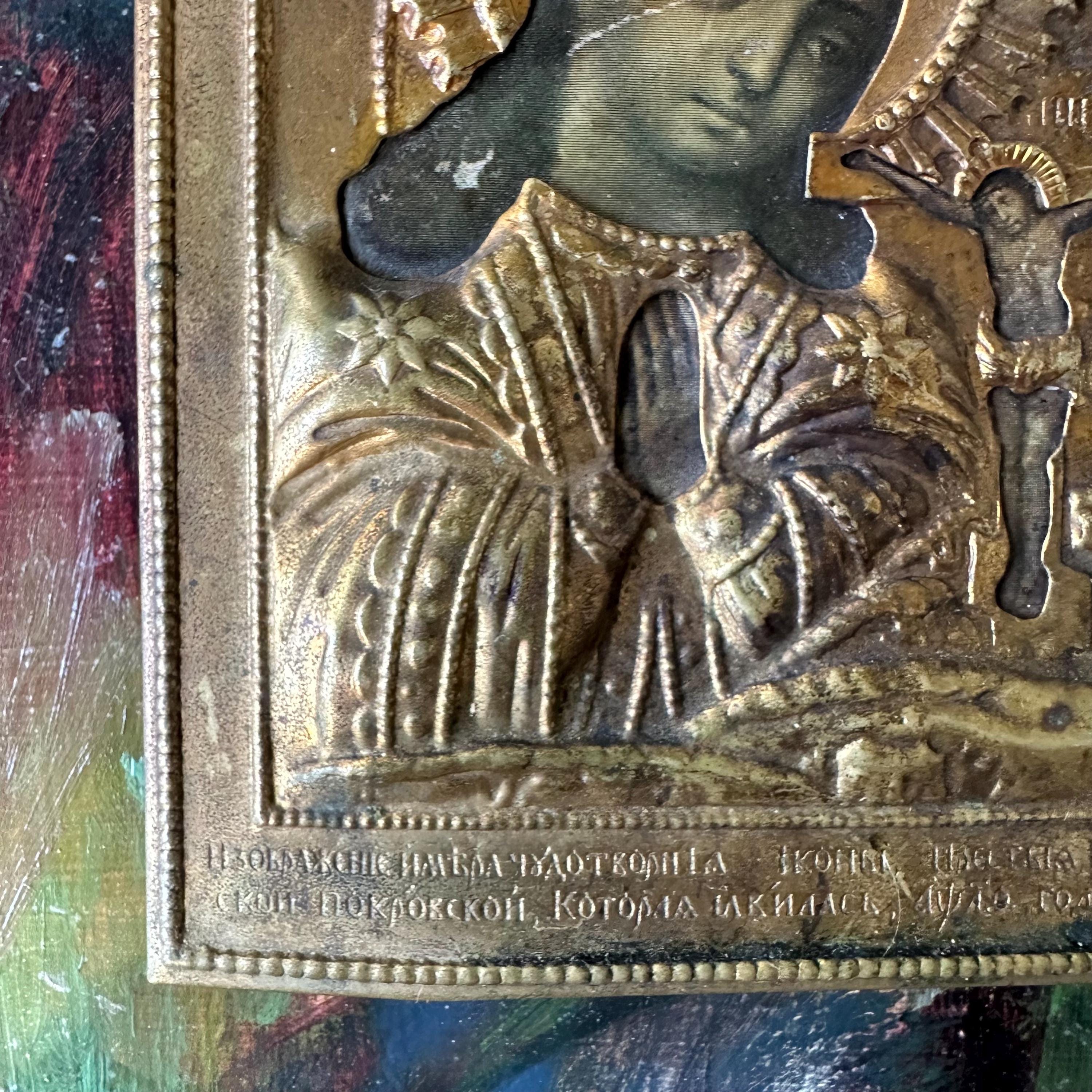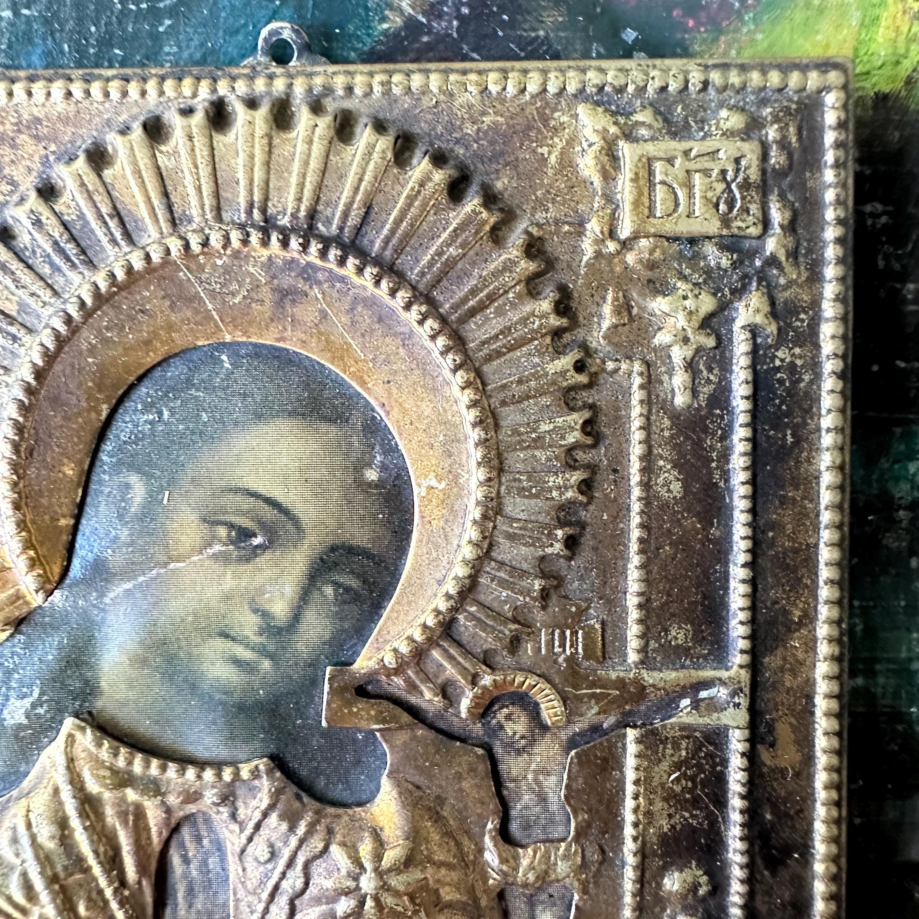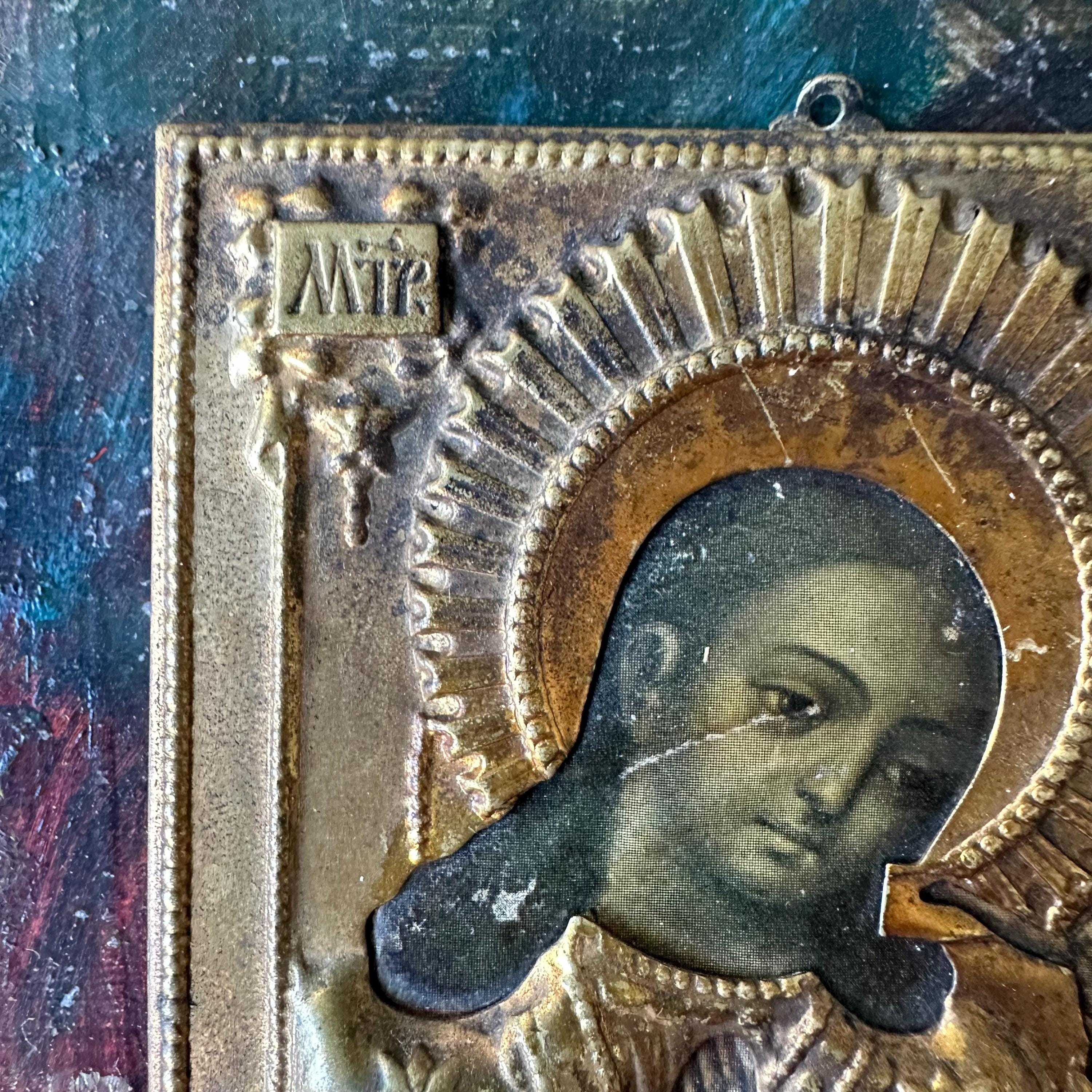 The icon is in good vintage or antique condition for its age and use. The print has some discoloration and scratch through Mary's left side. The brass has some tarnishing and discoloration. The bottom left corner side has bent.