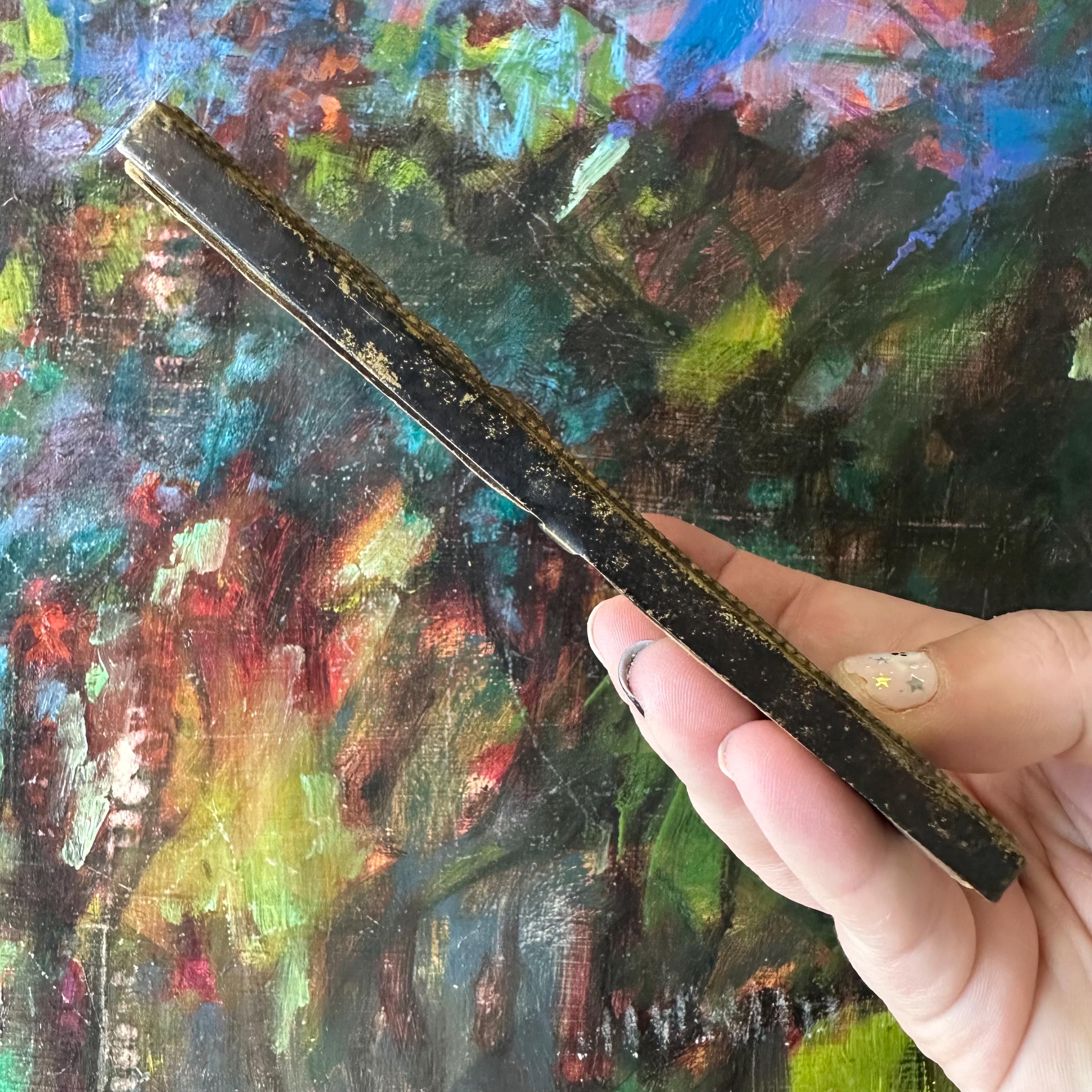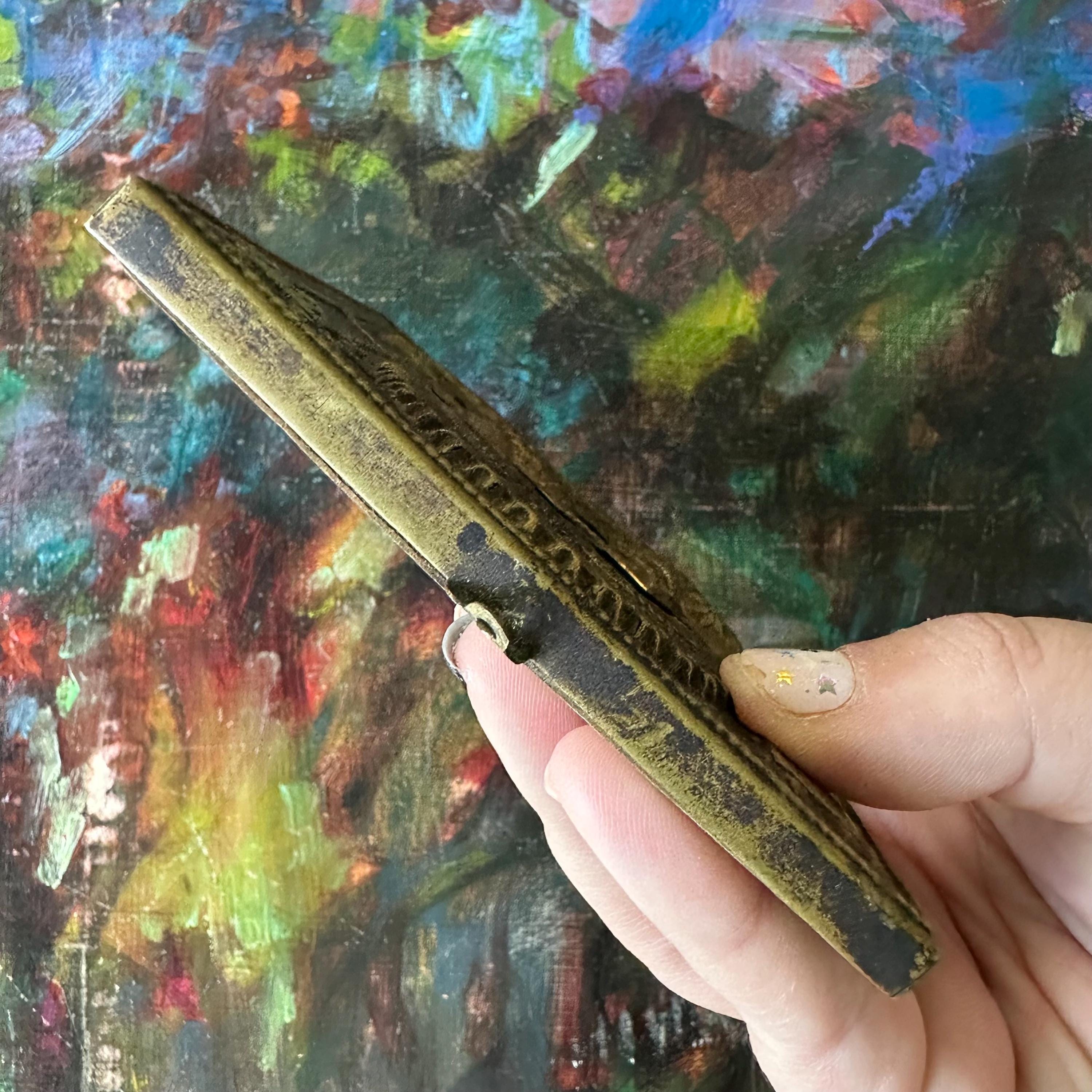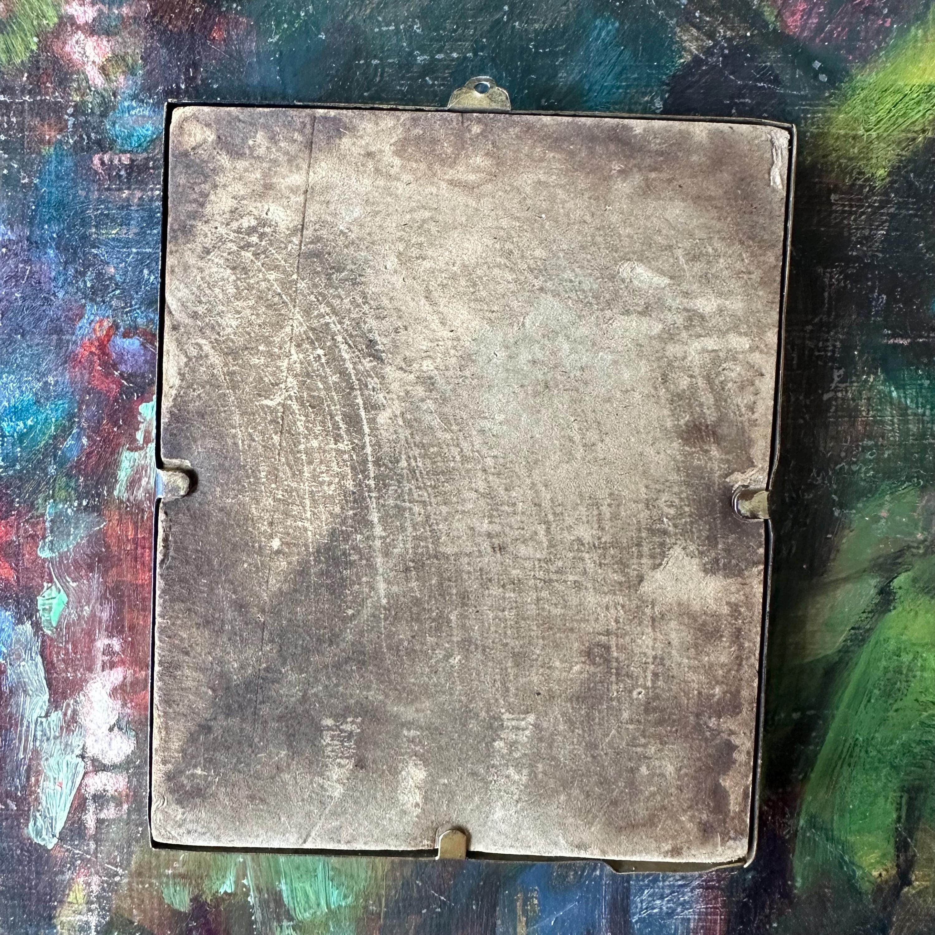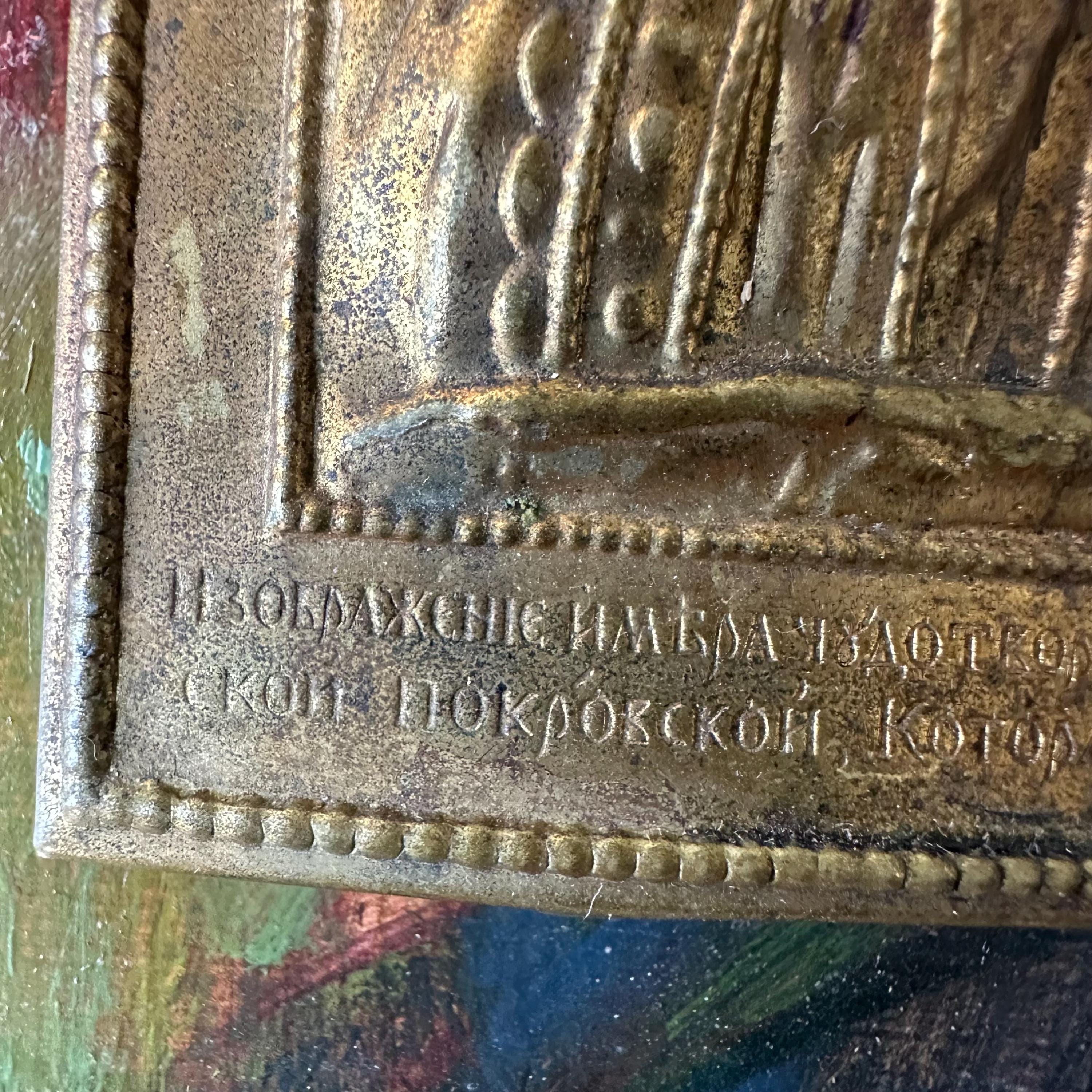 The icon is in good vintage or antique condition for its age and use. The print has some discoloration and scratch through Mary's left side. The brass has some tarnishing and discoloration. The bottom left corner side has bent.
