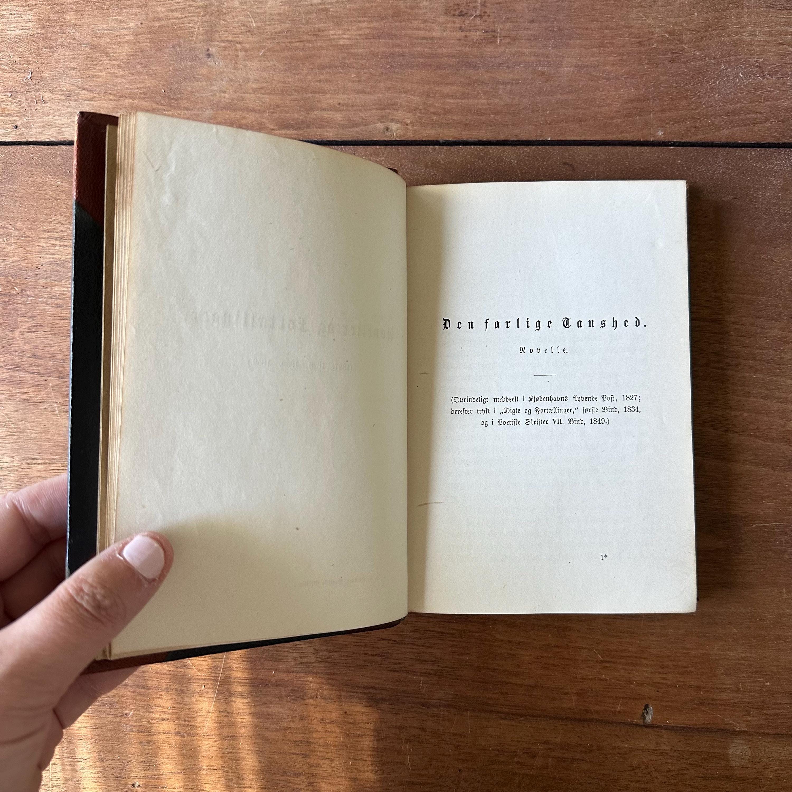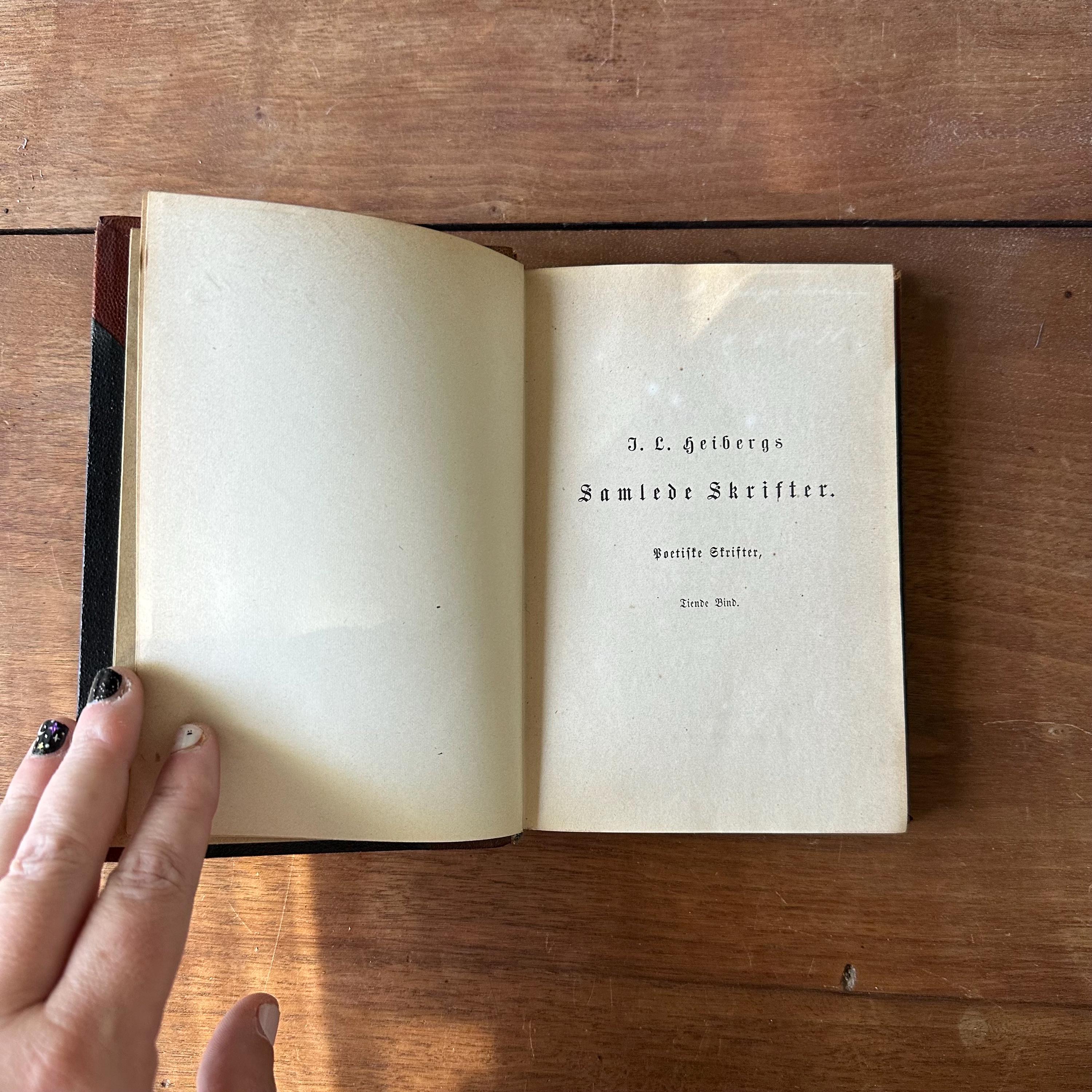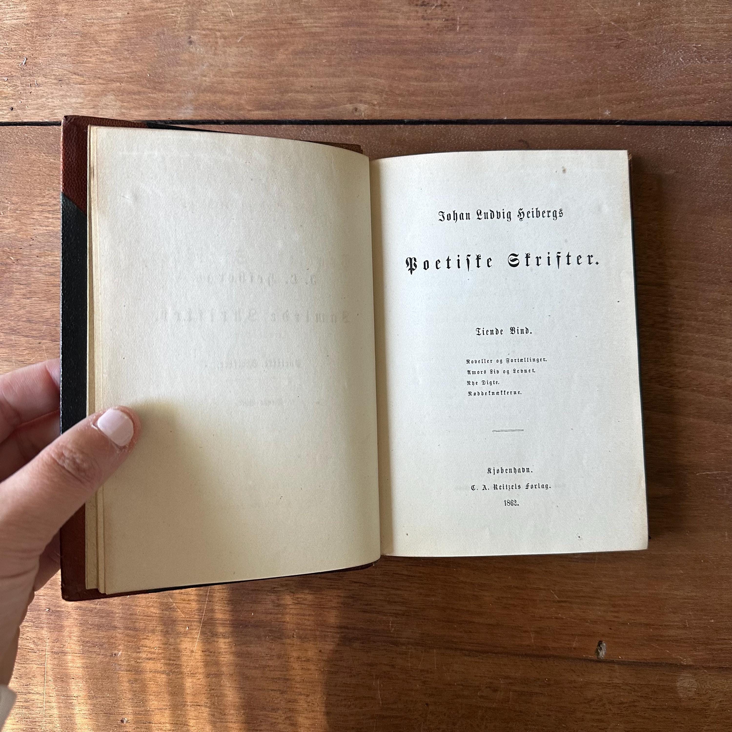 This is the antique 1862 Danish language edition of Johan Ludvig Heiberg's Poetiske Skrifter, published by C.A. Reitzels Forlag. It has black leather covers with brown leather corners and spine. The spine is lettered and decorated with a theater mask and cherub holding vines in gold. The endpapers are a feathered beige. The text is printed with a gothic script. There are 387 pages.
