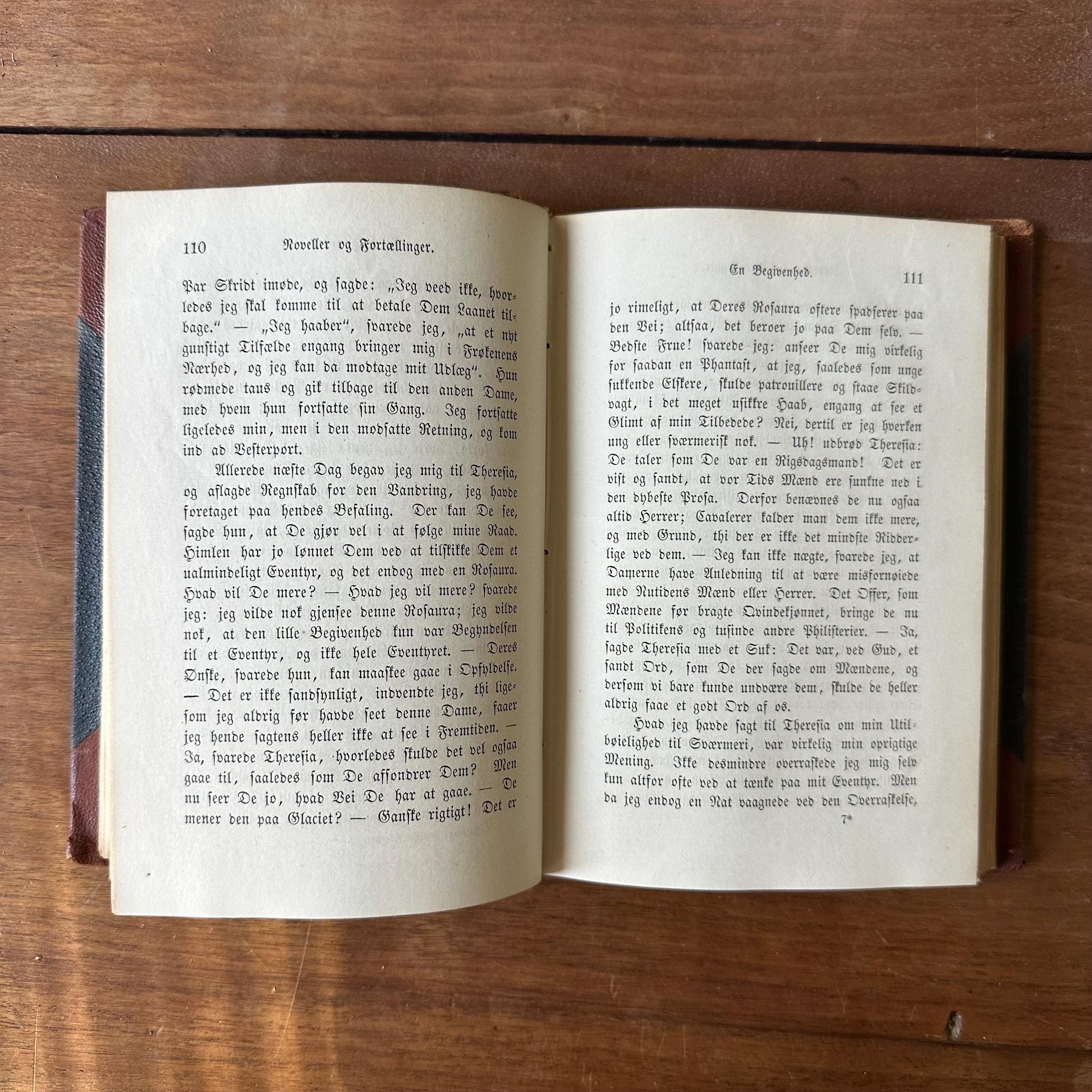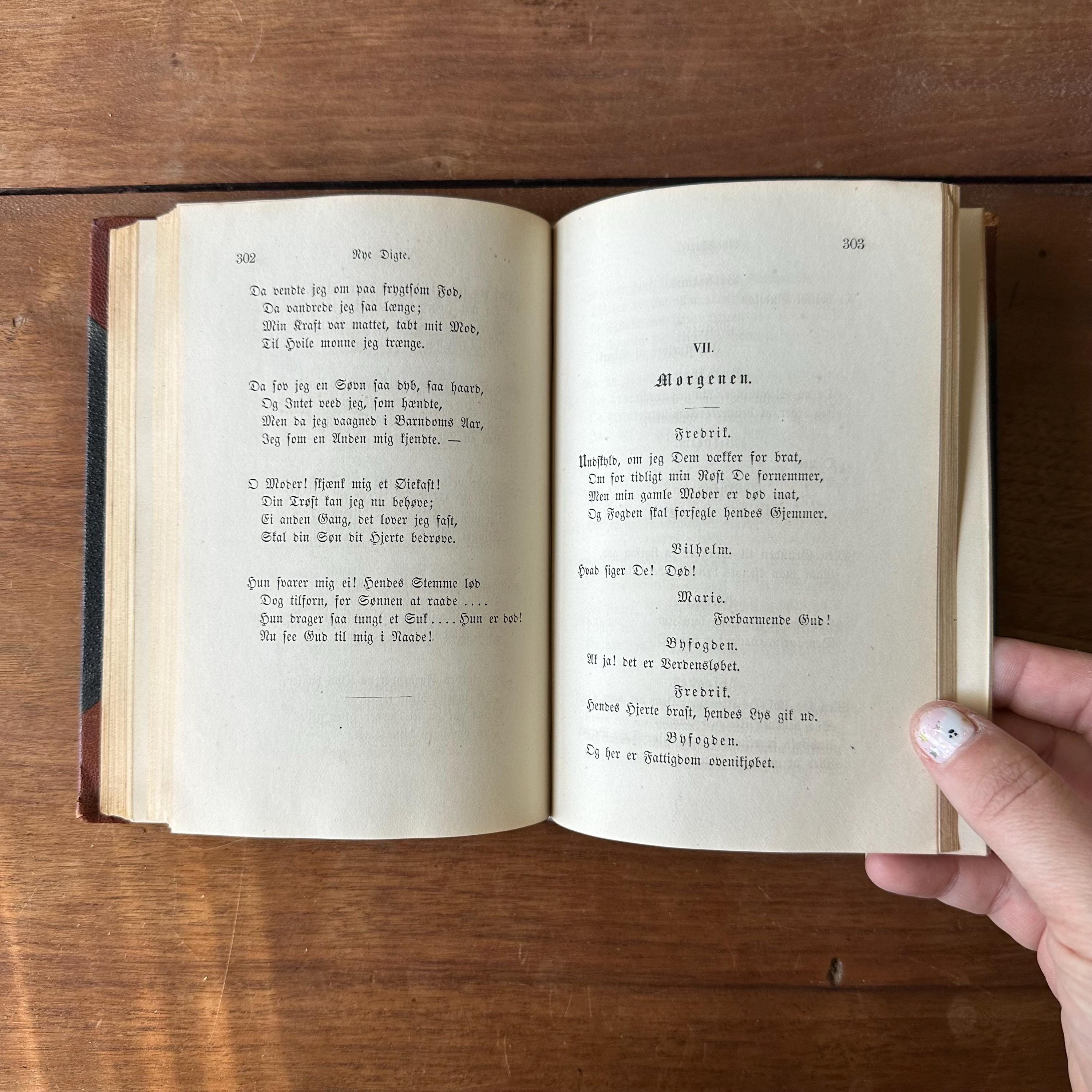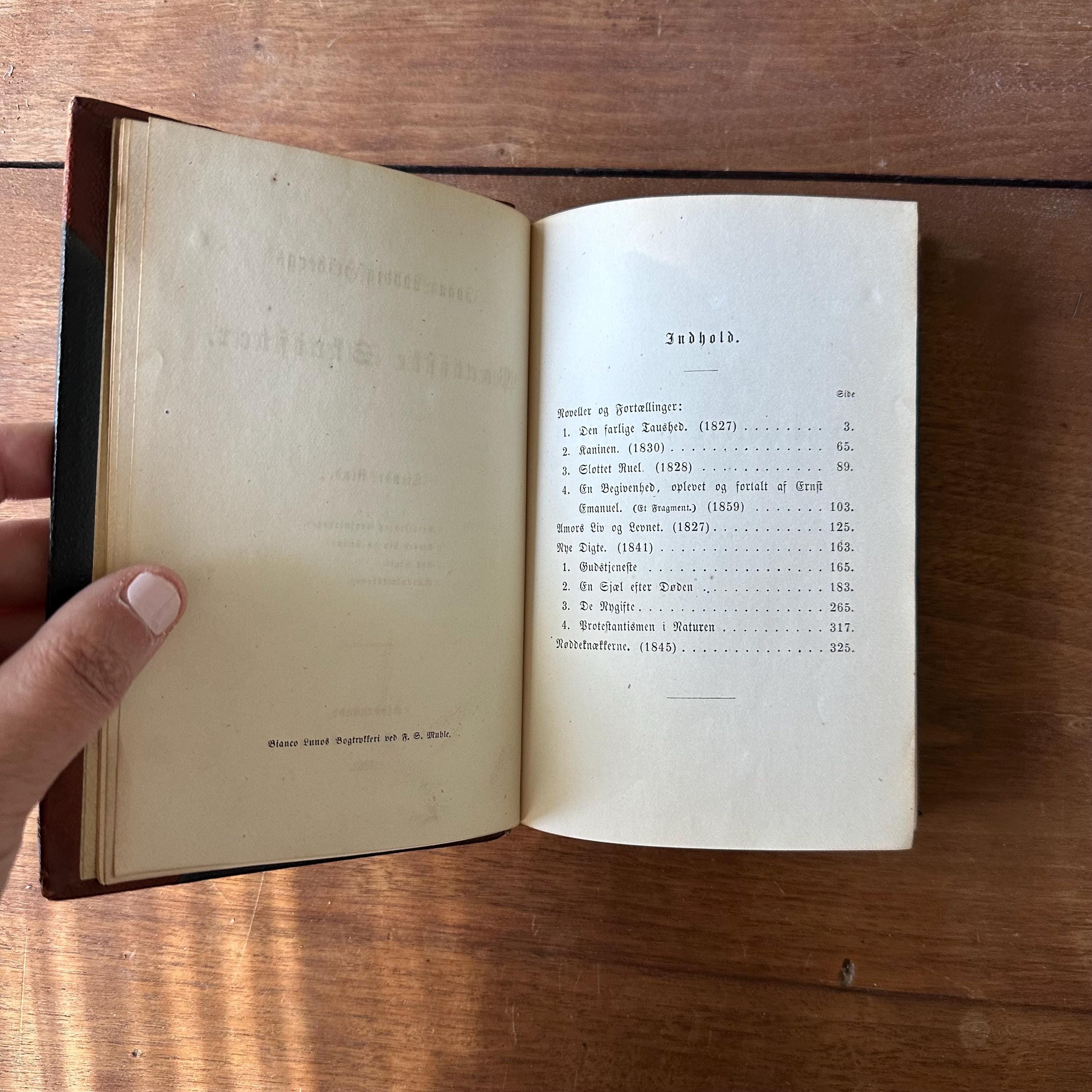 This is the antique 1862 Danish language edition of Johan Ludvig Heiberg's Poetiske Skrifter, published by C.A. Reitzels Forlag. It has black leather covers with brown leather corners and spine. The spine is lettered and decorated with a theater mask and cherub holding vines in gold. The endpapers are a feathered beige. The text is printed with a gothic script. There are 387 pages.