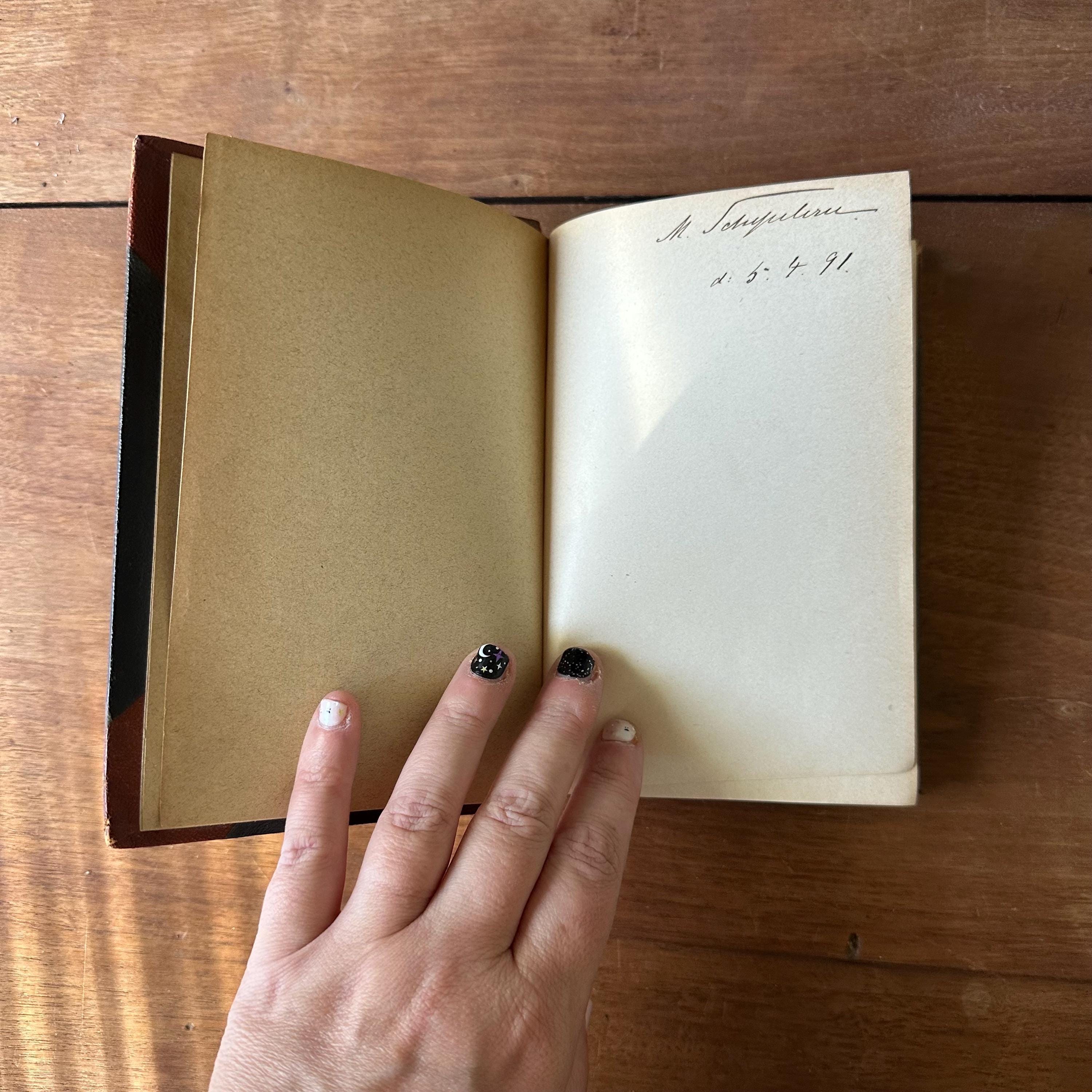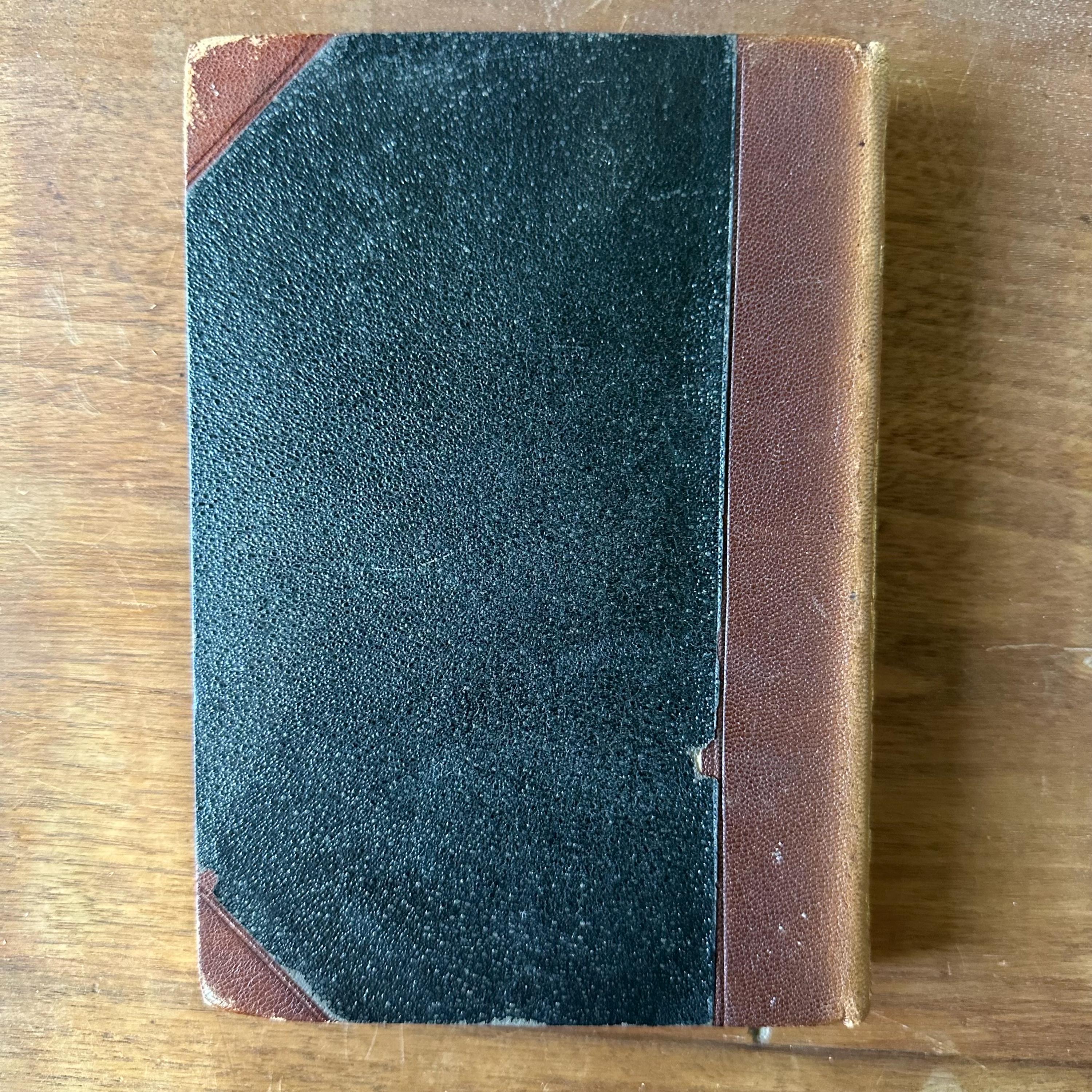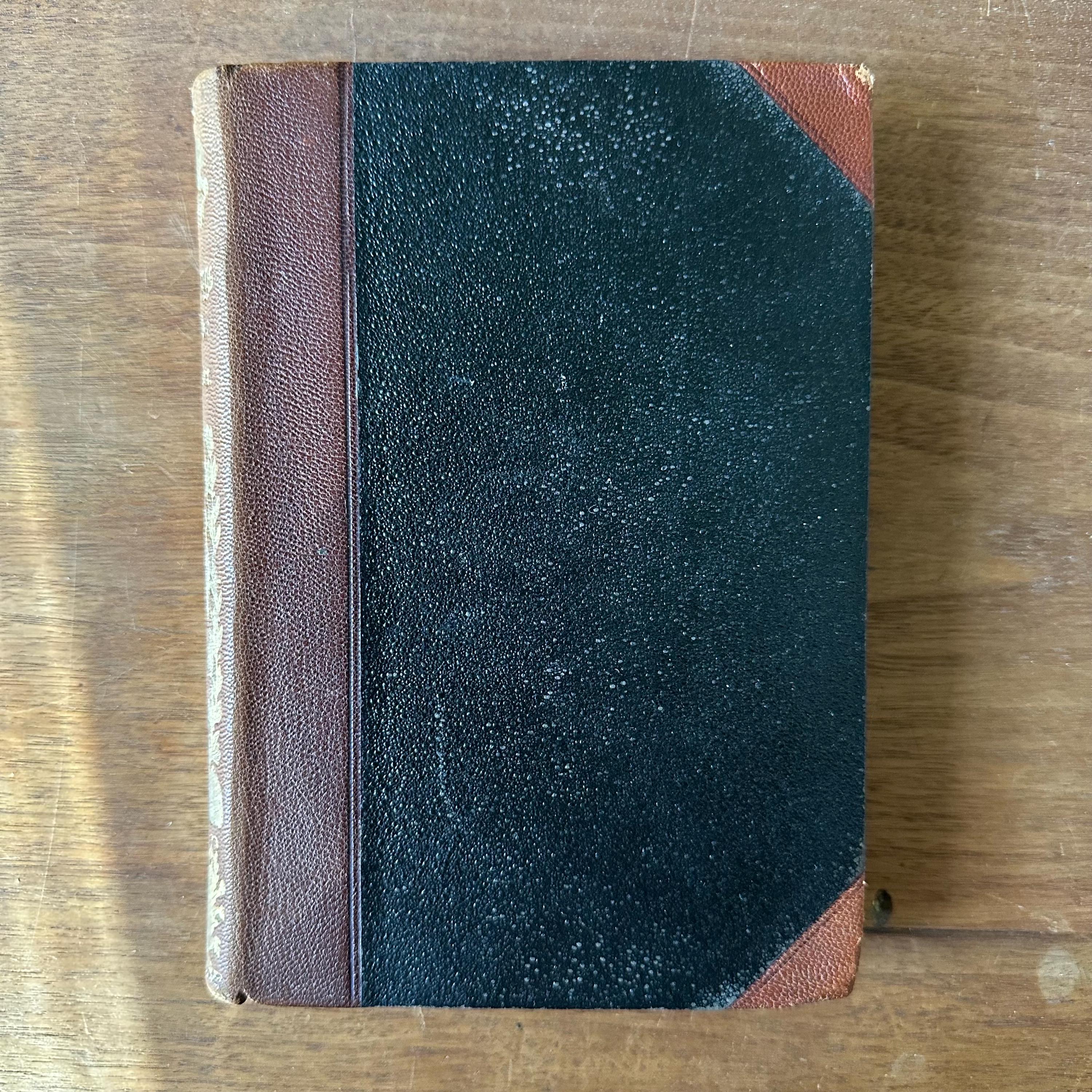 The book is in good antique condition for its age and use. The covers have minimal wear, except for the top right corner which has a scuff. The back right corner is also scuffed, and there is a very small piece of the black leather missing where it meets the spine at the back cover. The back cover has started to detach from the spine at the inside. The front is still attached. The pages are only minimally yellowed.
