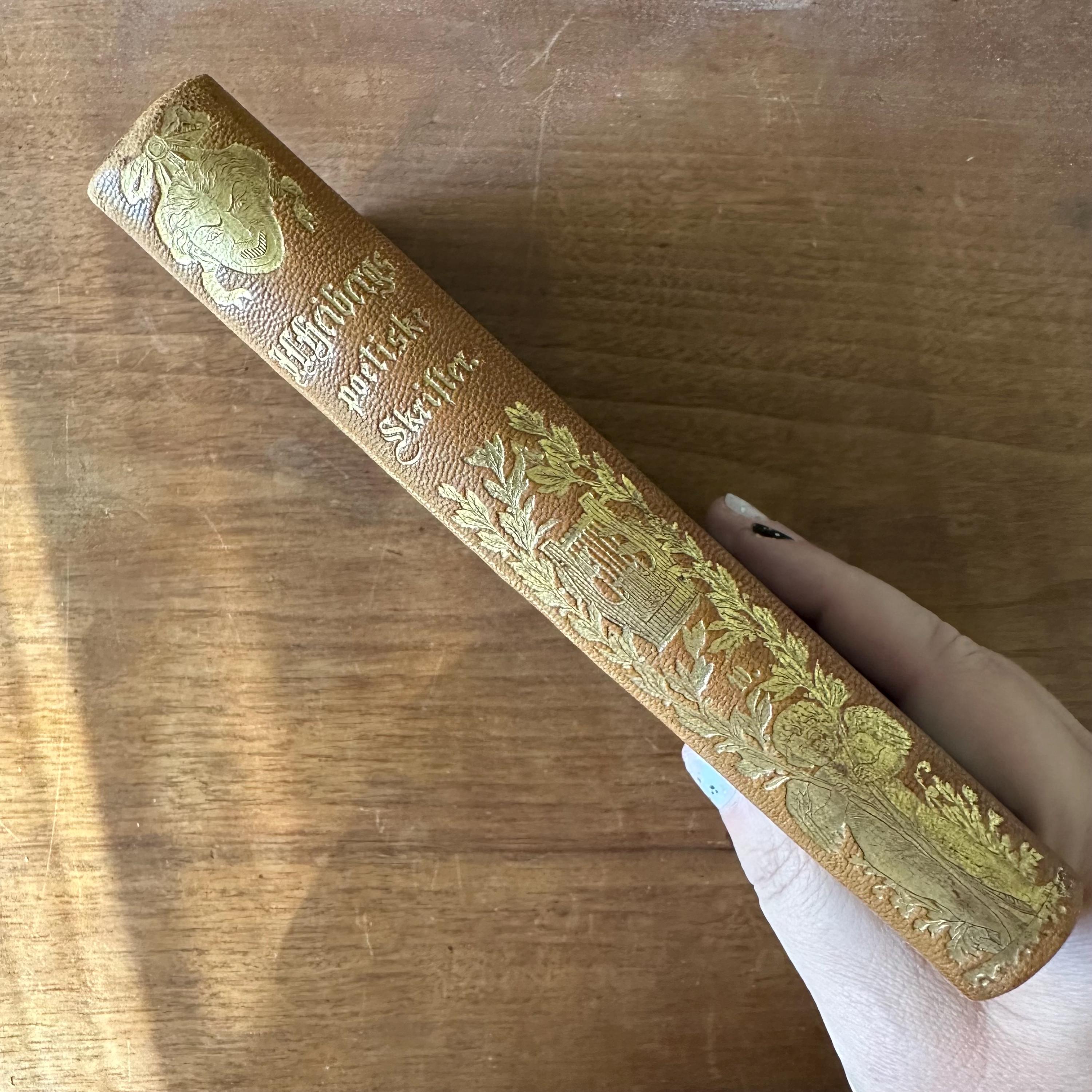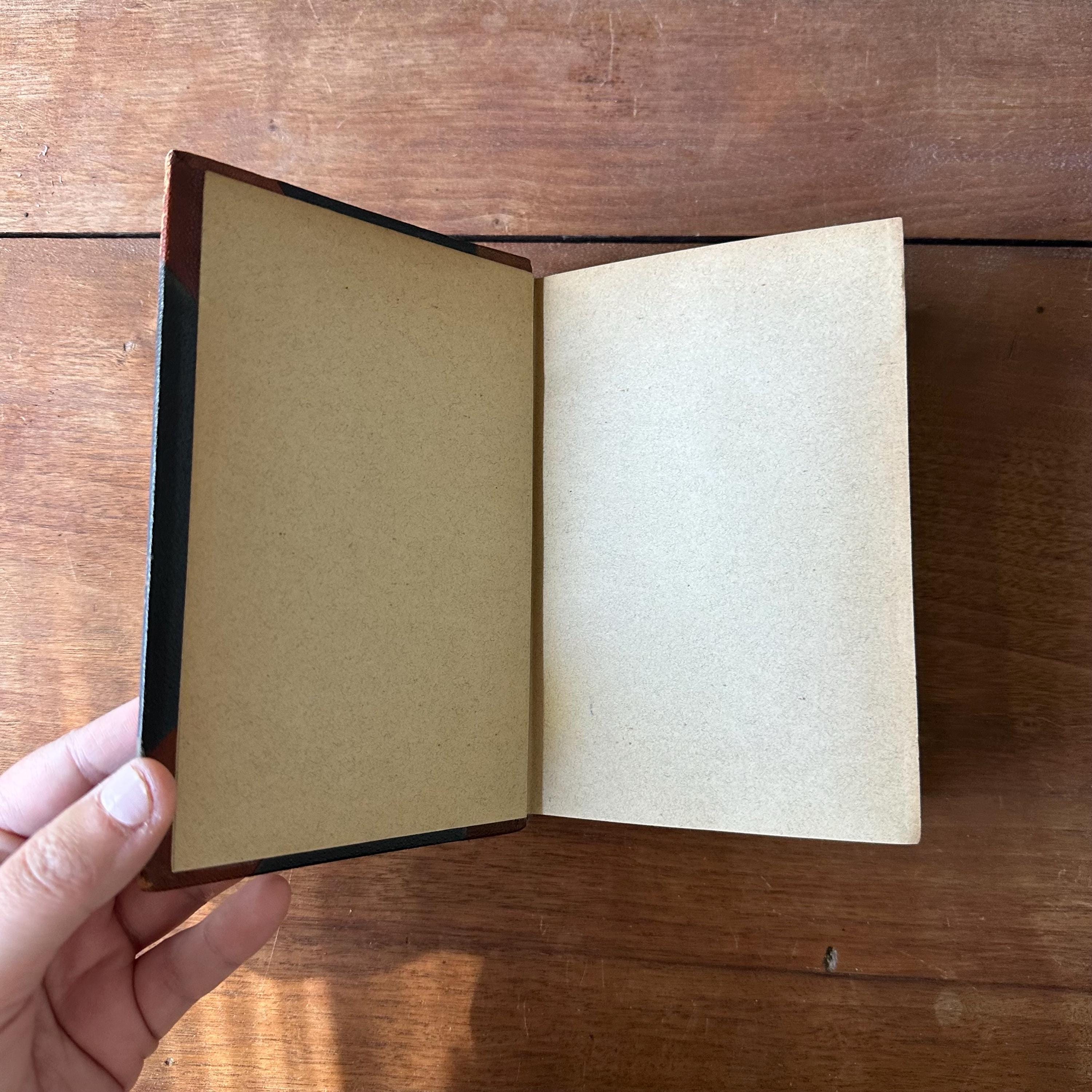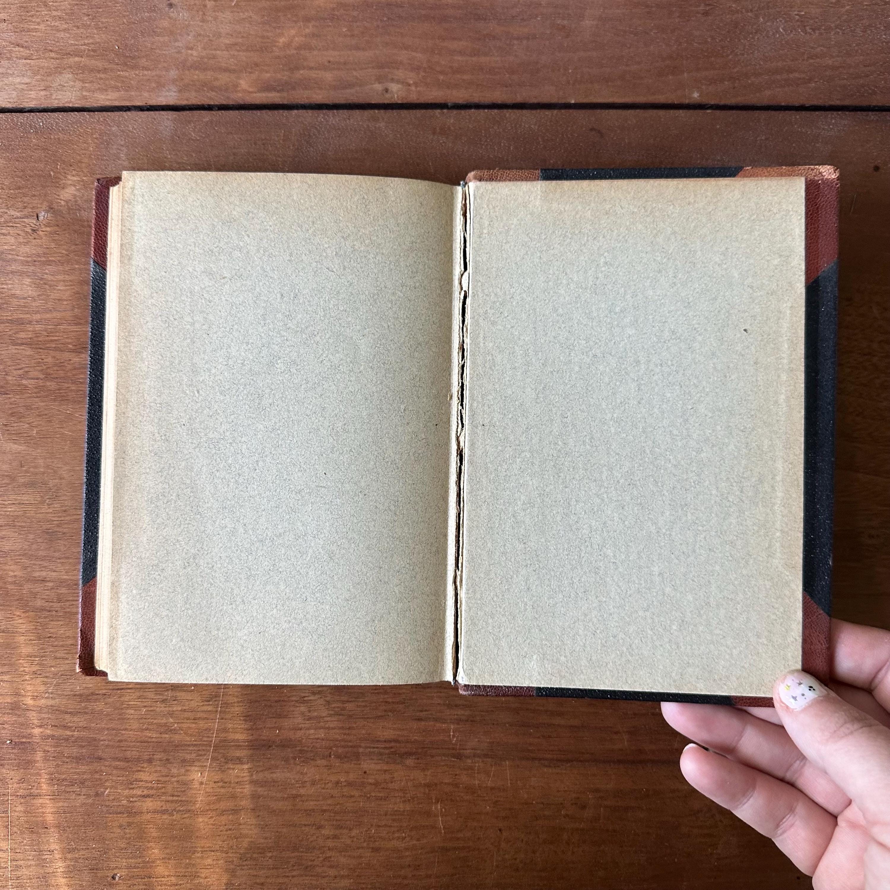 The book is in good antique condition for its age and use. The covers have minimal wear, except for the top right corner which has a scuff. The back right corner is also scuffed, and there is a very small piece of the black leather missing where it meets the spine at the back cover. The back cover has started to detach from the spine at the inside. The front is still attached. The pages are only minimally yellowed.