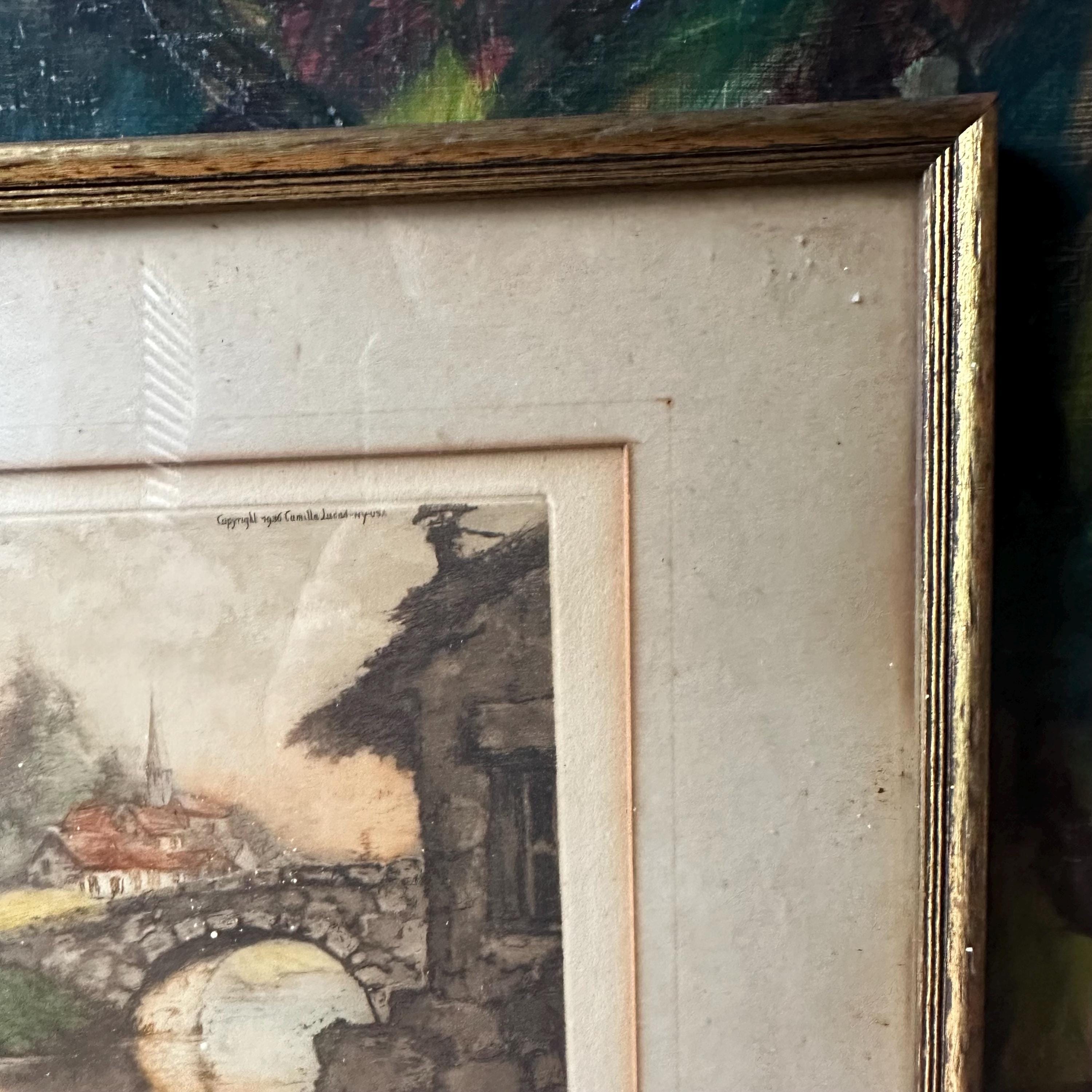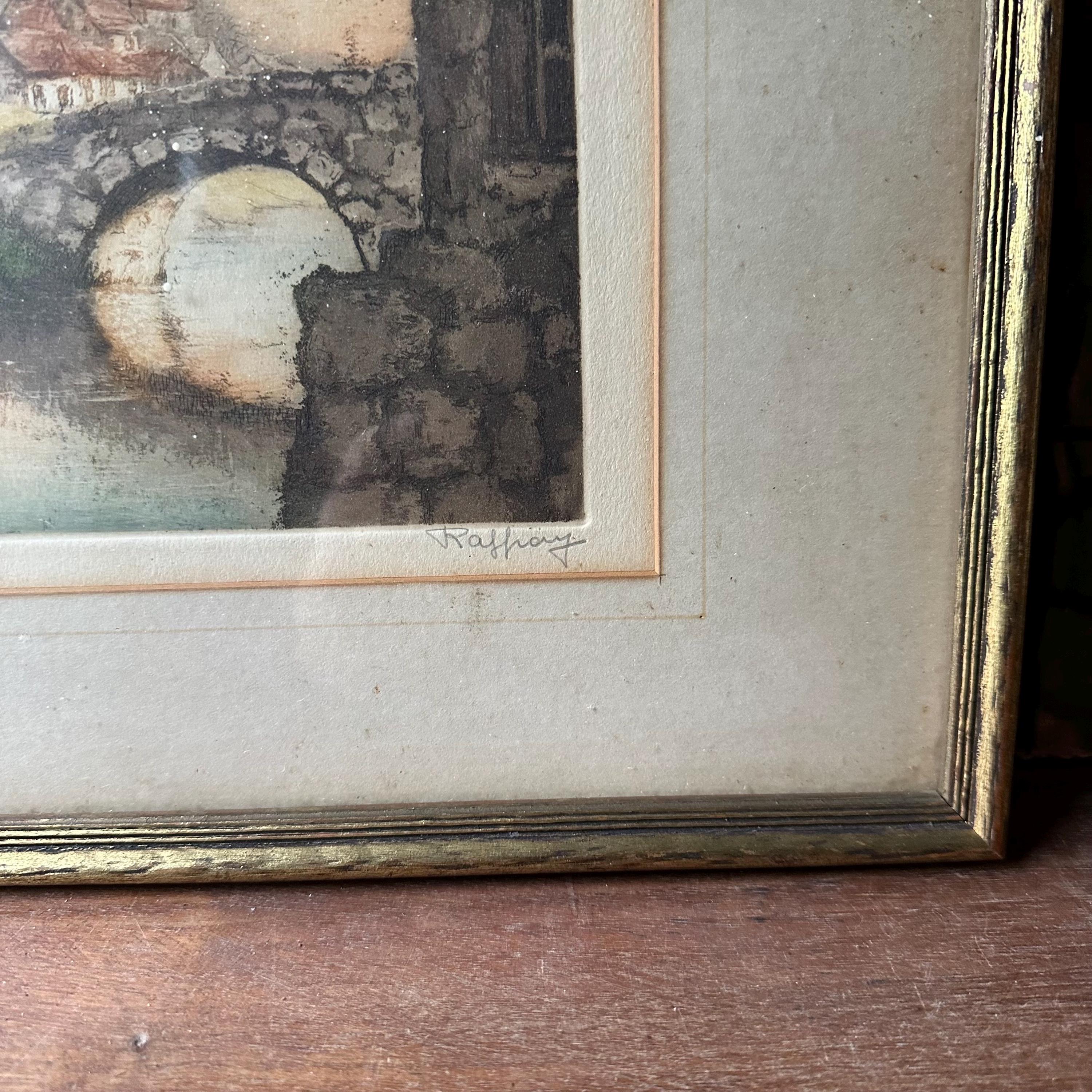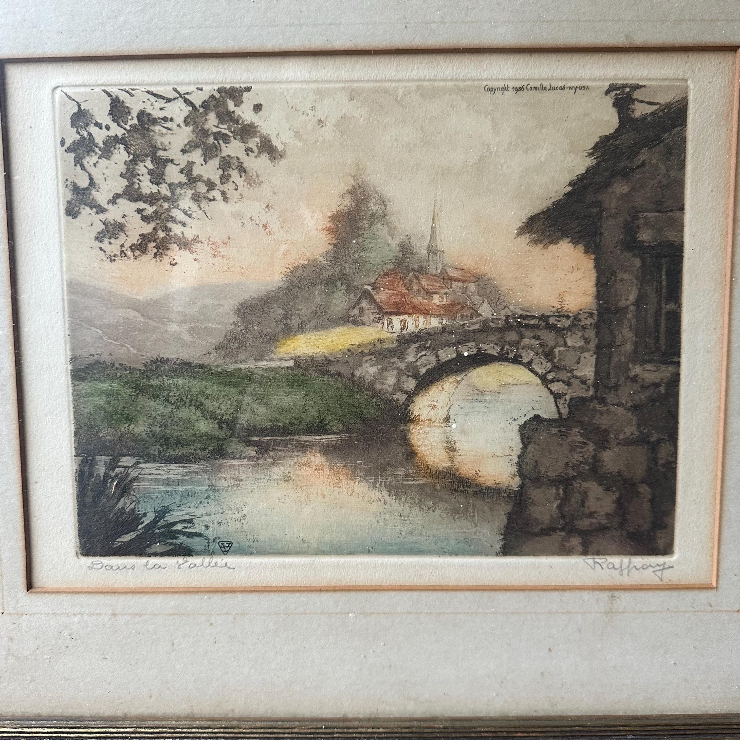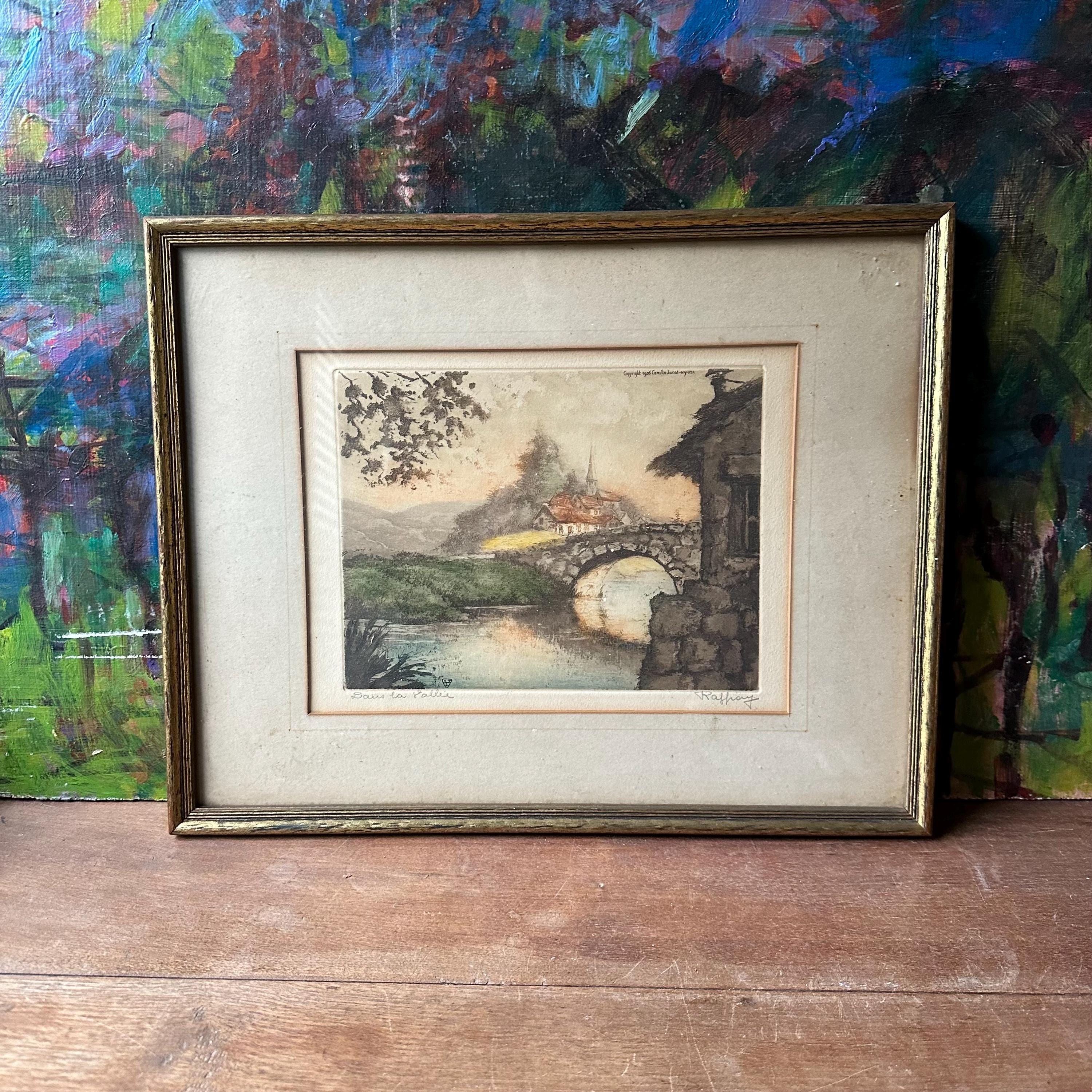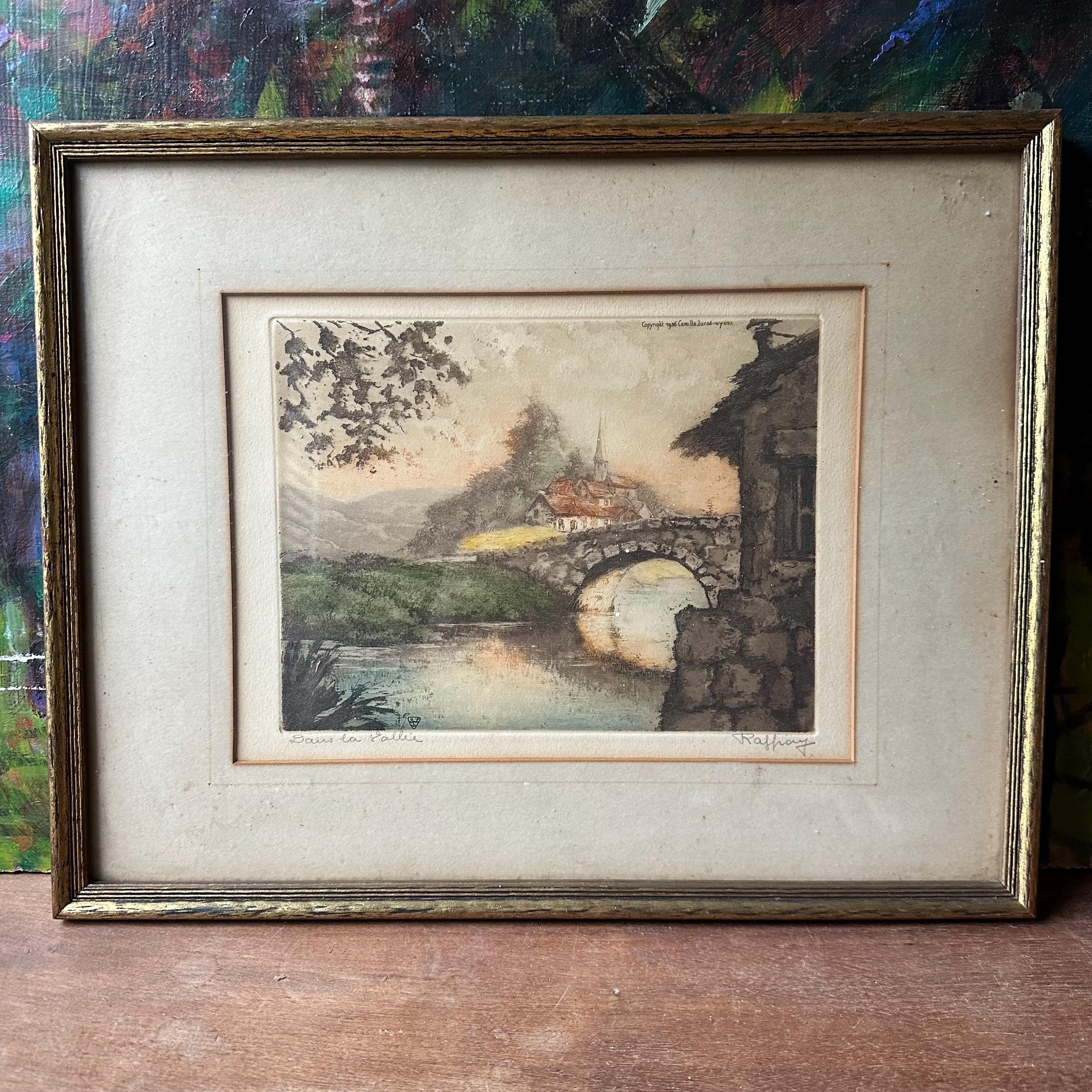 This is a dreamy 1936 Raffray aquatint etching titled Dans La Vallee. It features a lovely village by a river with a stone bridge and house in the foreground and the village and church spire in the background. The etching is colored in light shades of blue, brown, green, red, gray, and white. The etching has a copyright 1936 Camilla Lucas - NY. USA label in the upper right of the etching. The etching is signed Raffray and titled Dans la Vallee in pencil below the etching. The etching is matted with a cream mat and framed in wood frame painted gold. There is picture wire on the back.