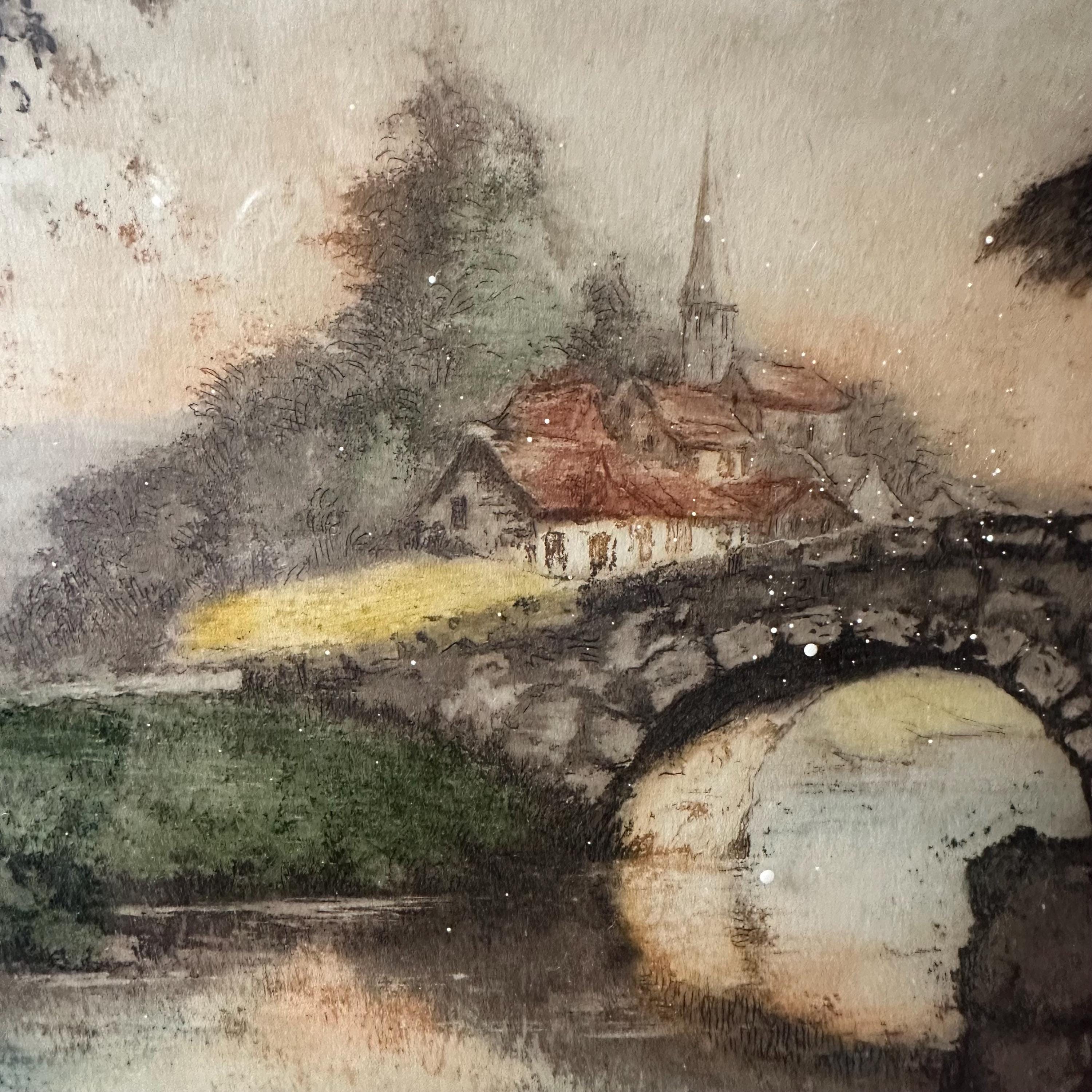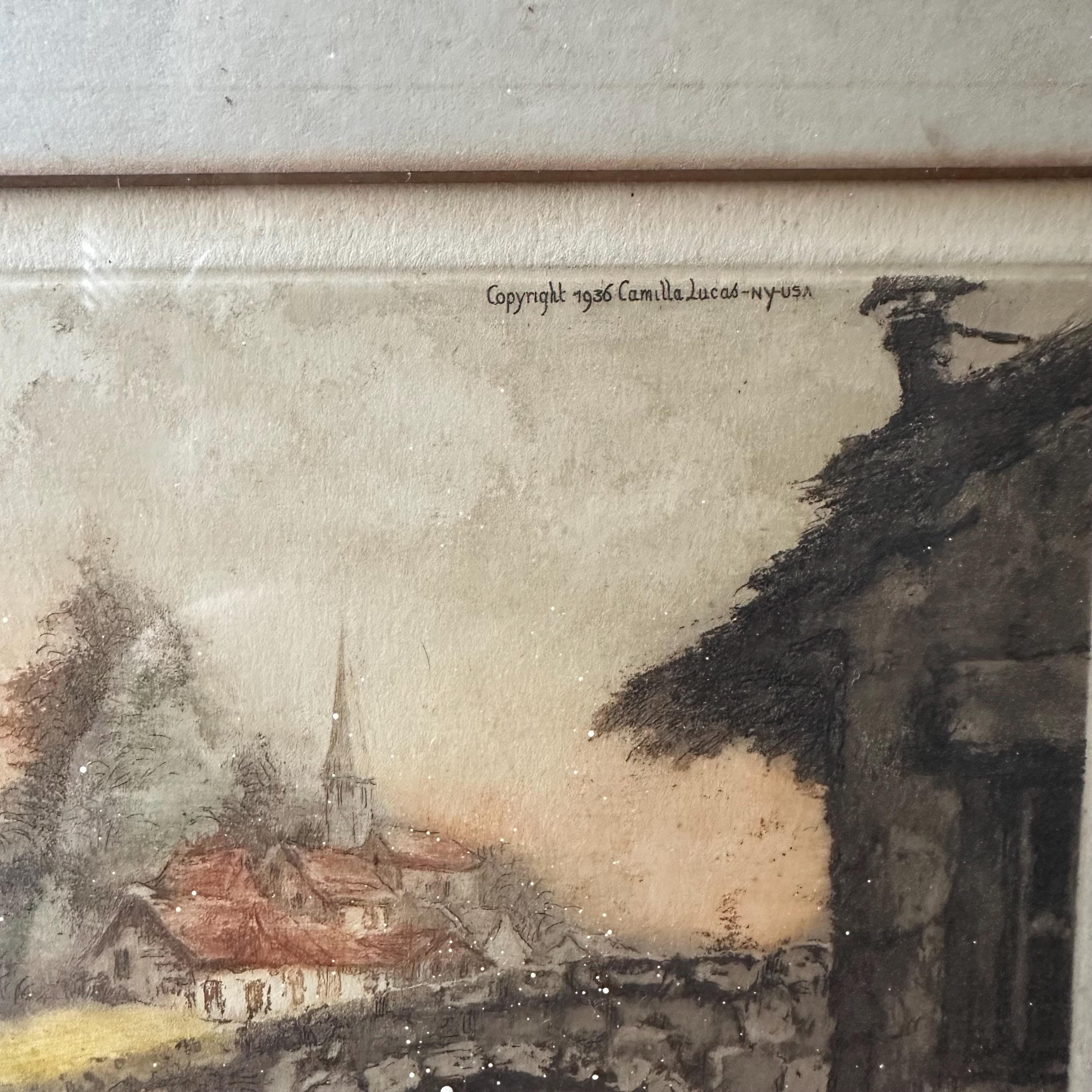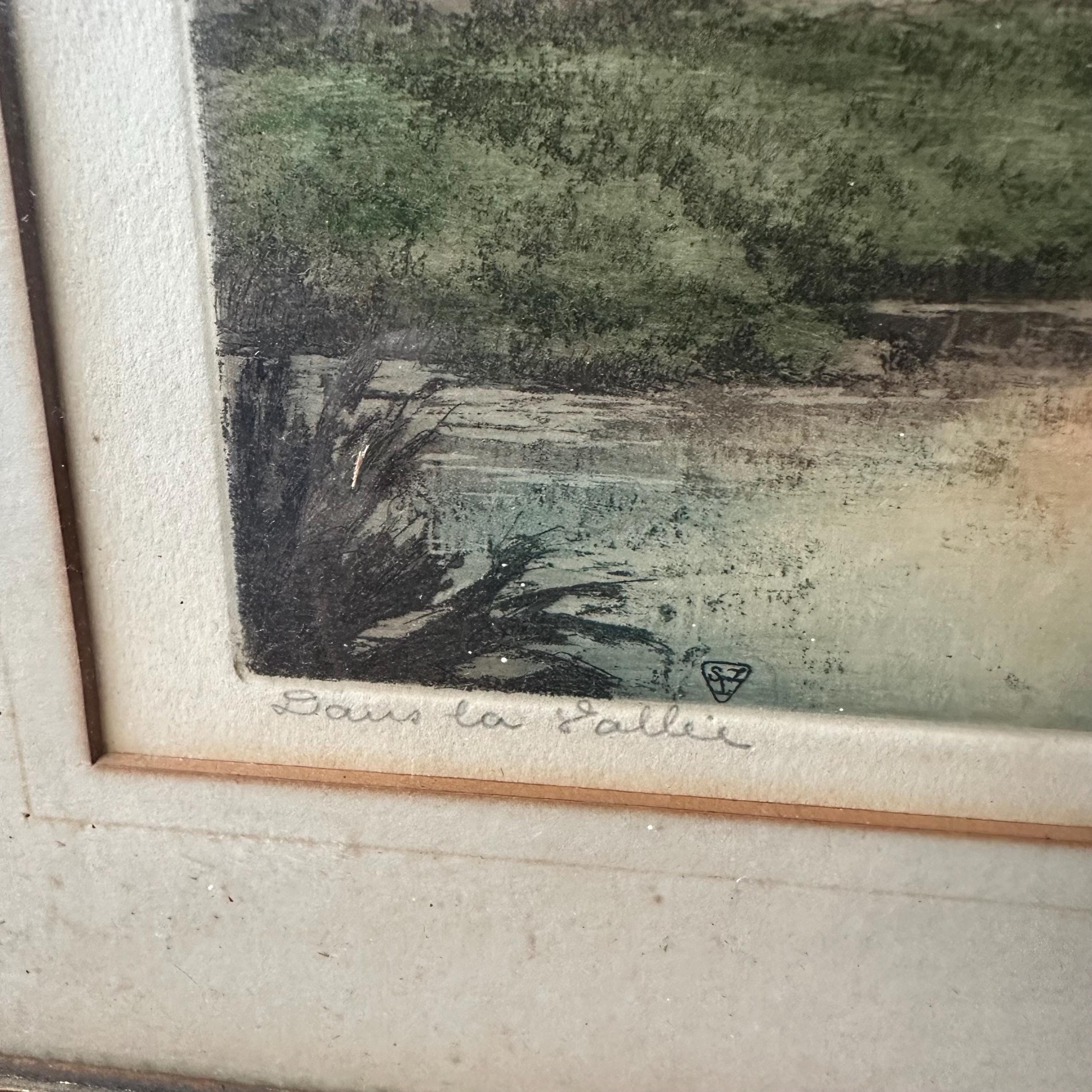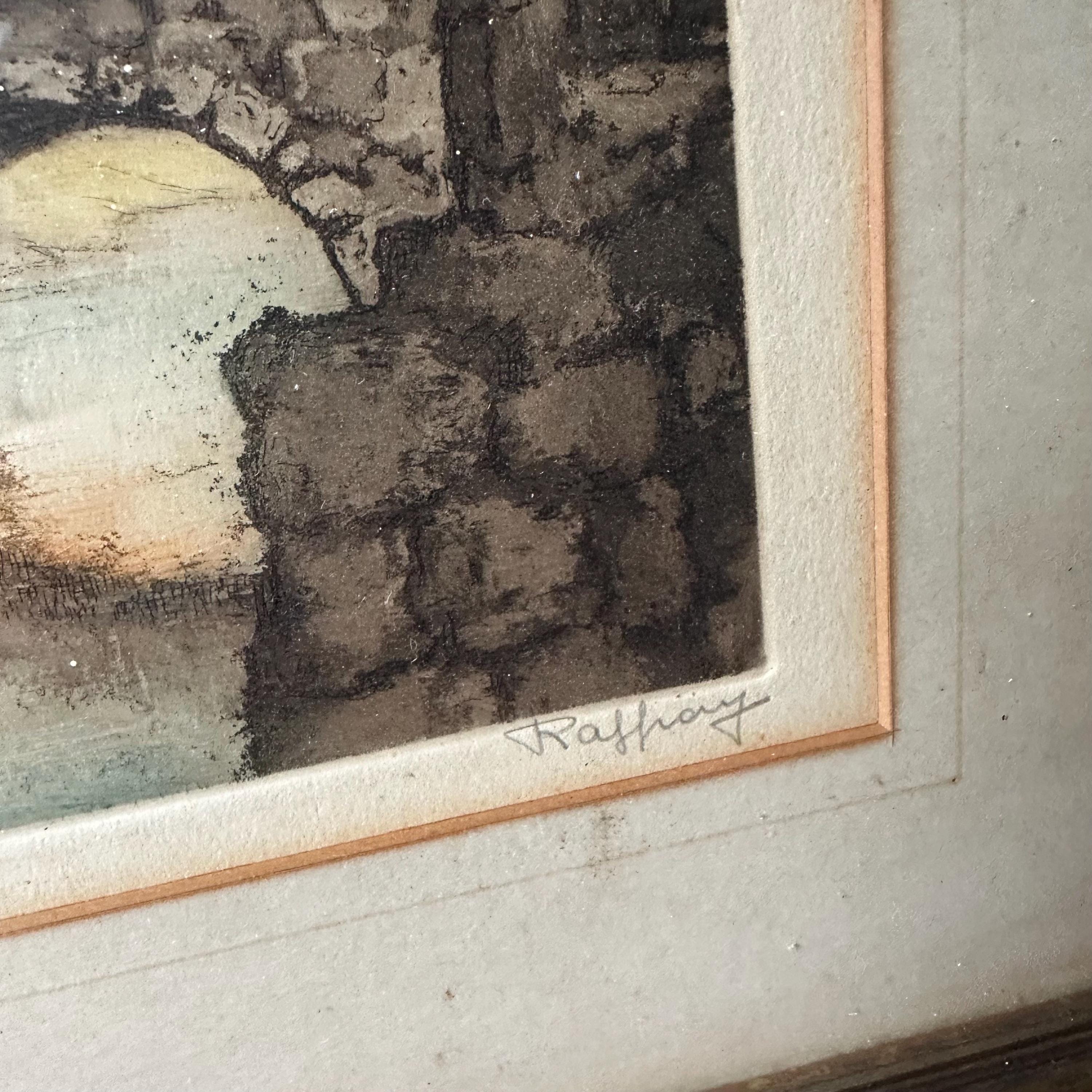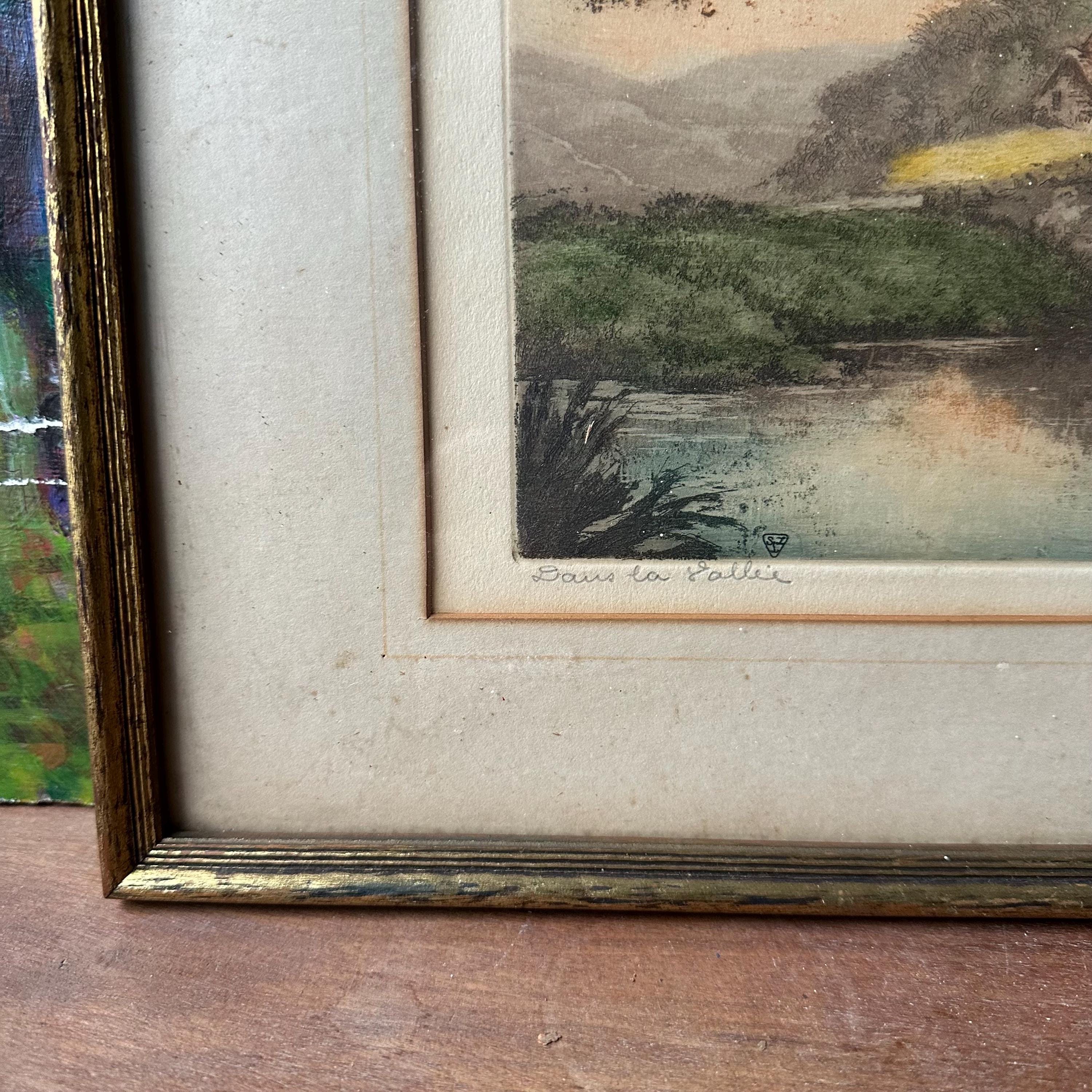 This is a dreamy 1936 Raffray aquatint etching titled Dans La Vallee. It features a lovely village by a river with a stone bridge and house in the foreground and the village and church spire in the background. The etching is colored in light shades of blue, brown, green, red, gray, and white. The etching has a copyright 1936 Camilla Lucas - NY. USA label in the upper right of the etching. The etching is signed Raffray and titled Dans la Vallee in pencil below the etching. The etching is matted with a cream mat and framed in wood frame painted gold. There is picture wire on the back.