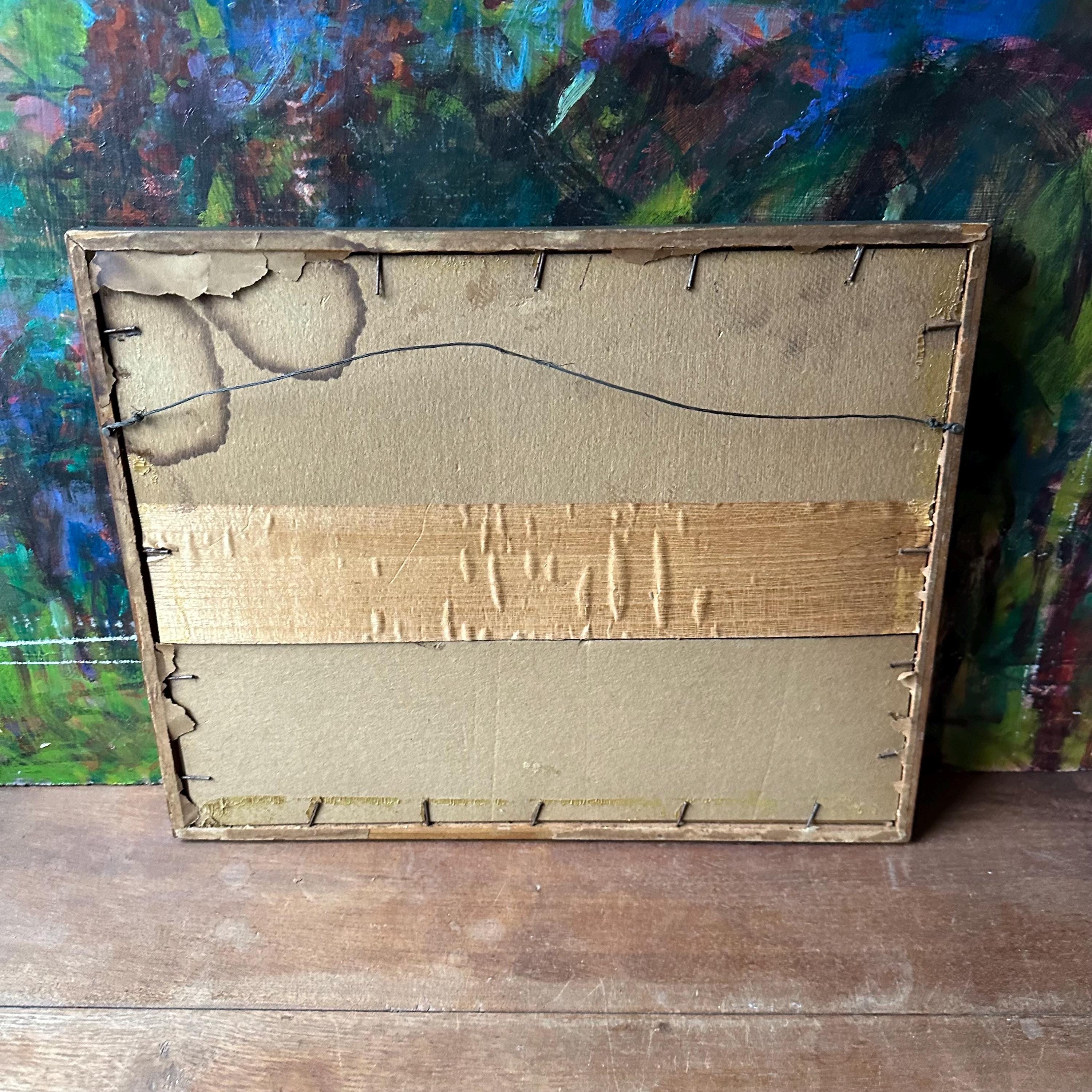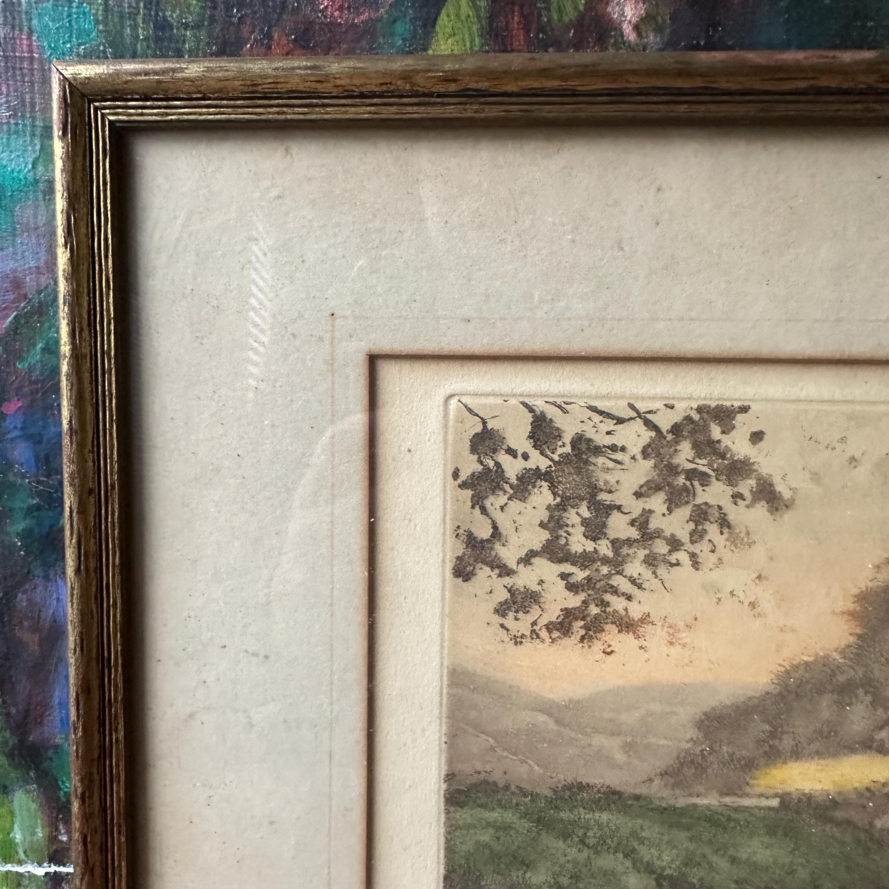 The etching is in great vintage condition for its age and use. The mat has darkened with some foxing areas. The glass is clear and the frame is tight. The gold paint has some general wear, giving it a nice chippy patina. The picture wire is solidly attached.