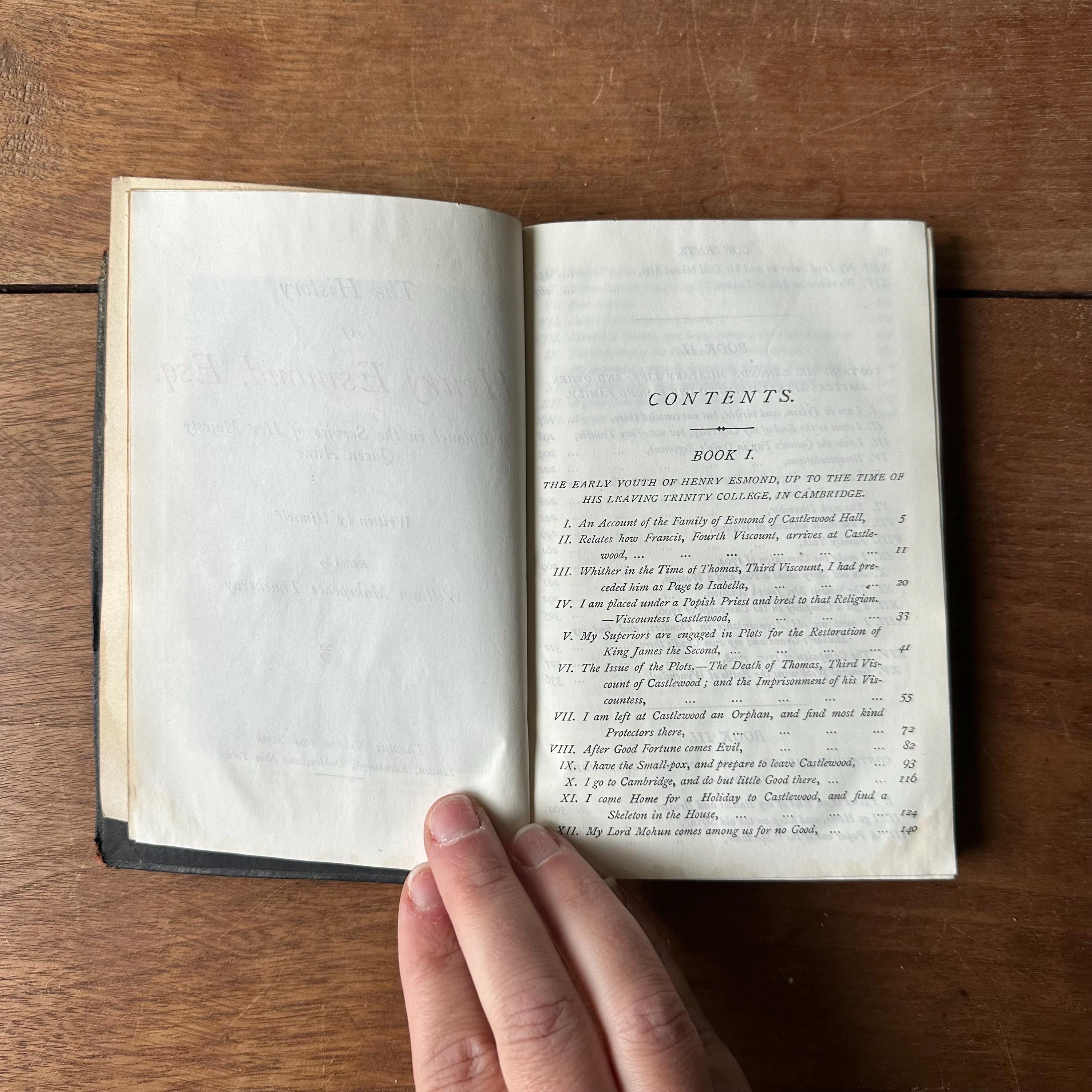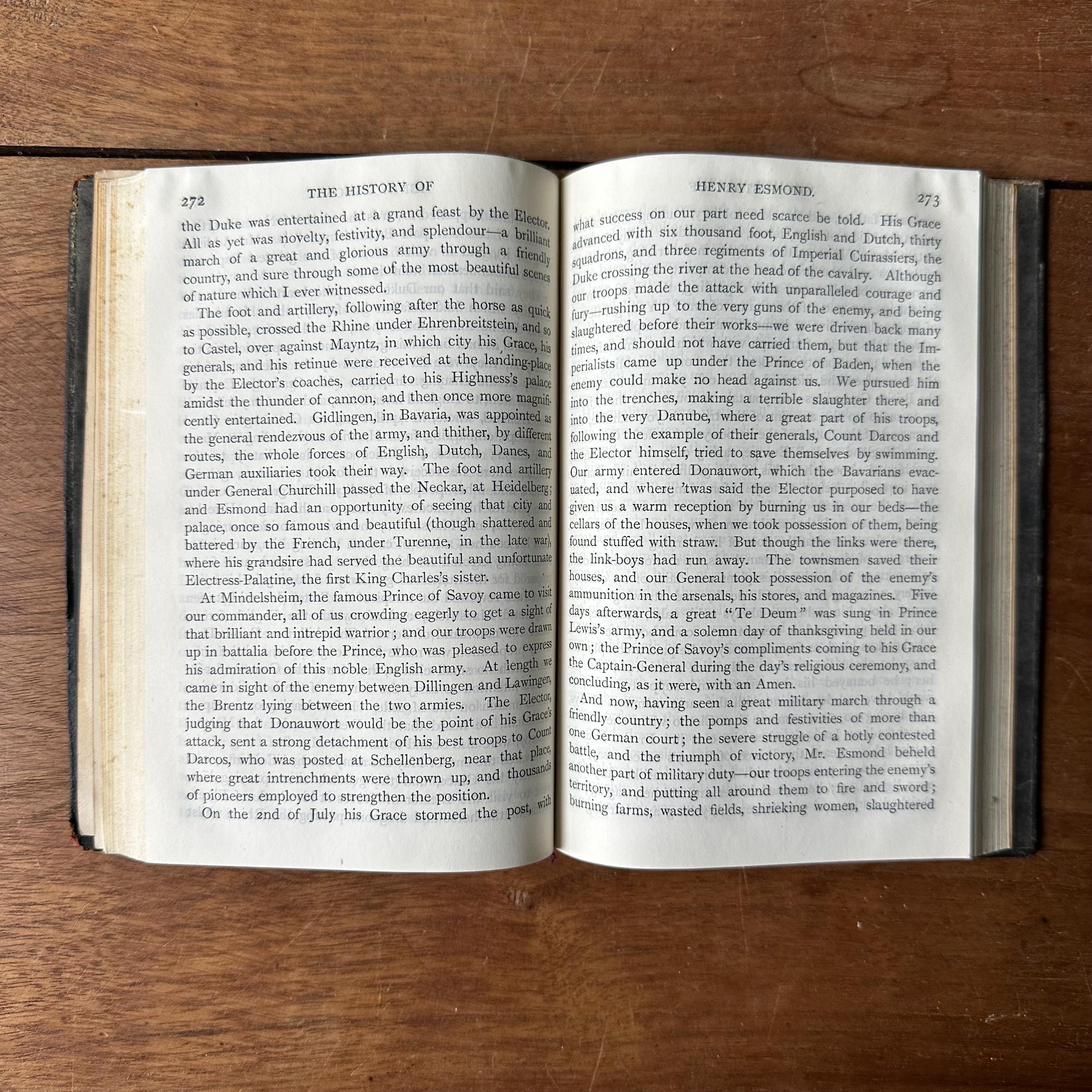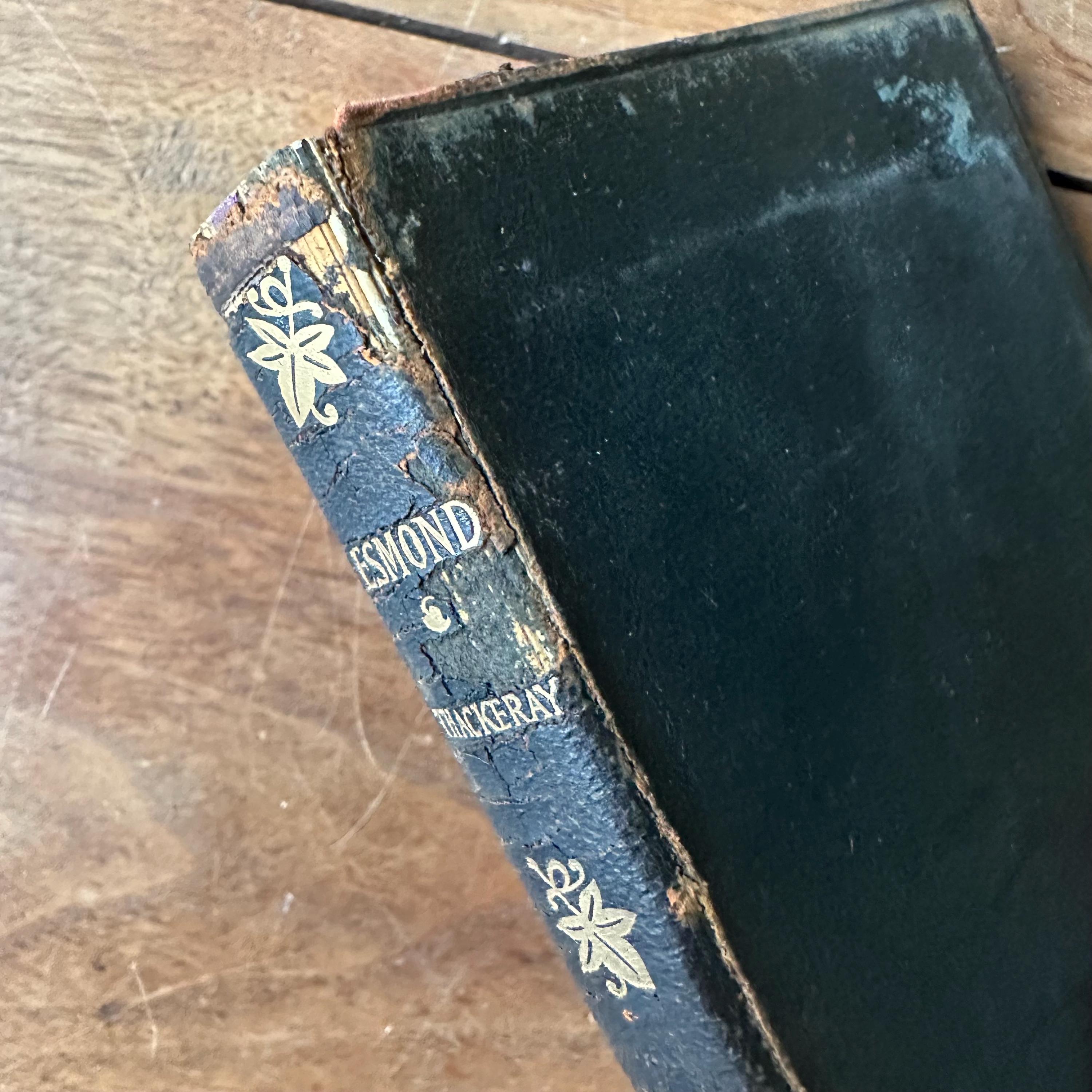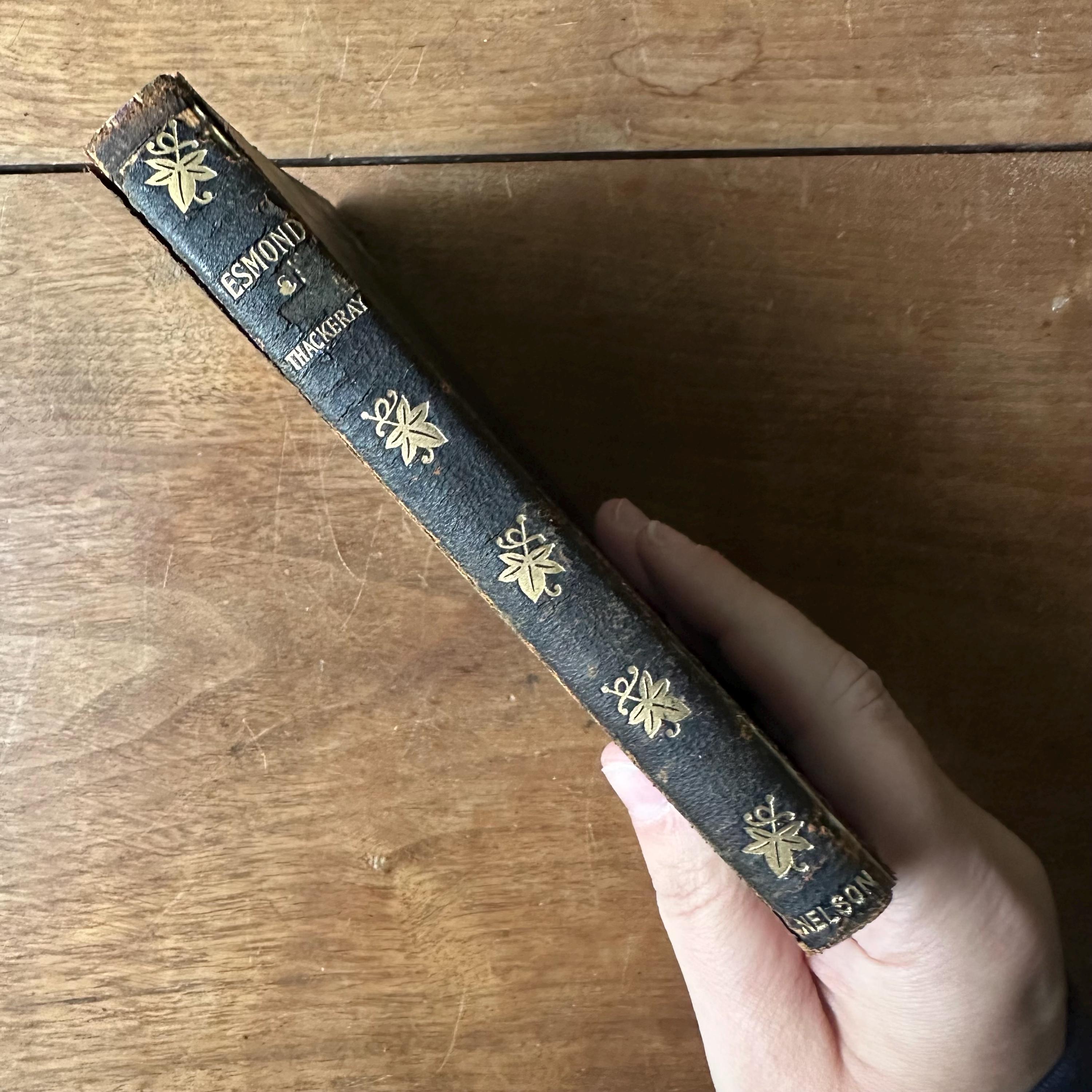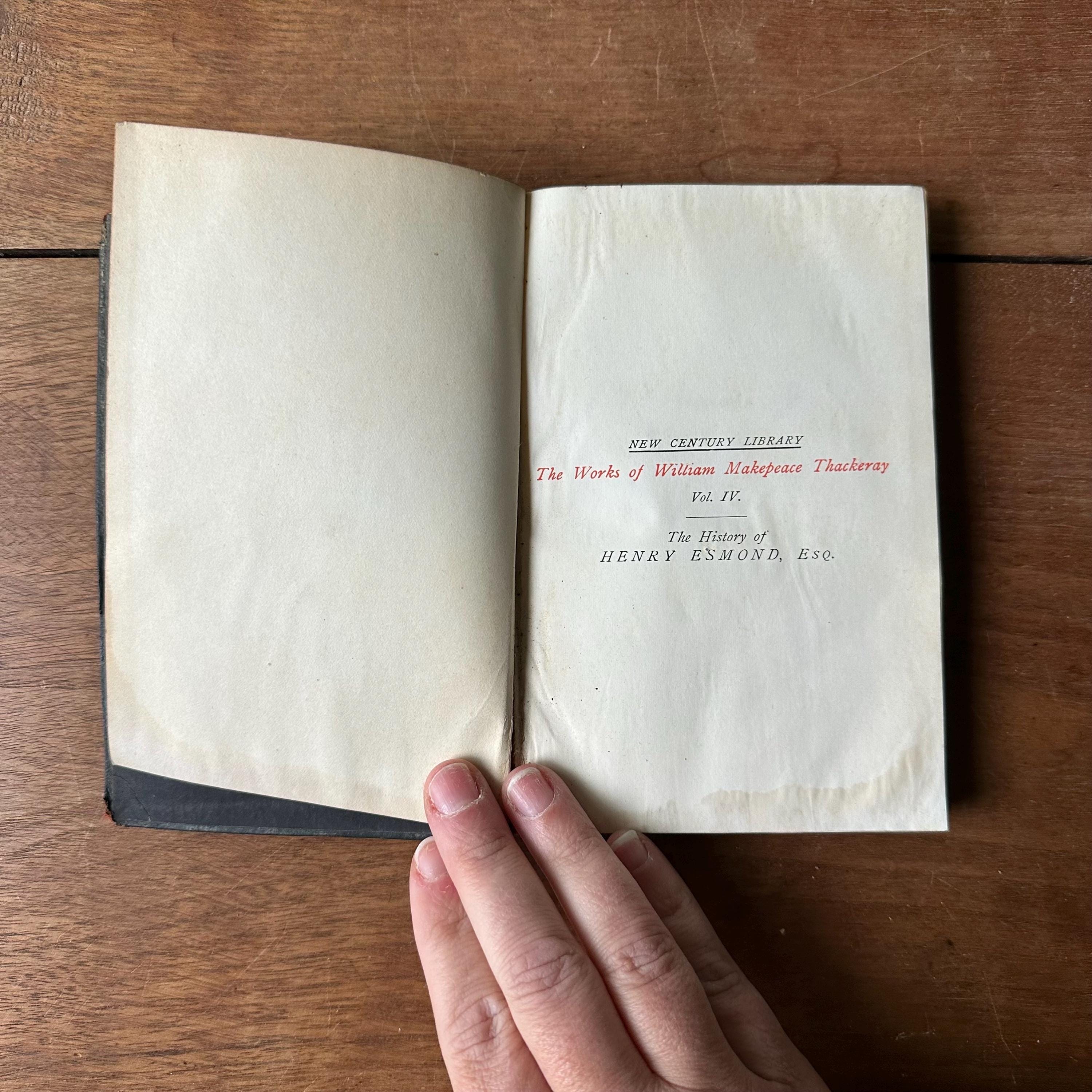 This is an antique edition of the New Century Library The Works of William Makepeace Thackeray Vol. IV. The History of Henry Esmond, Esq., published by Thomas Nelson and Sons. It has soft bound very dark brown leather covers with gold lettering and leaf decorations on the spine. The endpapers are very dark brown. The top page ends are gilt. There is one illustration plate at the title page. There are 556 pages.