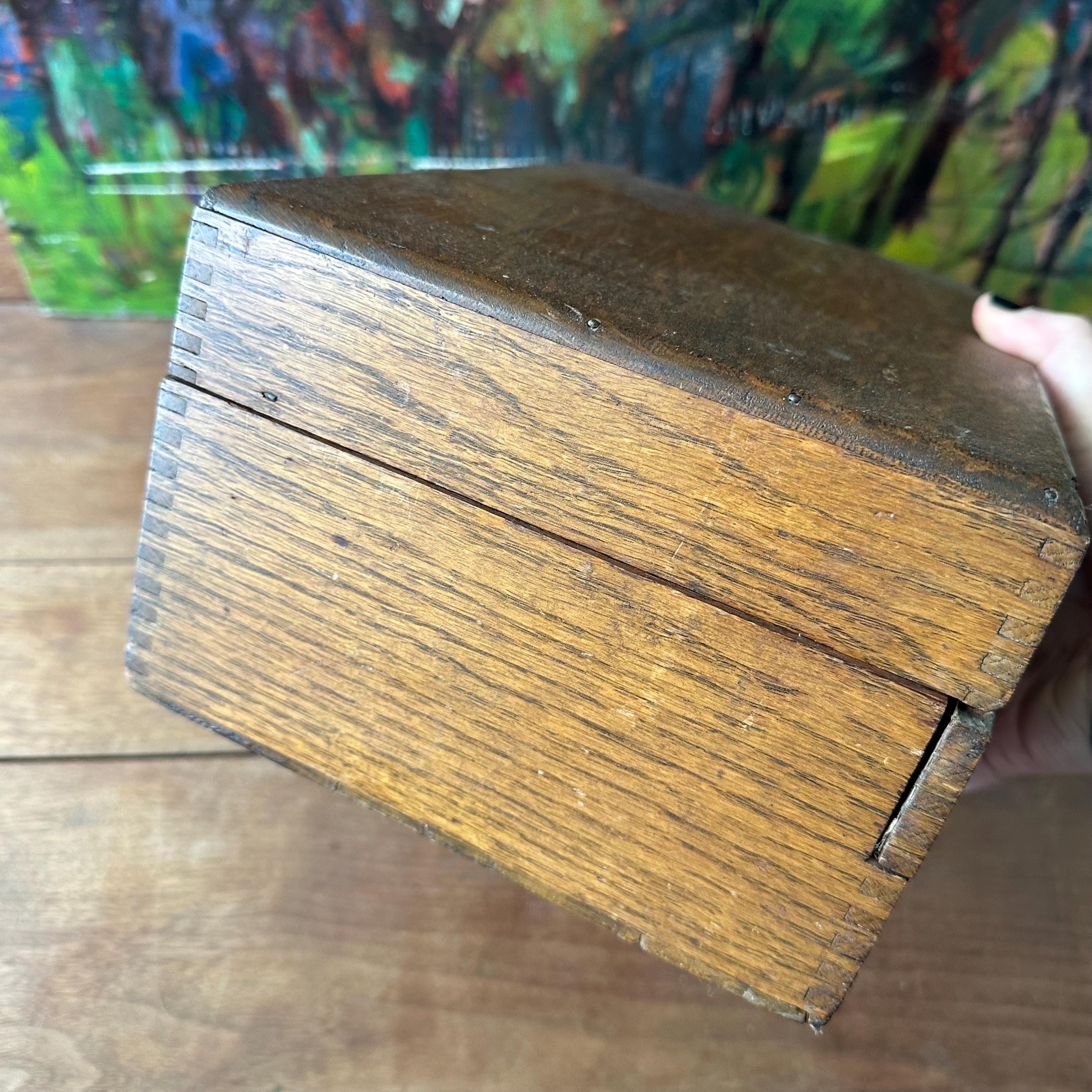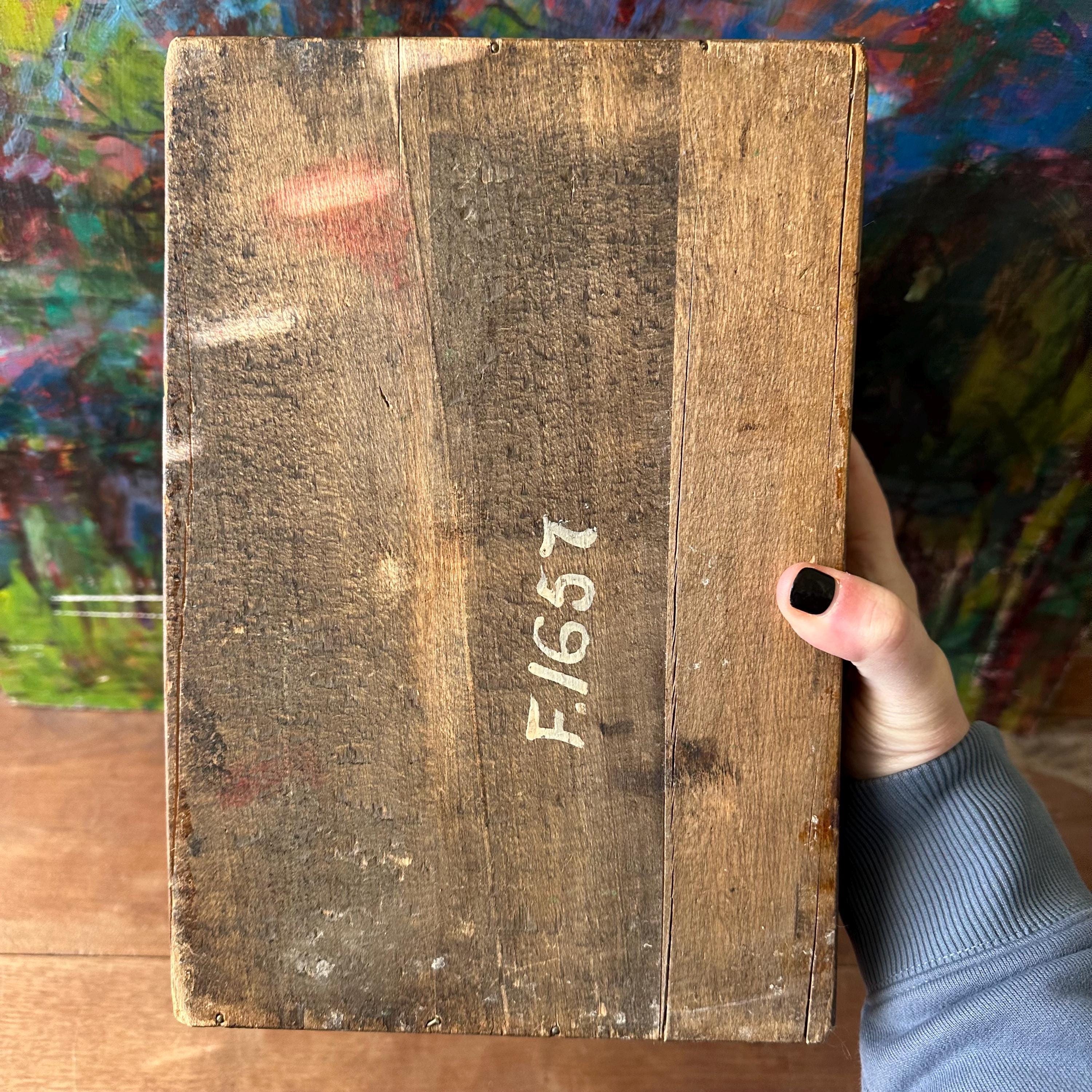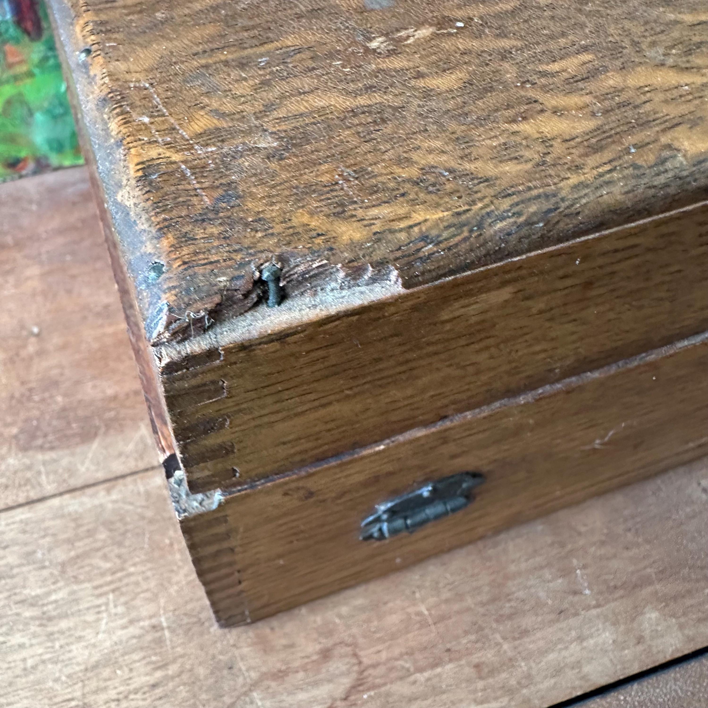 The box is in good antique condition for its age and use. The top left outer corner has large area of chipped wood and the top right outer corner has a small chip. Otherwise, the outside of the box has a lovely patina with general wear. The top label is in excellent condition with some slight wrinkling. The front panel label has some tears and rips along the top edge where it folds in against the rest of the box.