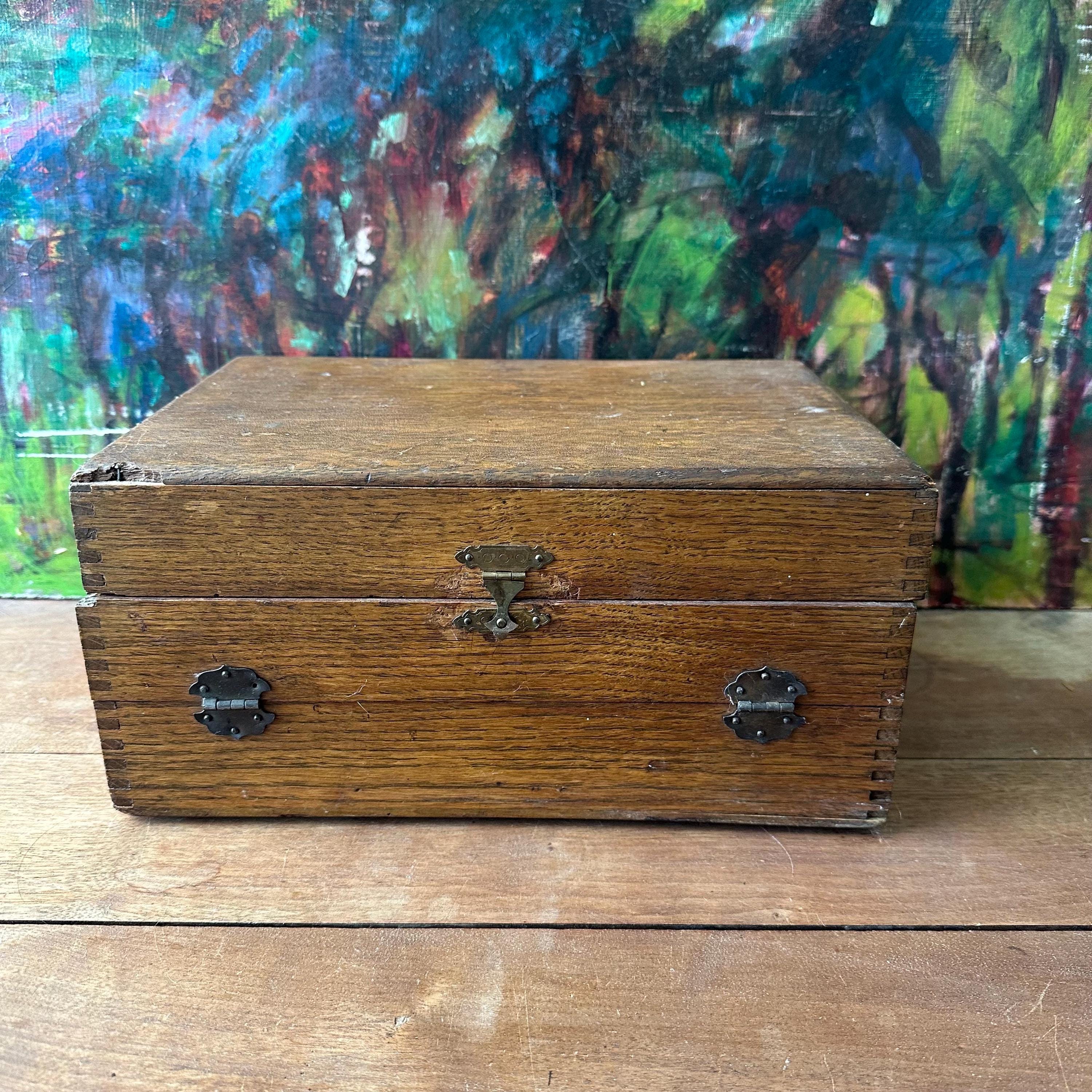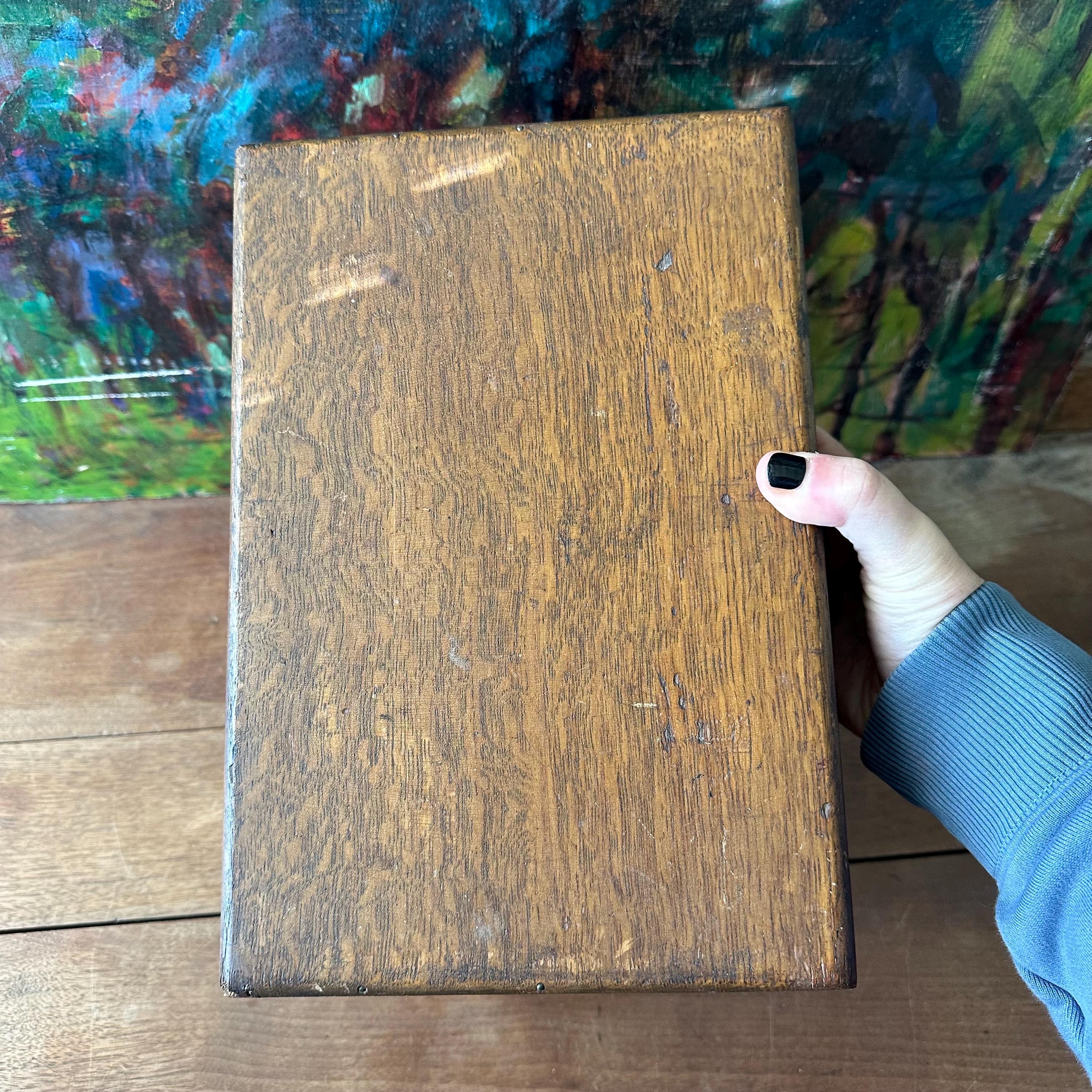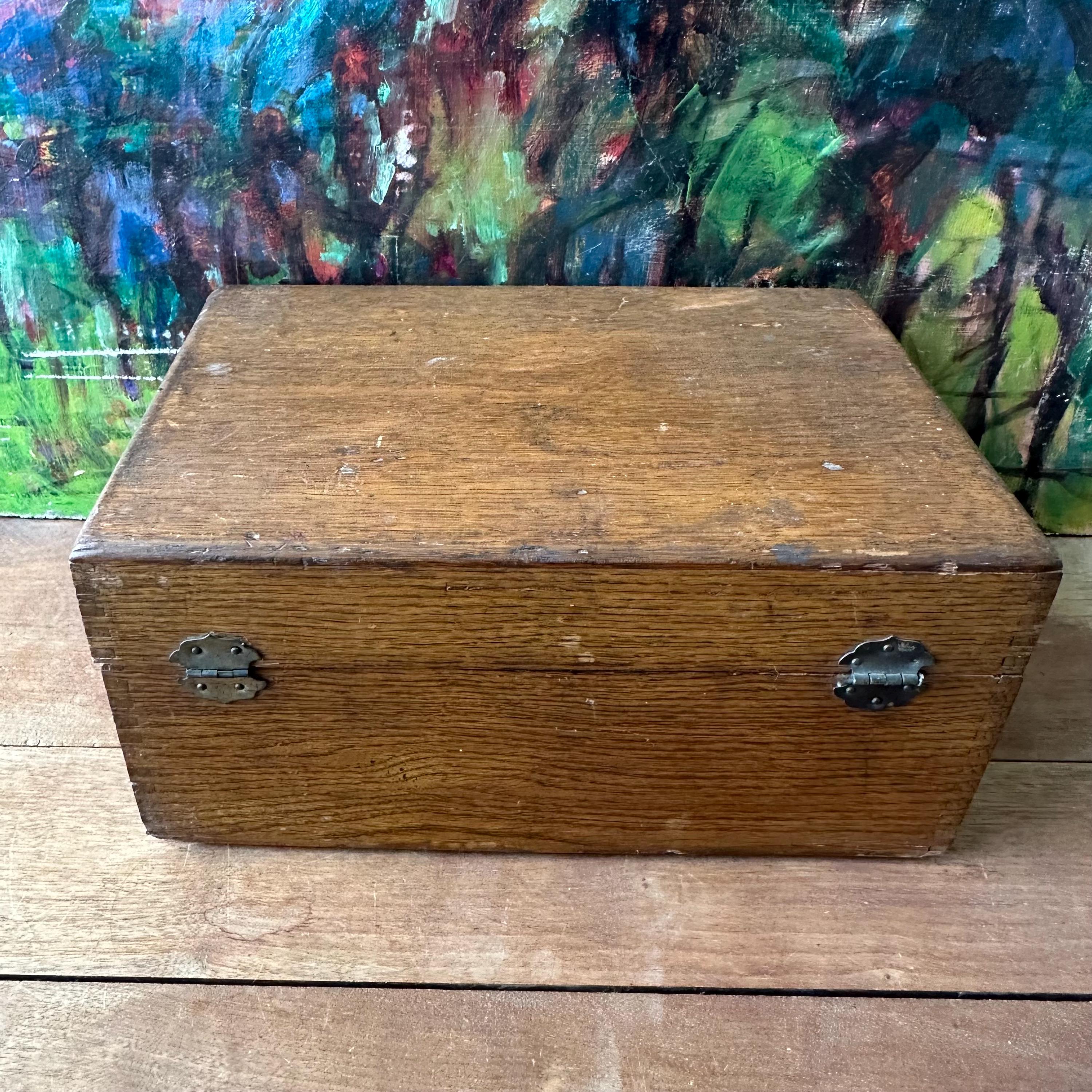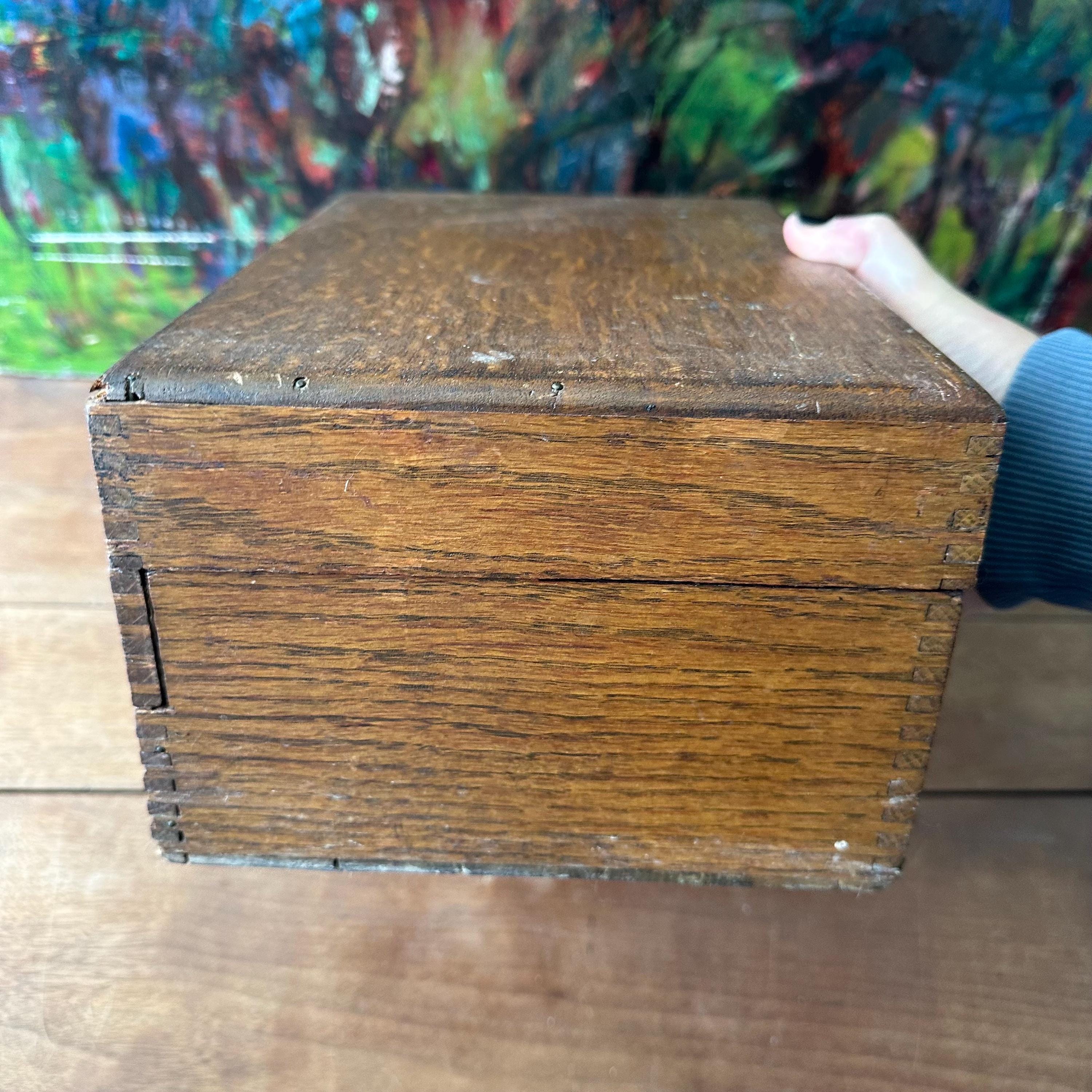 The box is in good antique condition for its age and use. The top left outer corner has large area of chipped wood and the top right outer corner has a small chip. Otherwise, the outside of the box has a lovely patina with general wear. The top label is in excellent condition with some slight wrinkling. The front panel label has some tears and rips along the top edge where it folds in against the rest of the box.