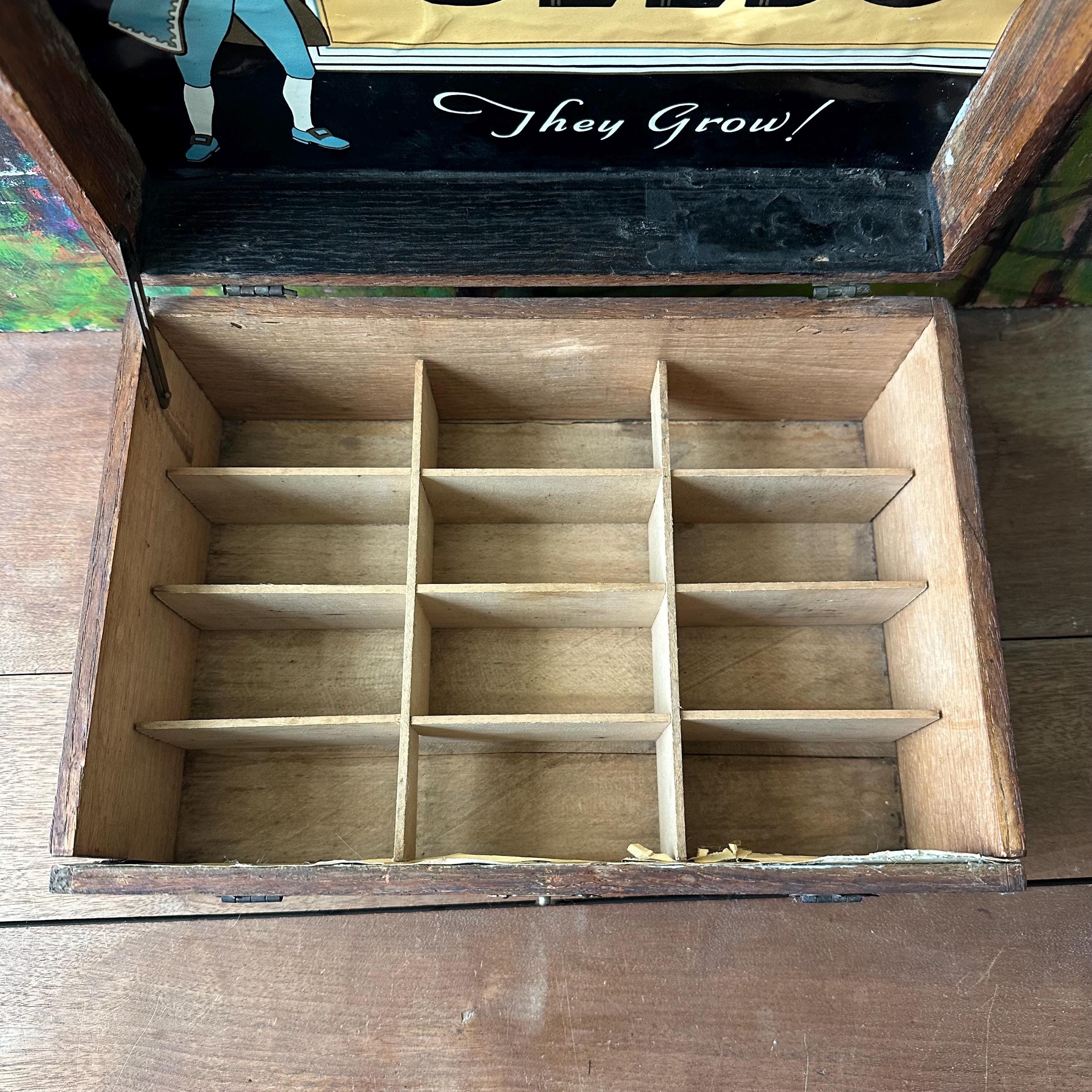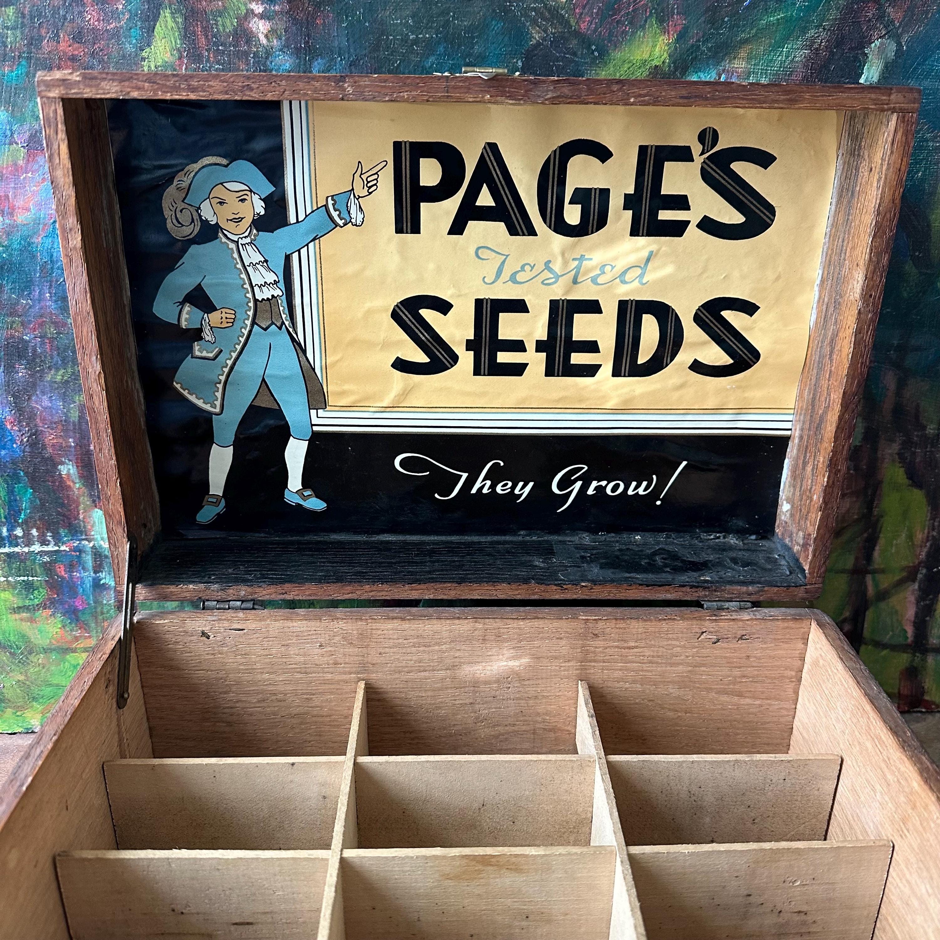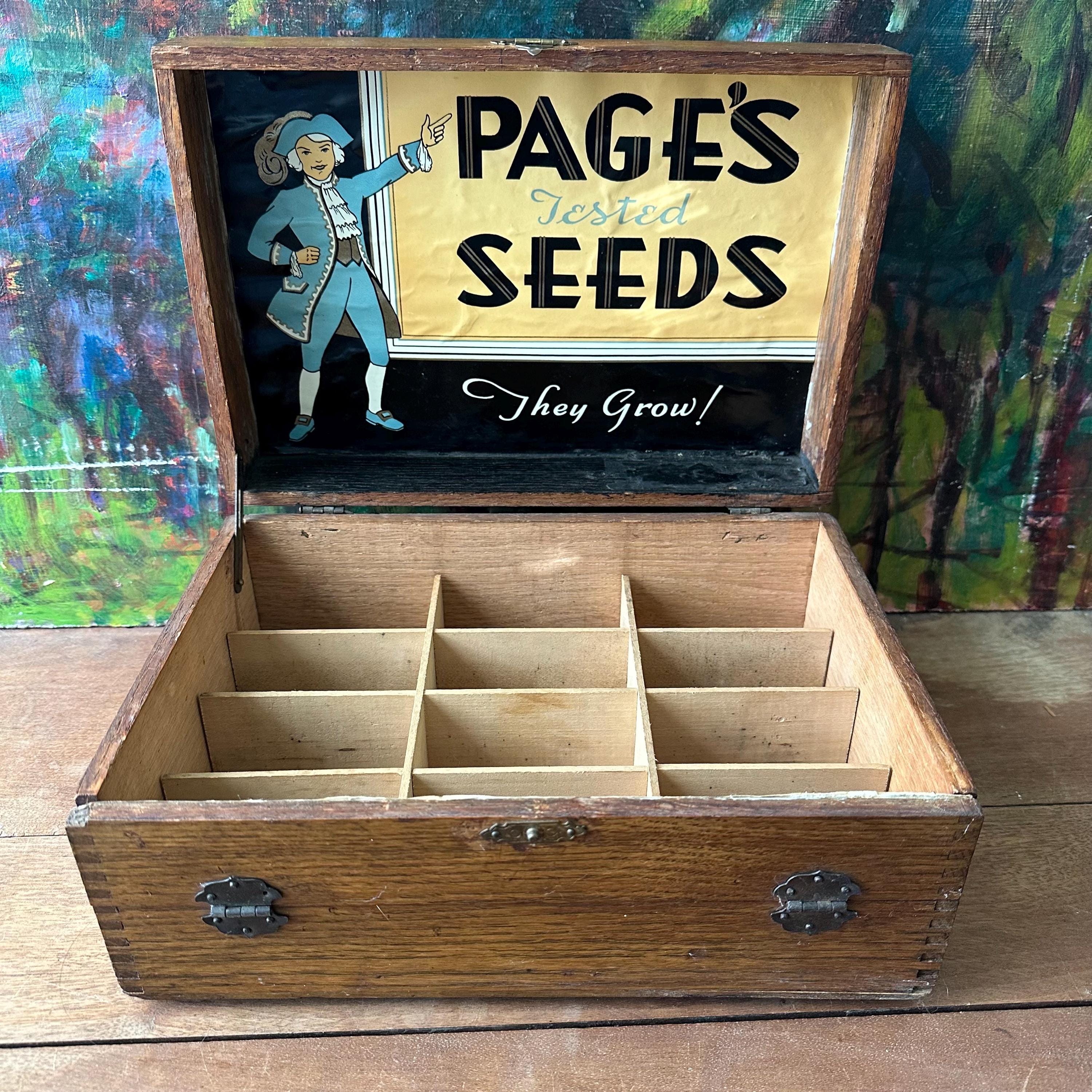 This is an antique Page's Seeds Choice Flower Seeds wood seed storage box. The box is wood with dovetail joints. The lid is hinged, and there is a fold down front panel. The box closes with a brass clasp. Inside the box, there is a full color Page's Seeds label underneath the lid. The label is in shades of blue, black, white, and yellow. It shows a person in colonial America dress. The front panel also has a Choice Flower Seeds label. The box is divided into 12 cubby compartments. The bottom is labeled F.1657 in white paint.
