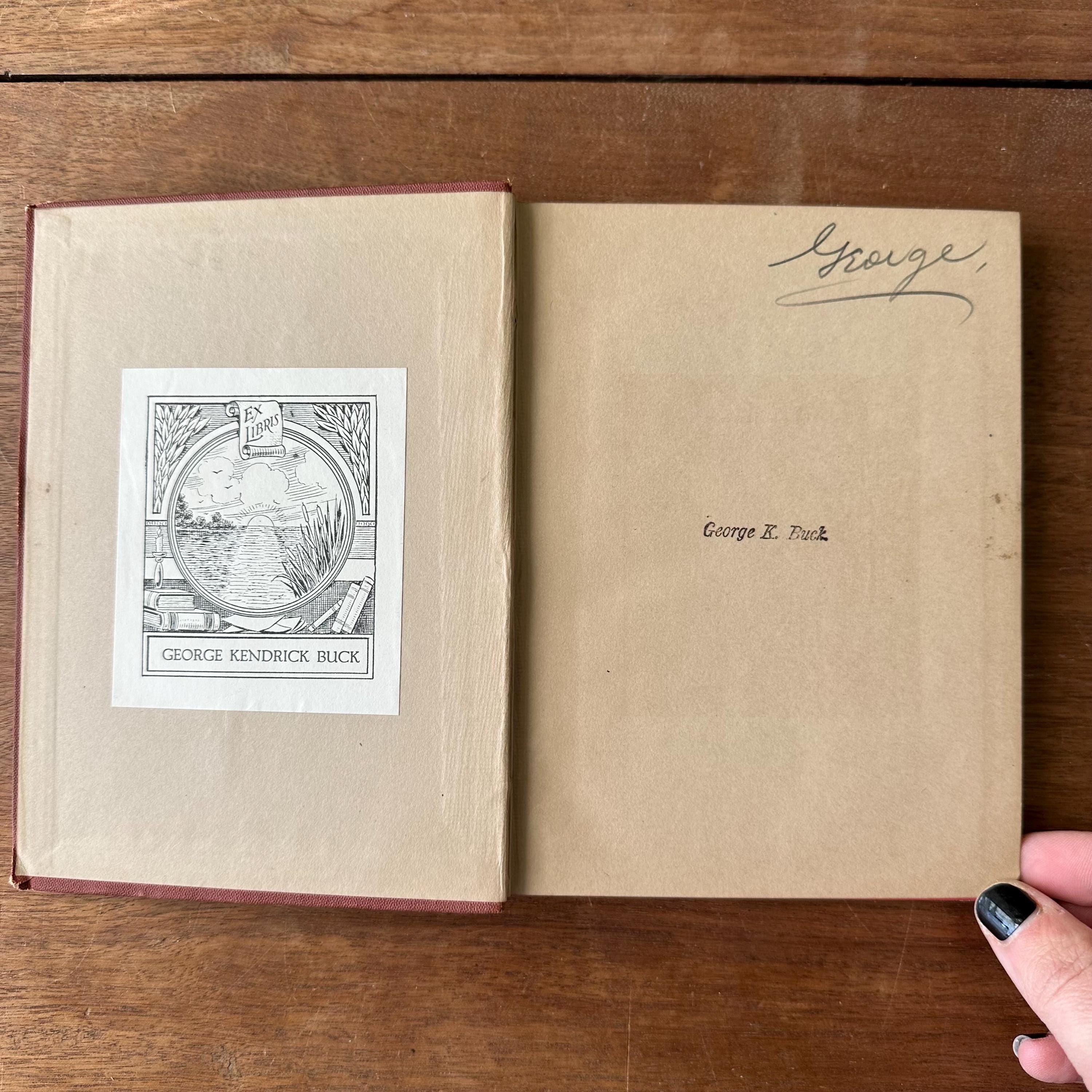 The book is great antique condition for its age and use. It has some wear along the spine where the leather has begun to wear away as well as wear at the corners. The leather is in good condition with minimal staining or fading. The gold lettering is intact and still bright. George K. Buck put his bookplate, stamped his name, and wrote his first name in pencil all inside the front cover. The covers are attached at the spine. The pages have slightly yellowed.