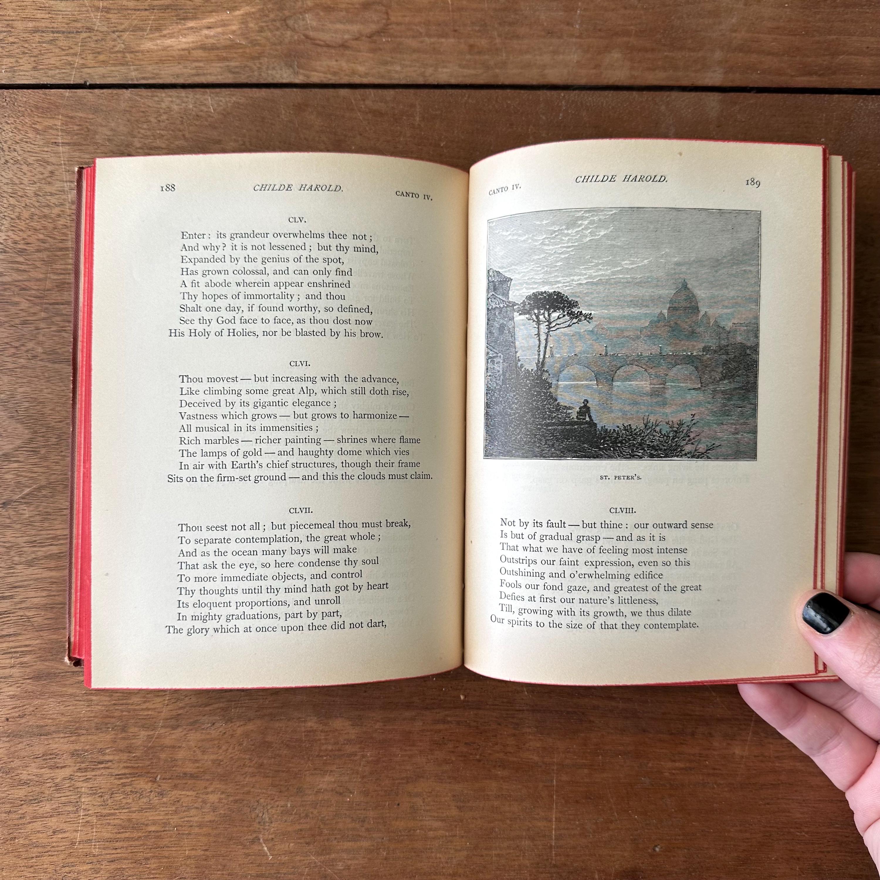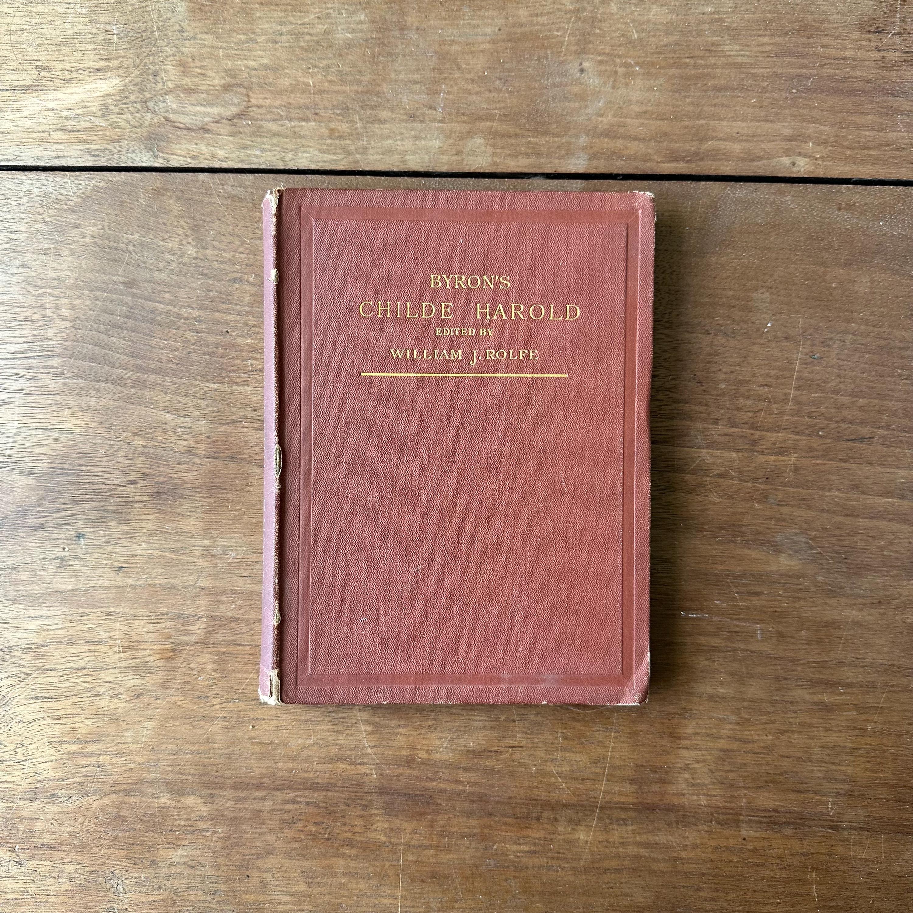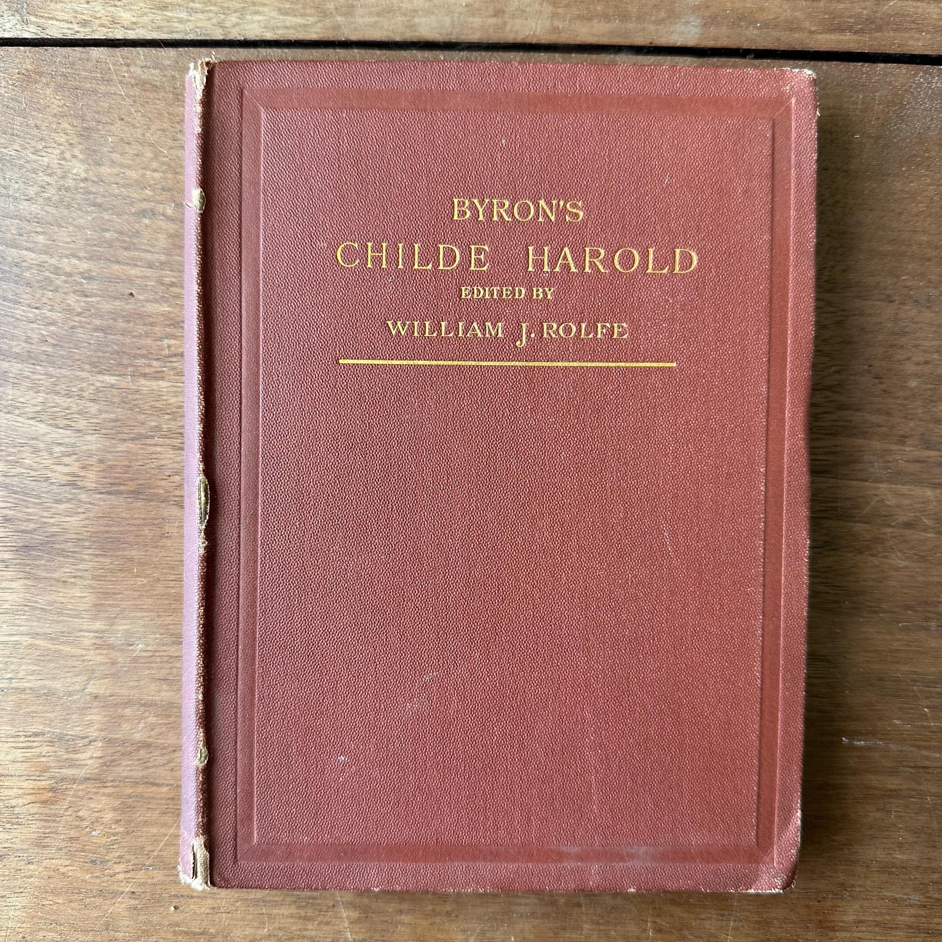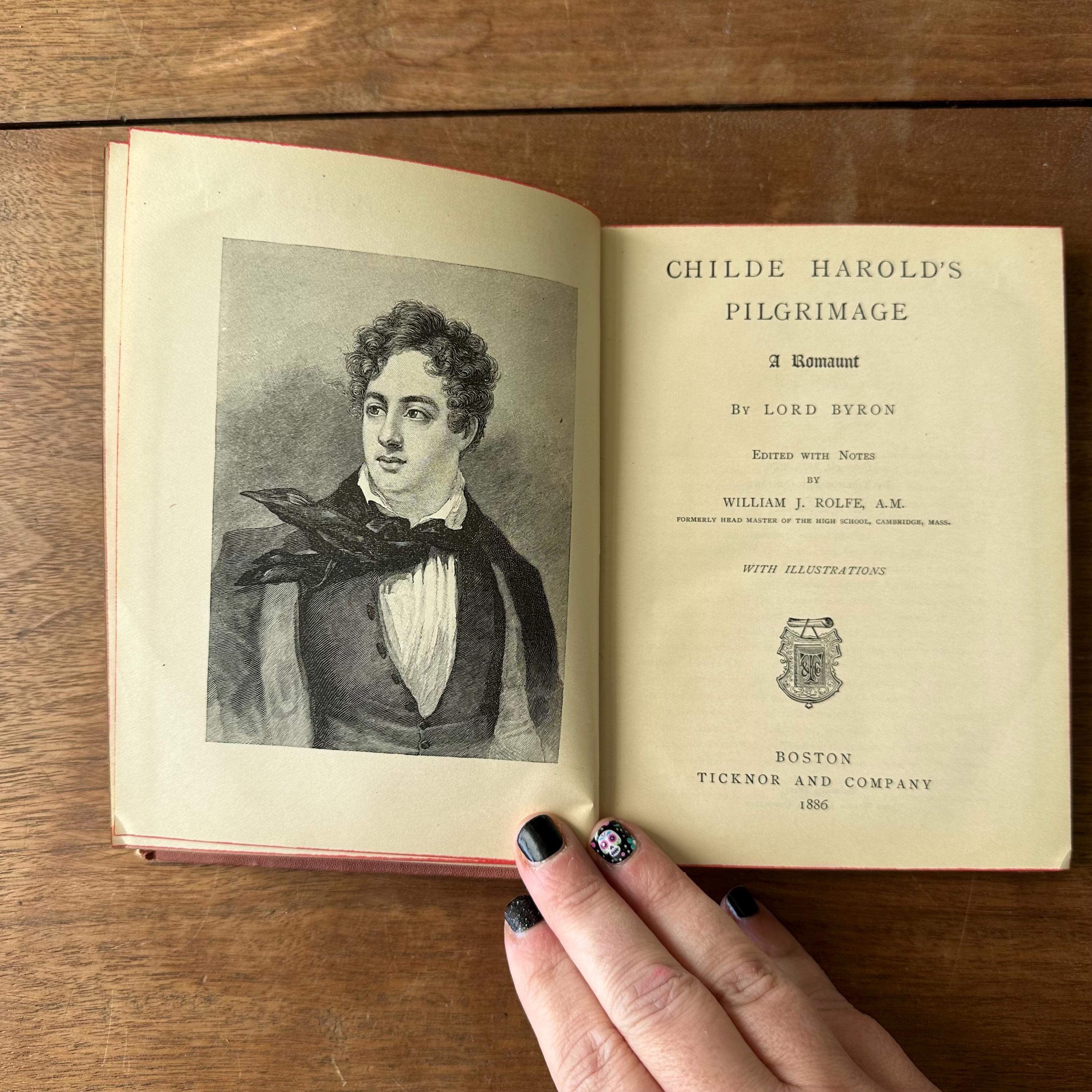 This is the antique 1886 edition of Childe Harold's Pilgrimage by Lord Byron, edited by William J. Rolfe, and published by Ticknor and Company. It has reddish-brown leather covers with gold lettering on the front cover and spine. The inside front and back cover endpapers are a brownish-gray. This edition is illustrated throughout with black and white illustrations and etchings. There are 288 pages.